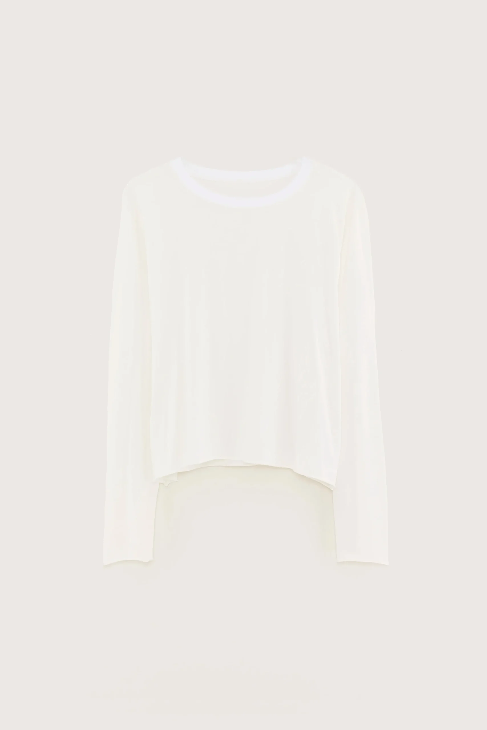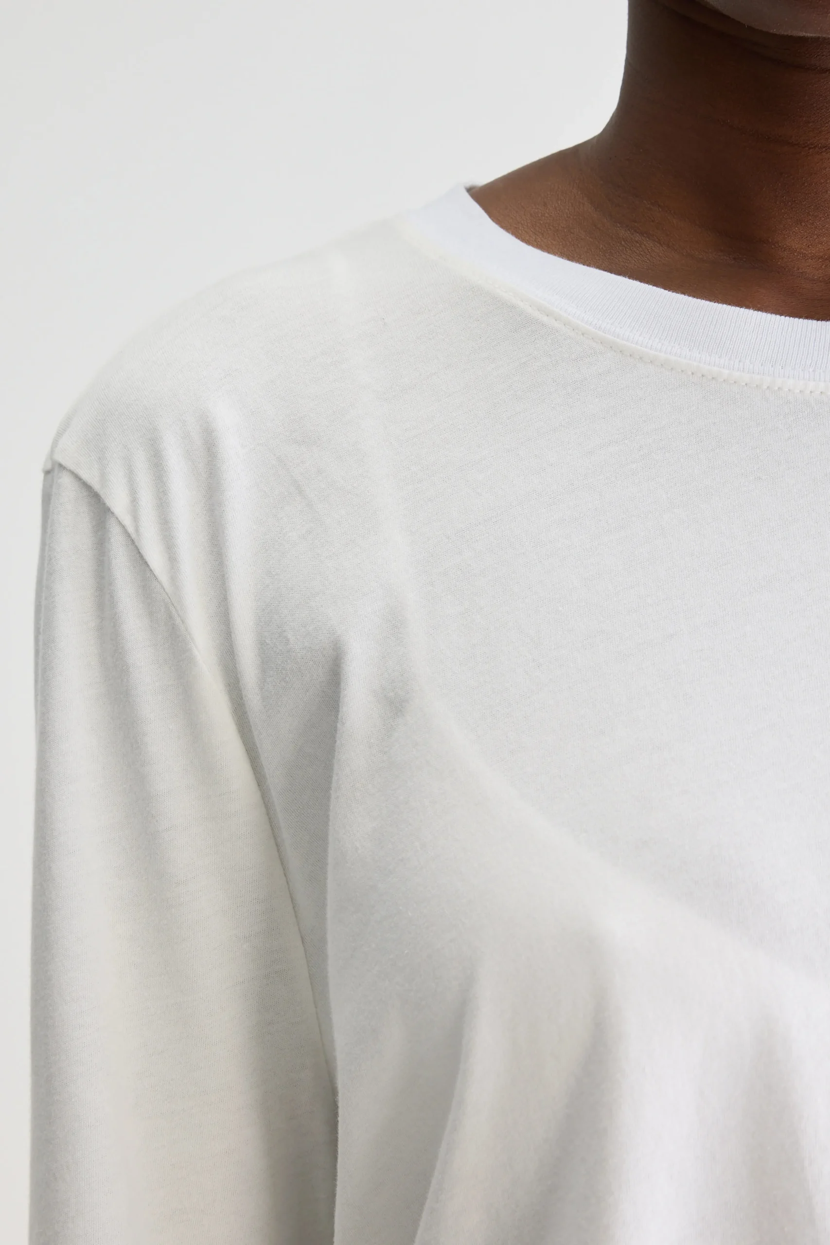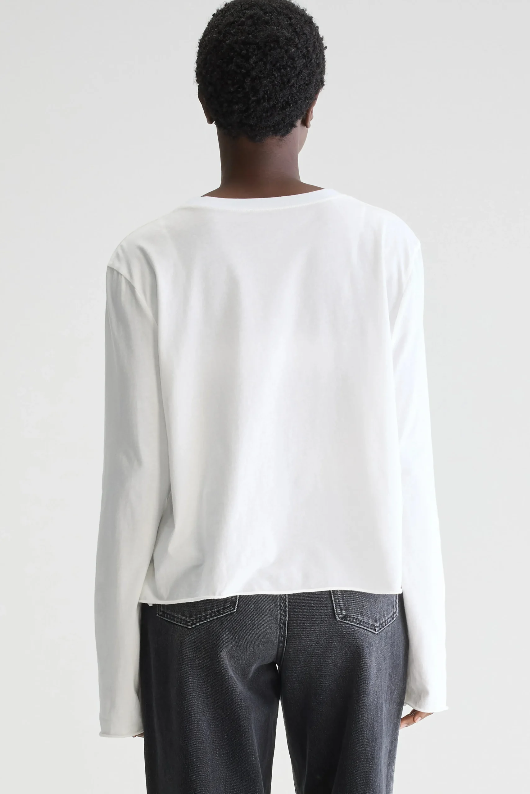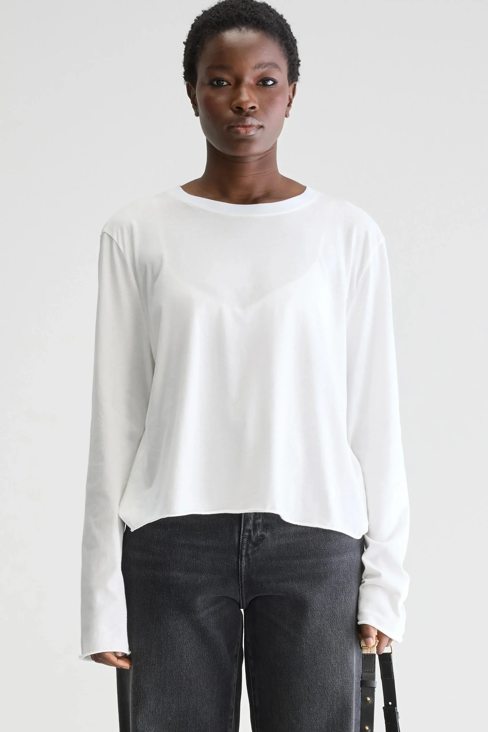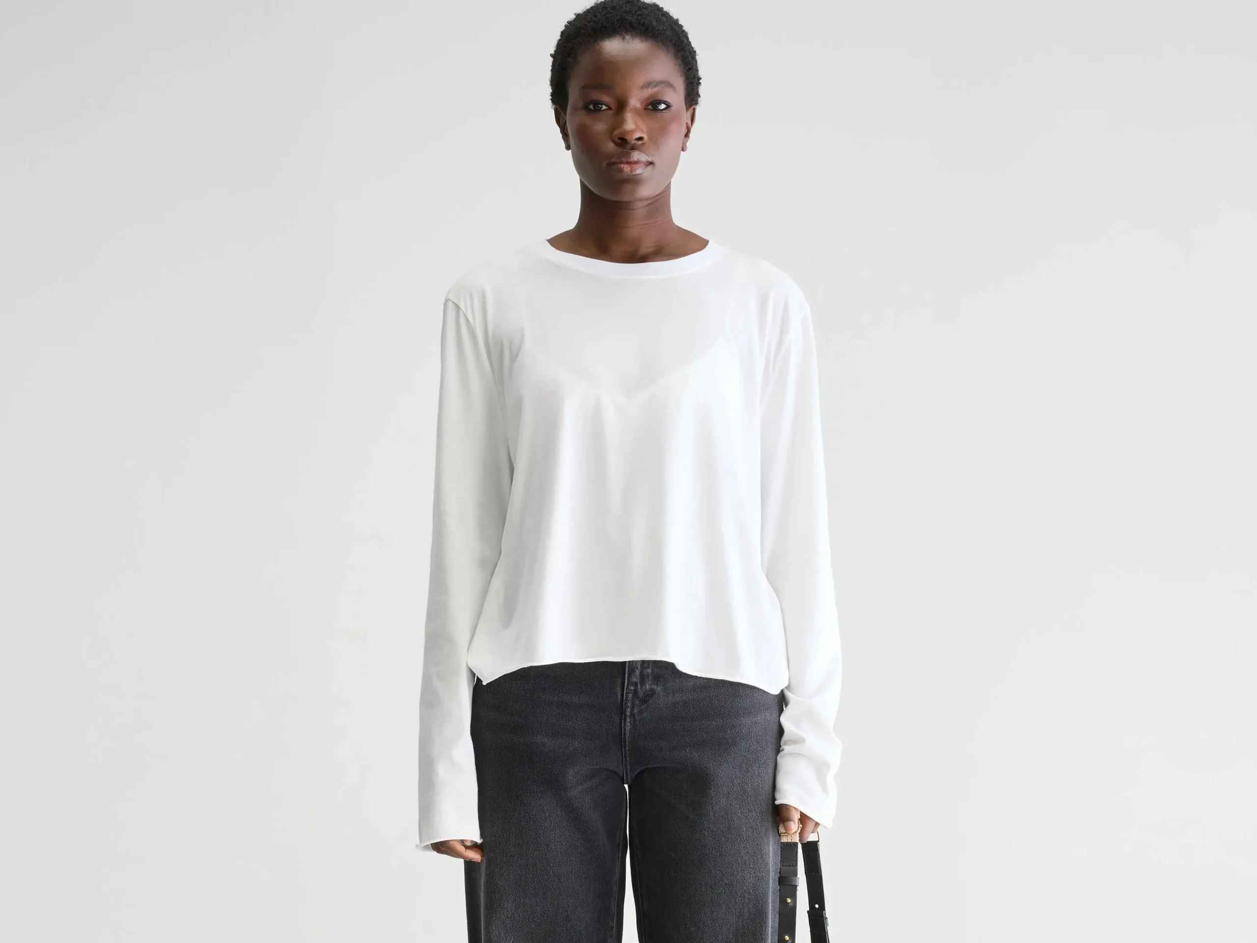 Klassiek t-shirt met lange mouwen en onafgewerkte randen, gemaakt van licht katoenjersey in wit.Regular pasvorm Lange mouwen Ronde hals Ruw gesneden randenLichte jersey stof