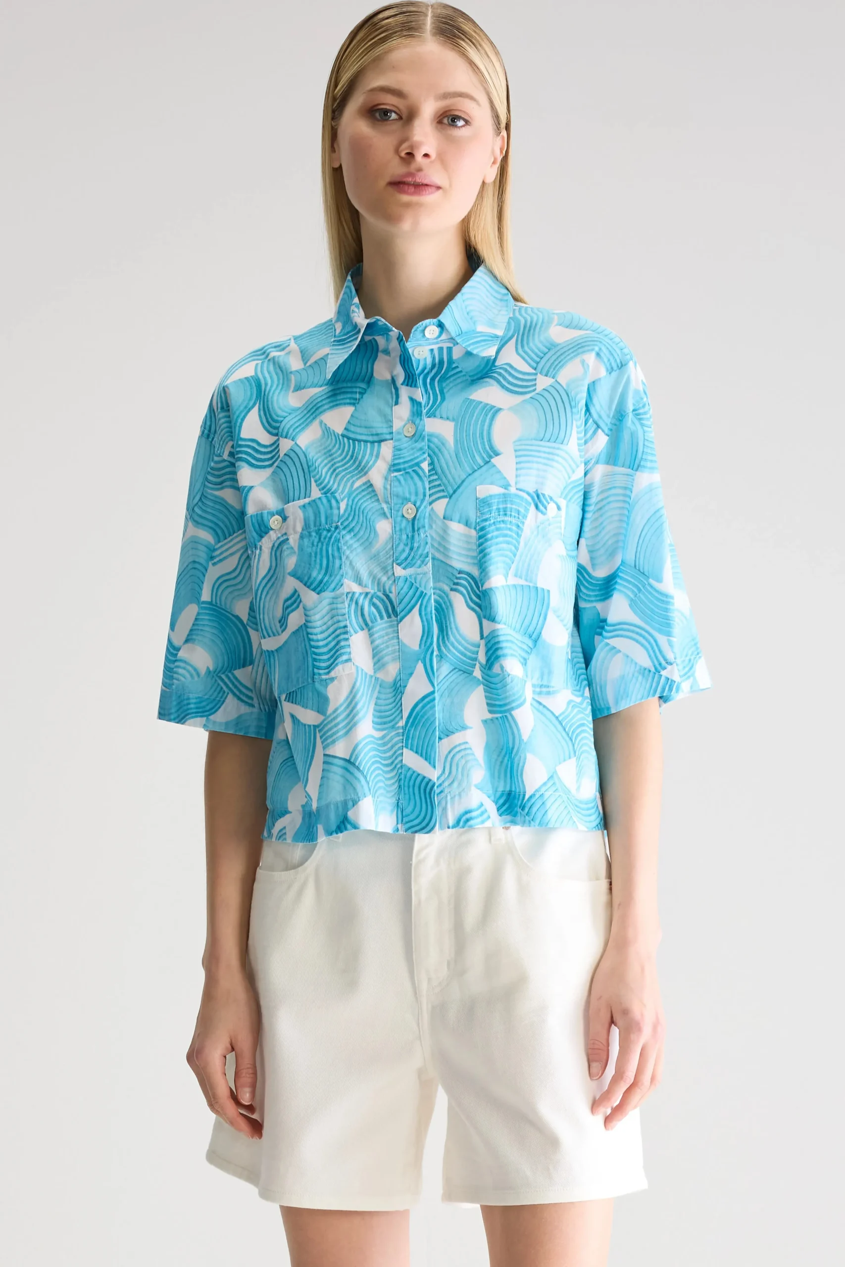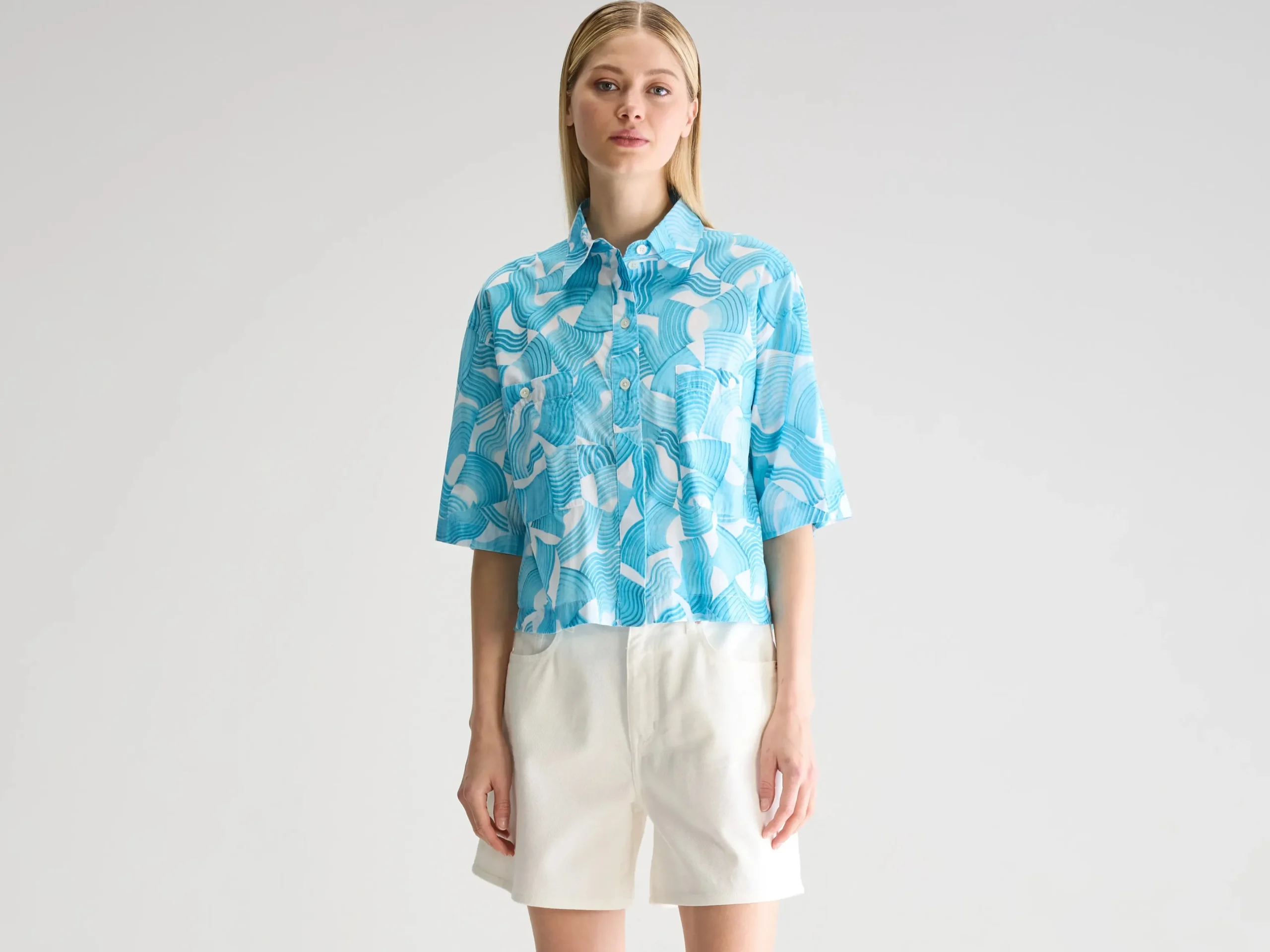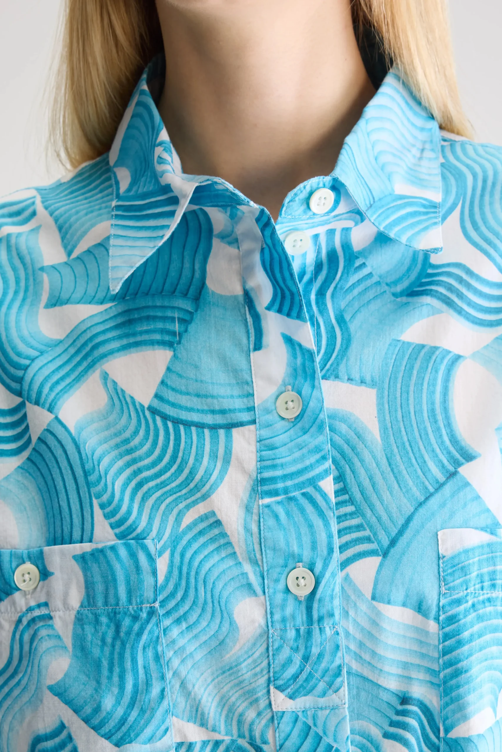 Los hemd met korte mouwen, grote voorzakken en rugplooi voor extra structuur, met opvallende roze metallic afwerking. Losse pasvormKorte mouwenKlassieke overhemdkraag met button-down voorkantOmgekeerde rugplooi voor extra vormVoorzakken met parelmoeren knoopsluitingen