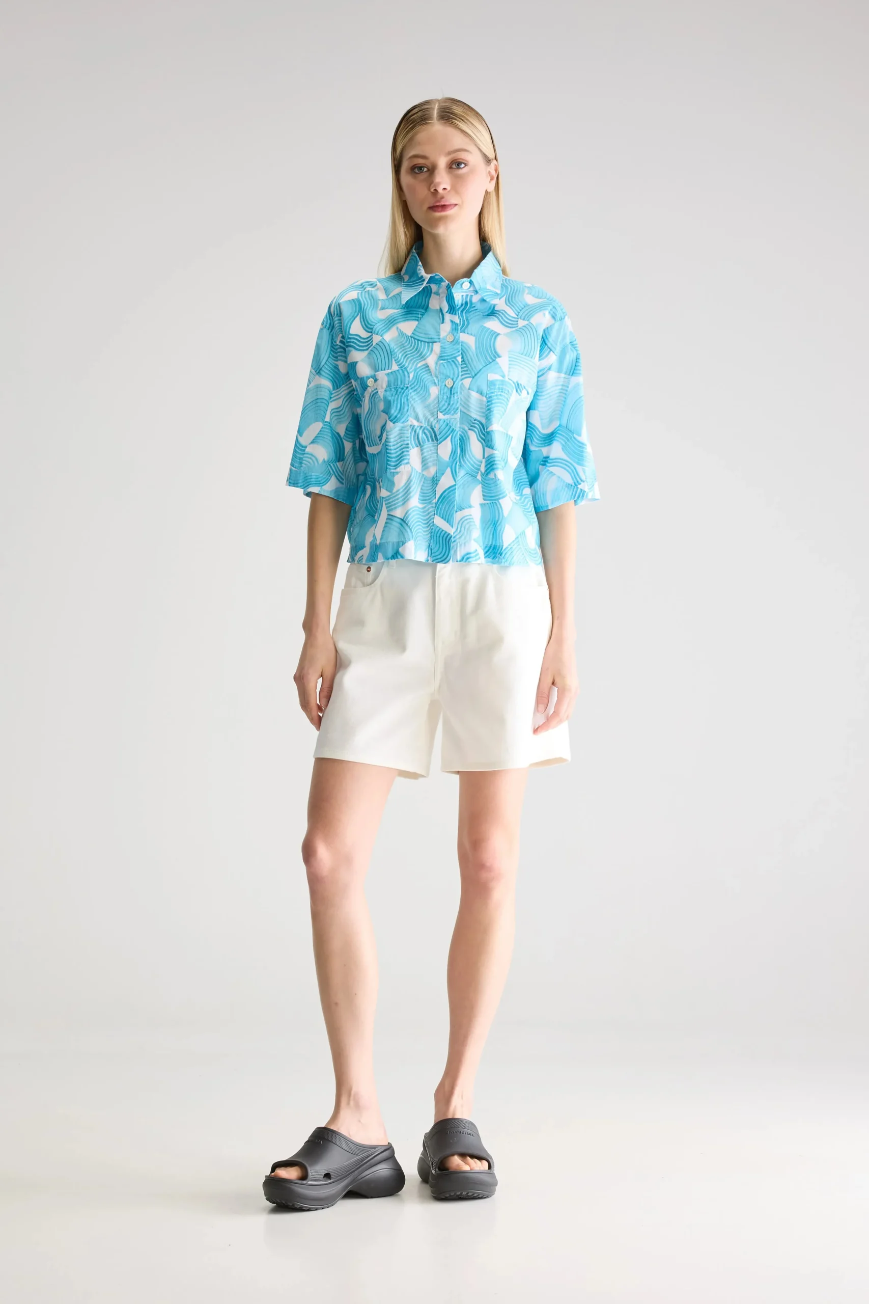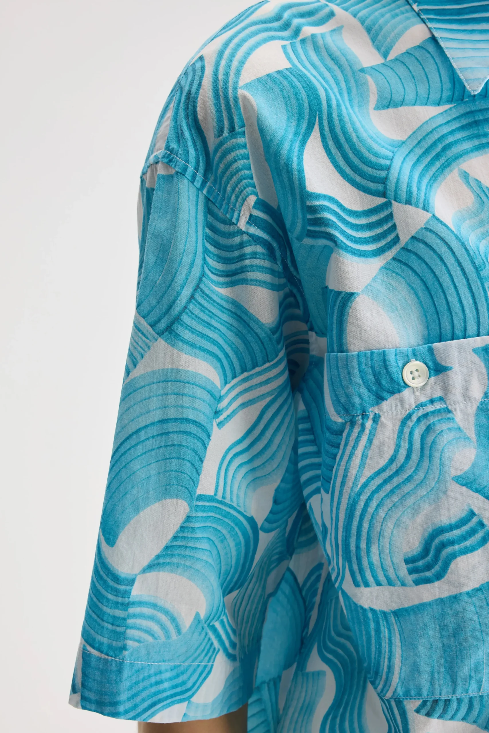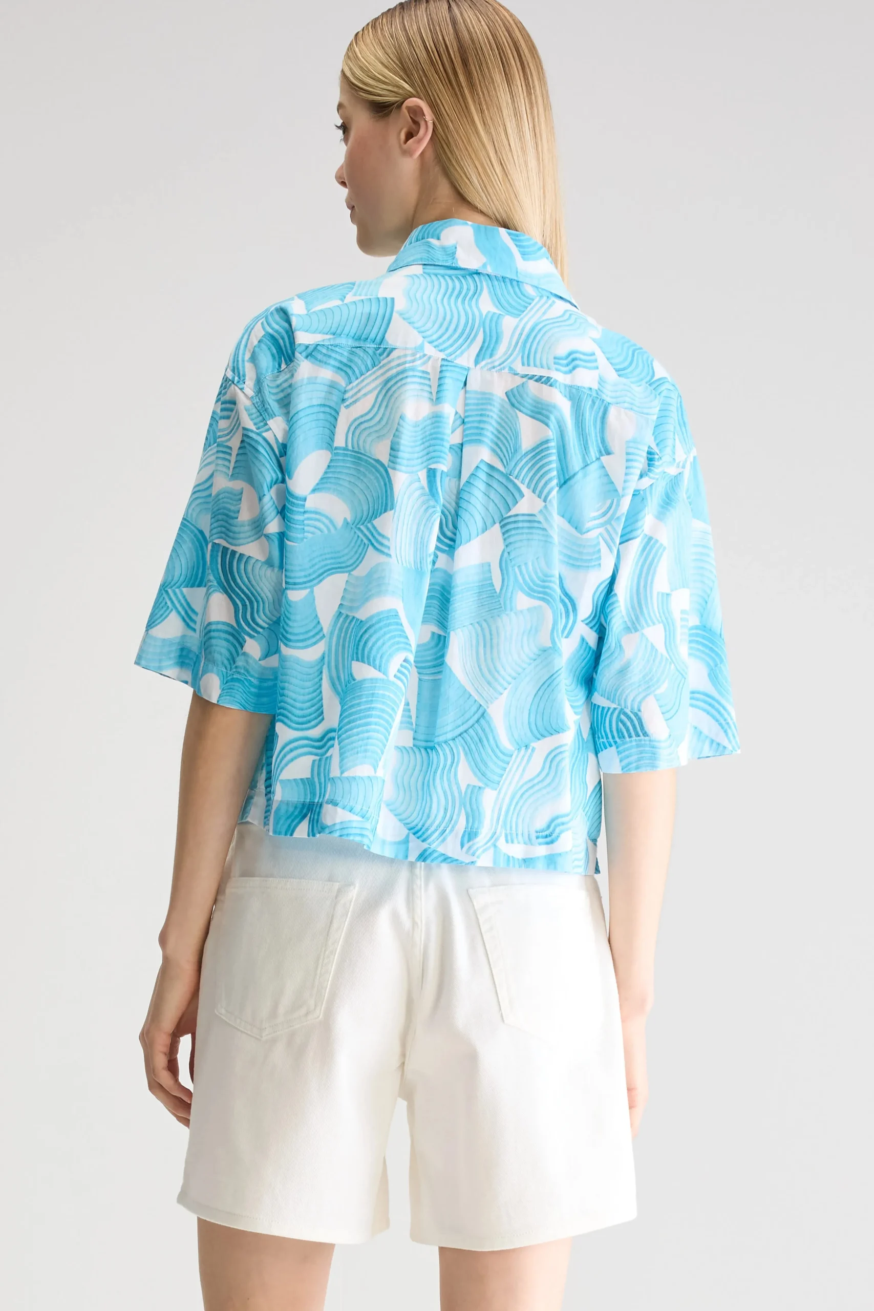 Los hemd met korte mouwen, grote voorzakken en rugplooi voor extra structuur, met opvallende roze metallic afwerking. Losse pasvormKorte mouwenKlassieke overhemdkraag met button-down voorkantOmgekeerde rugplooi voor extra vormVoorzakken met parelmoeren knoopsluitingen