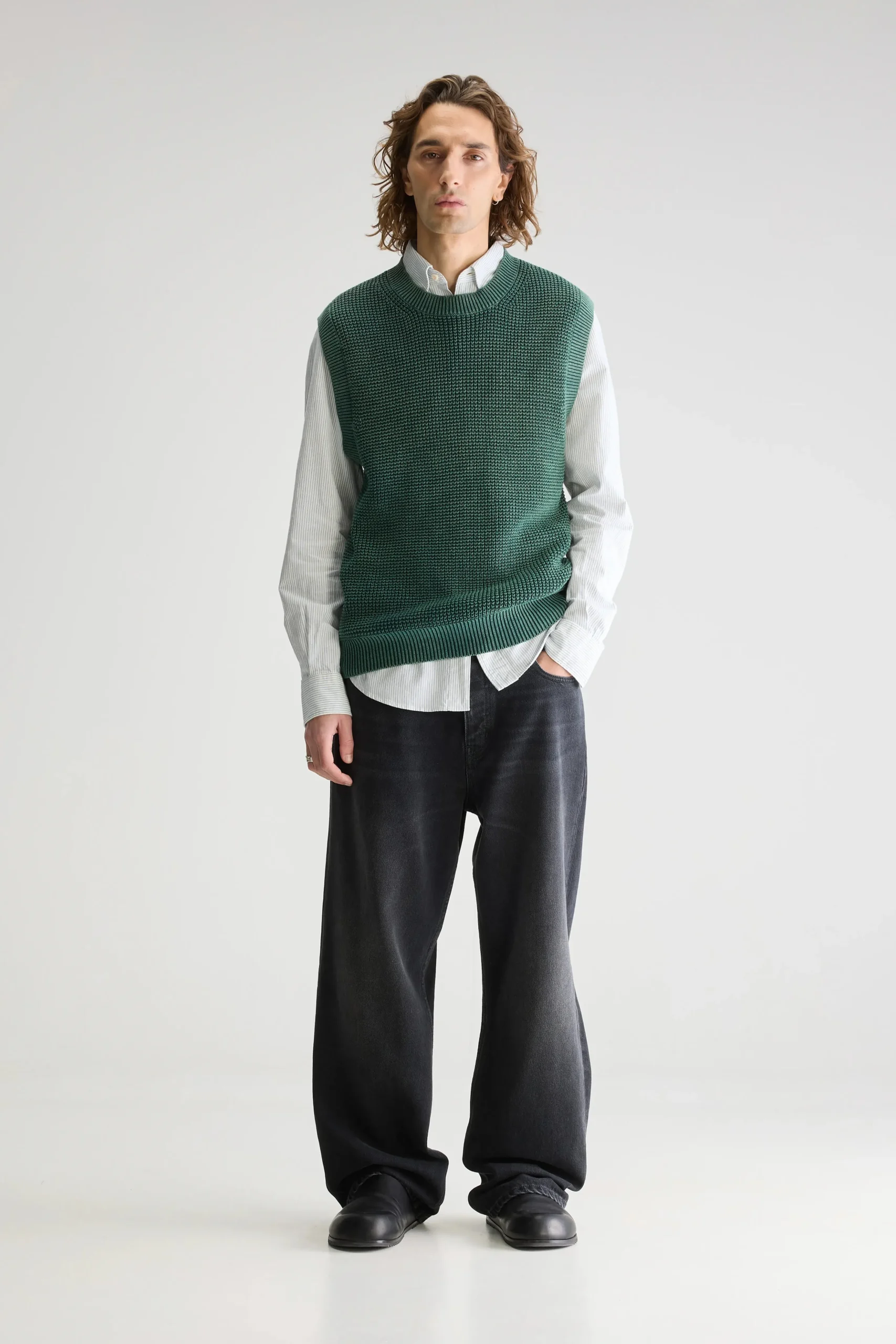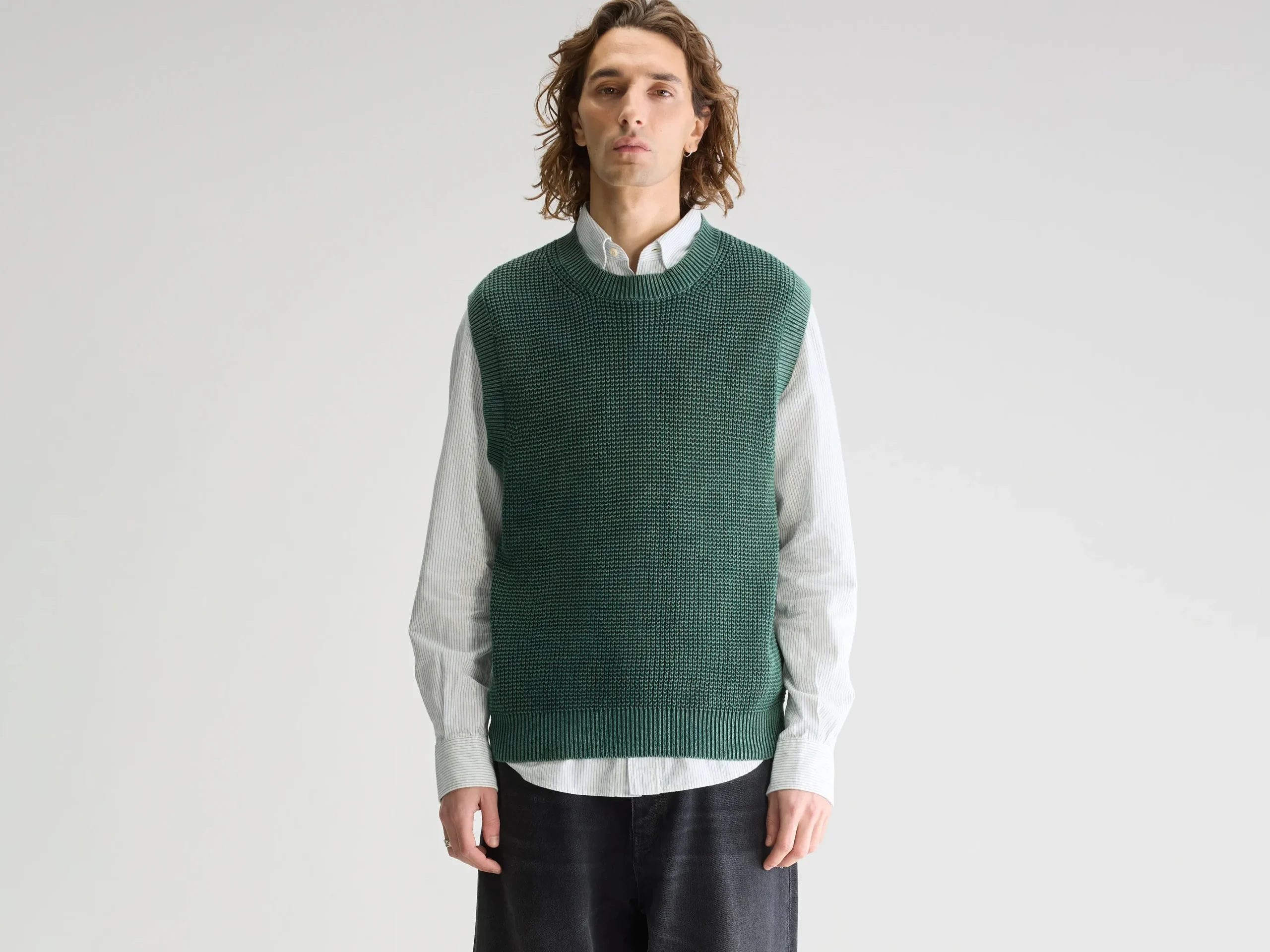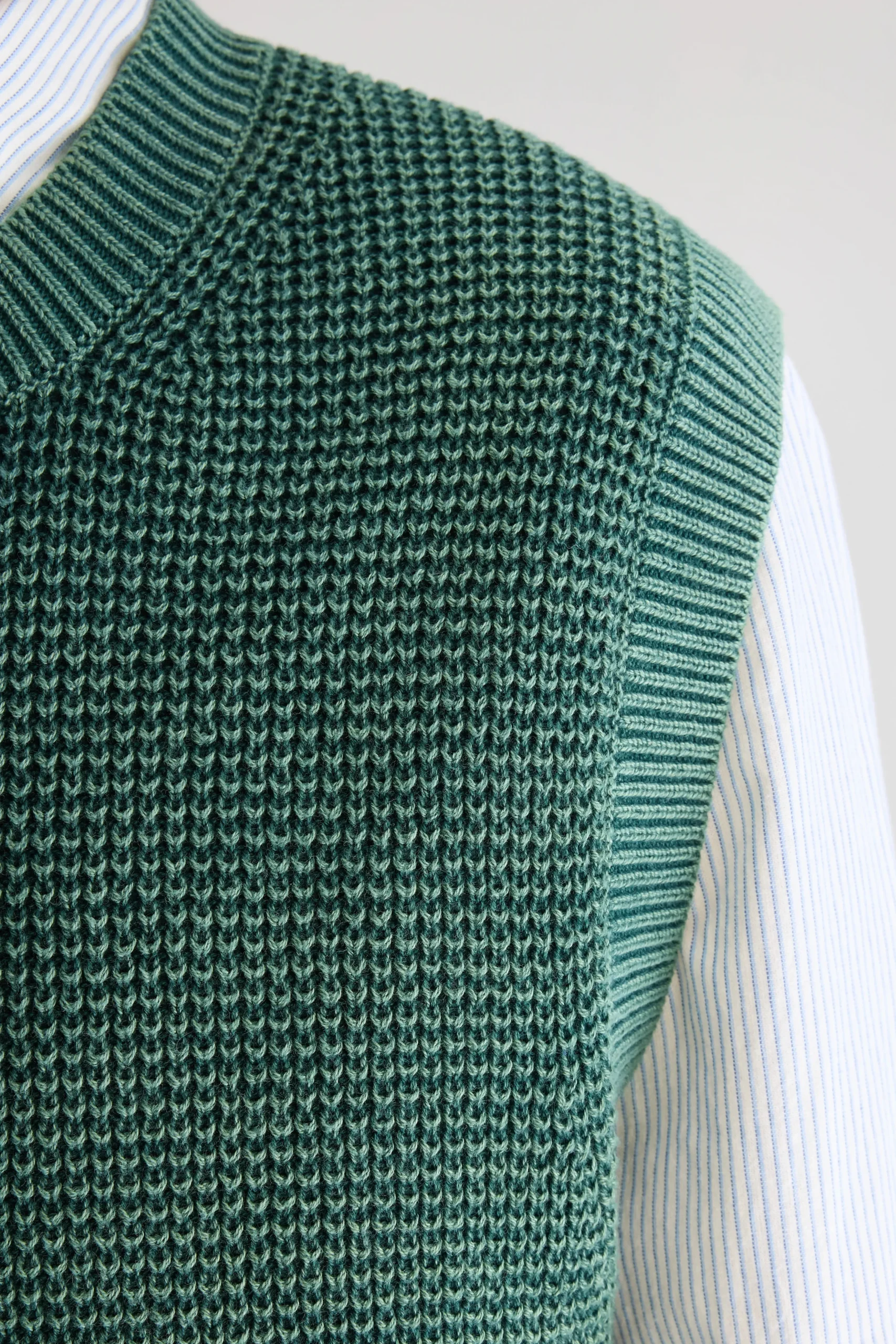 Klassieke trui, gemaakt van flesgroen waffle knit katoen met acid wash afwerking.Klassieke pasvorm Ronde hals Waffle knit, acid washThick gauge
