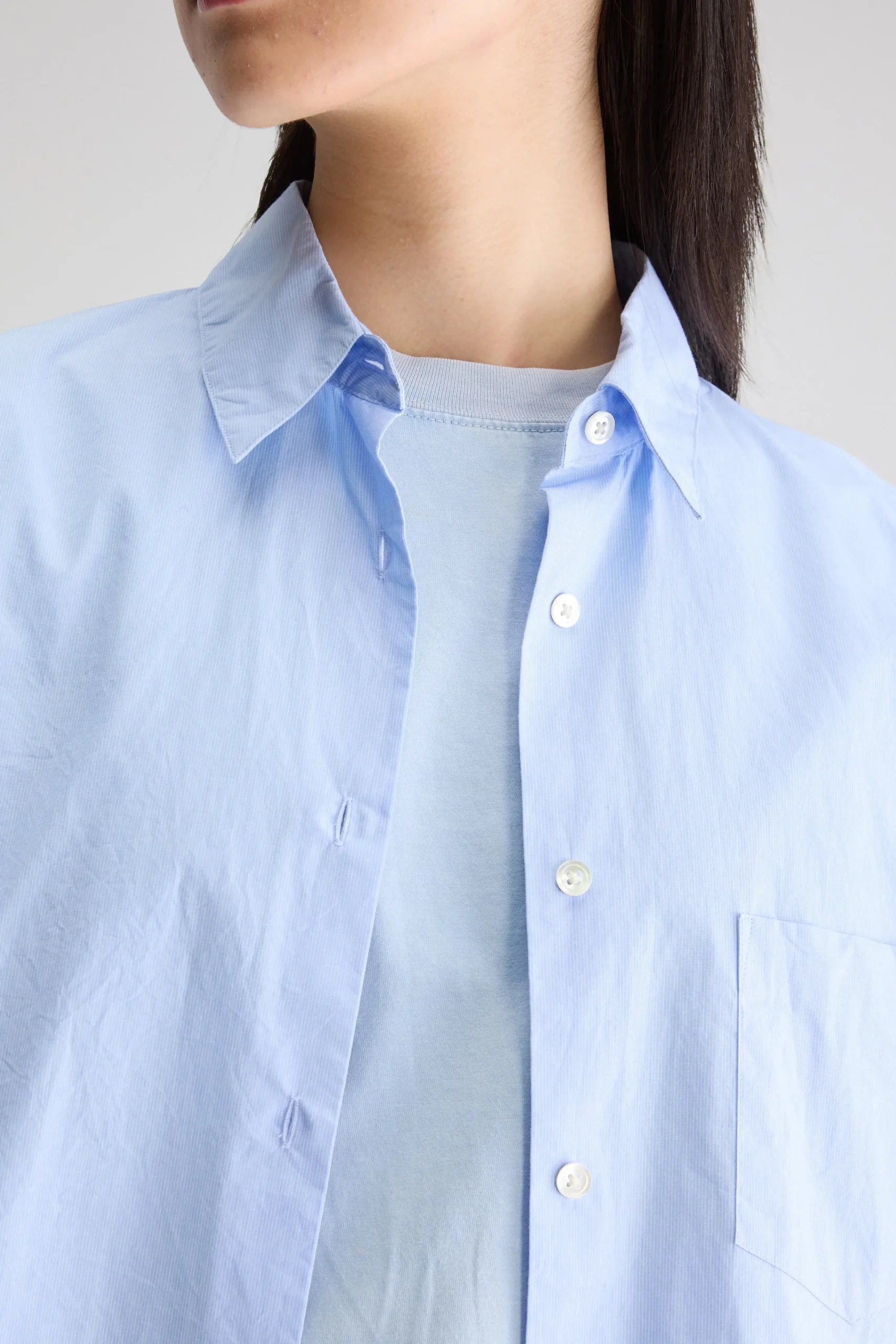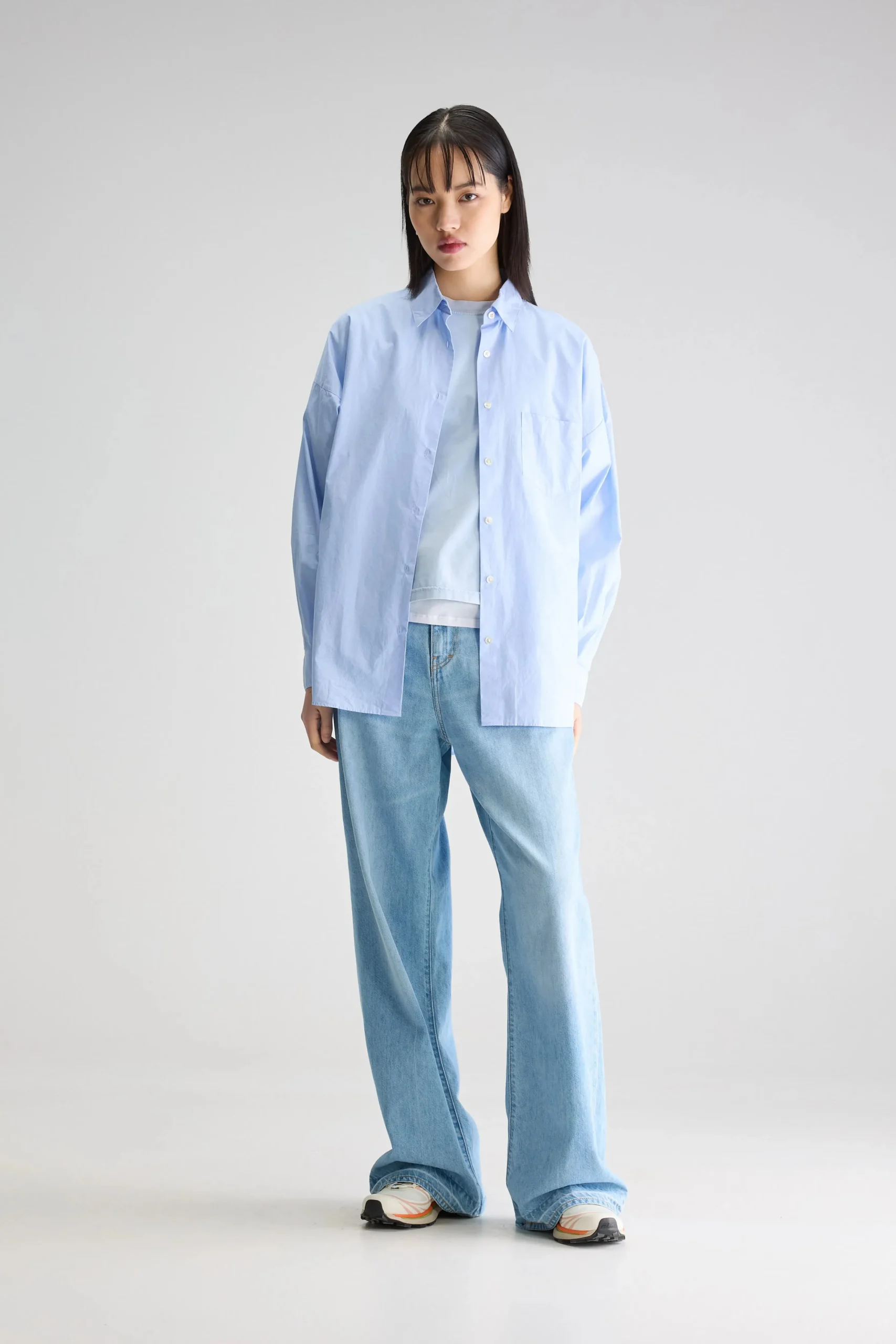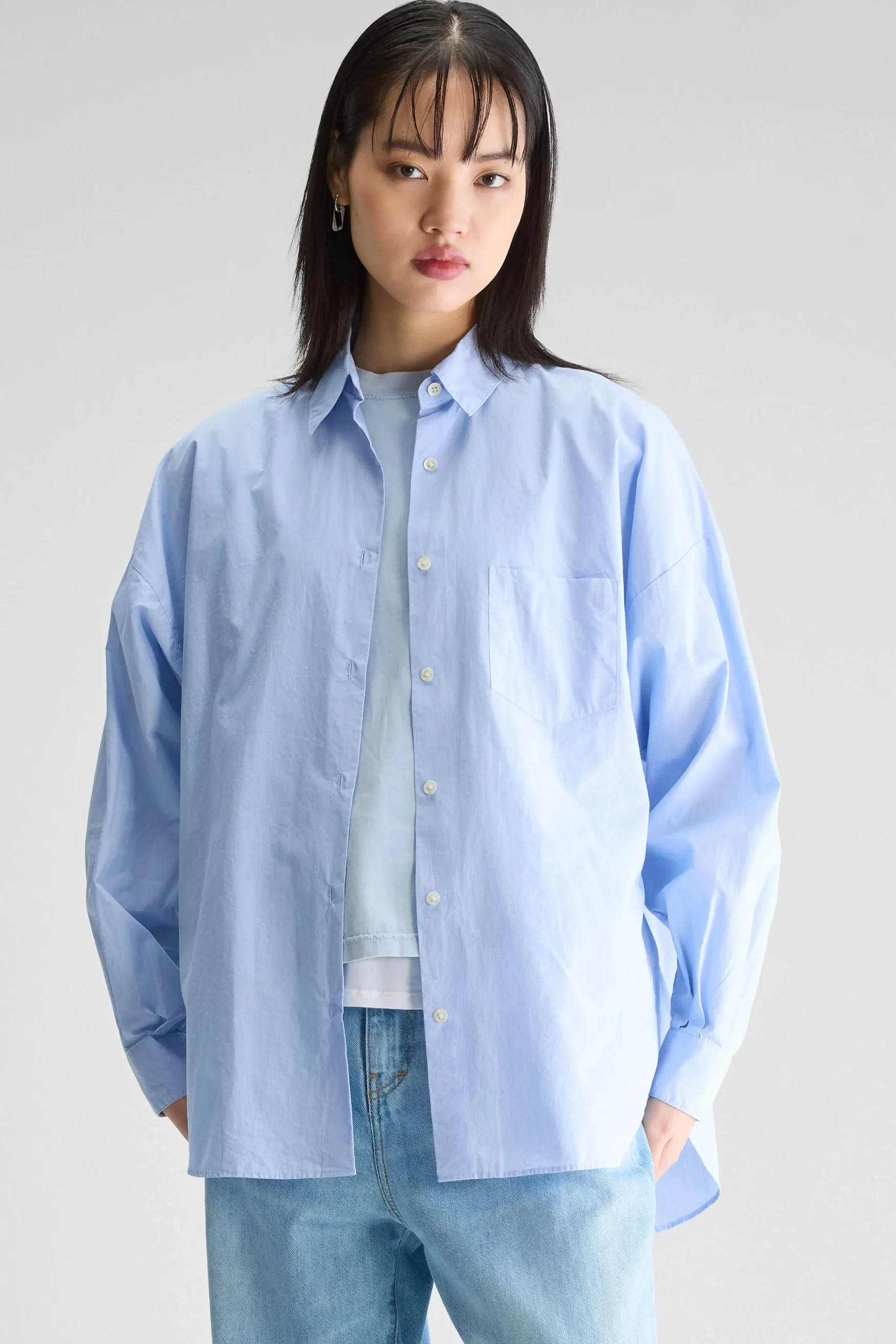 Oversized button-up hemd met lange mouwen, klassieke kraag en opgestikte zak aan de voorkant, gemaakt van katoenpopeline met lichtblauwe strepen.Oversized snit : Kies