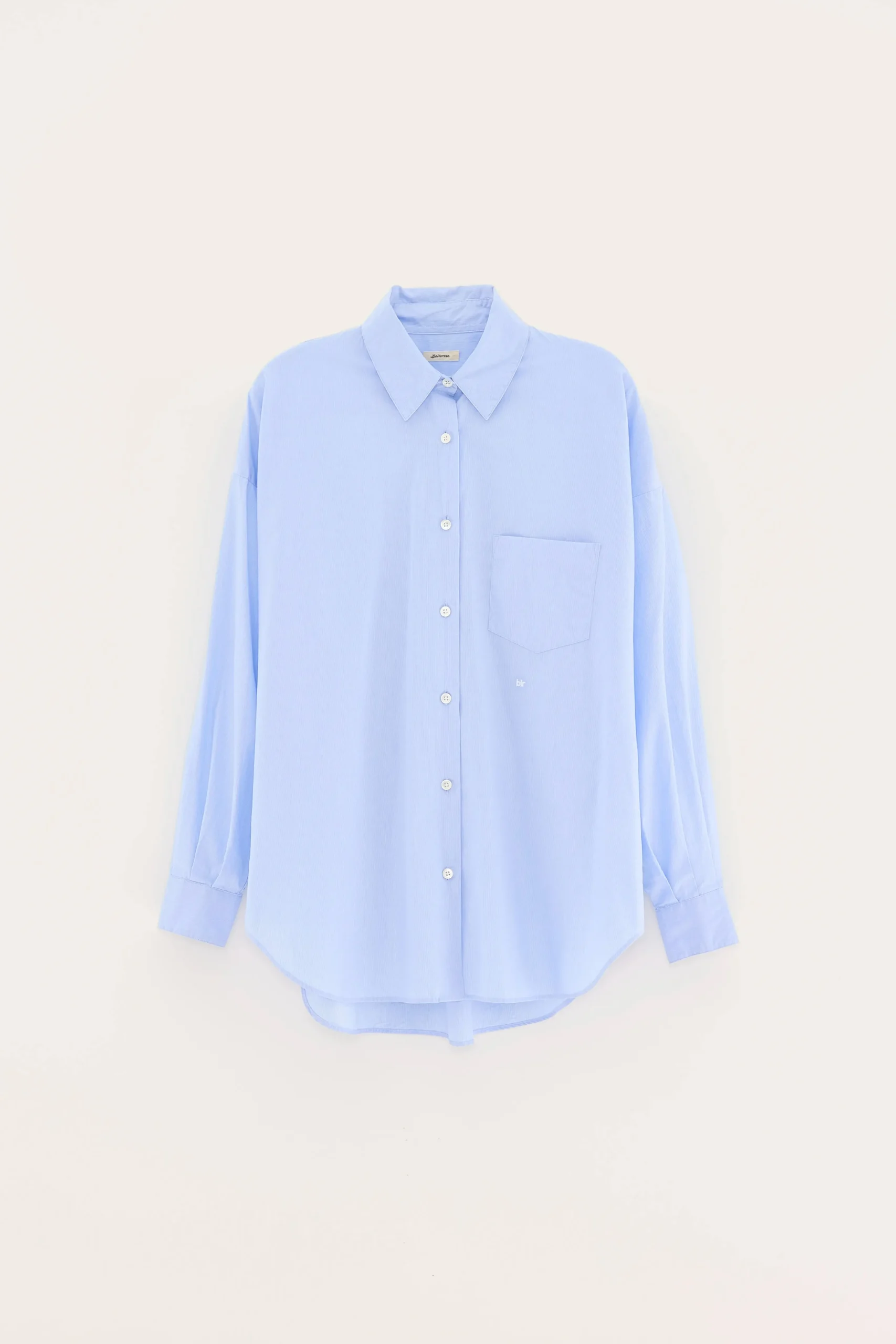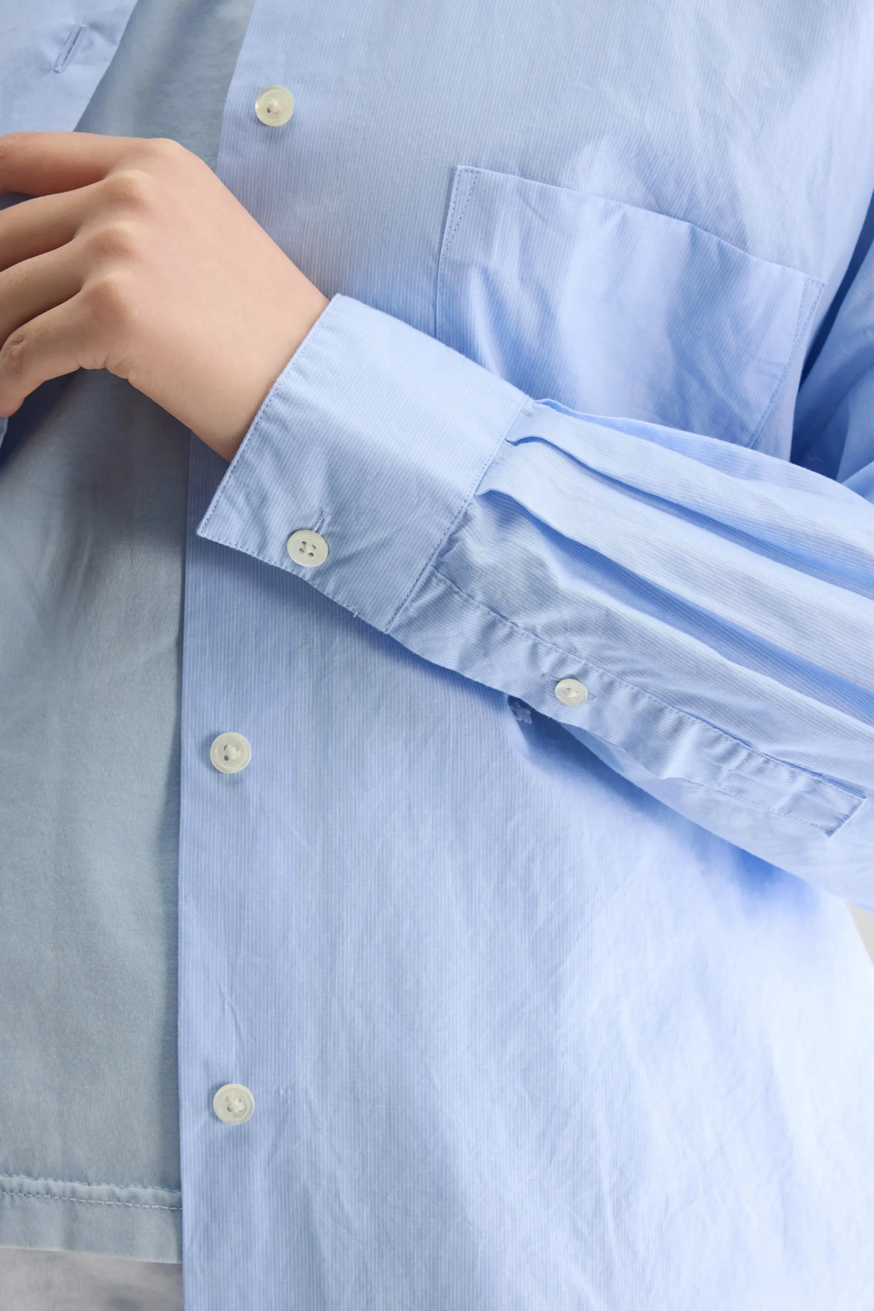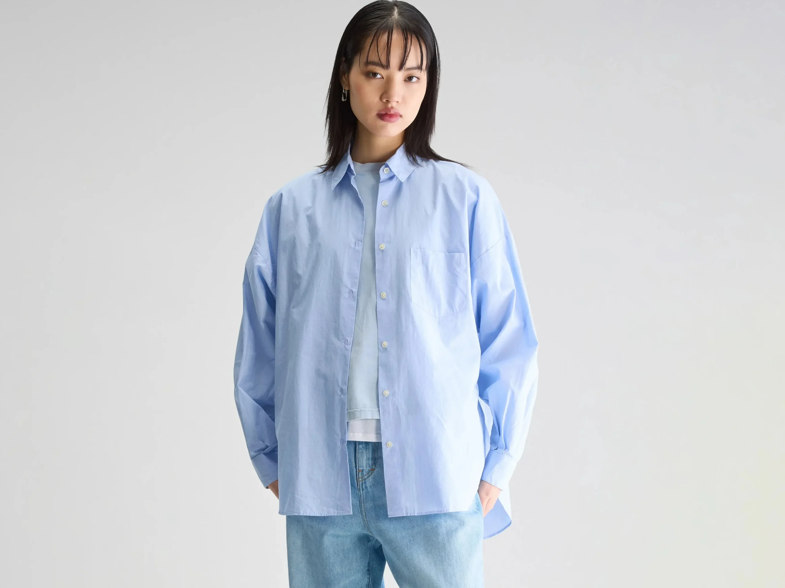 Oversized button-up hemd met lange mouwen, klassieke kraag en opgestikte zak aan de voorkant, gemaakt van katoenpopeline met lichtblauwe strepen.Oversized snit : Kies