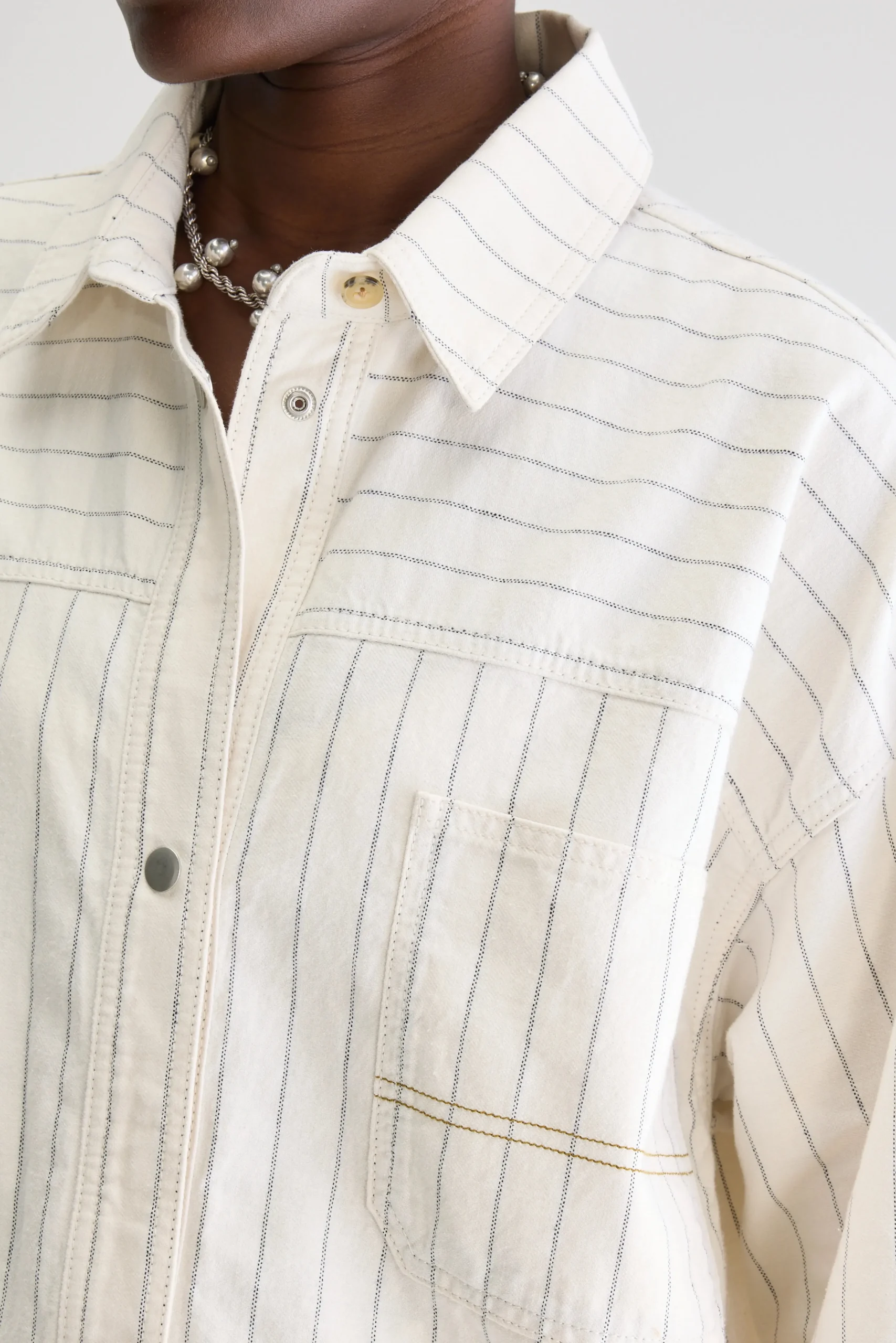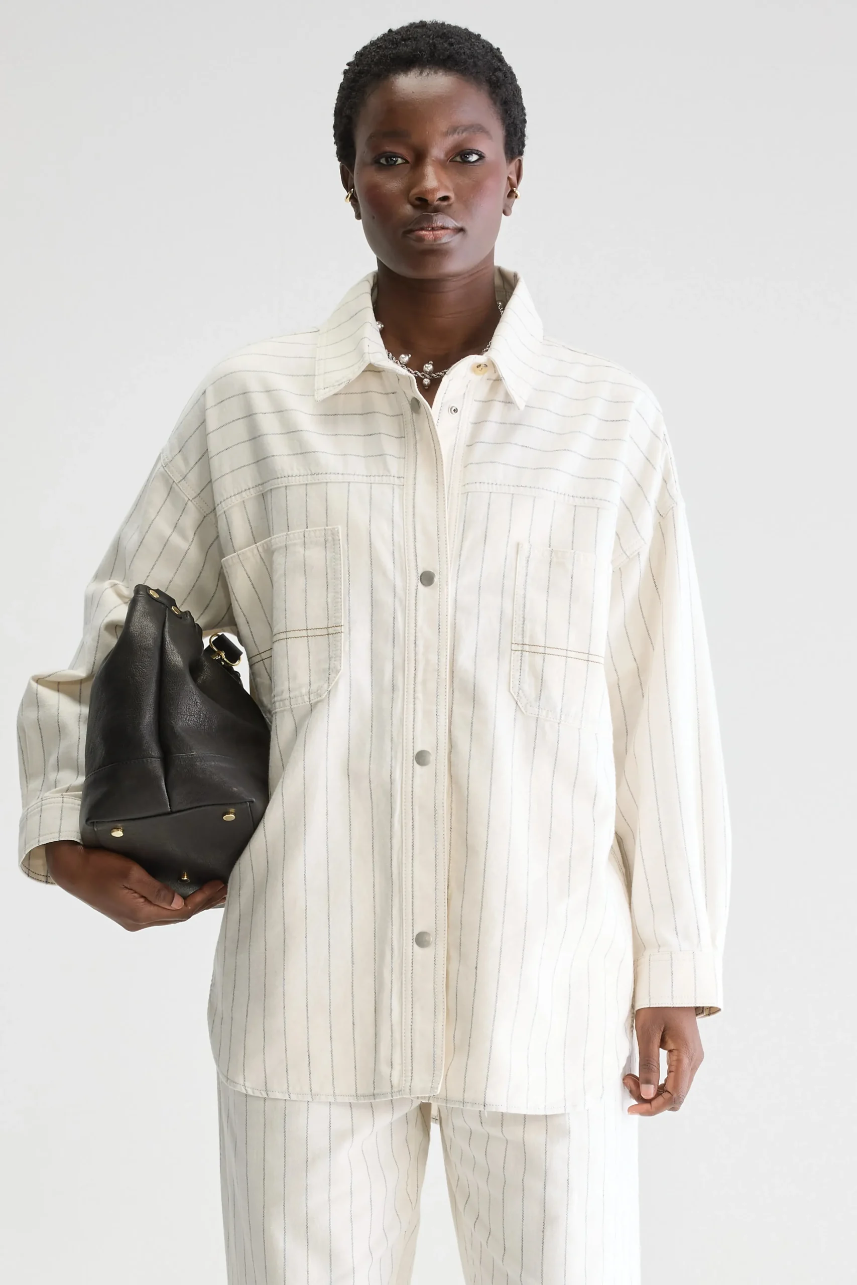 Relaxed overhemd in worker-stijl met klassieke kraag en grote opgestikte zakken, van gestreept katoen en hennepcanvas.Re…