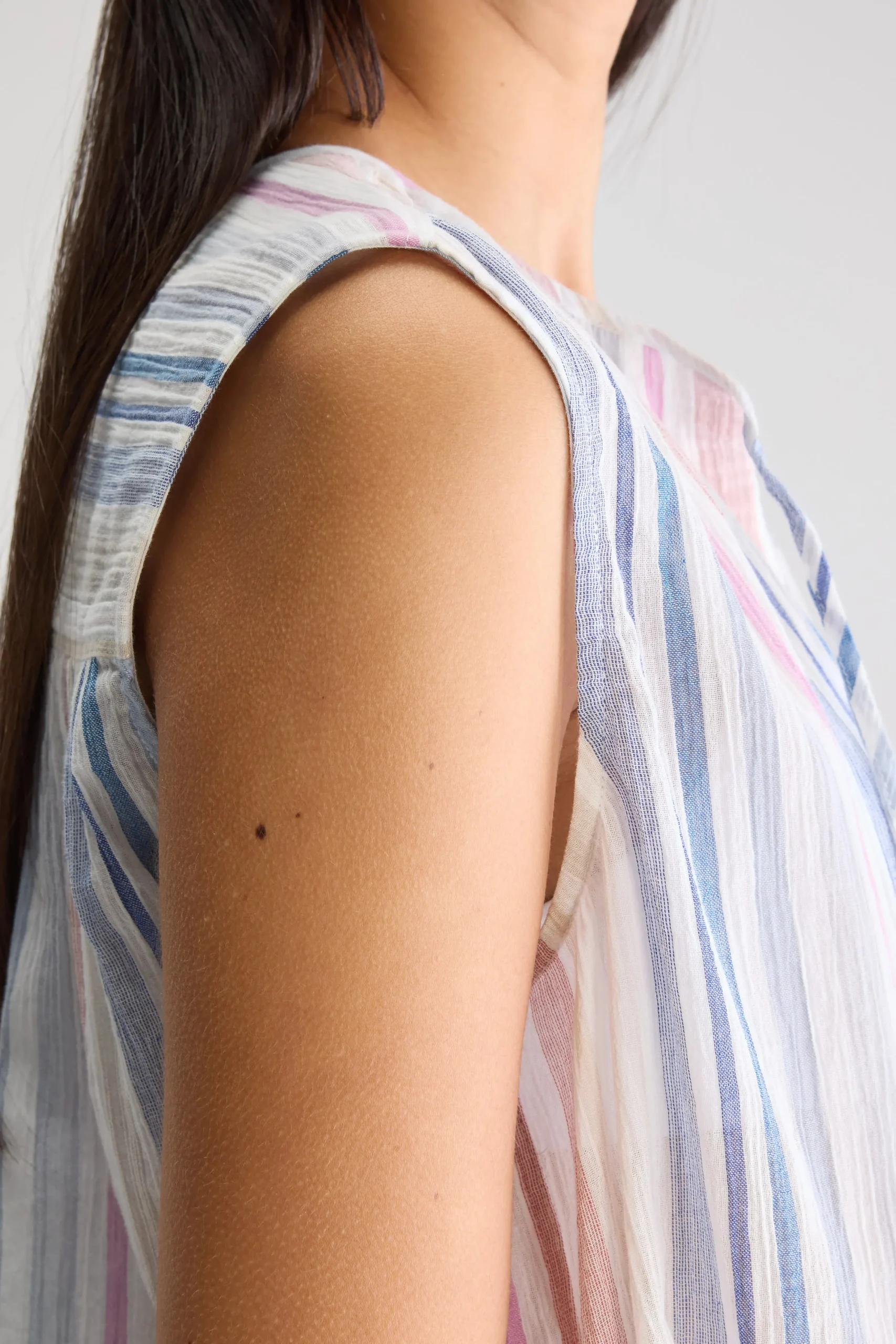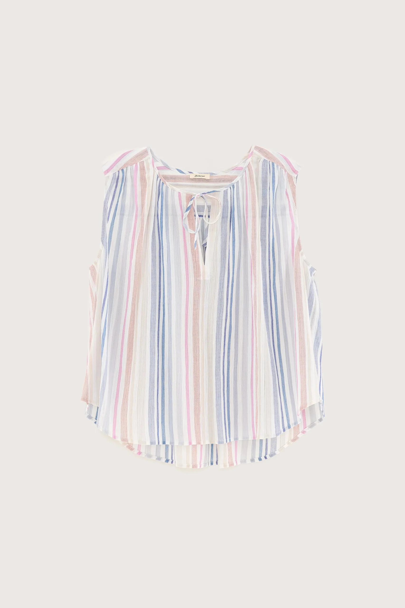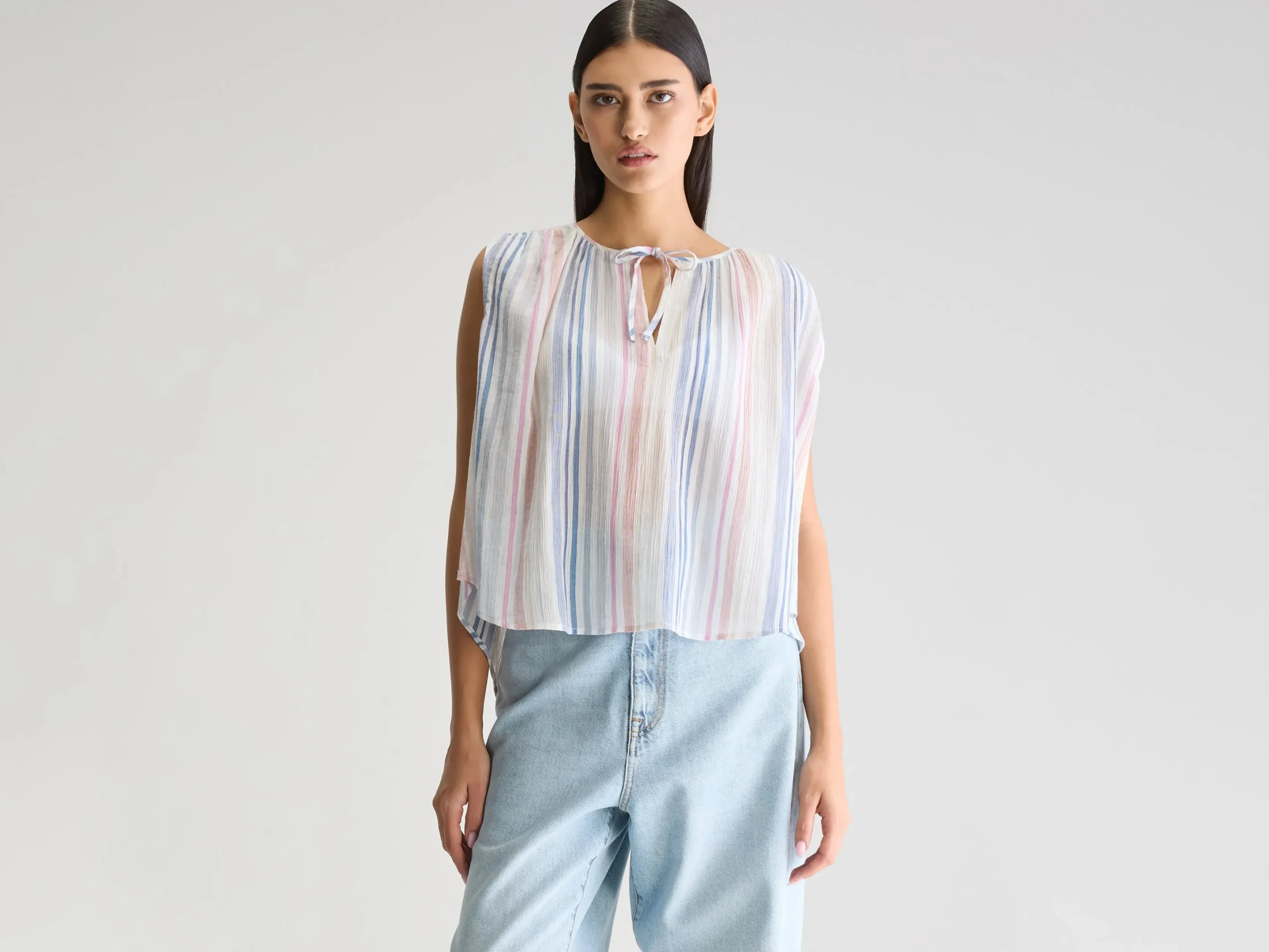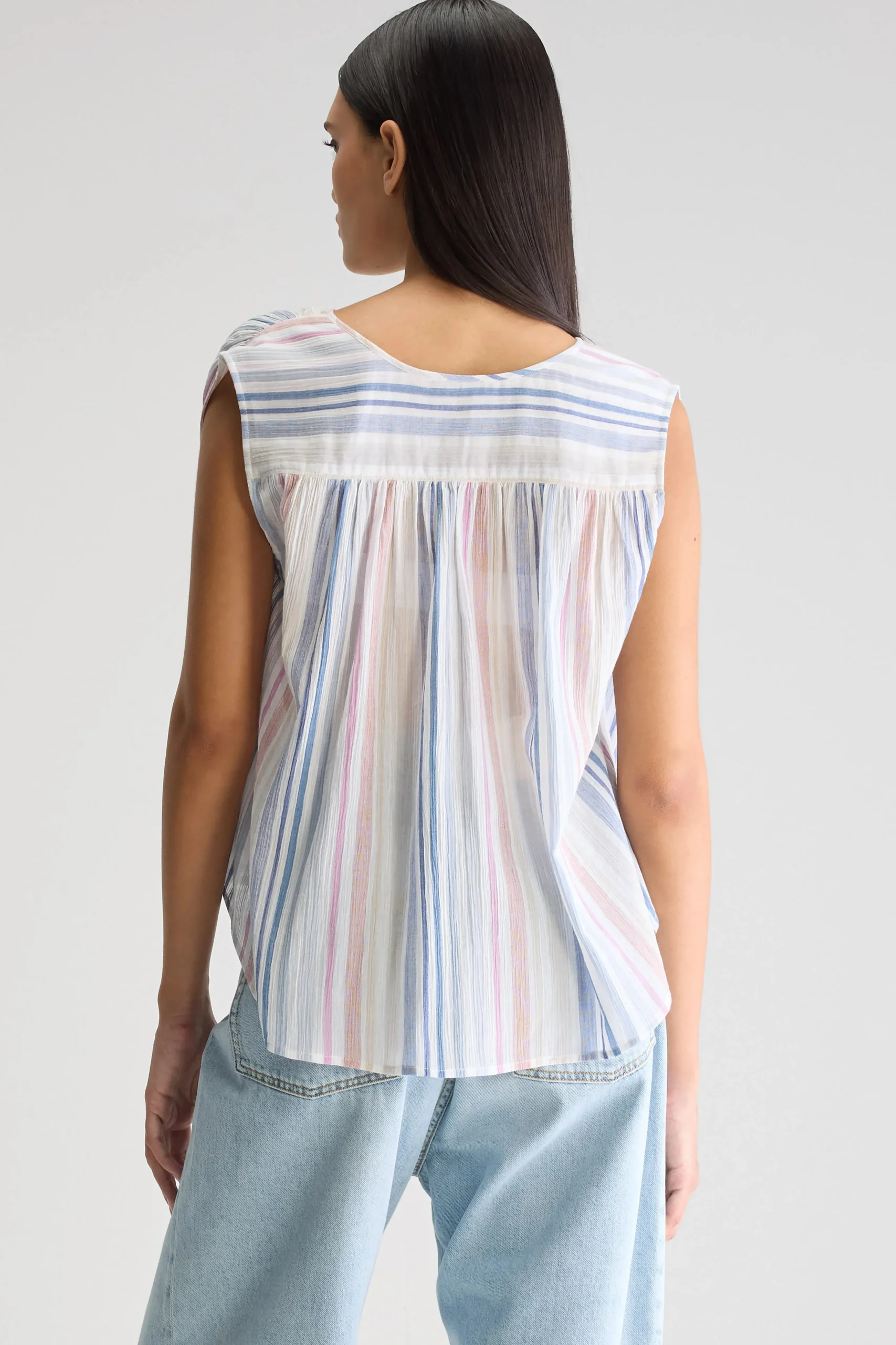 Klassieke, mouwloze gestreepte blouse in zachte pasteltinten, met open V-hals met subtiele strikdetails aan de voorkant.Klassieke pasvormMouwloosOpen V-hals met striksluitingSubtiele plooien op de schoudersGebogen zoom