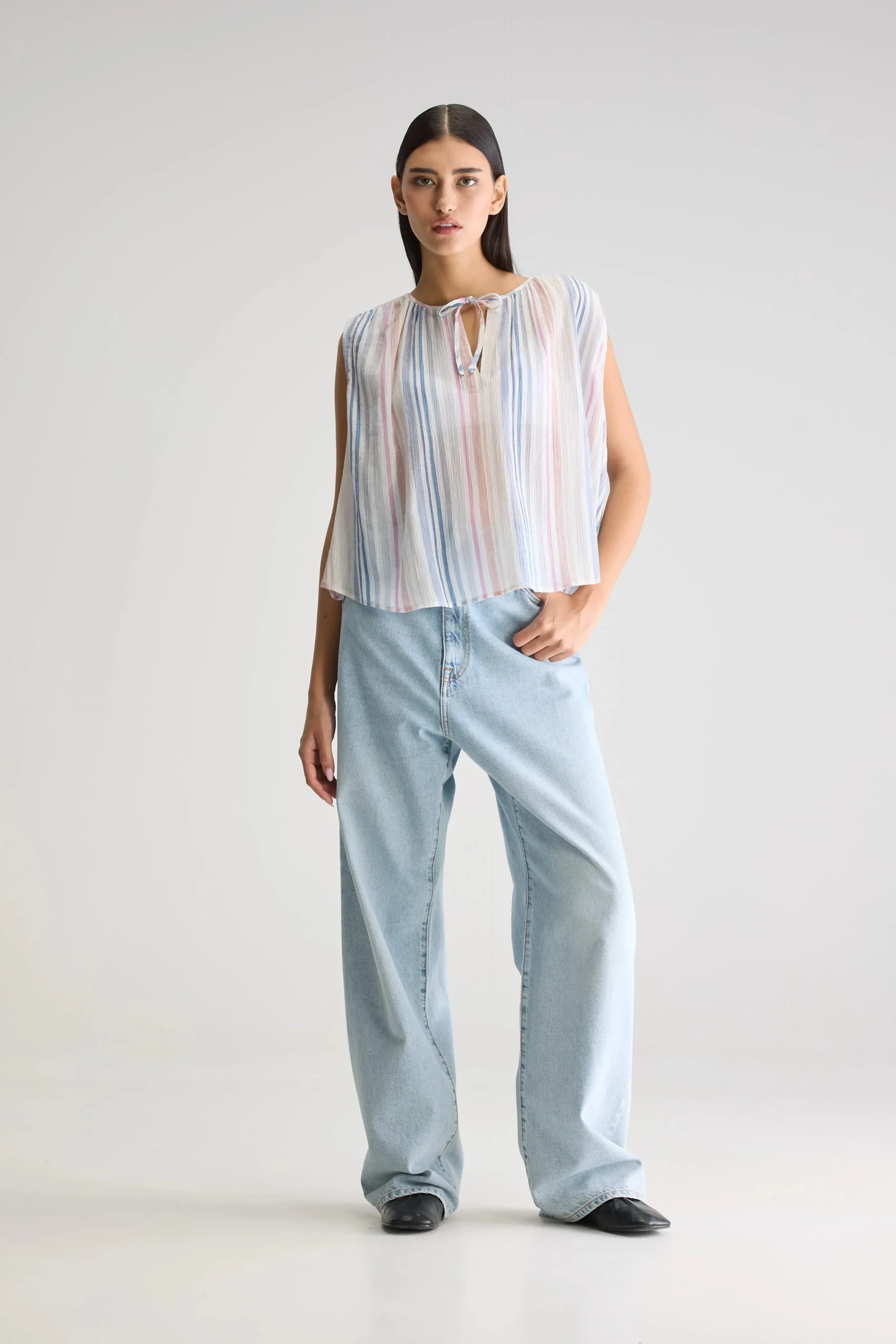 Klassieke, mouwloze gestreepte blouse in zachte pasteltinten, met open V-hals met subtiele strikdetails aan de voorkant….