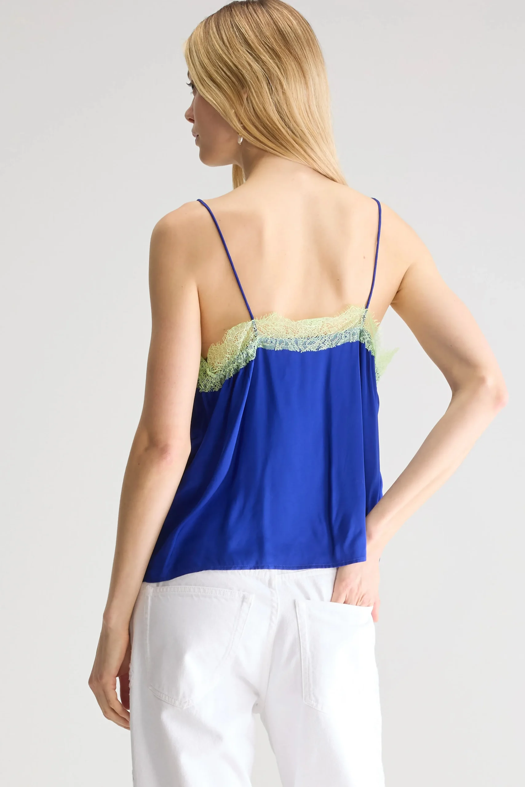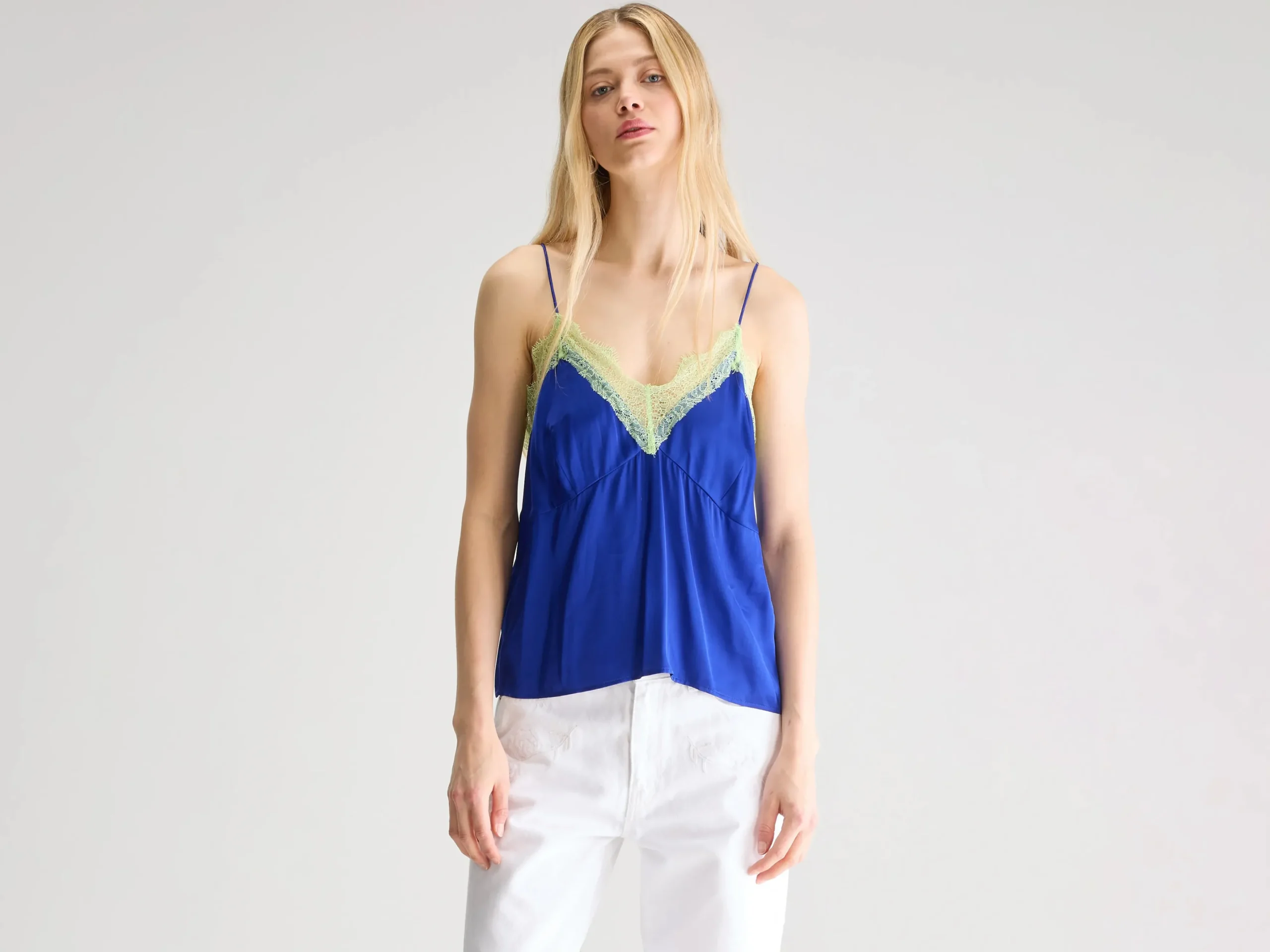 Levendige, blauwe tanktop in worker-stijl met delicate felgele kanten rand.Klassieke pasvormMouwloosV-halsViscose met gladde afwerkingGele kanten rand langs de halsDunne spaghettibandjesMatching met Haylin rok