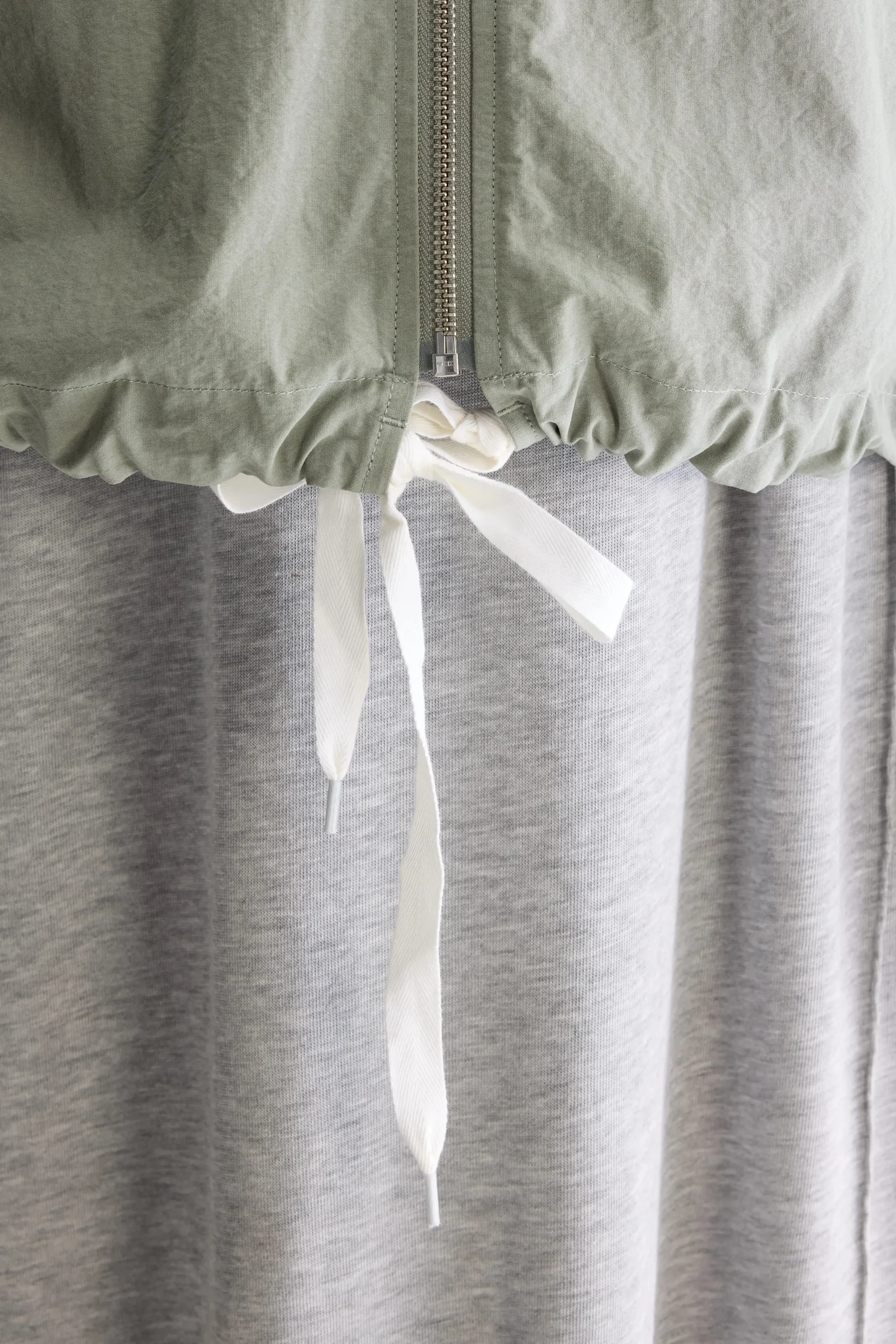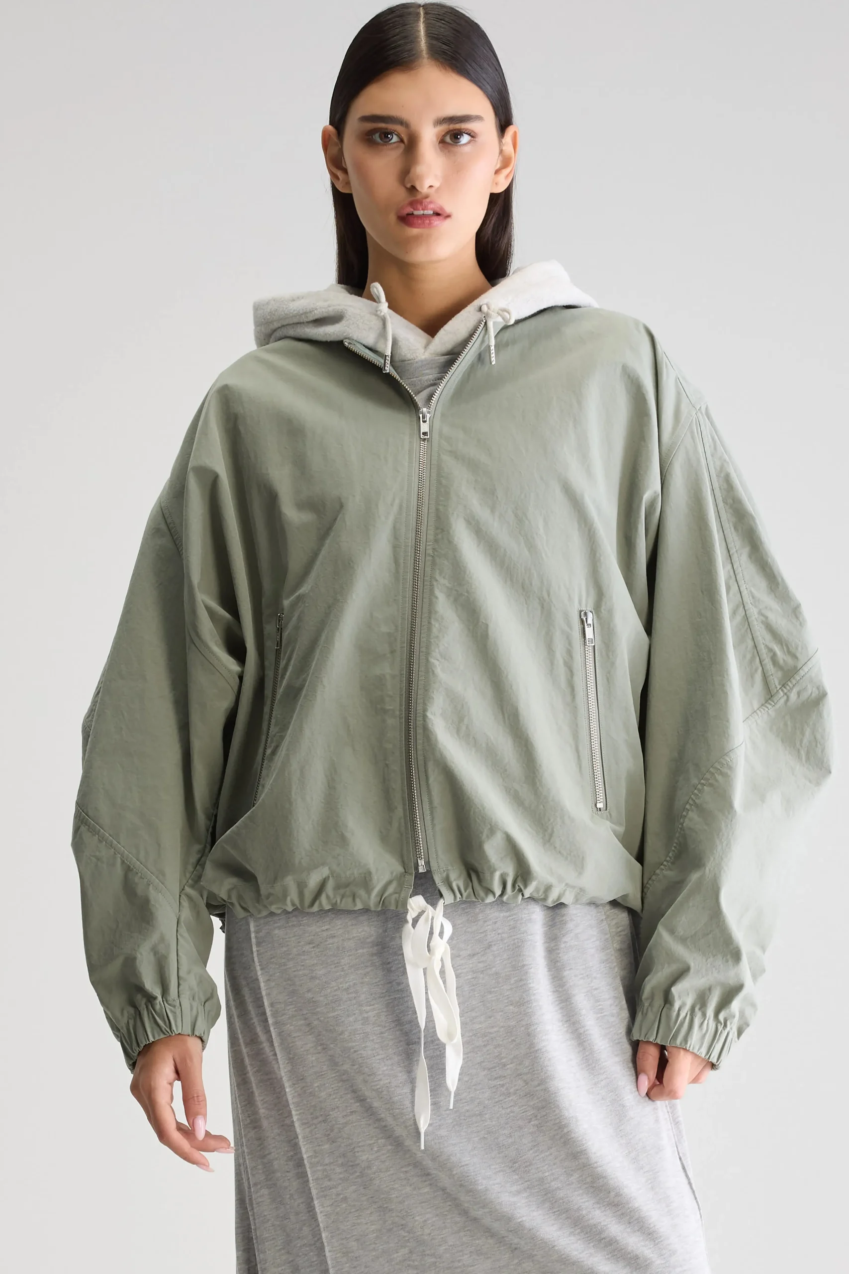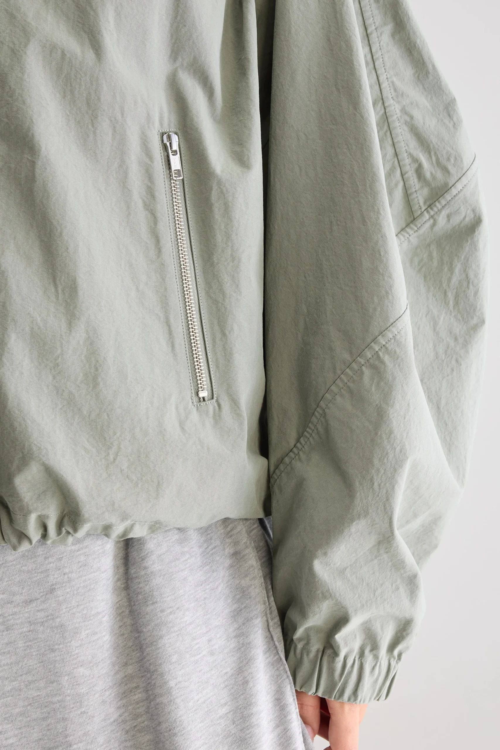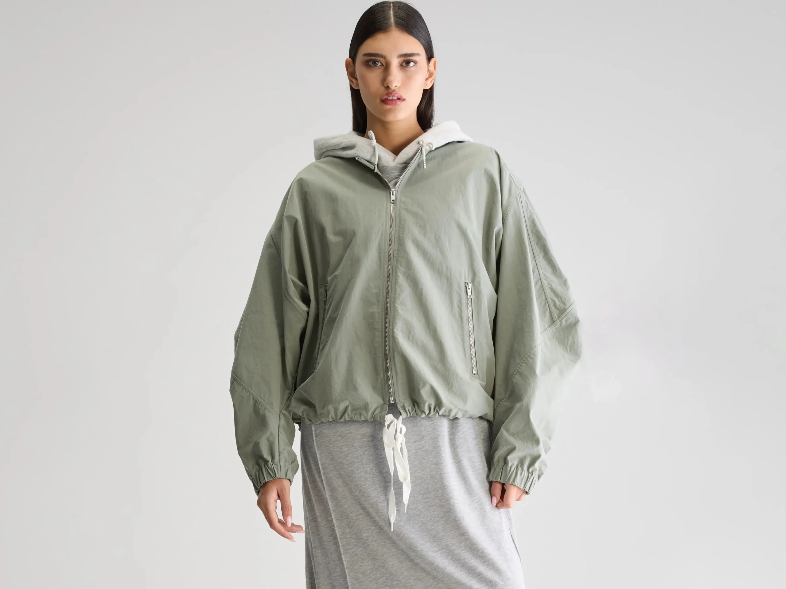 Oversized, grijsgroene jas met ritssluiting aan de voorkant en twee verticale zakken met ritssluiting.Oversized pasvorm : Kies
