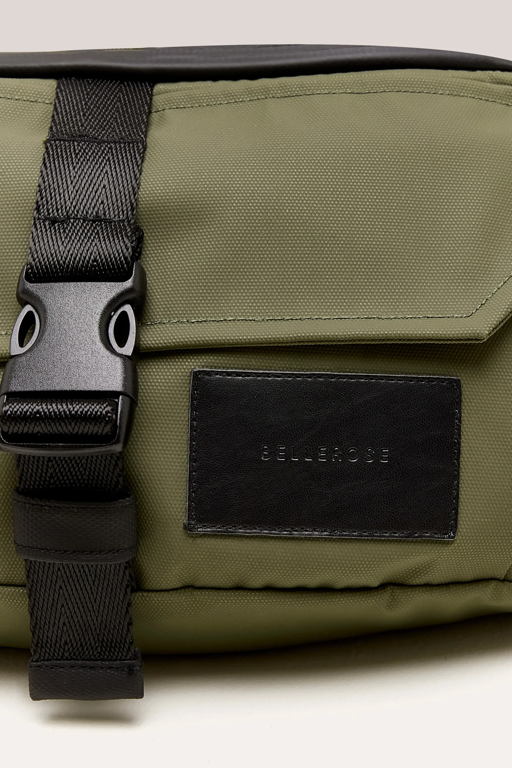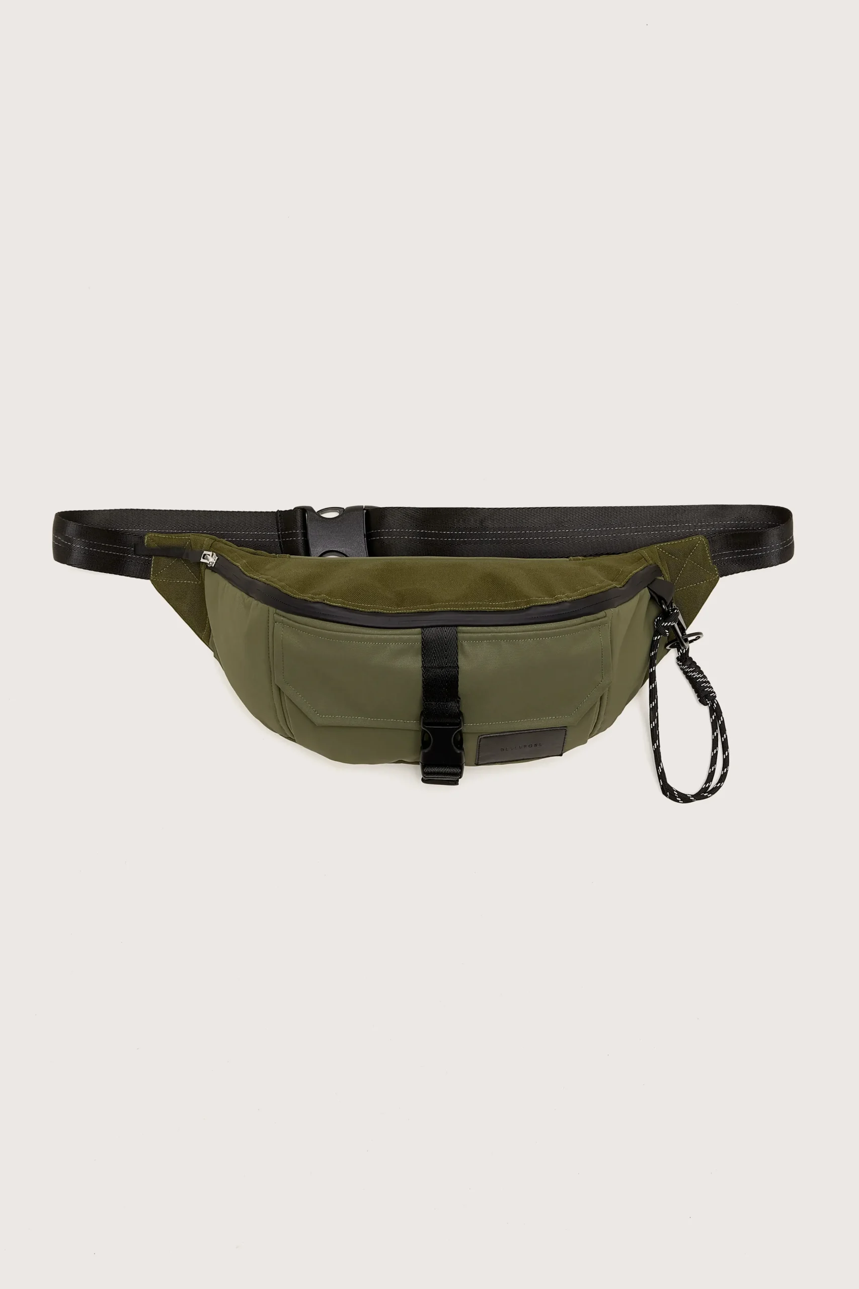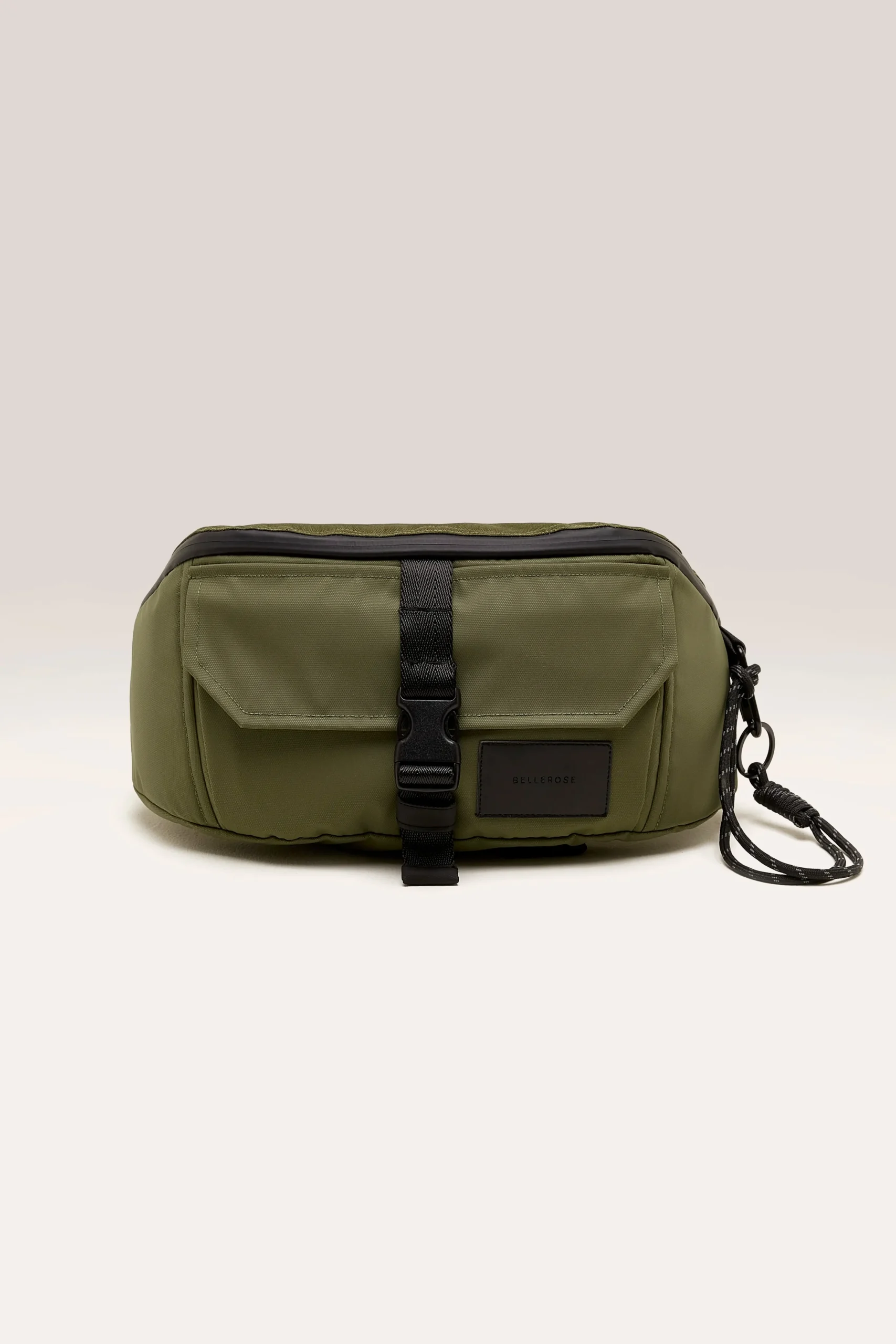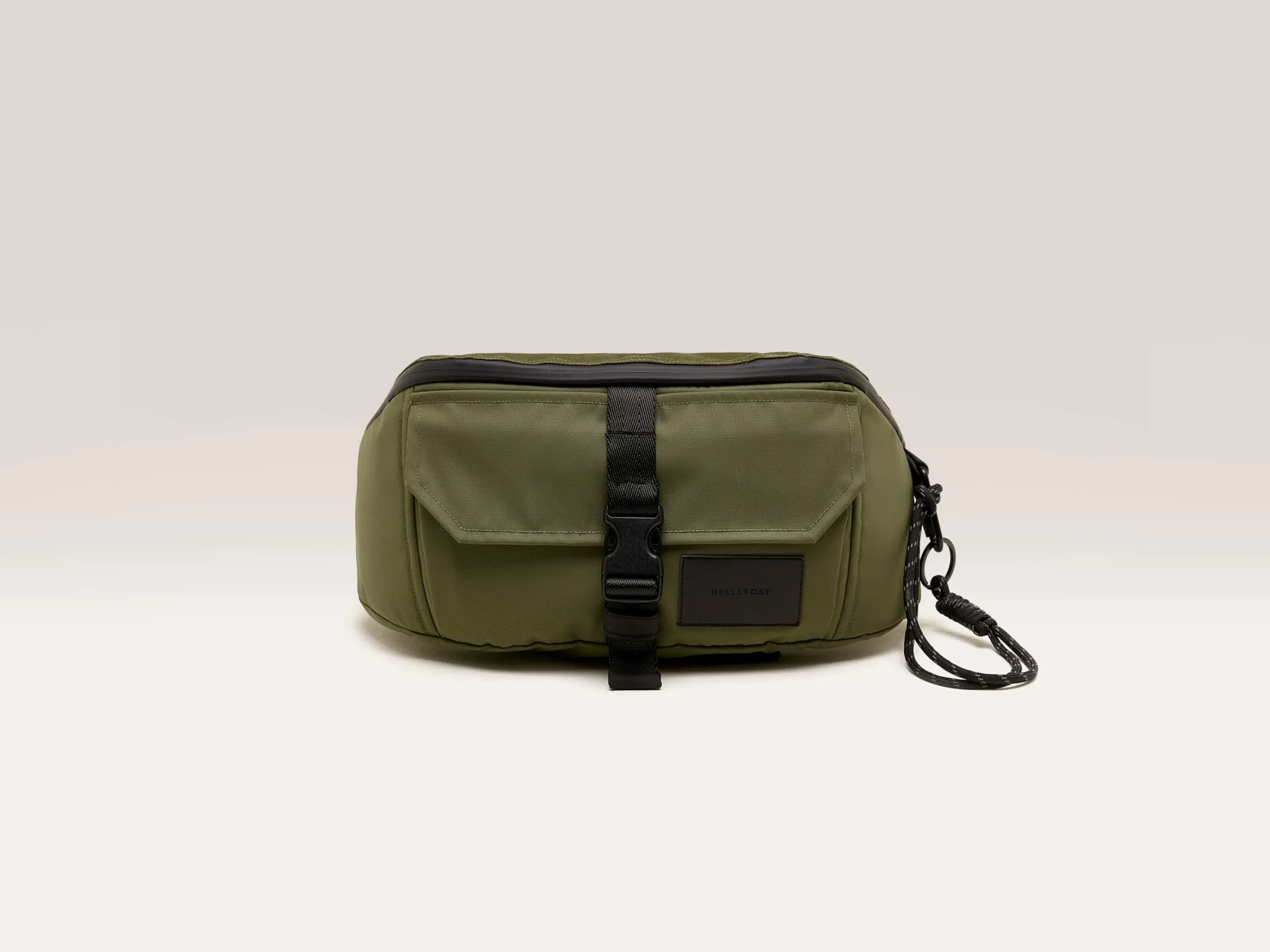 Heuptas met ritssluiting en meerdere zakken, gemaakt van kakigroen, gecoat nylon.Voorzak met knoopsluiting Sleutelhanger met karabijnhaak Toon-op-toon dubbelgestikte riemenMaximale lengte verstelbare riem: 92 cm Afmetingen: 48 x 17 x 8 cm