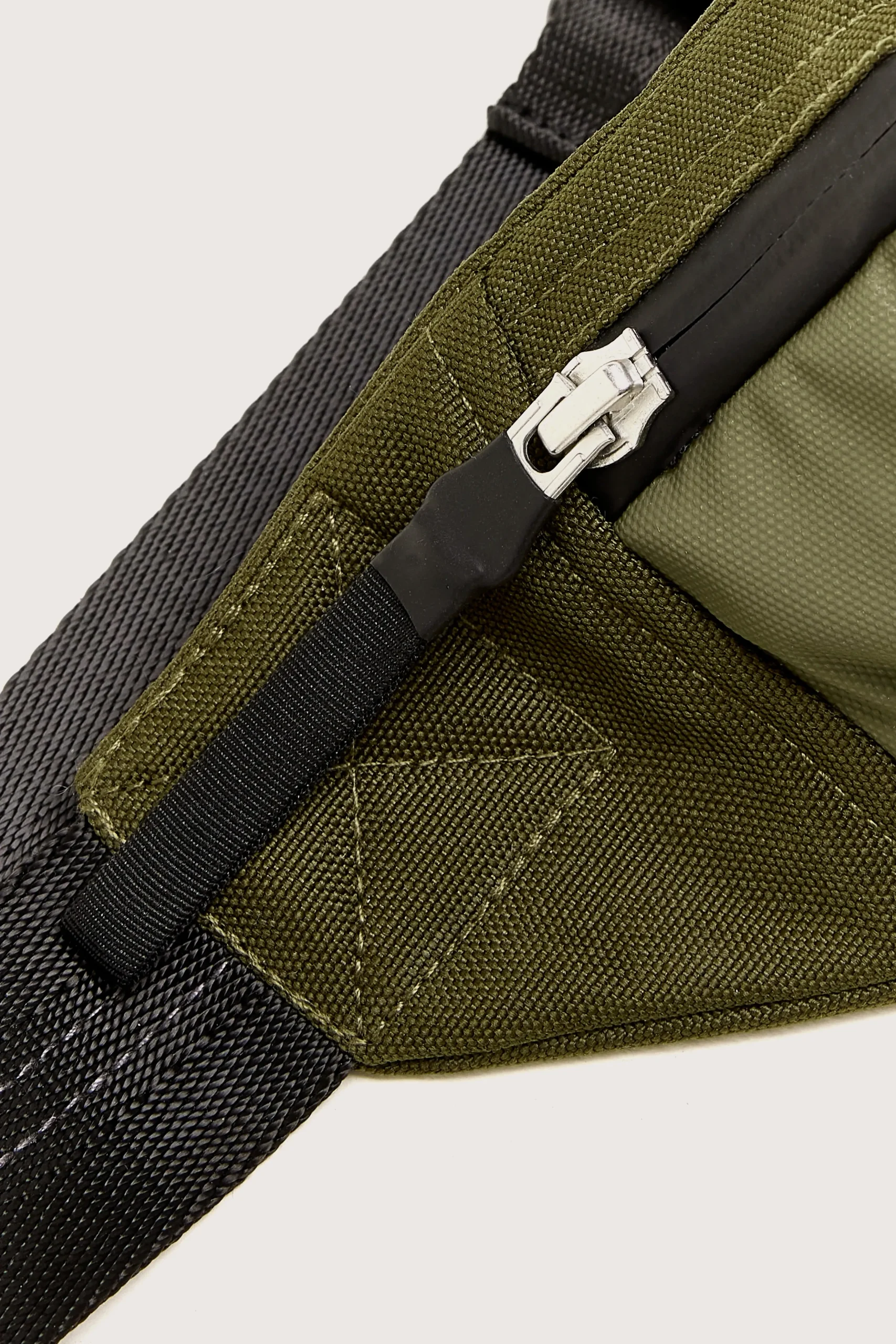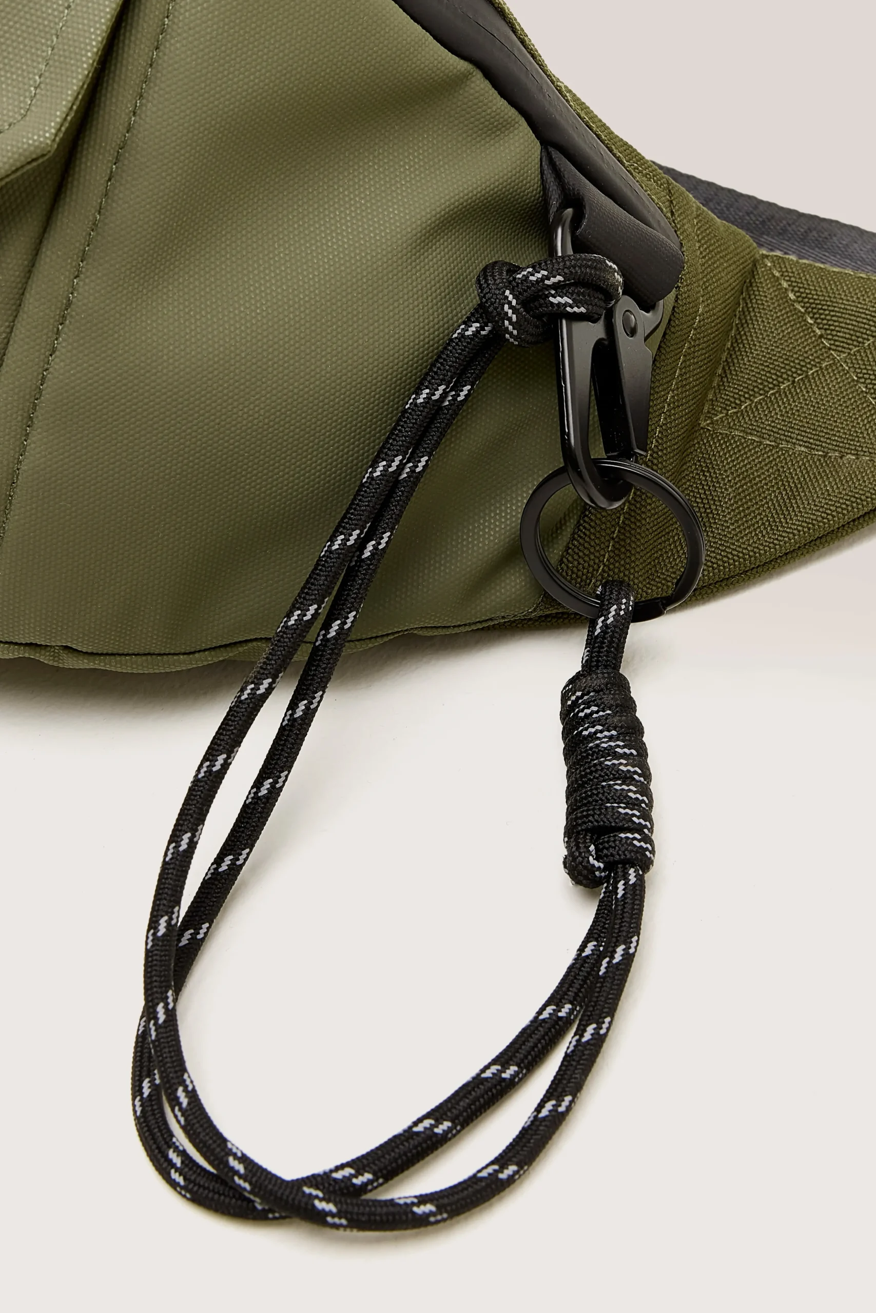 Heuptas met ritssluiting en meerdere zakken, gemaakt van kakigroen, gecoat nylon.Voorzak met knoopsluiting Sleutelhanger…