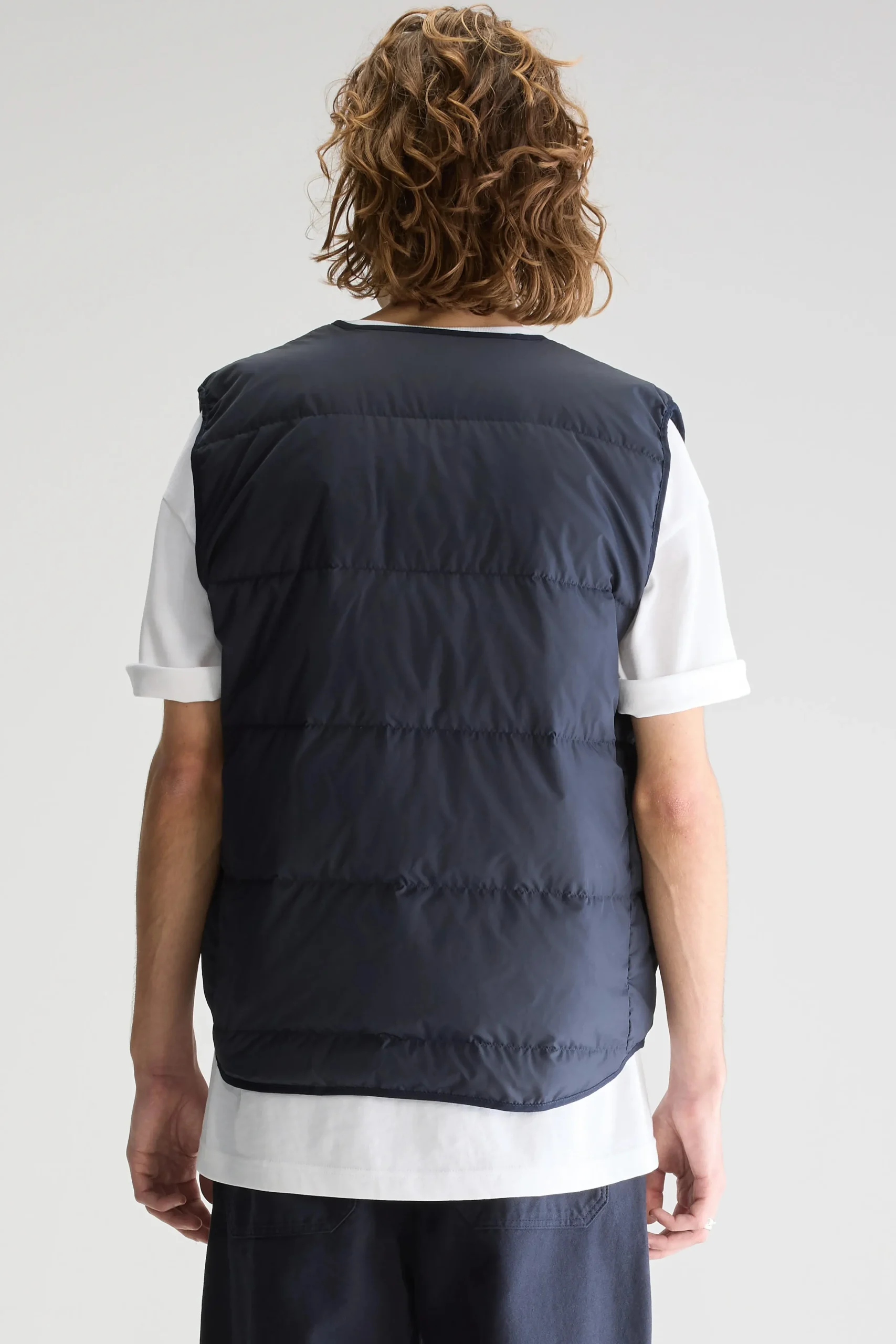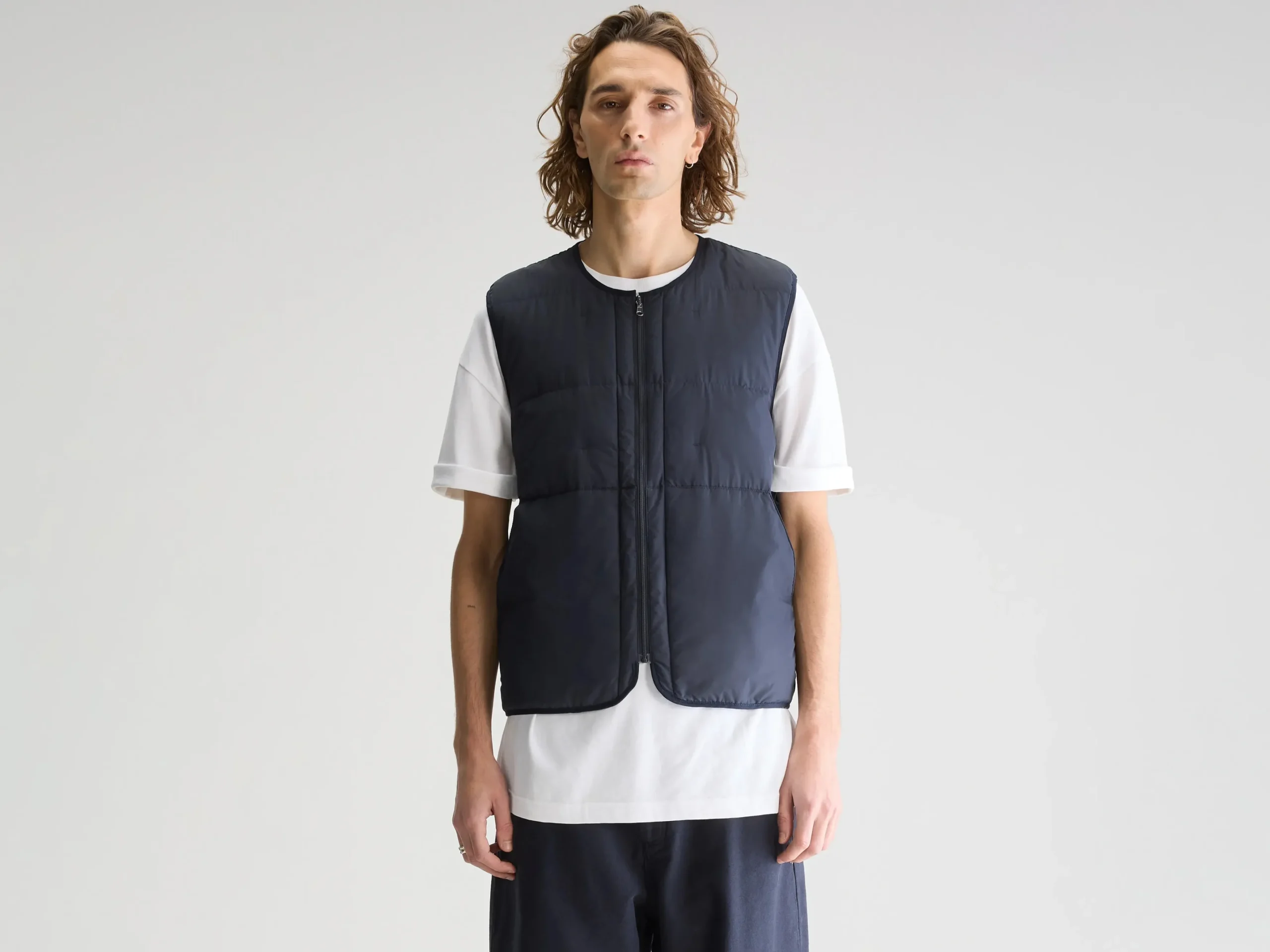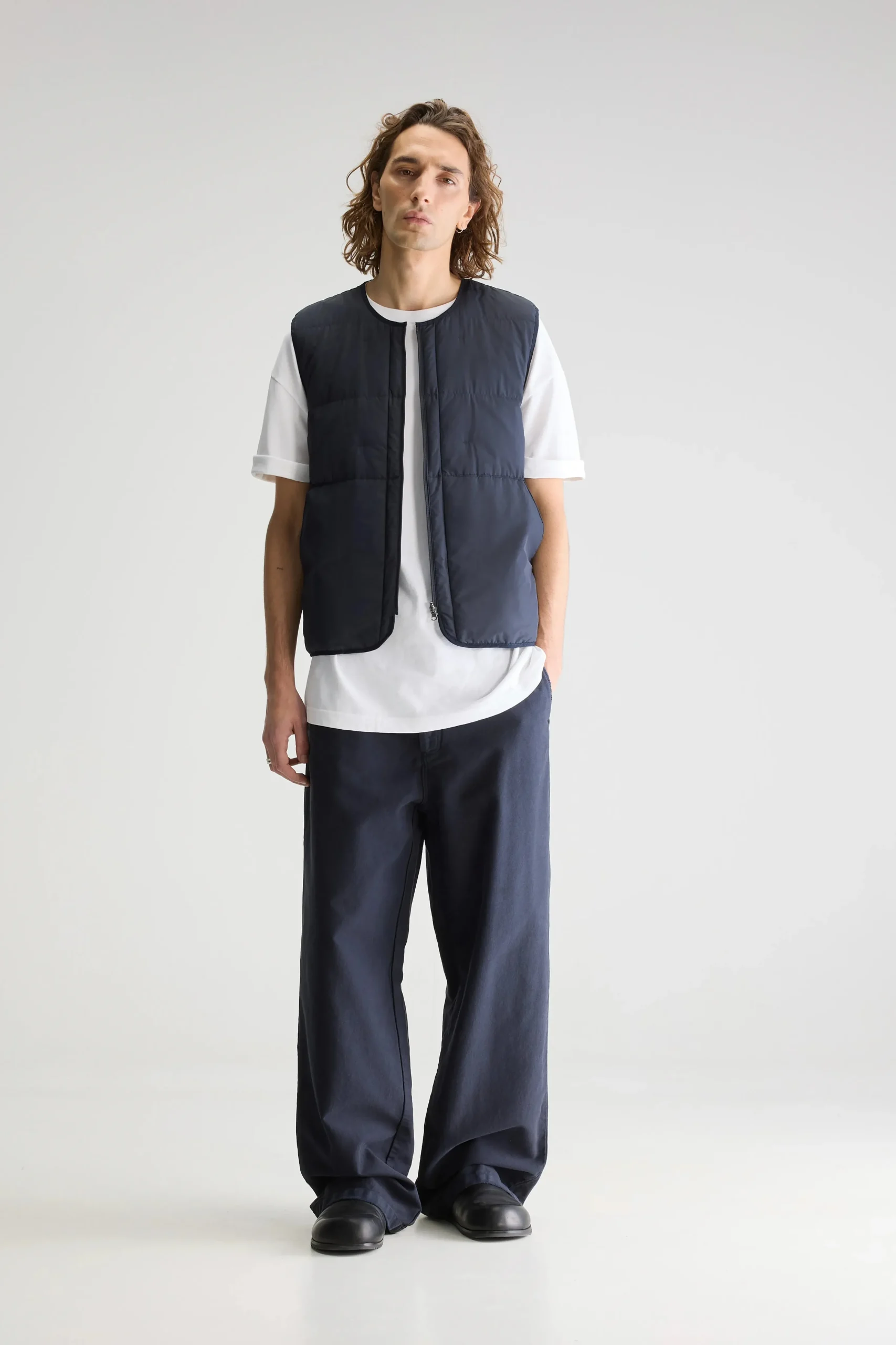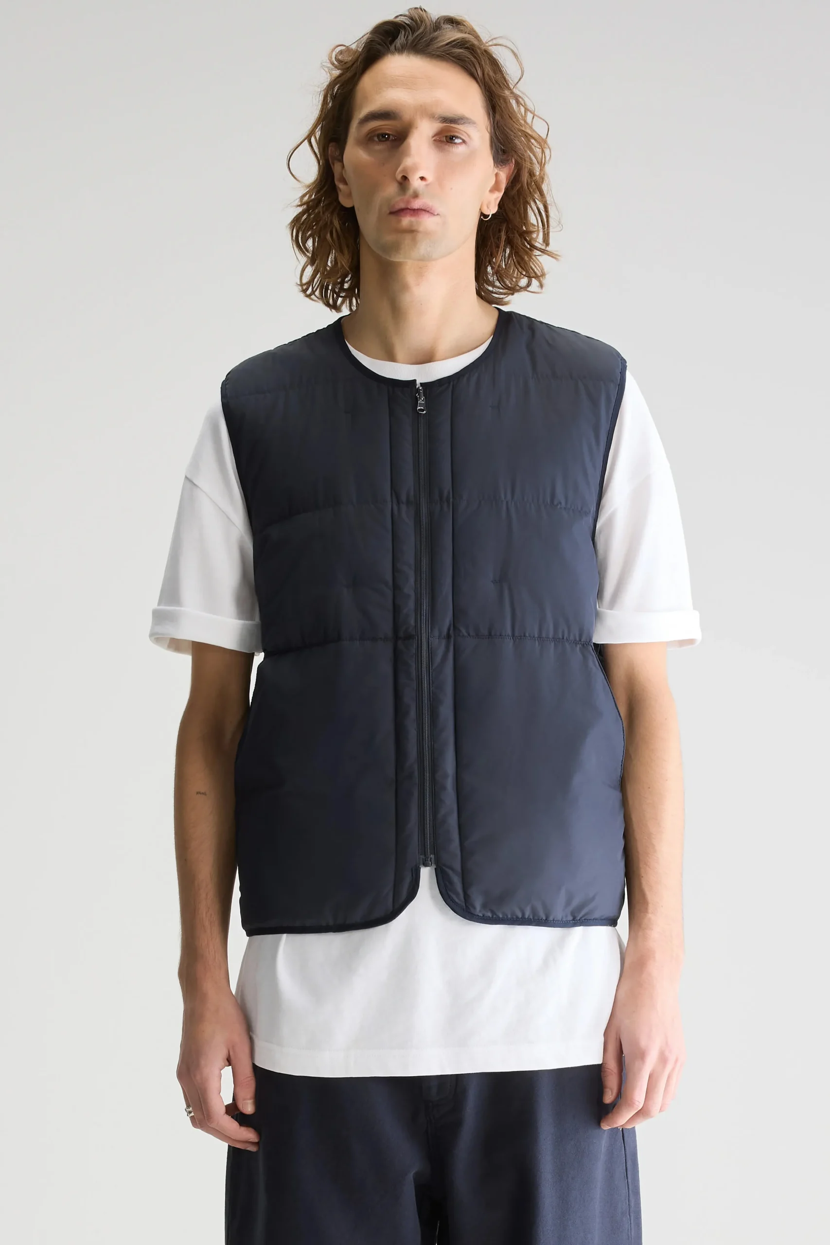 Klassieke bodywarmer met ronde hals en ritssluiting aan de voorkant, gemaakt van gewatteerd marineblauw polyester.Slim fit, recht modelMouwloosRonde halsGewatteerdZijzakken