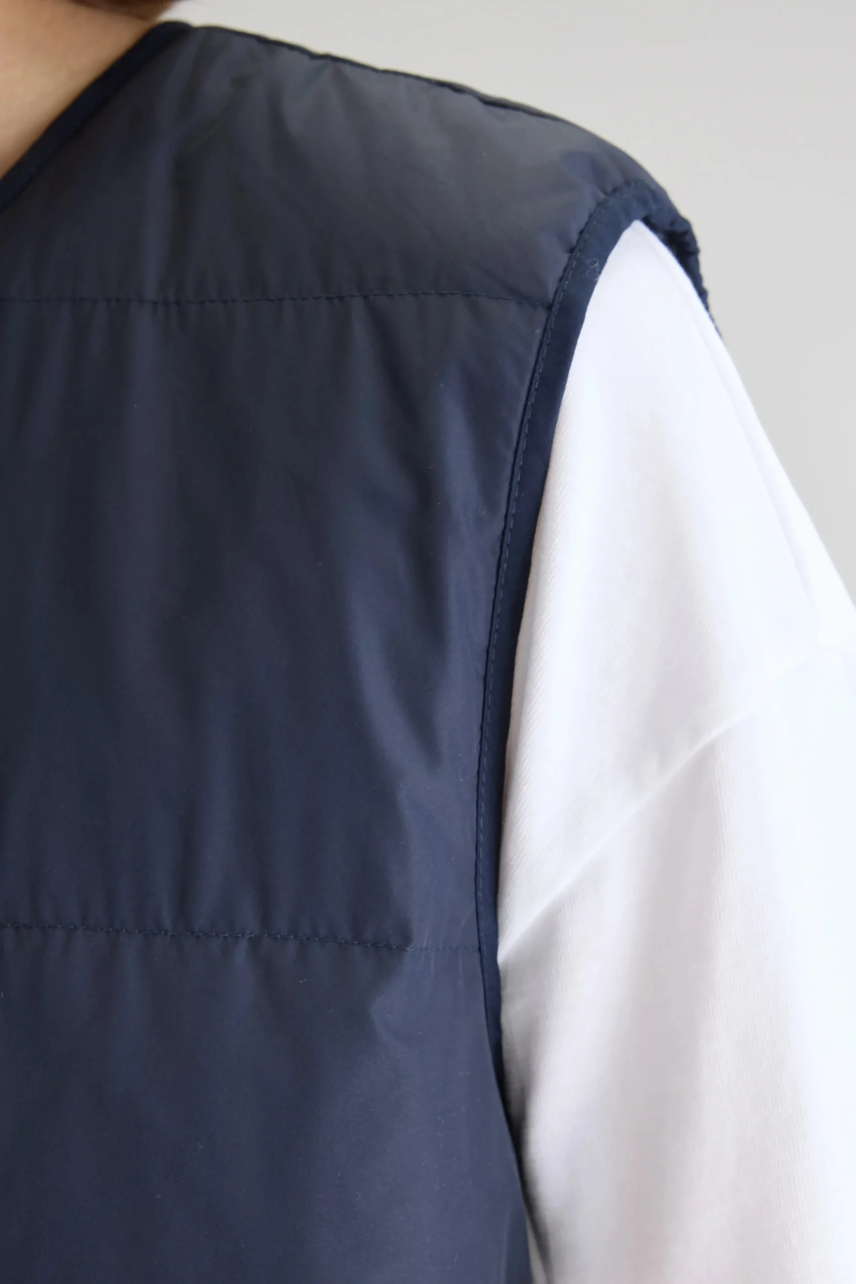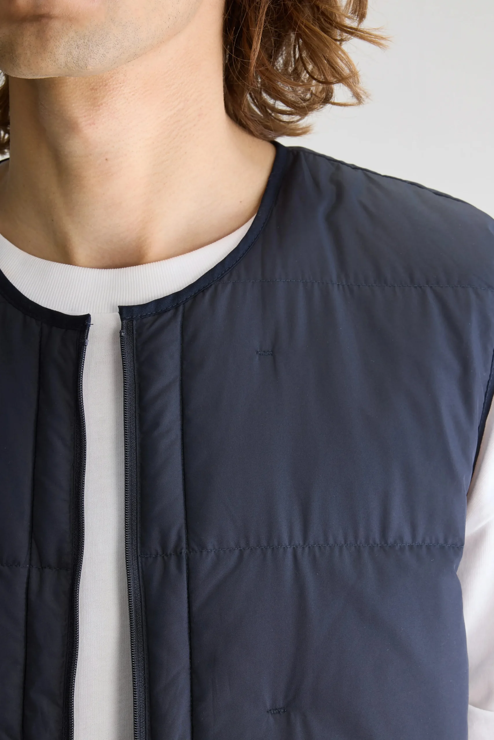 Klassieke bodywarmer met ronde hals en ritssluiting aan de voorkant, gemaakt van gewatteerd marineblauw polyester.Slim f…