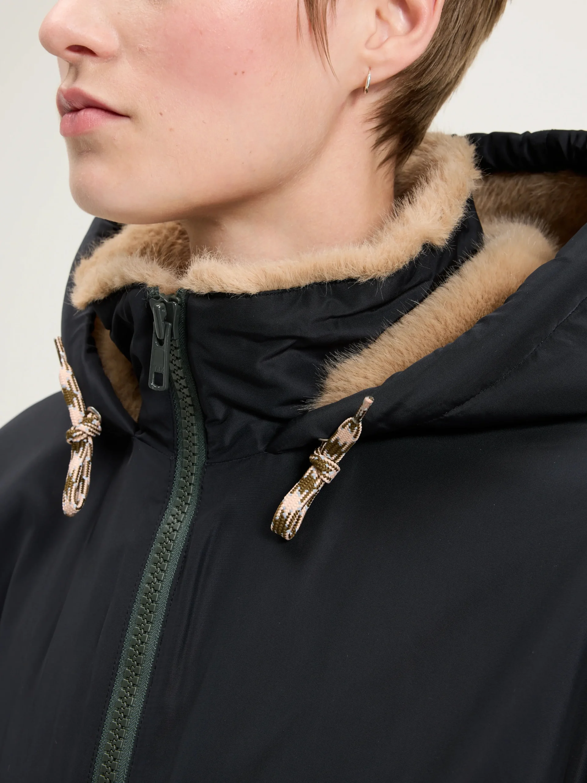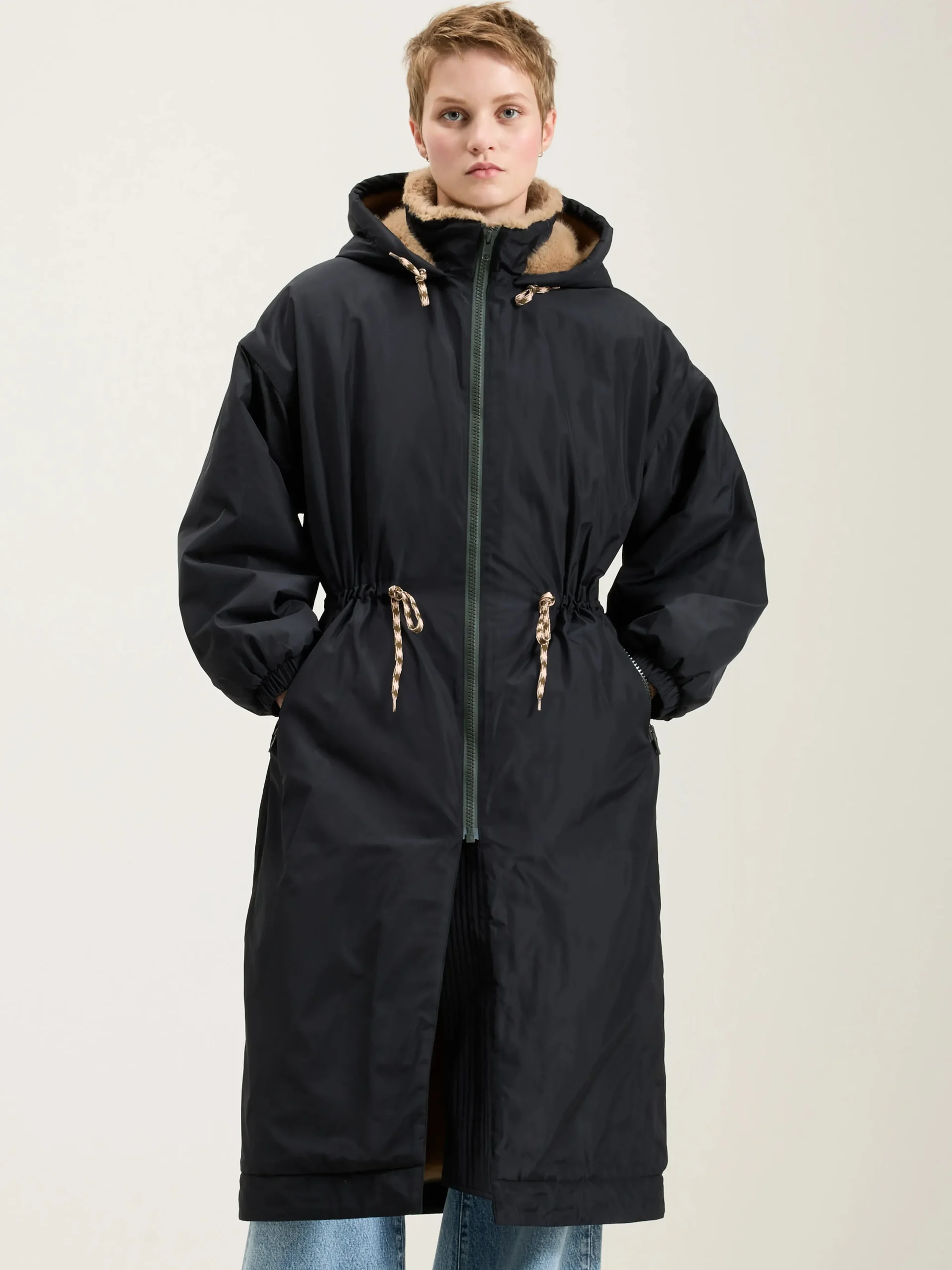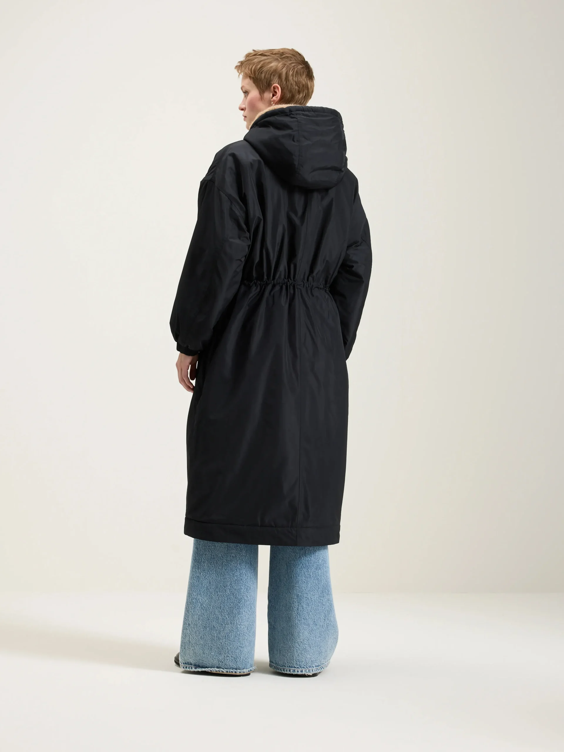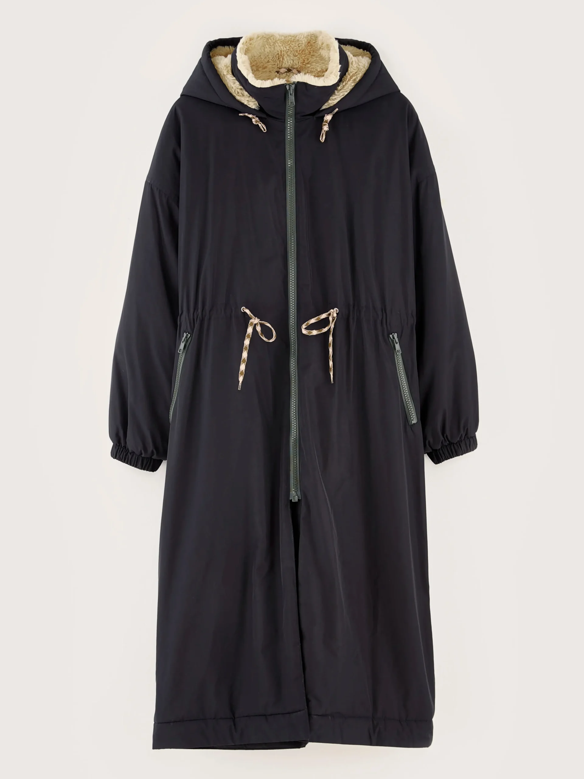 Marineblauwe oversizede parka met verstelbare taille, lage schouderlijn, opstaande kraag, capuchon en zakken met ritssluiting.WaterafstotendRitssluiting vooraanEcru imitatiebont voeringElastische mouwrandenVerstelbaar trekkoord aan de capuchon en tailleOntworpen om