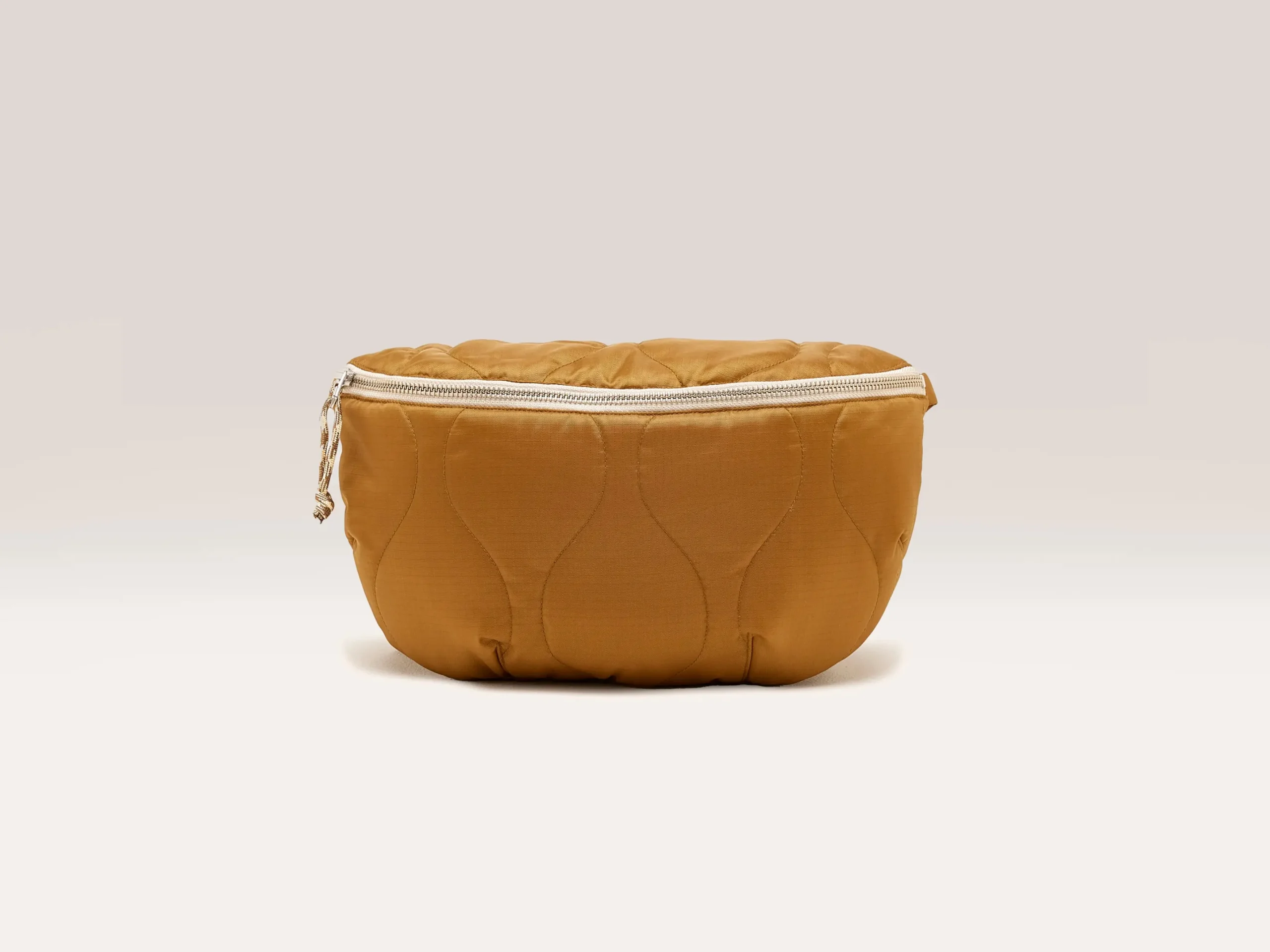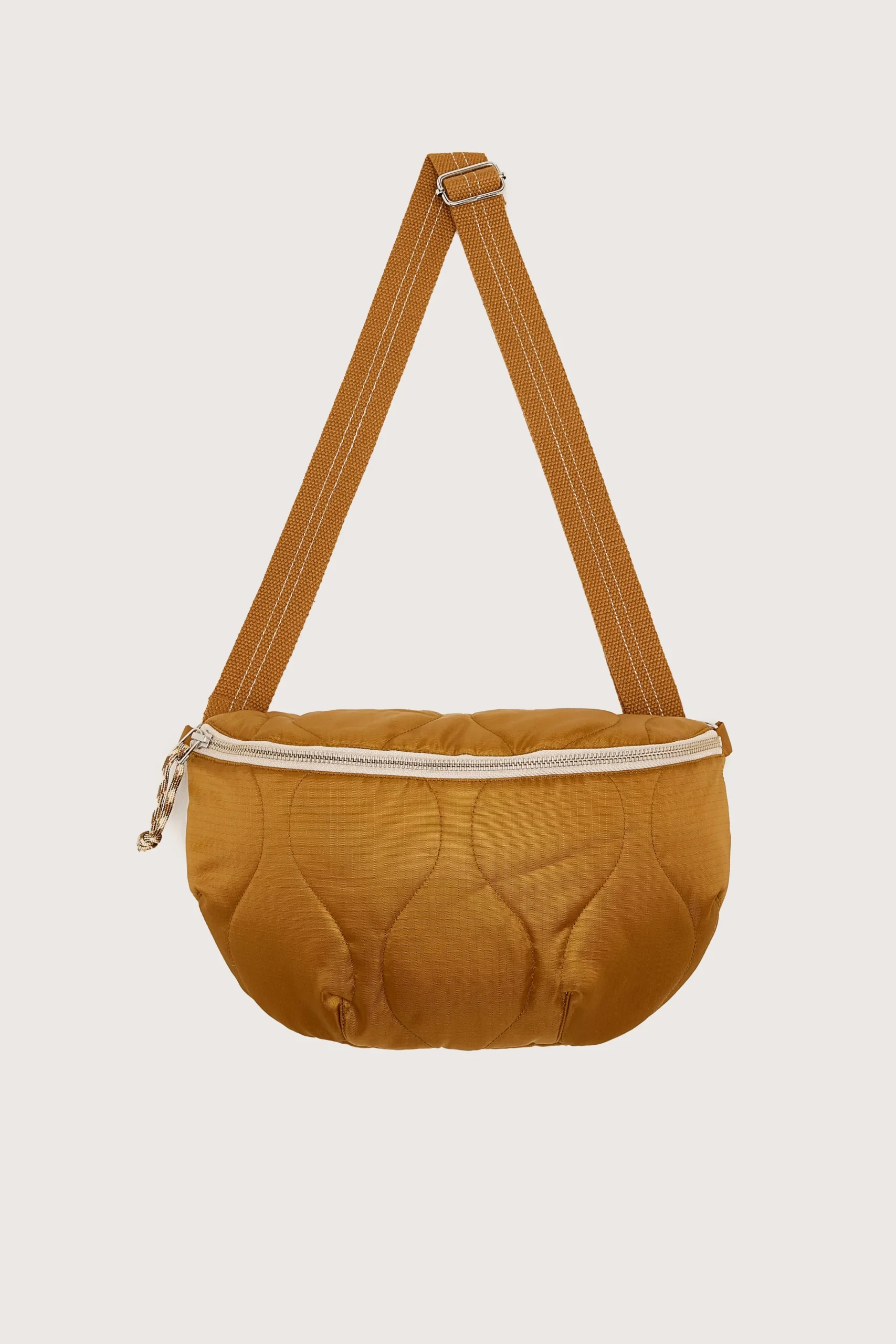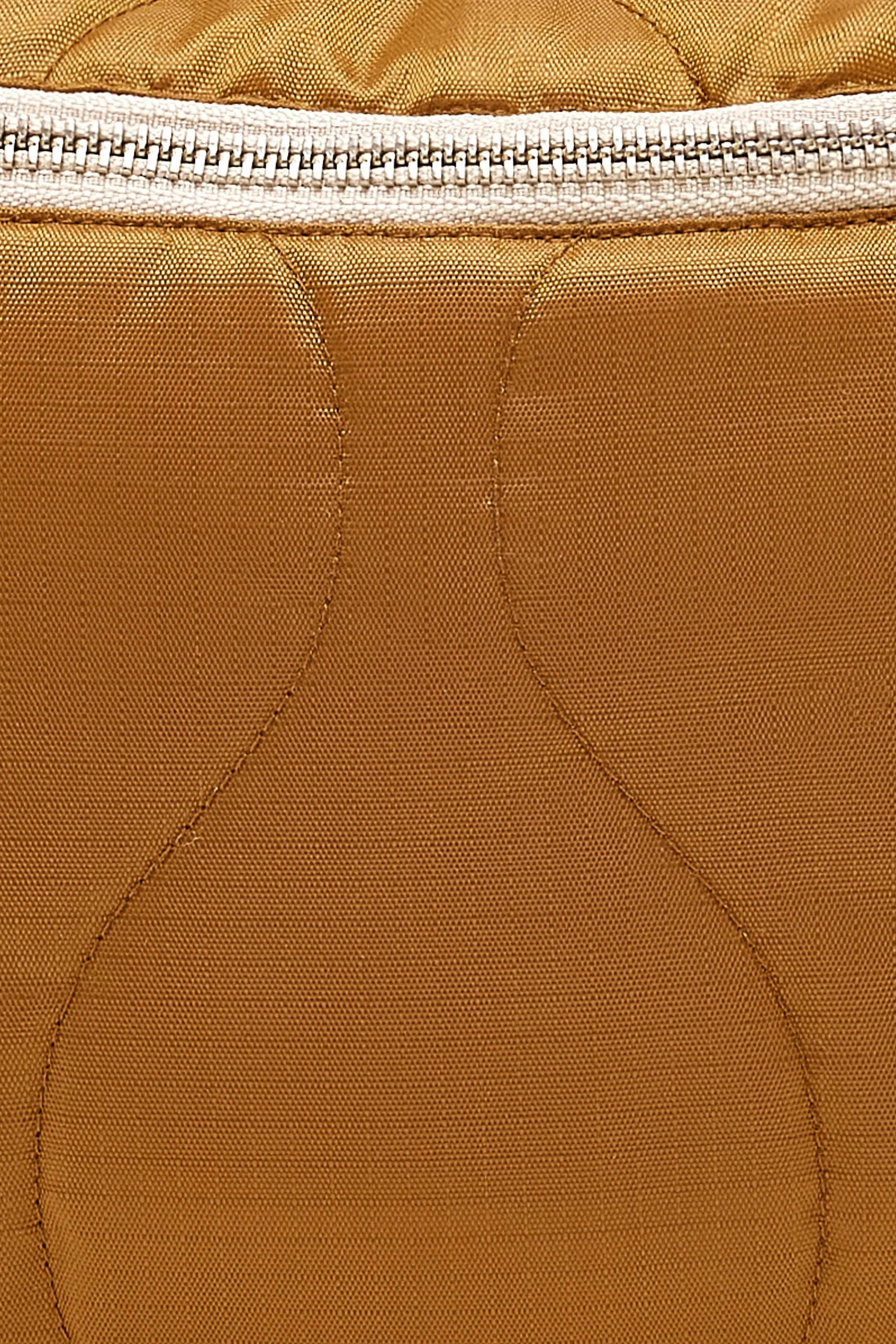 Sling bag met ritssluiting vooraan, van amber bruin, gewatteerd nylon.Metalen ritssluiting met sluiter in een contraster…