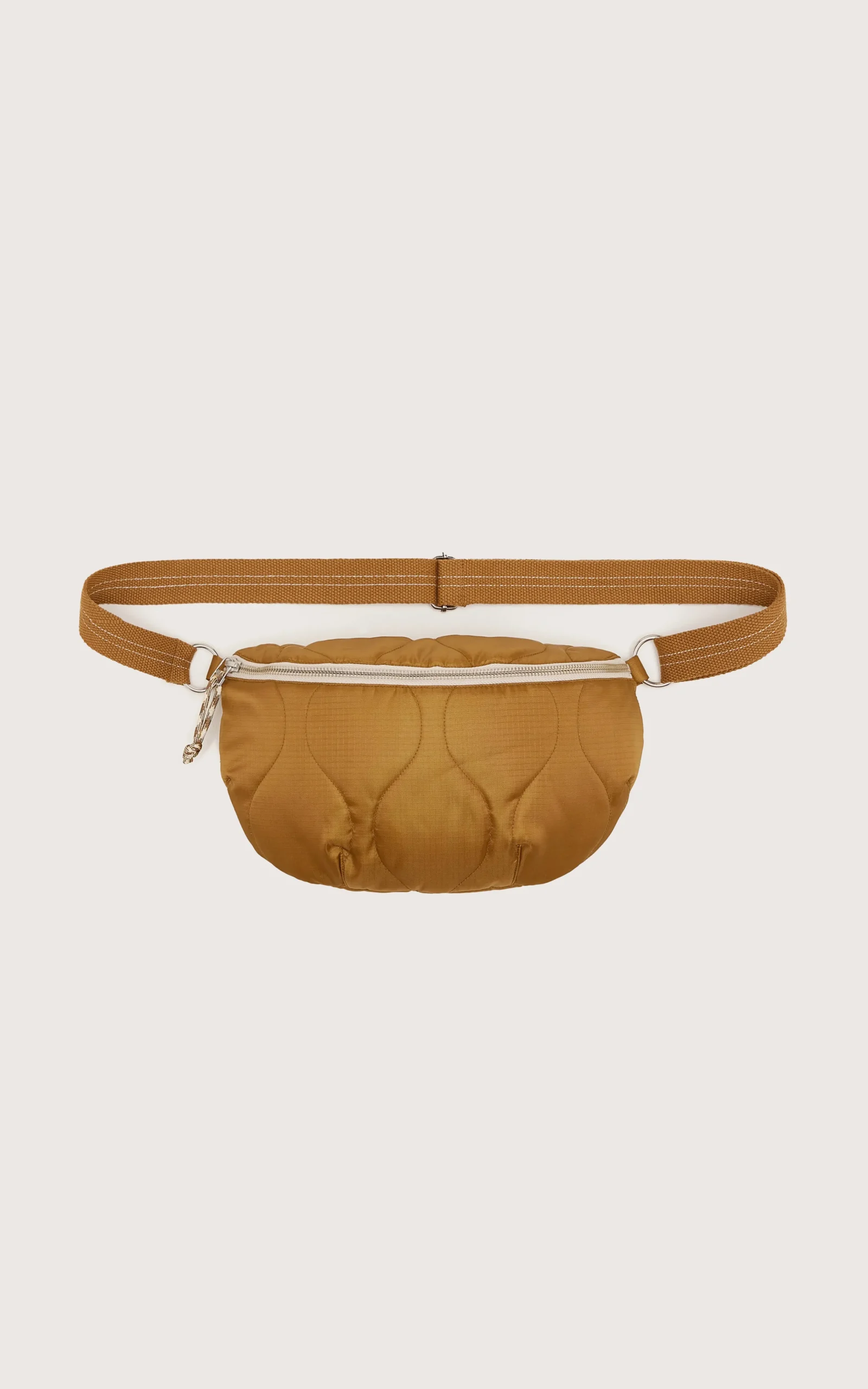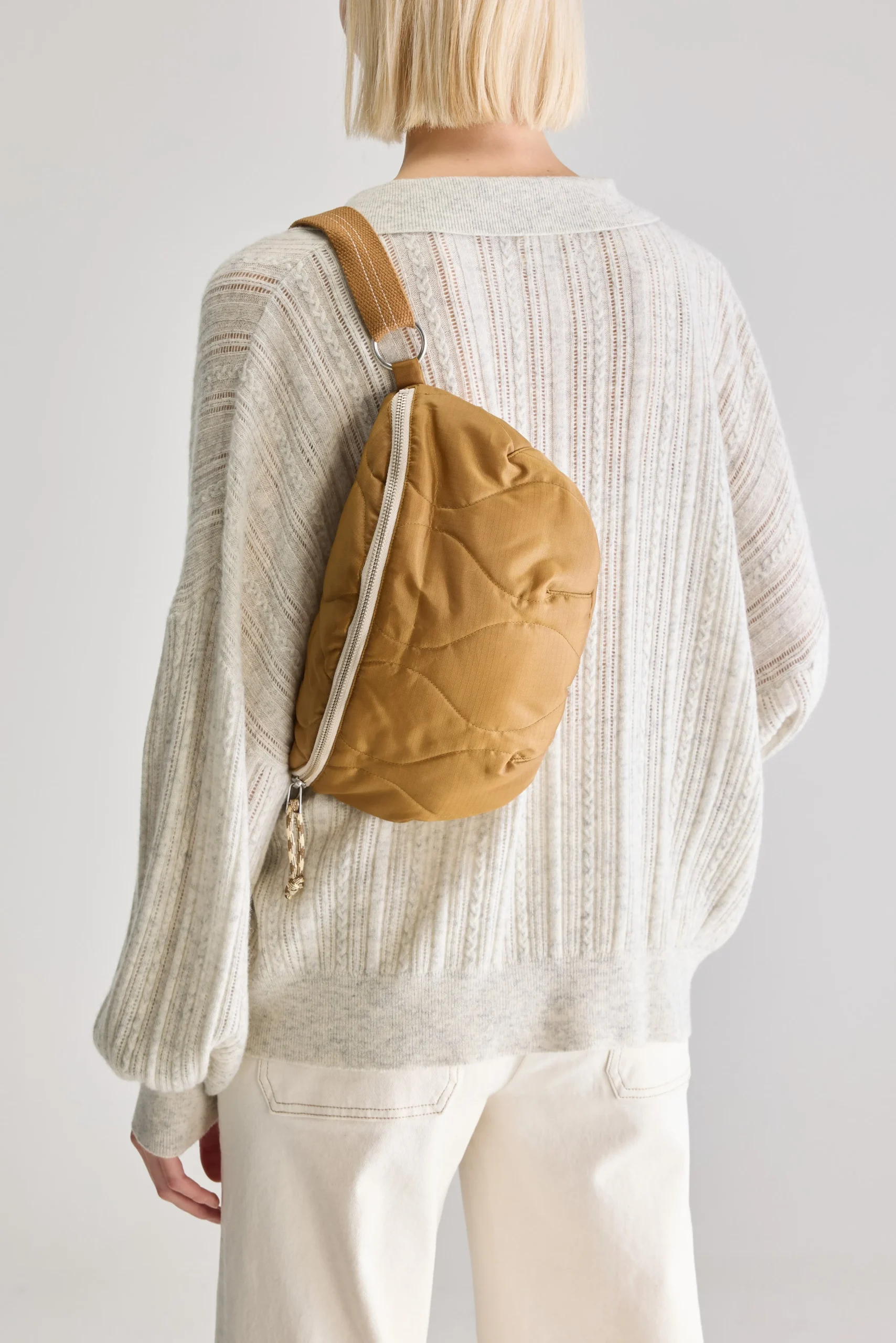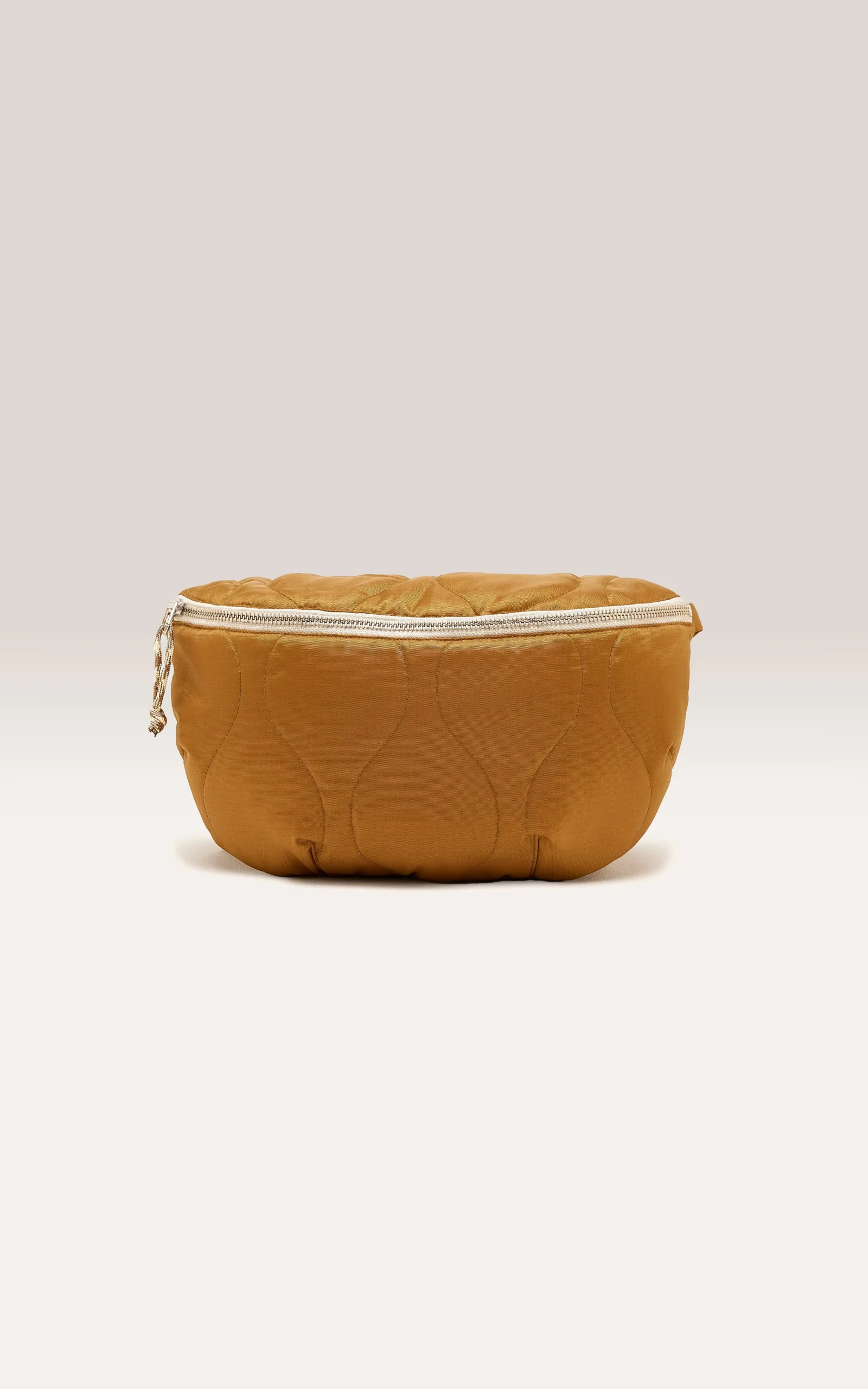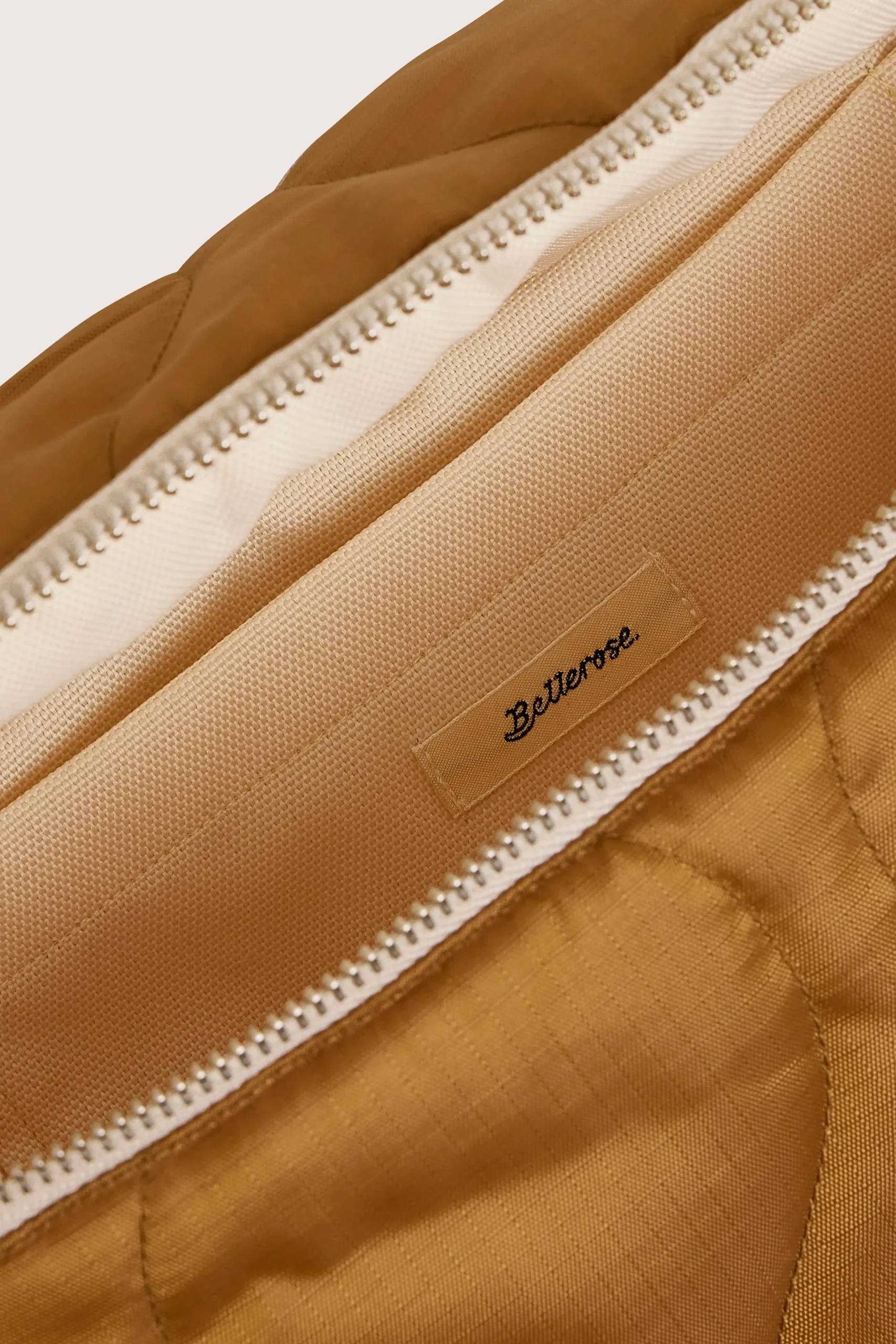 Sling bag met ritssluiting vooraan, van amber bruin, gewatteerd nylon.Metalen ritssluiting met sluiter in een contraster…