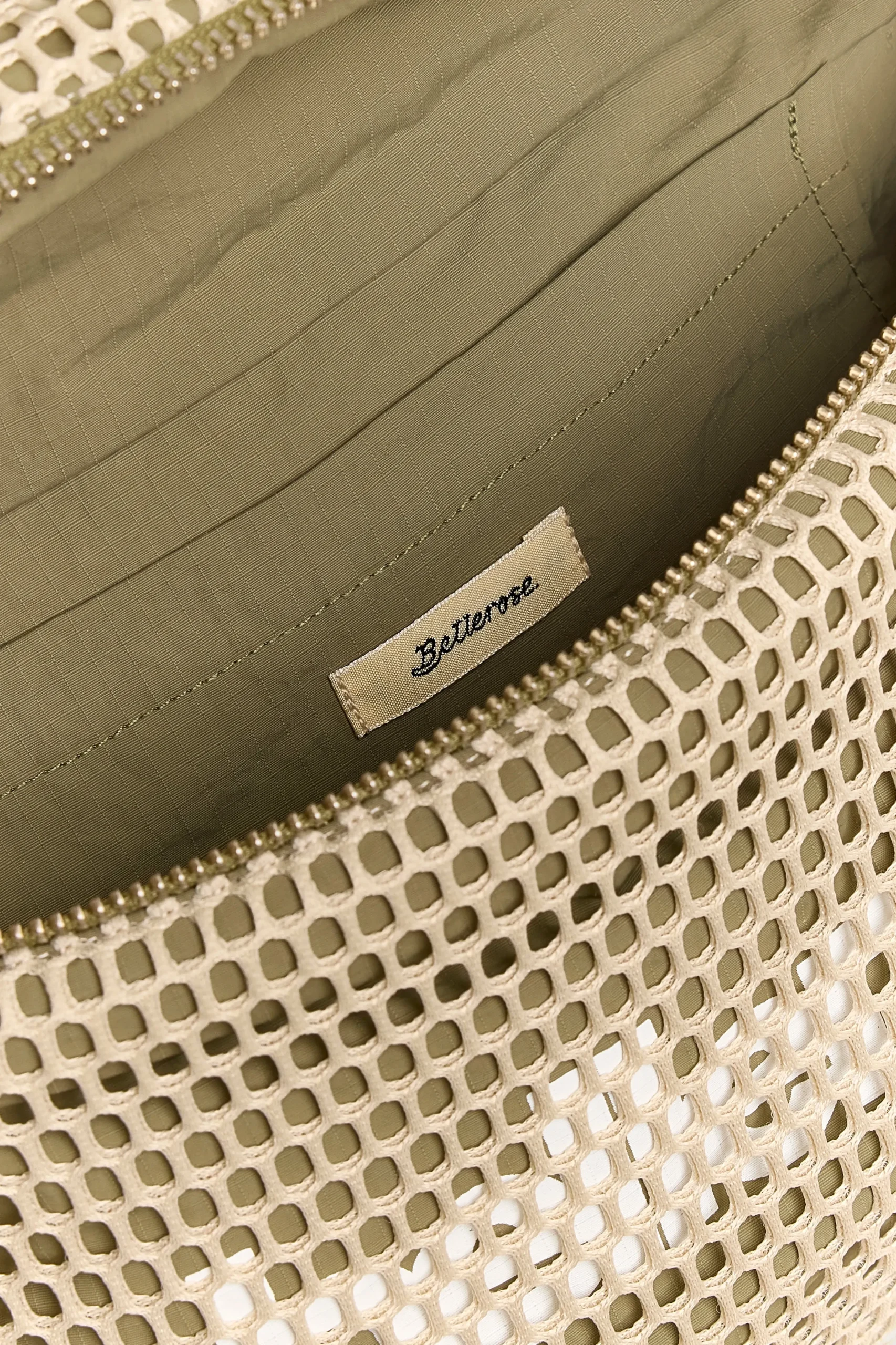 Heuptas met rits met modern design gemaakt van off-white mesh over kakigroene laag, met vet “Bellerose”-logo.Metalen r…