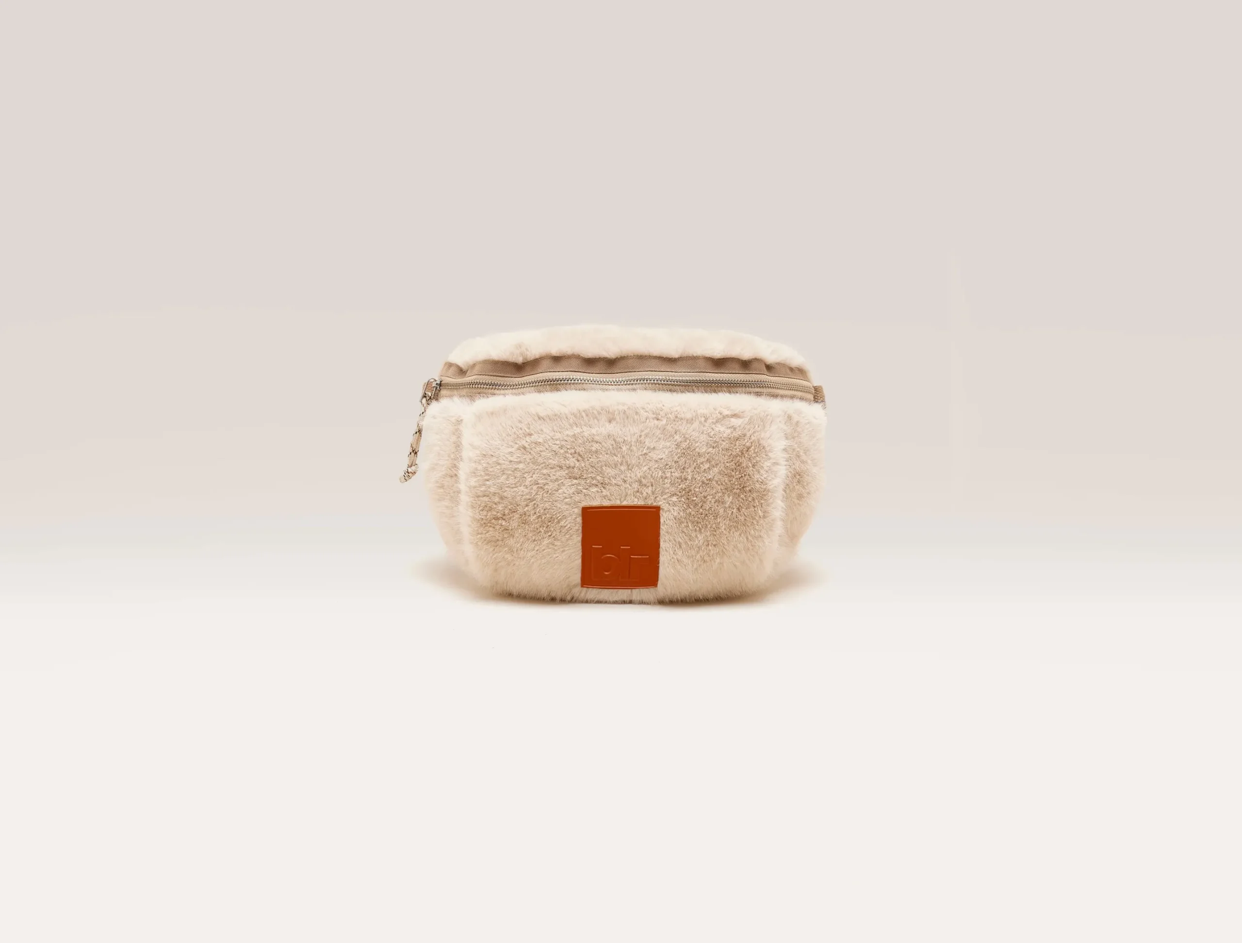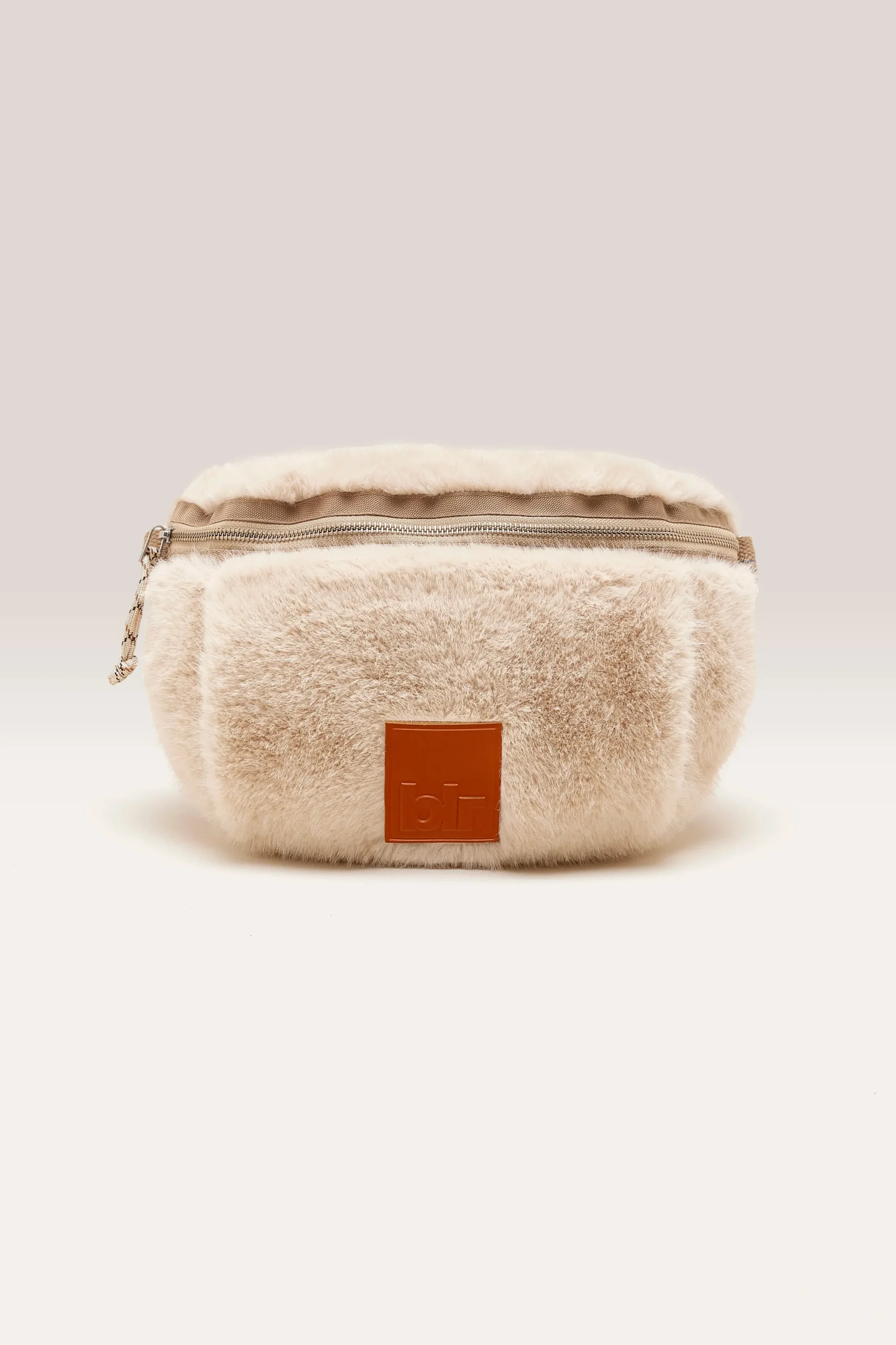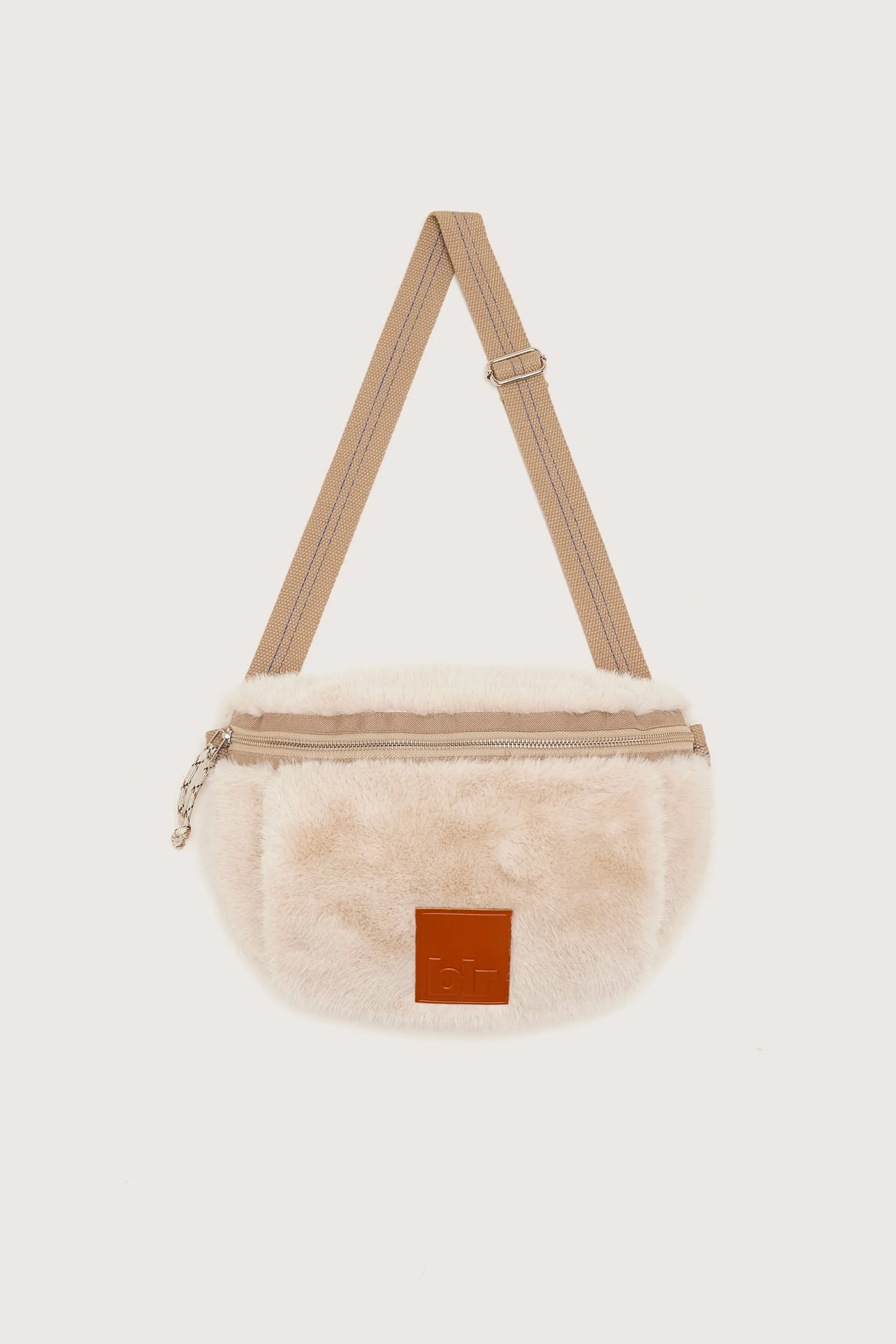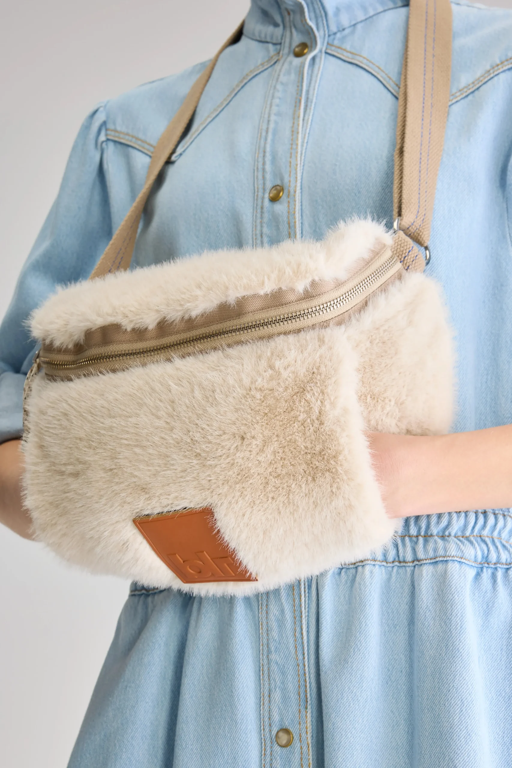 Moftas met handwarmingszak en Bellerose lipje aan de voorkant, gemaakt van ecru imitatiebont.Handverwarmende zak met zijsplitten en gevoerd met fleece Ritssluiting Afmetingen: 29x18x10 cmMaximale riemlengte (verstelbaar): 115 cm