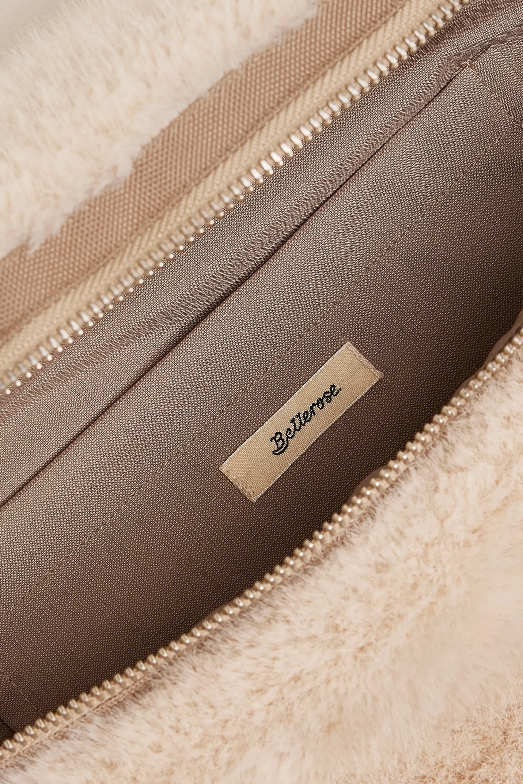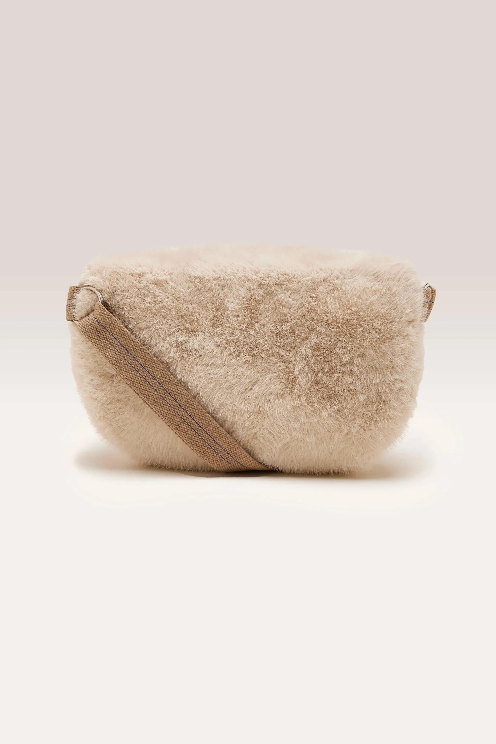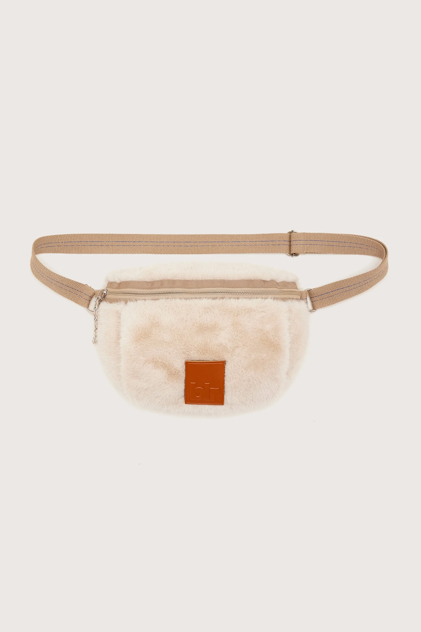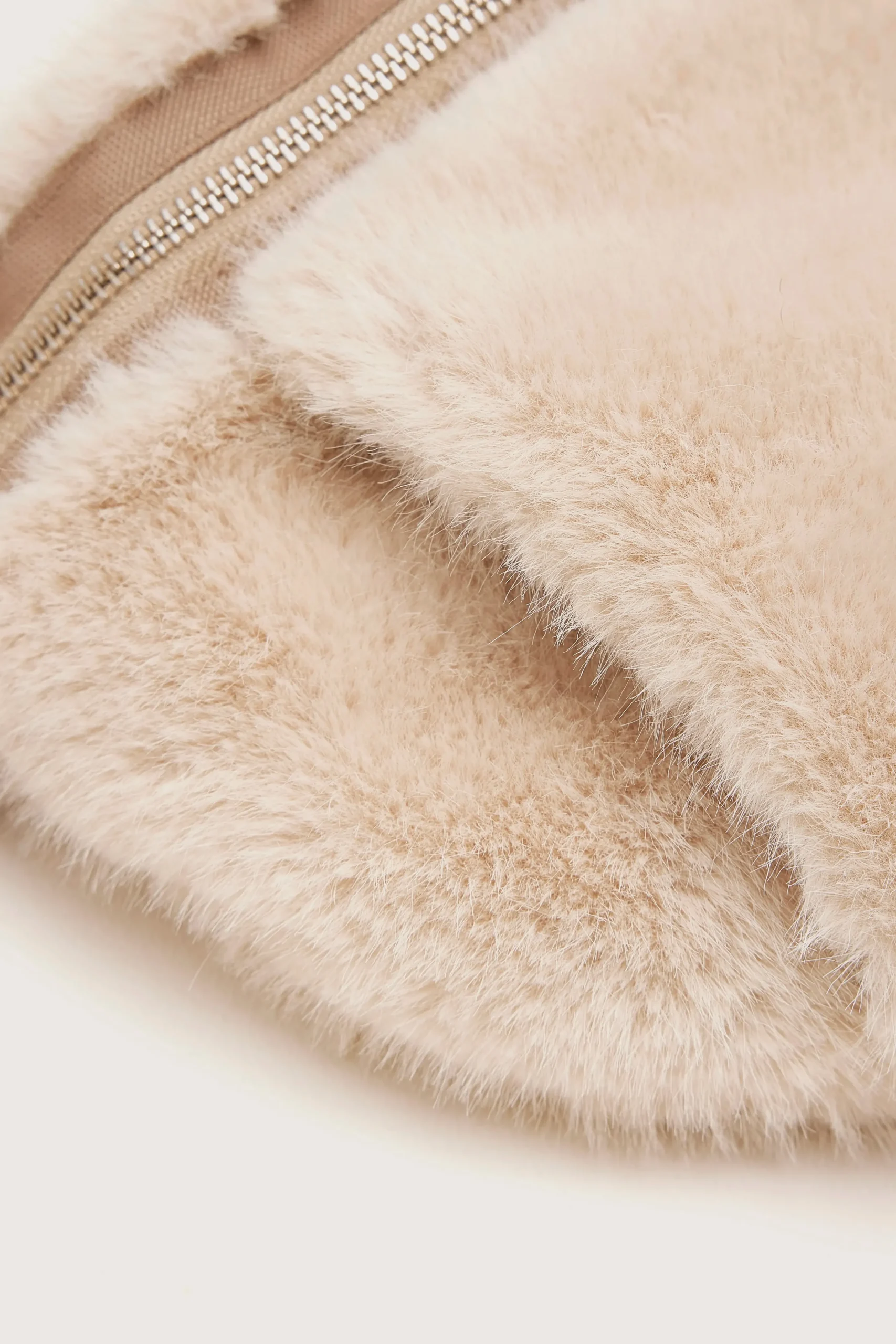 Moftas met handwarmingszak en Bellerose lipje aan de voorkant, gemaakt van ecru imitatiebont.Handverwarmende zak met zijsplitten en gevoerd met fleece Ritssluiting Afmetingen: 29x18x10 cmMaximale riemlengte (verstelbaar): 115 cm