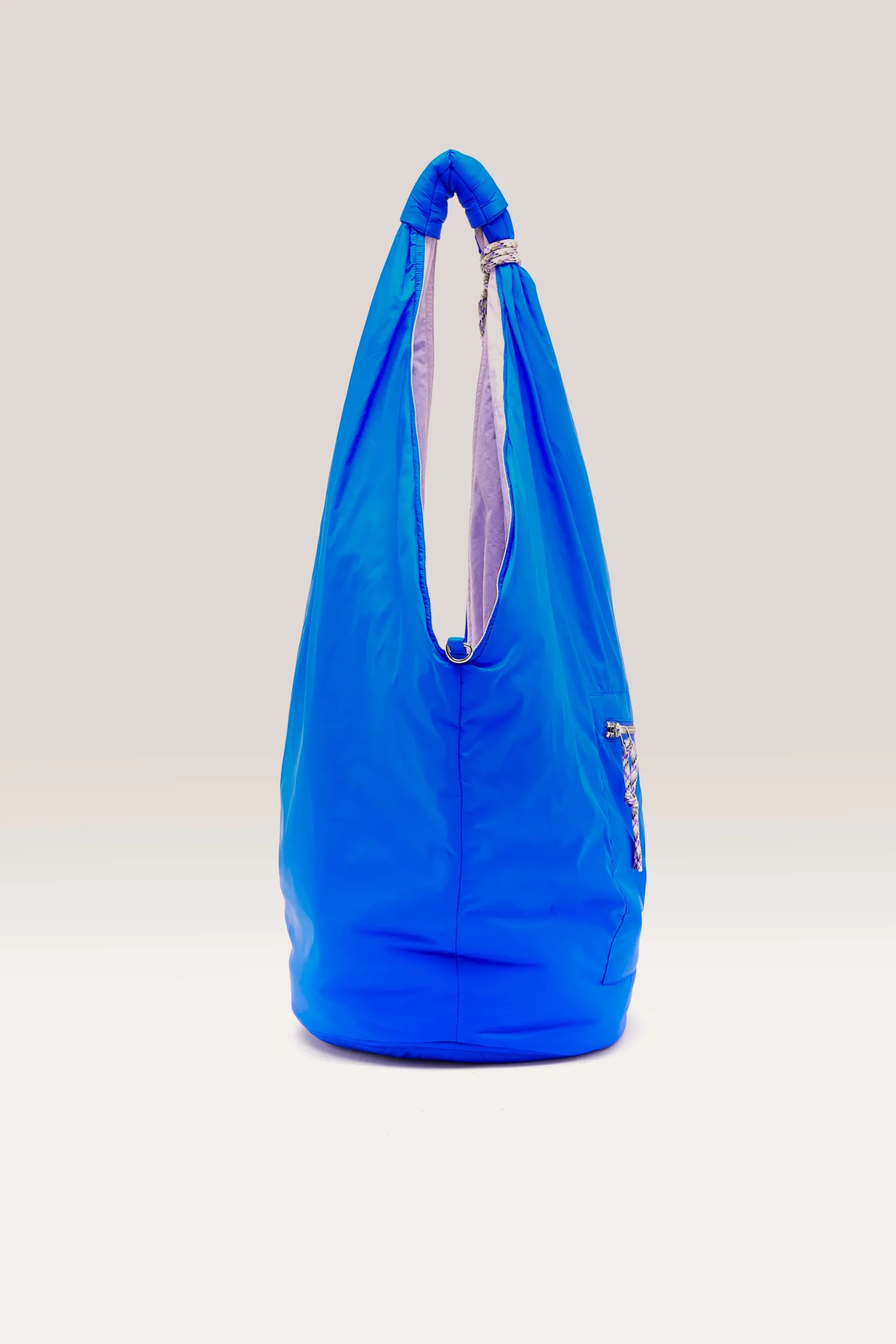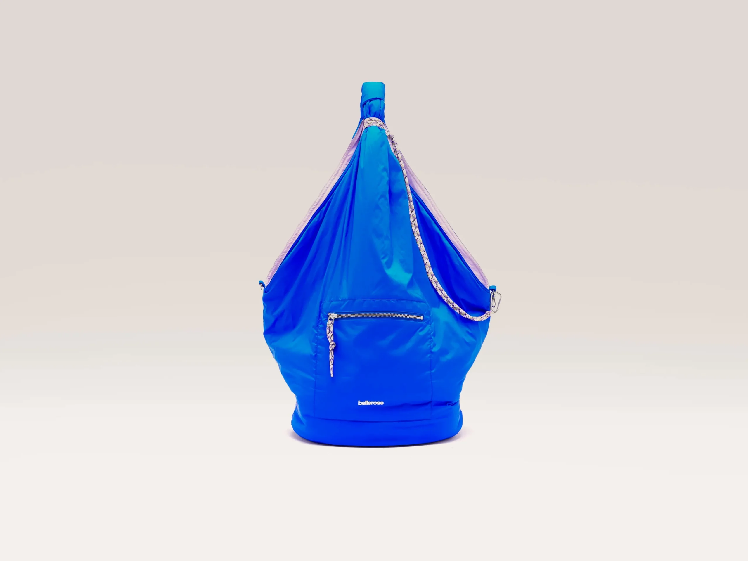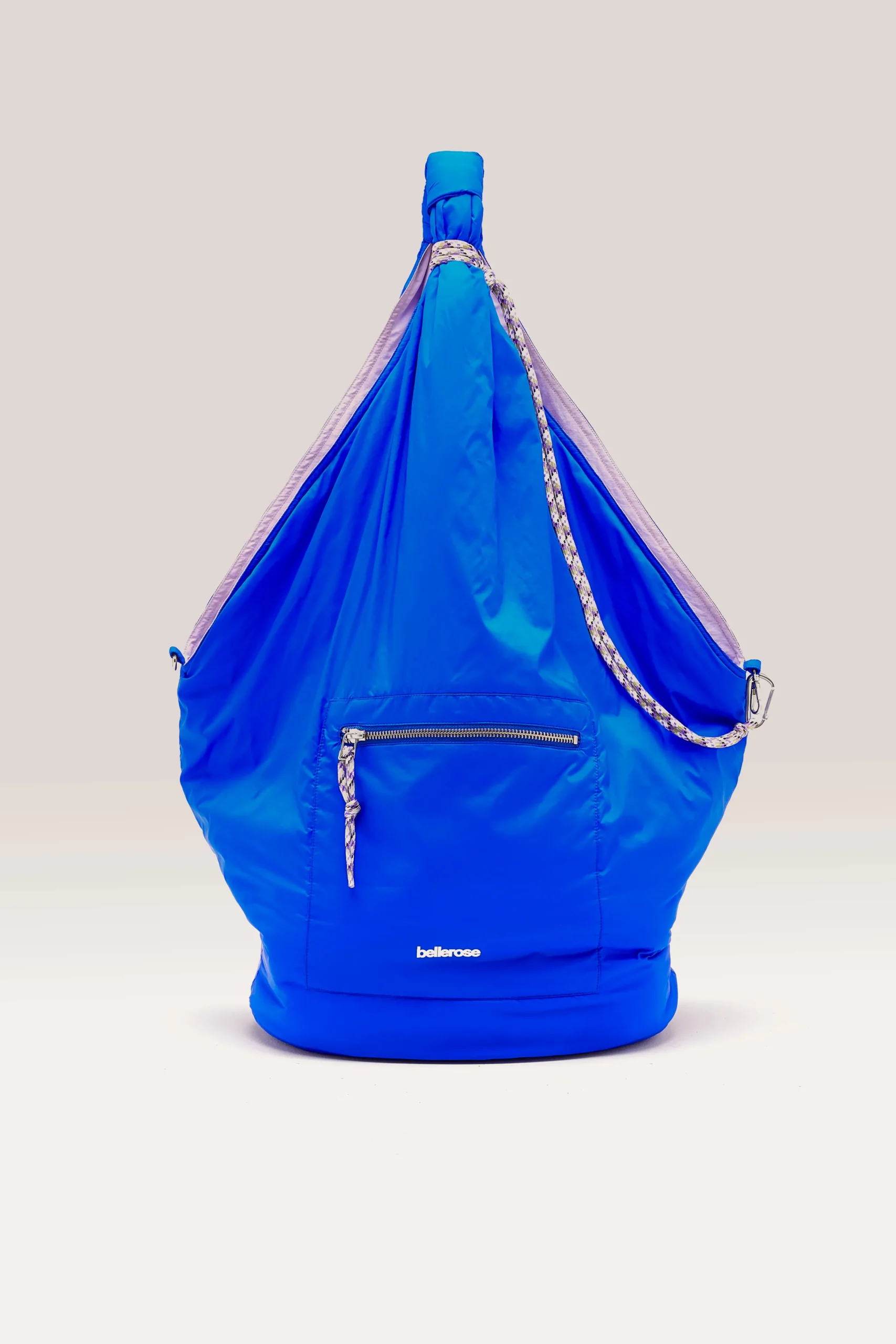 Ruimtelijke tas met gepatcht ritsvak en karabijnhaak, gemaakt van licht gevoerd nylon in lazuliblauw en afgewerkt met een verstevigd handvat.Vierkante vormVersterkt handvatHaaksluitingVoorzak met ritsAfmetingen: 73x28x38 cm