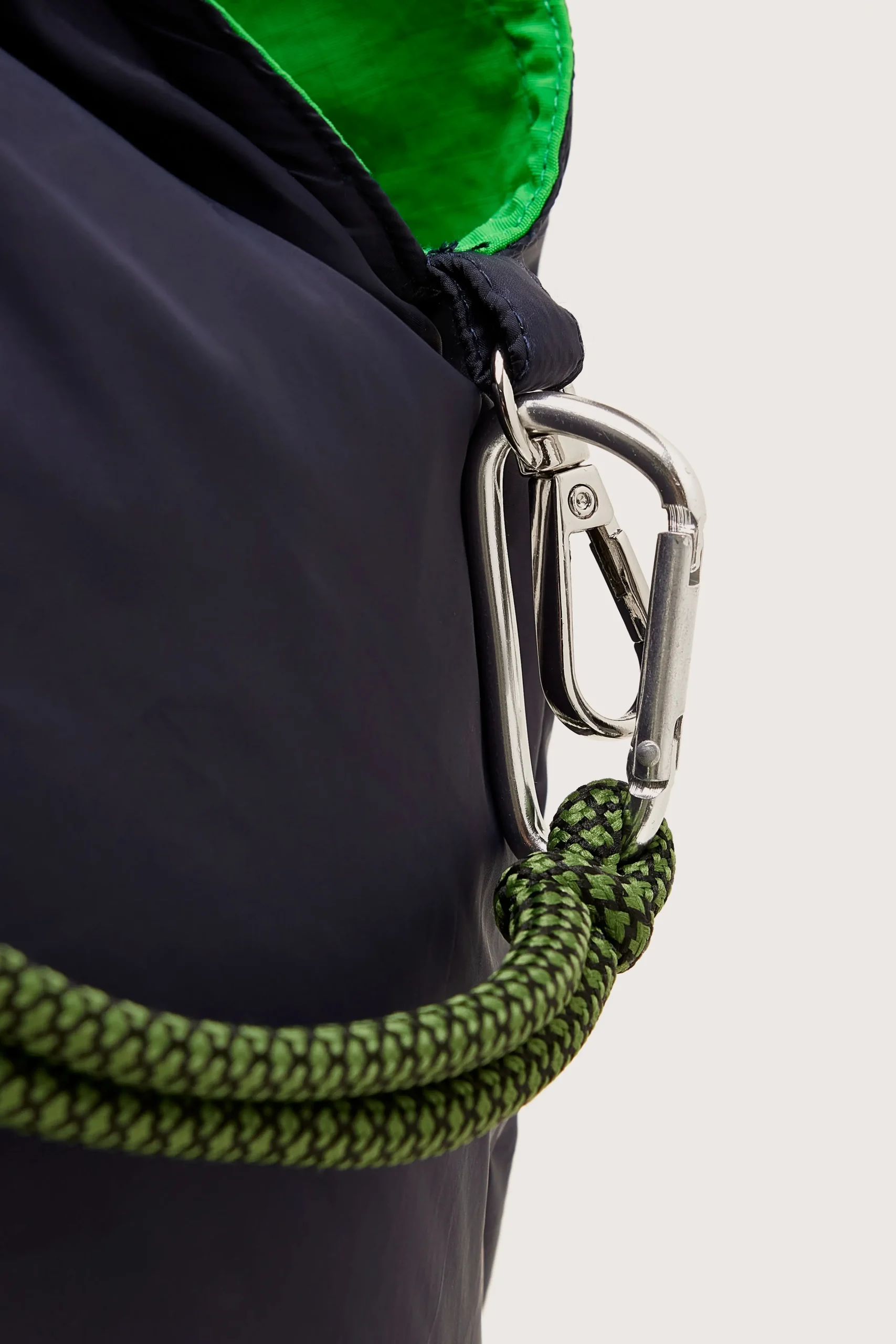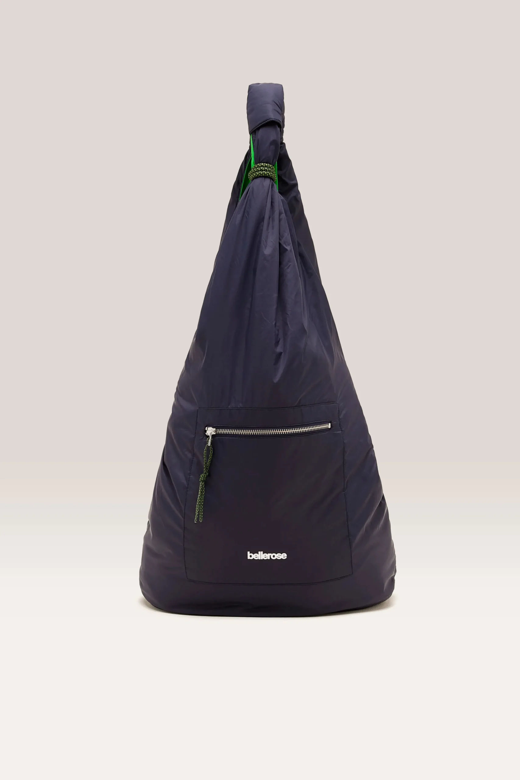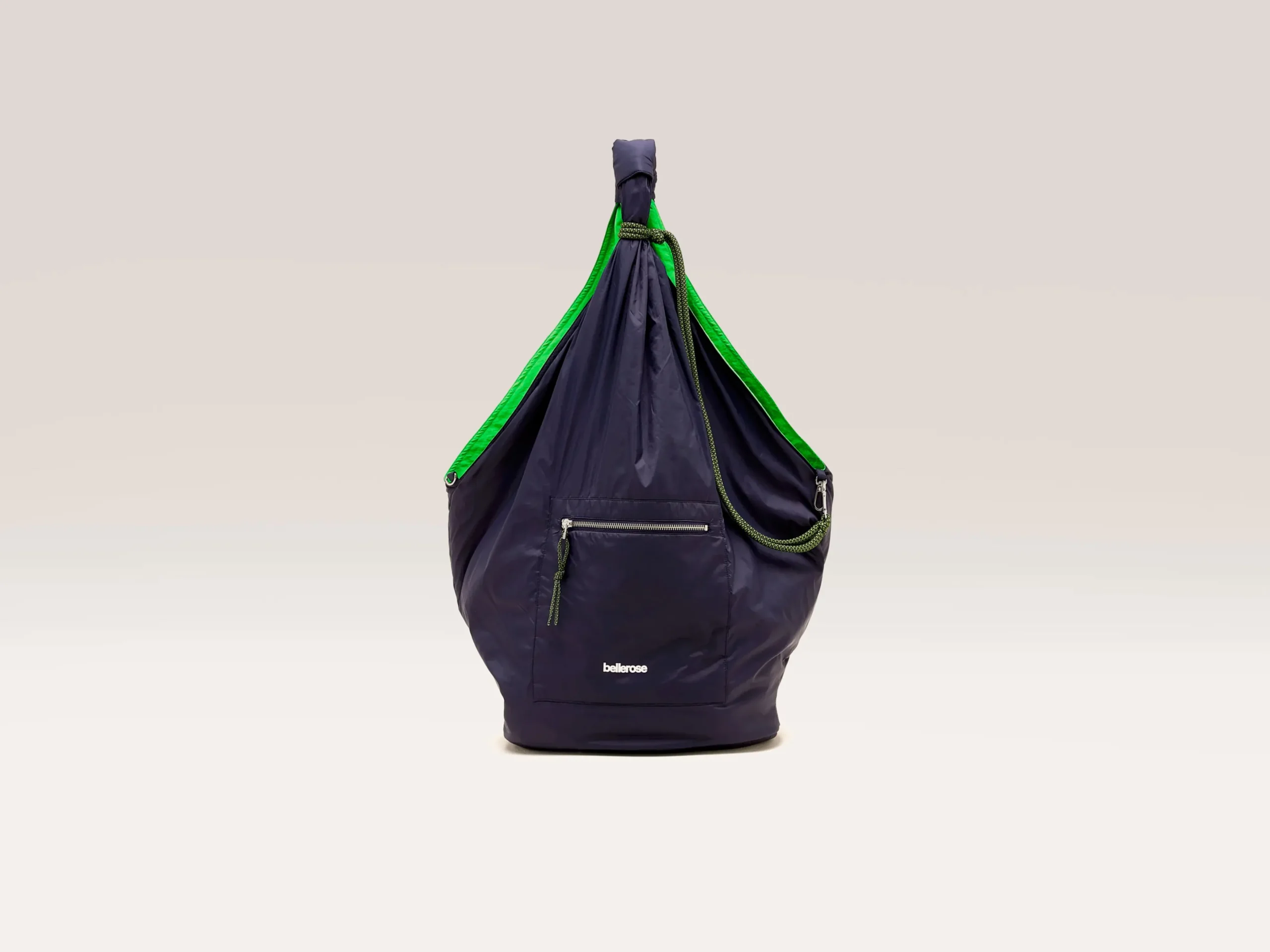 Ruimtelijke tas met gepatcht ritsvak en karabijnhaak, gemaakt van lichtgevoerd nylon in donkerblauw en afgewerkt met een…