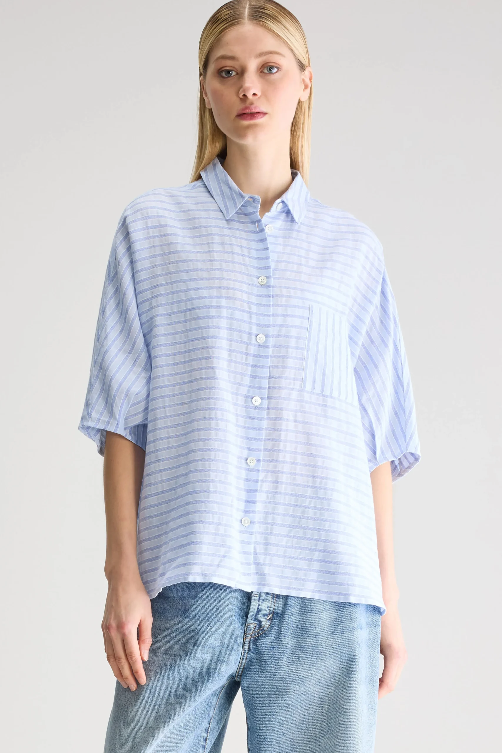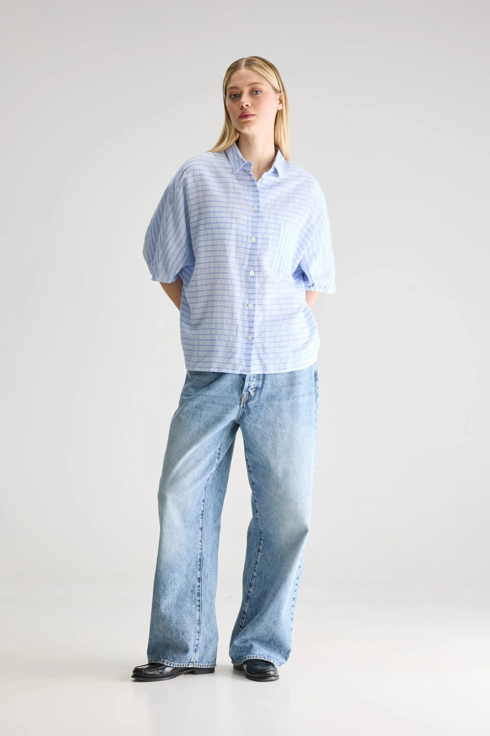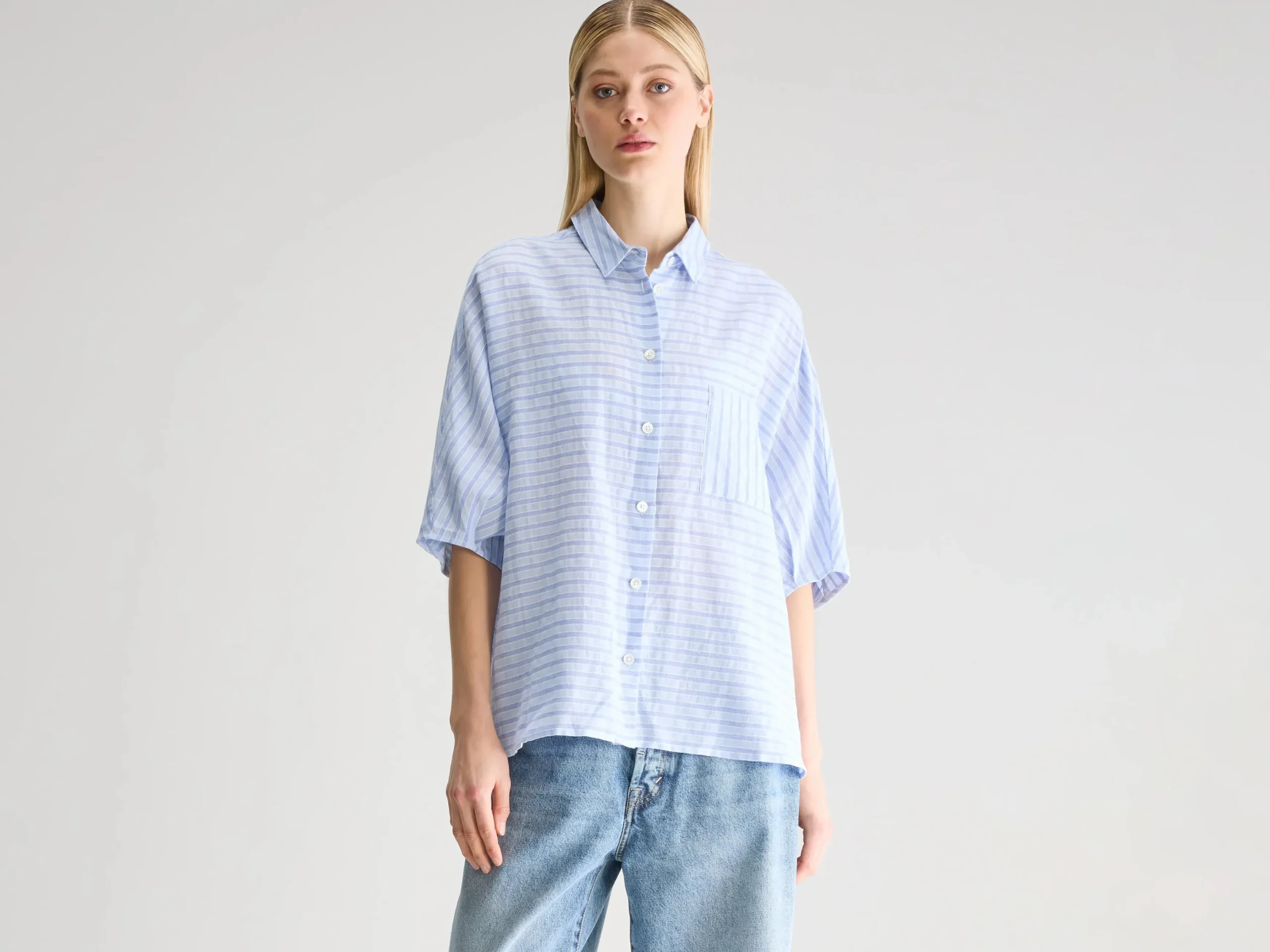 Oversized lichtblauw gestreepte blouse met borstzak, horizontale strepen en losse, comfortabele pasvorm.Oversized, boxy pasvorm : Kies