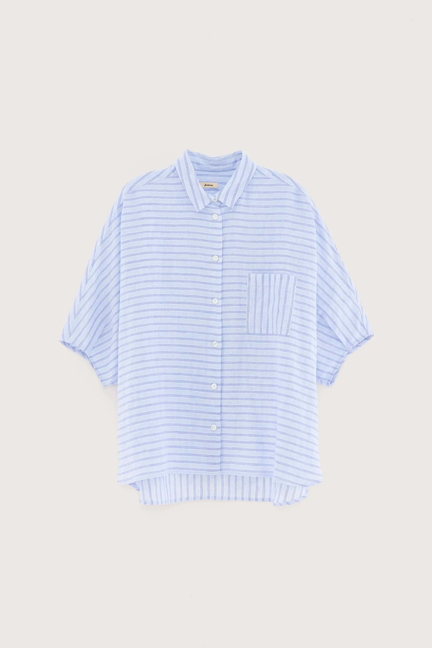 Oversized lichtblauw gestreepte blouse met borstzak, horizontale strepen en losse, comfortabele pasvorm.Oversized, boxy …