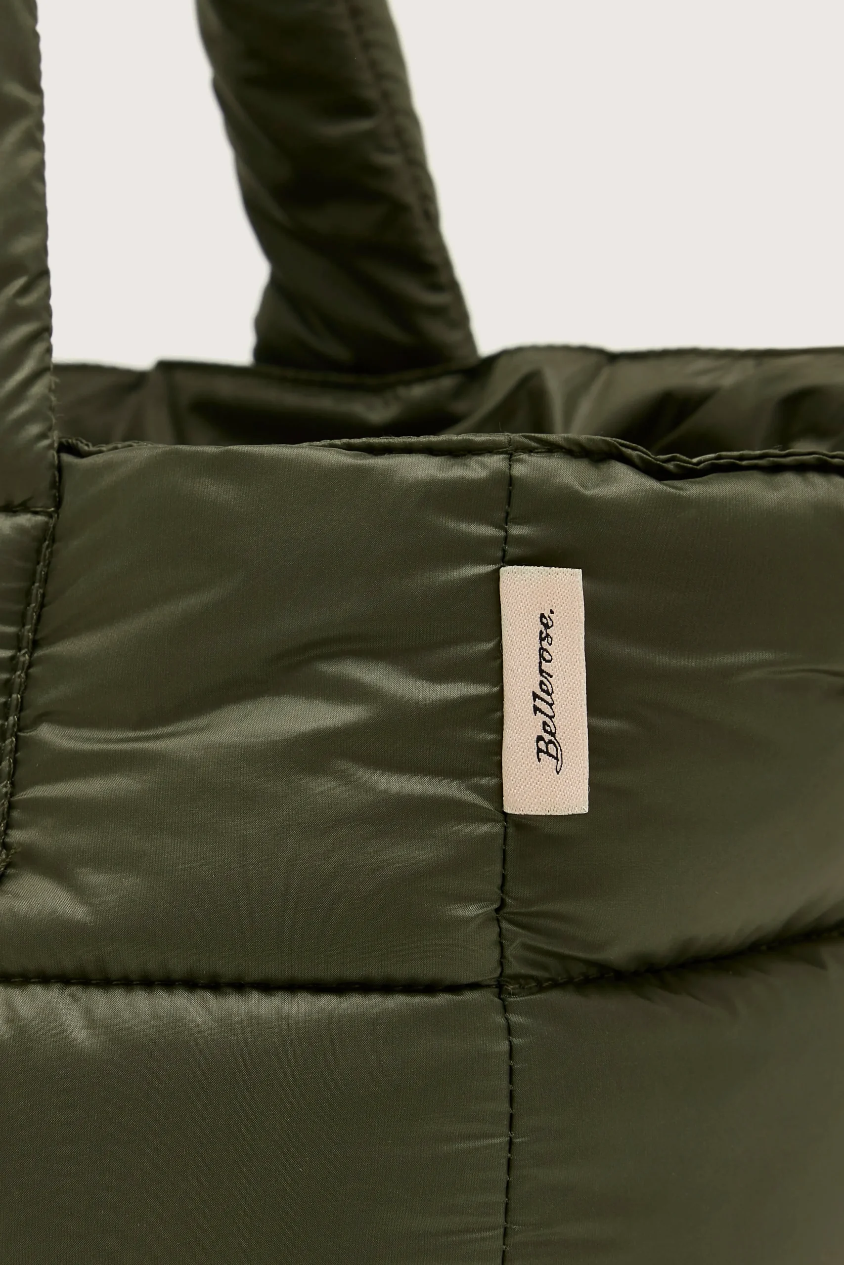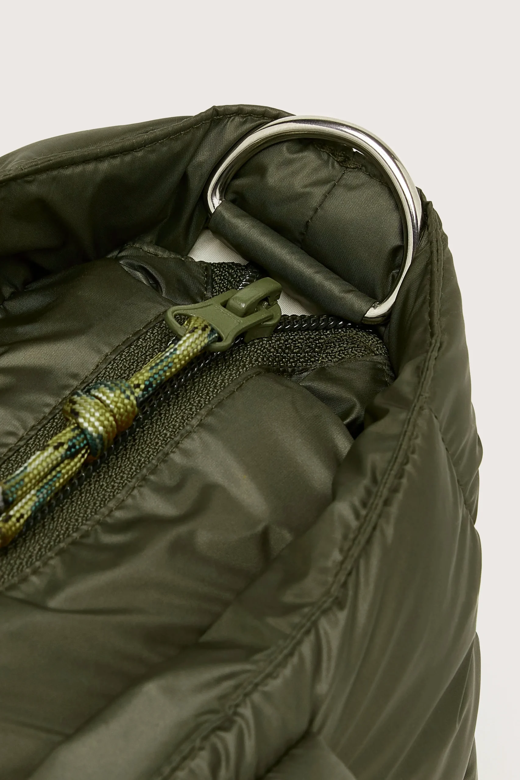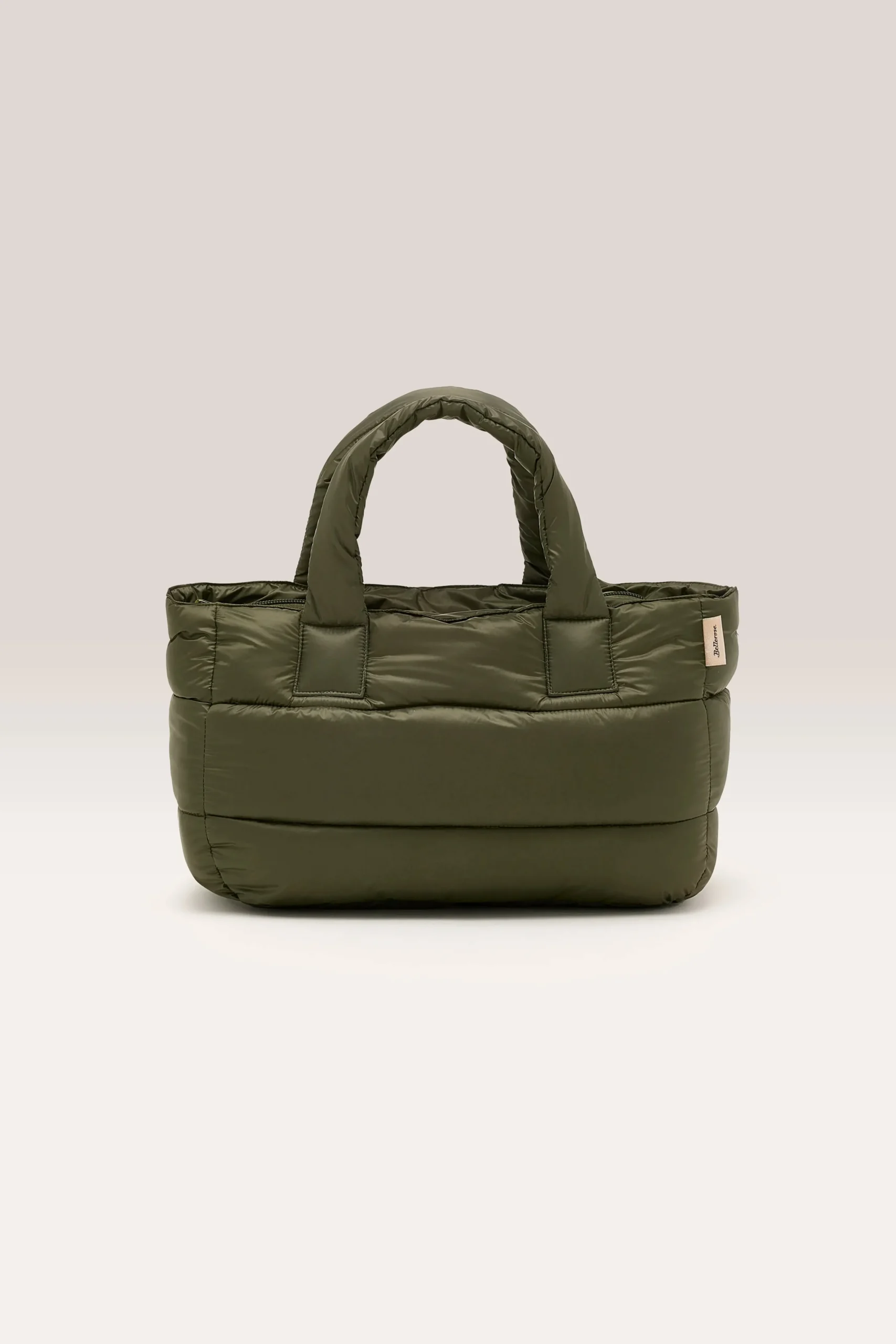 Gewatteerde handtas met ritssluiting en binnenvakken van neopreen mesh, gemaakt van groen nylon.Rechthoekig hoofdvakRits…