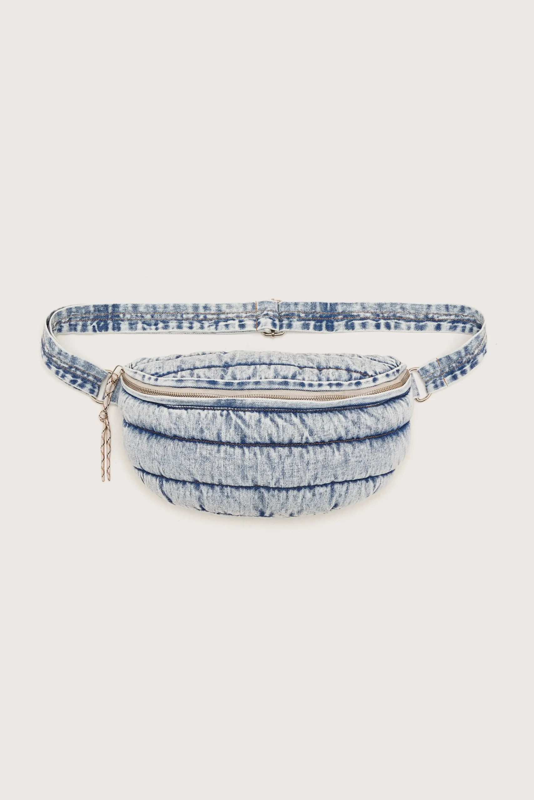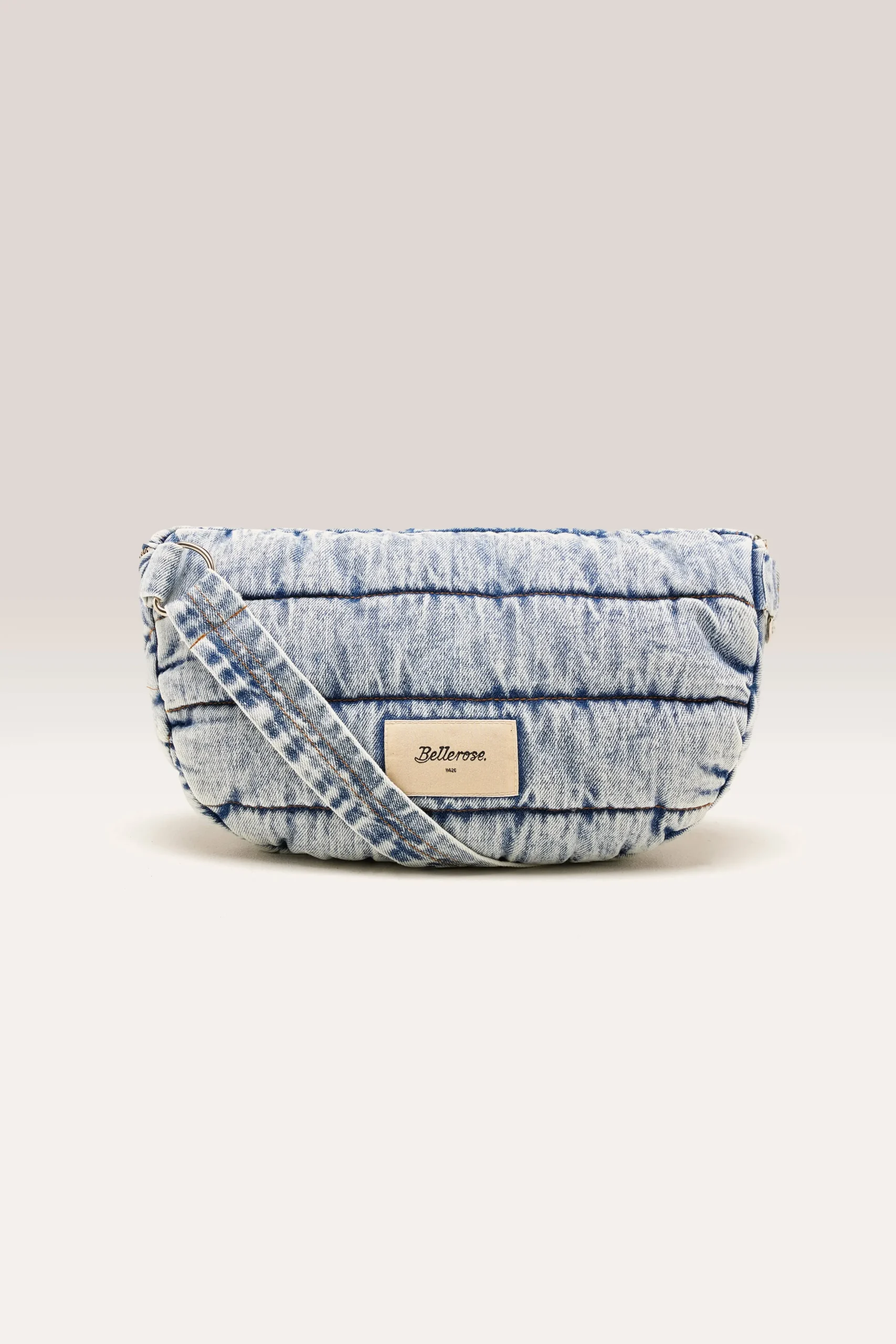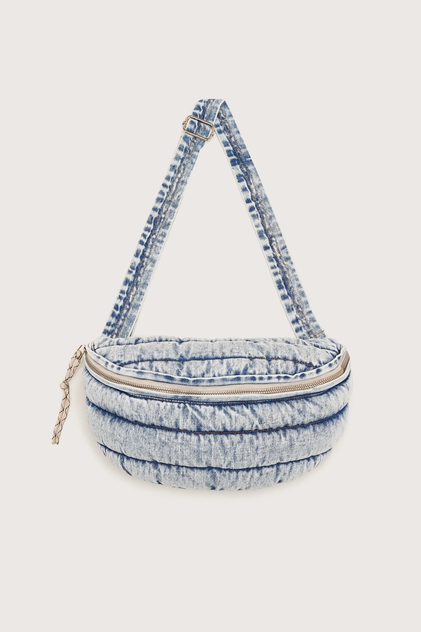 Gewatteerde tas met ritssluiting en natuurlijke riem, gemaakt van vintage gewassen denim.RitssluitingVerstelbare katoene…