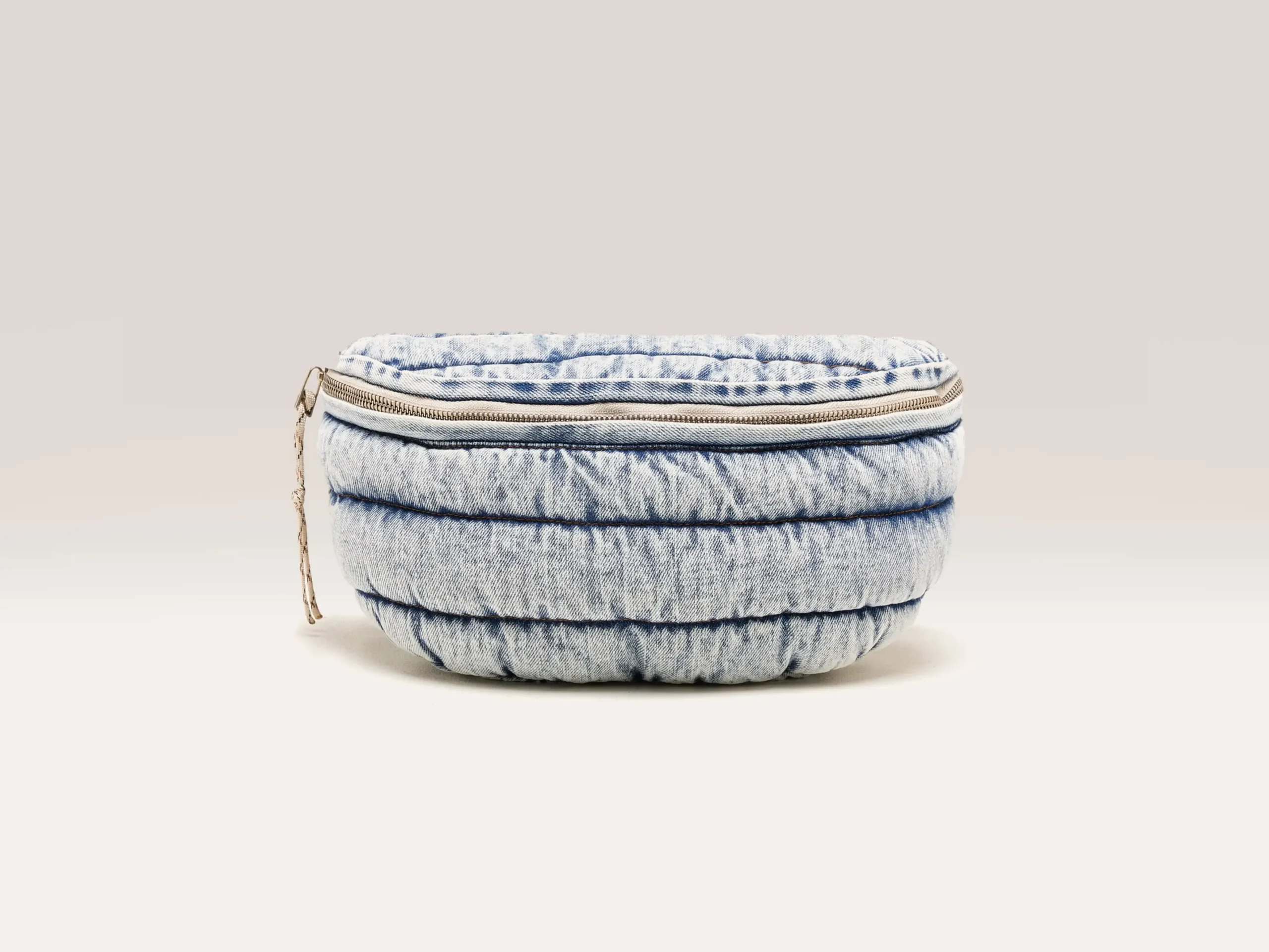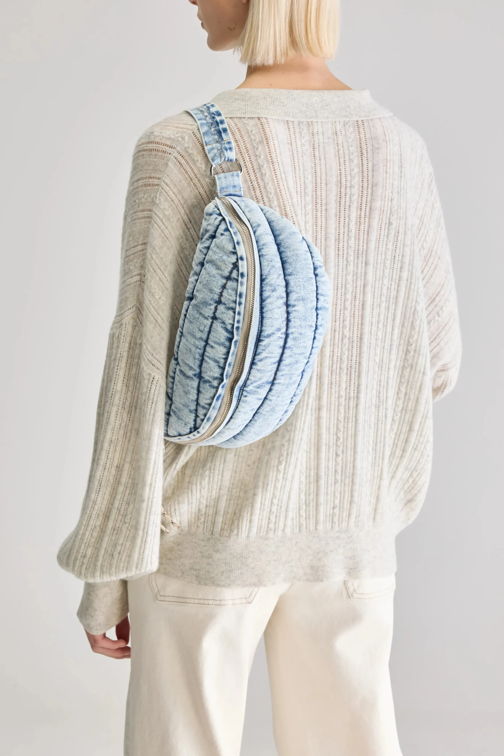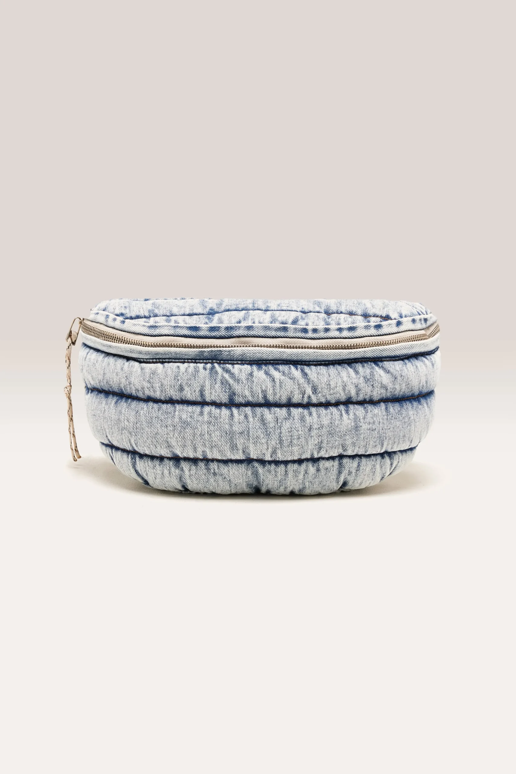 Gewatteerde tas met ritssluiting en natuurlijke riem, gemaakt van vintage gewassen denim.RitssluitingVerstelbare katoene…