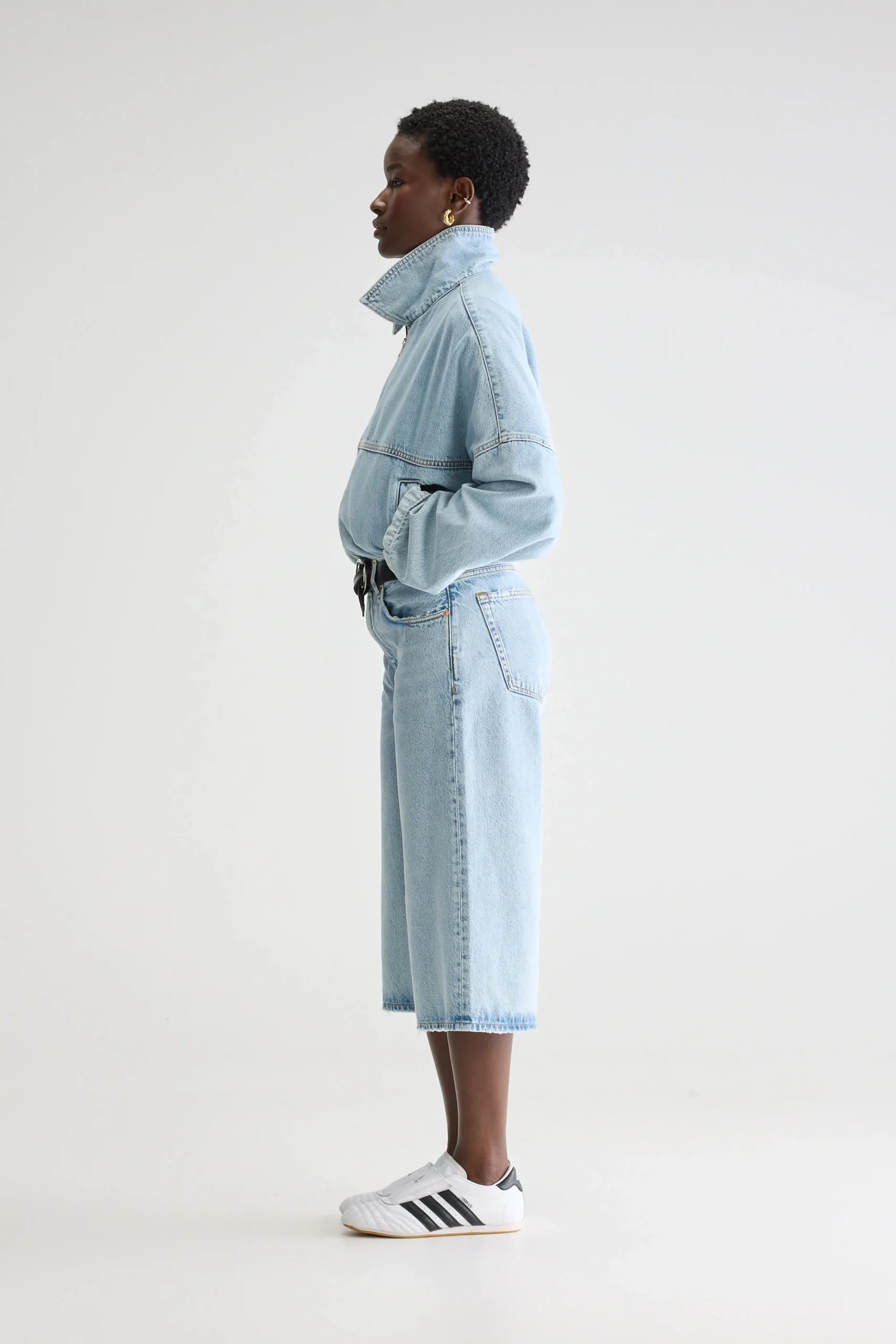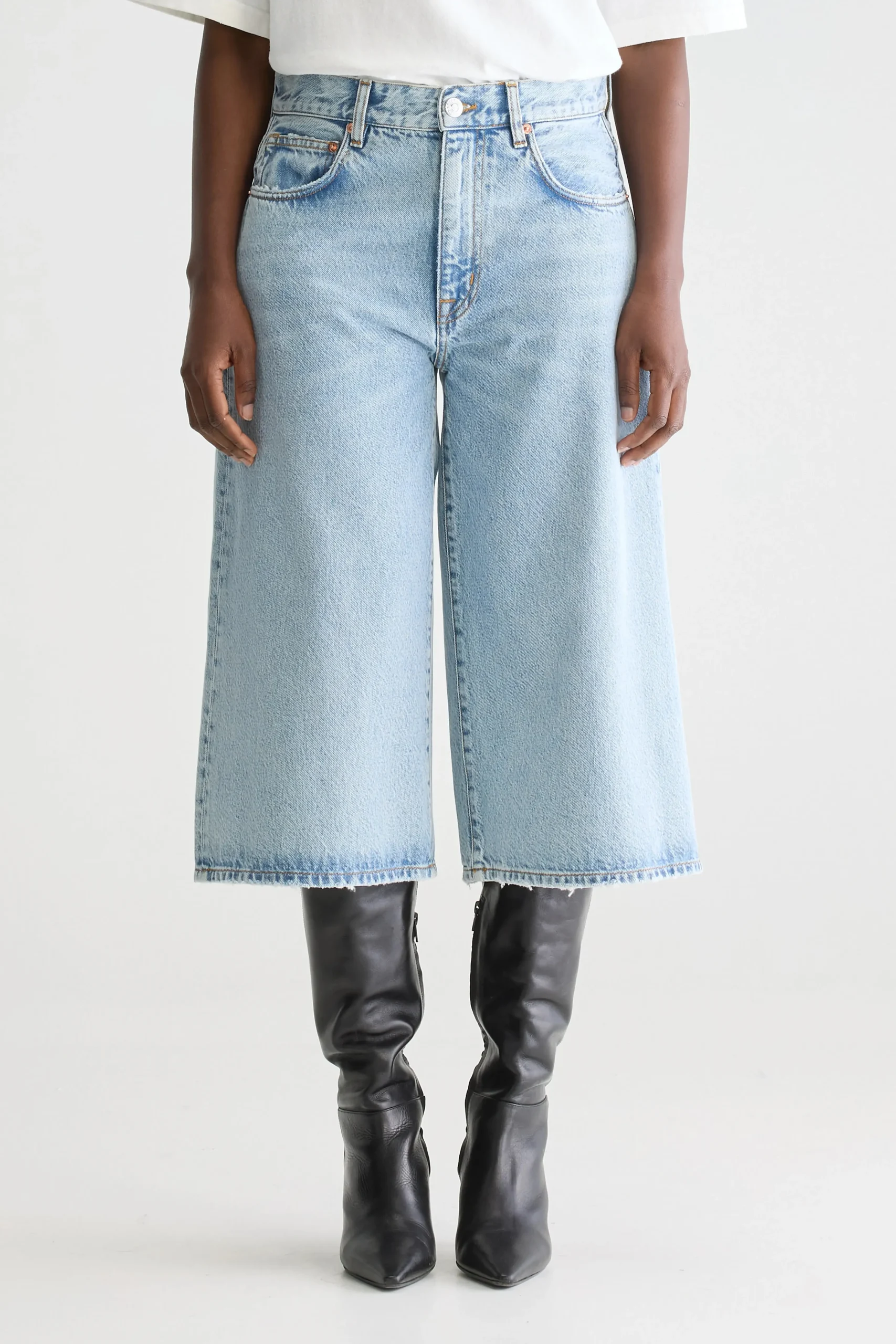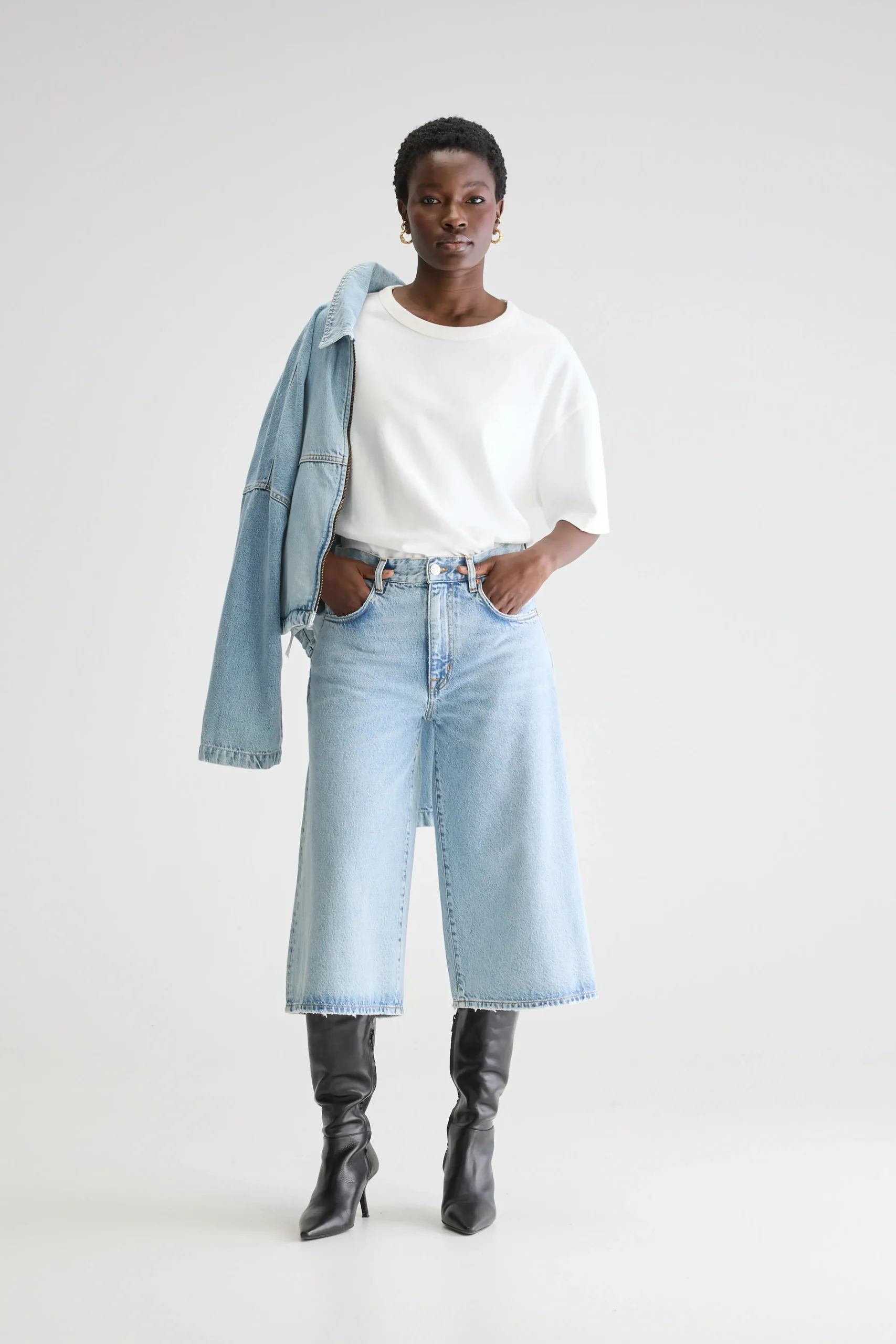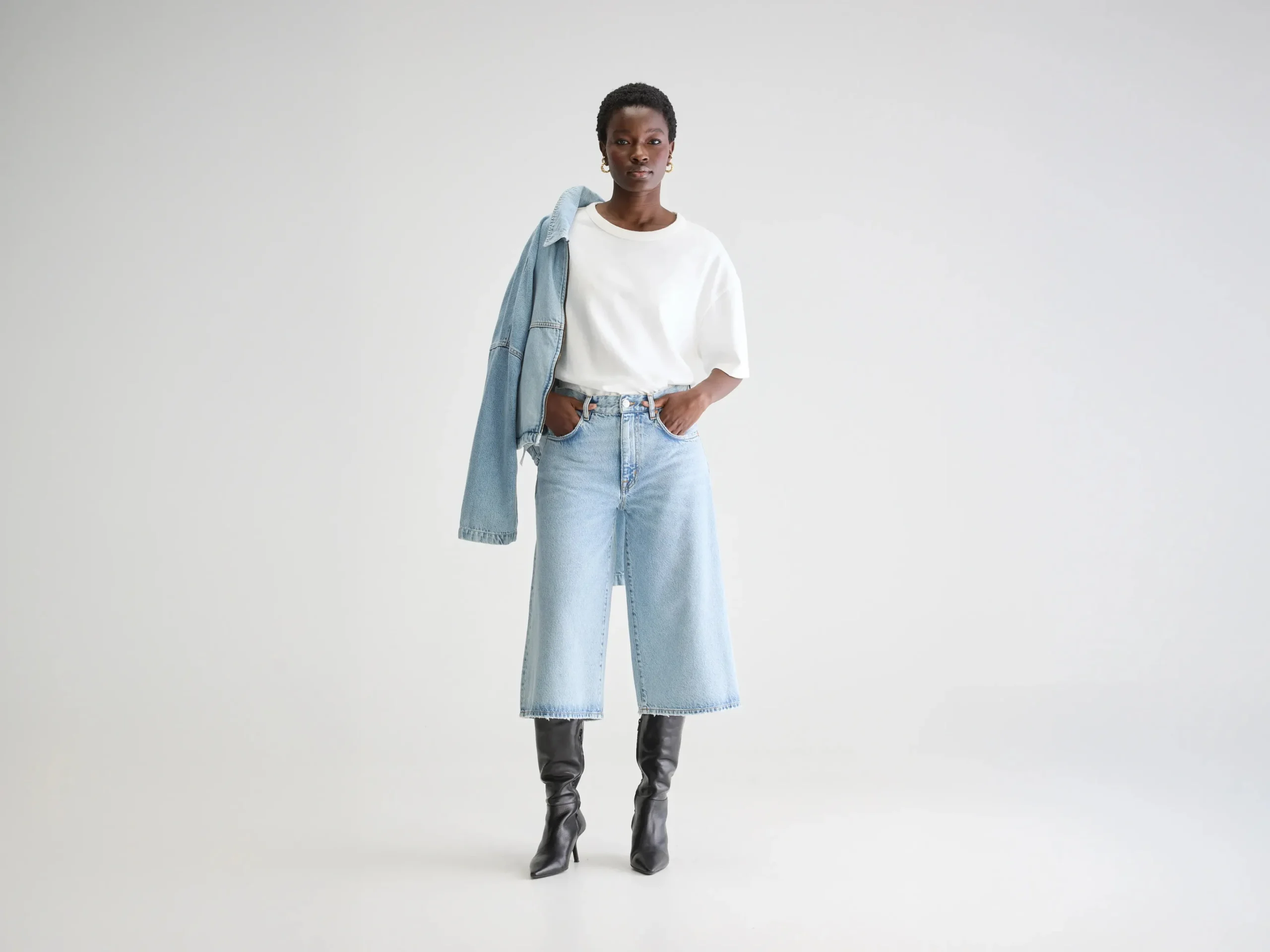 Baggy-fit jeans in culotte-stijl van blauwe denim met een versleten look, met wijde pijpen en licht verweerde details.Baggy pasvorm, culotte stijl Halfhoog, wijde pijpenZware denim, geen stretchLichtblauwe wassing met gedragen lookLicht verweerde detailsRitssluitingBinnenbeenlengte: 18″(gebaseerd op maat 26)De binnenbeenlengte past zich lichtjes aan afhankelijk van de gekozen maat, zodat de pasvorm proportioneel blijft.