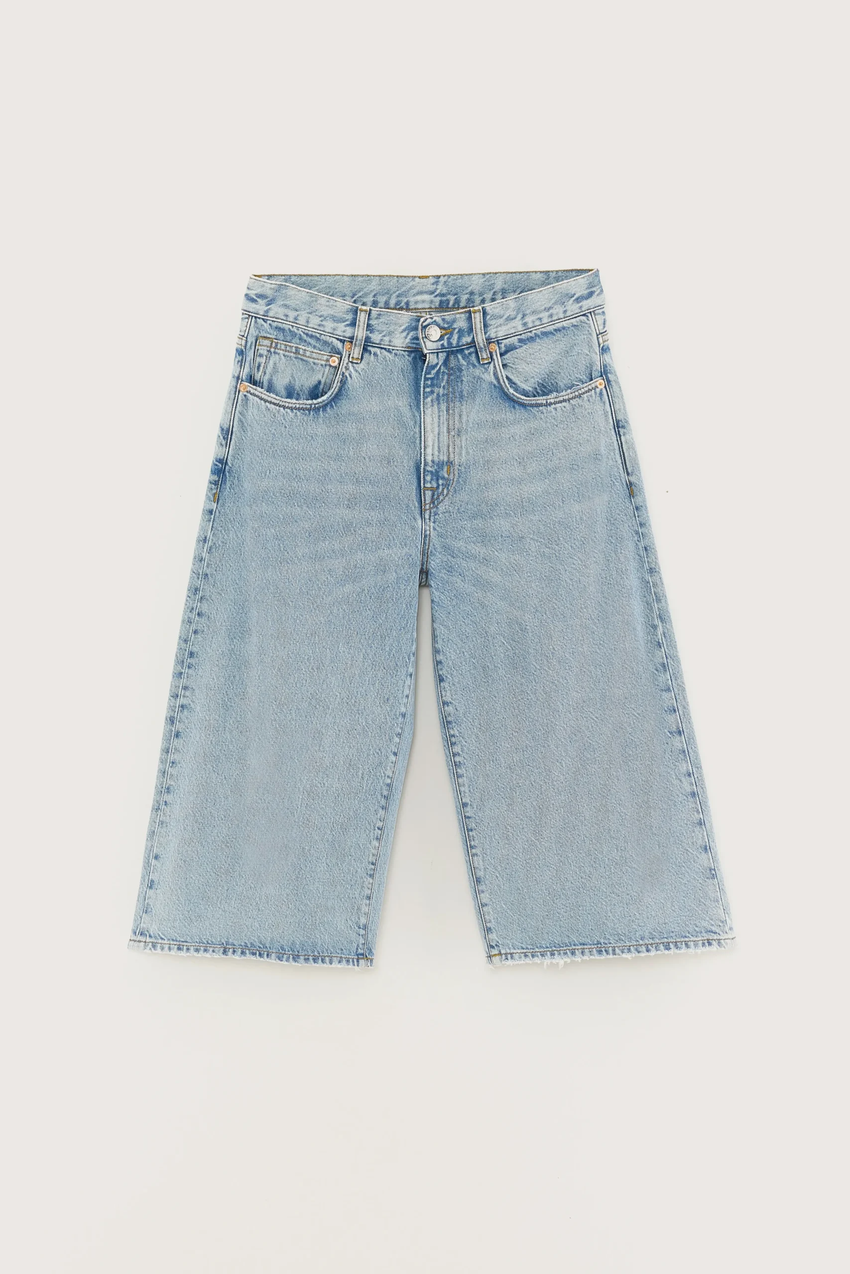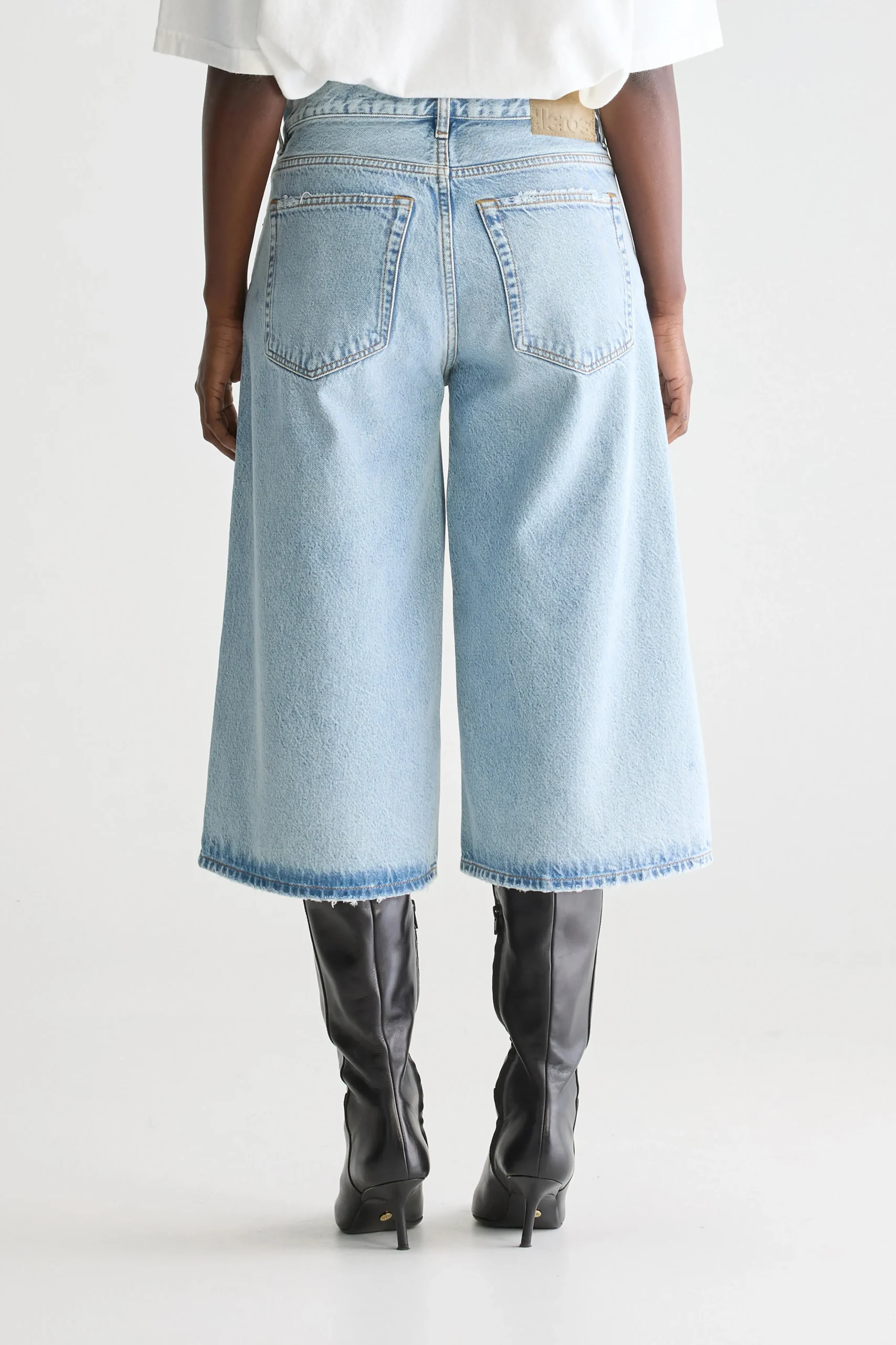 Baggy-fit jeans in culotte-stijl van blauwe denim met een versleten look, met wijde pijpen en licht verweerde details.Ba…