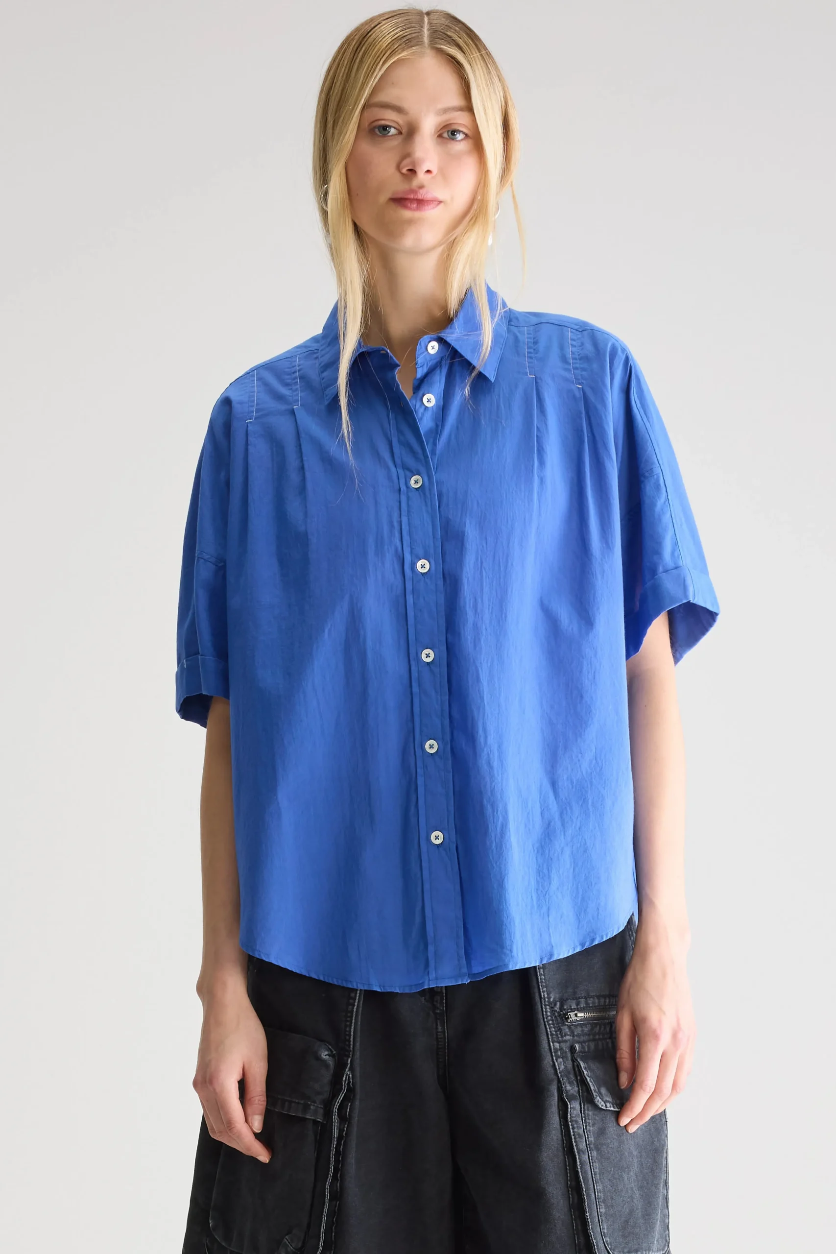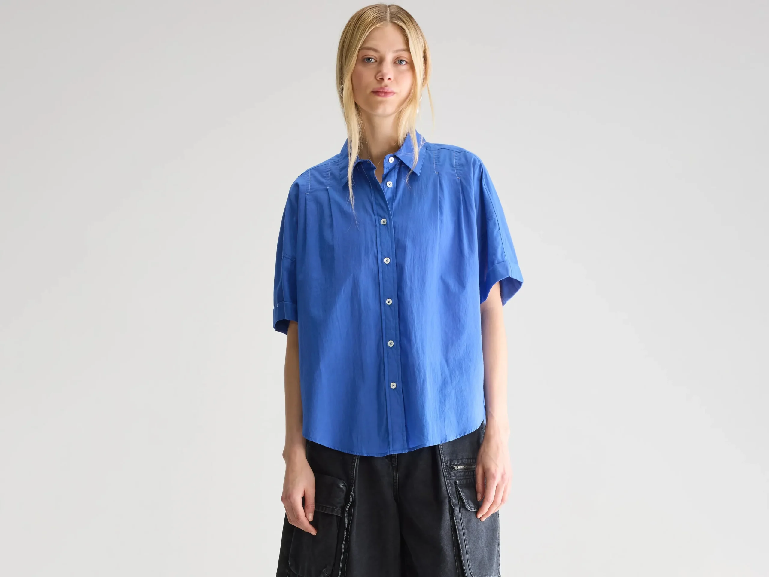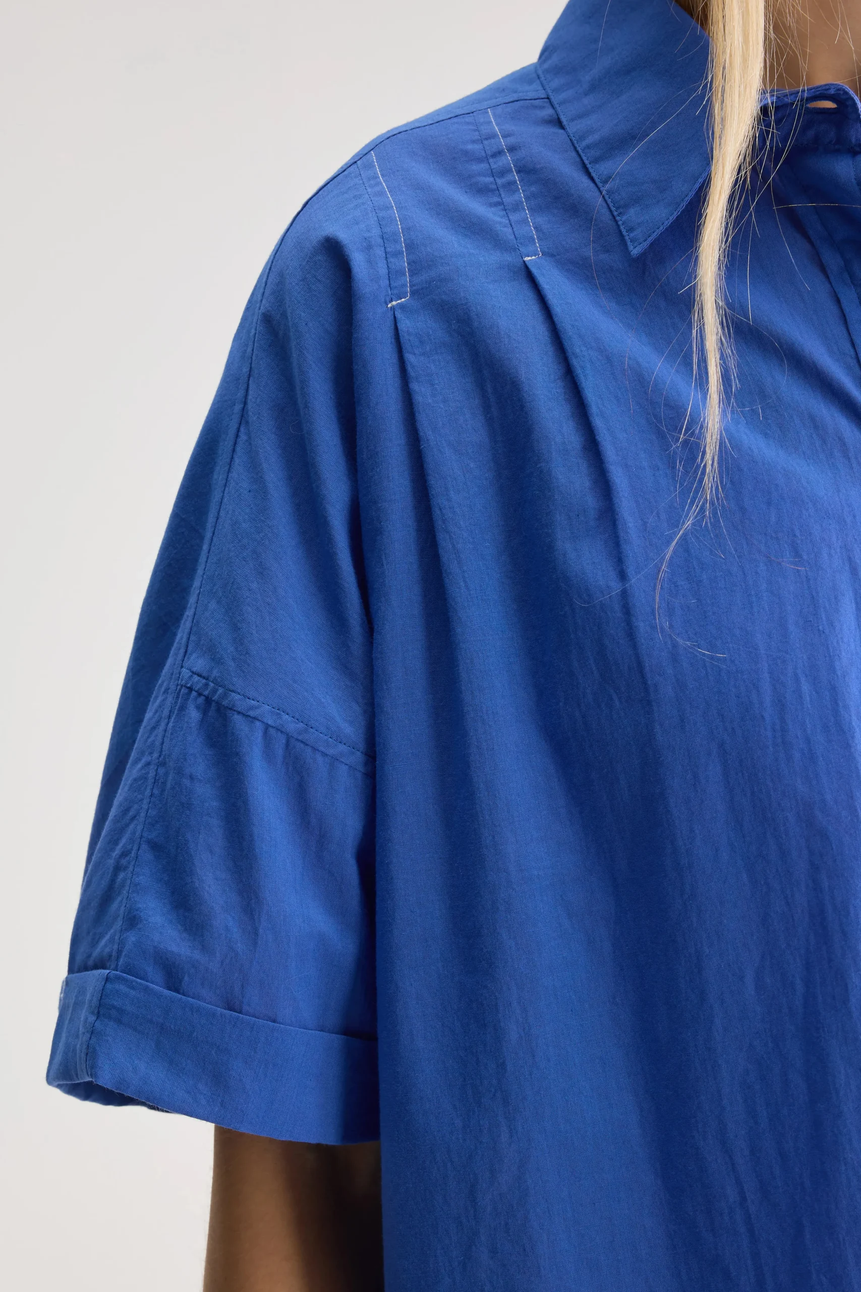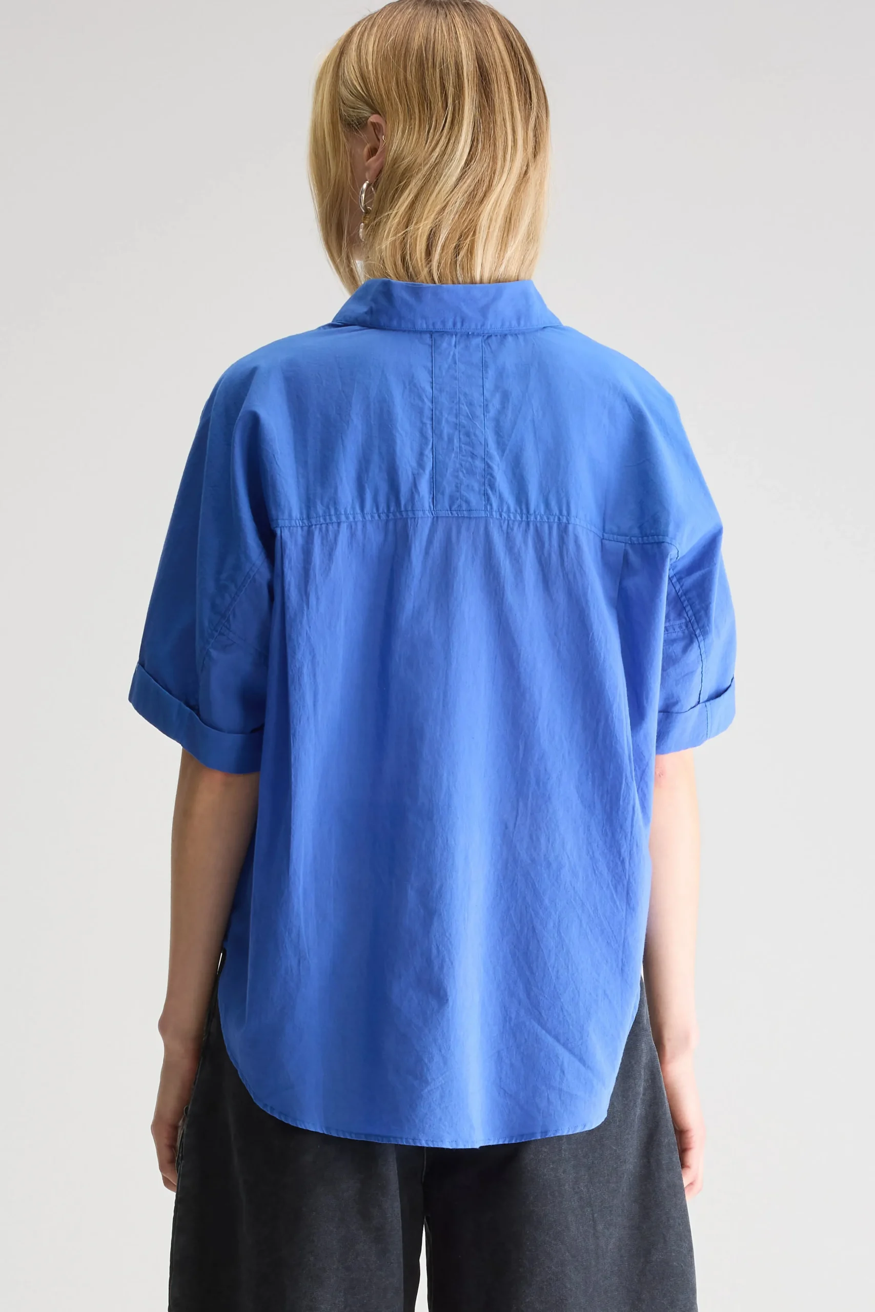 Oversized, irisblauw hemd met korte mouwen en klassieke kraag met minimale witte stikdetails op de schouders.Oversized pasvorm : Kies