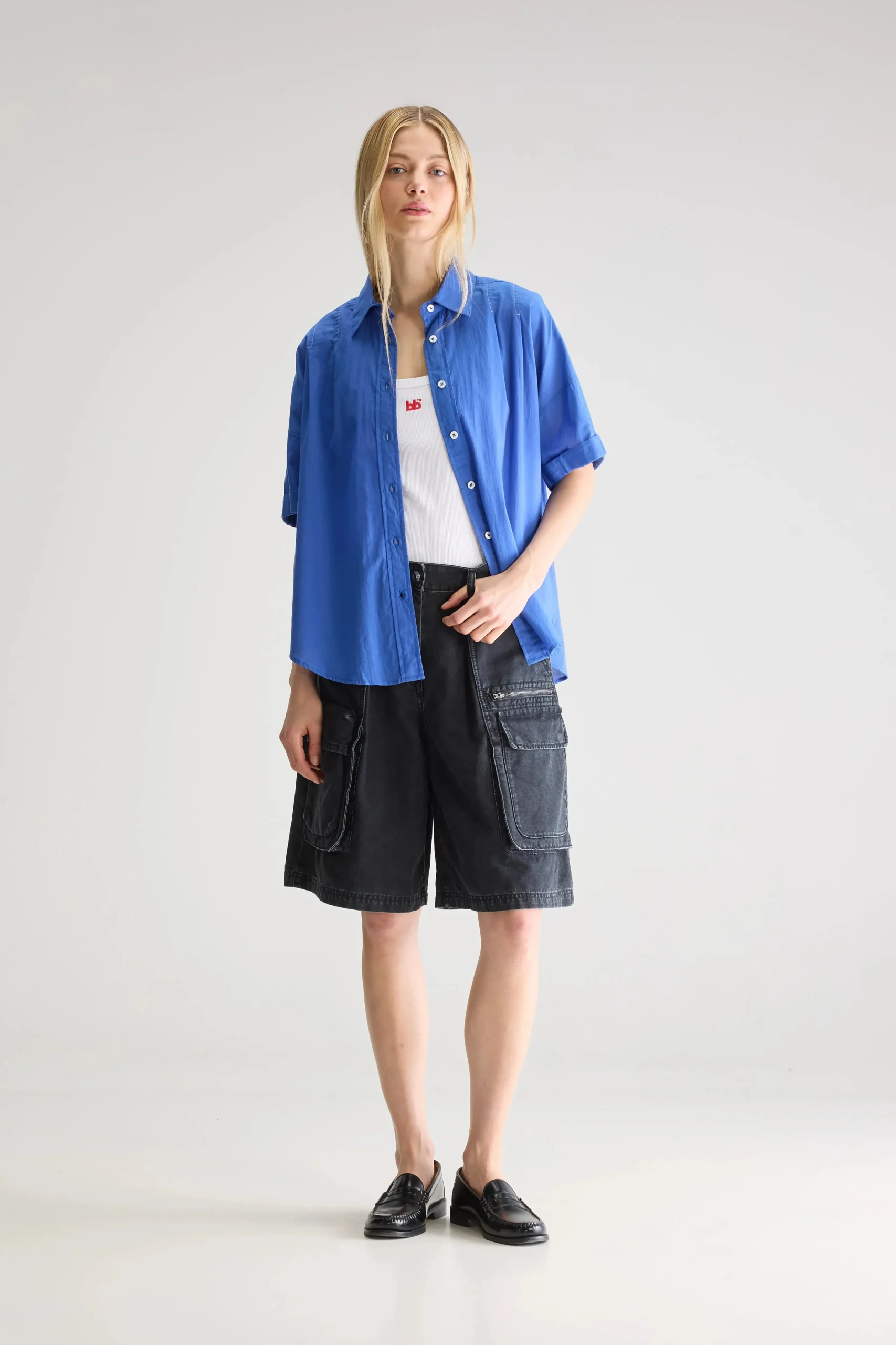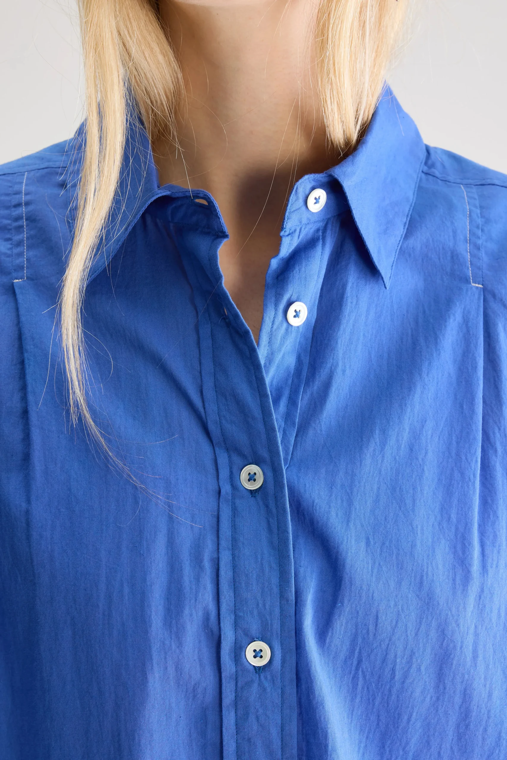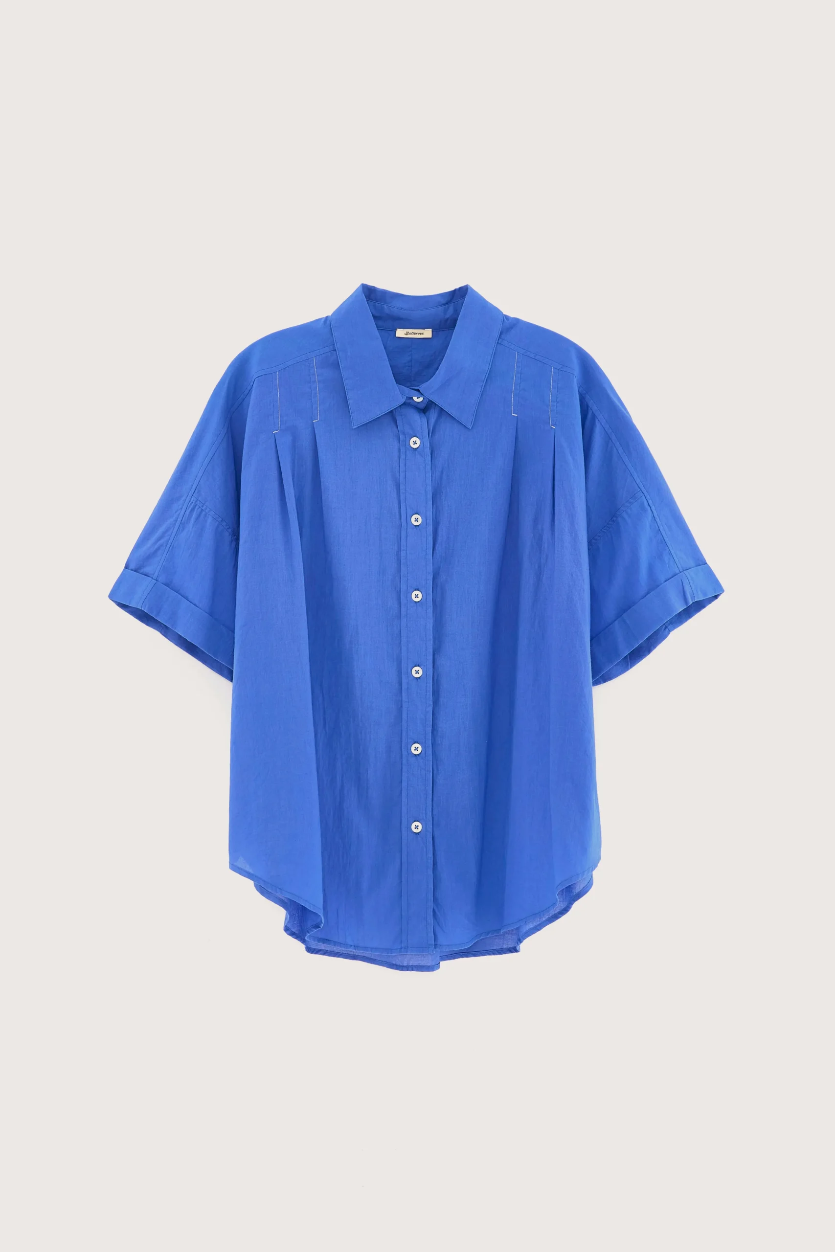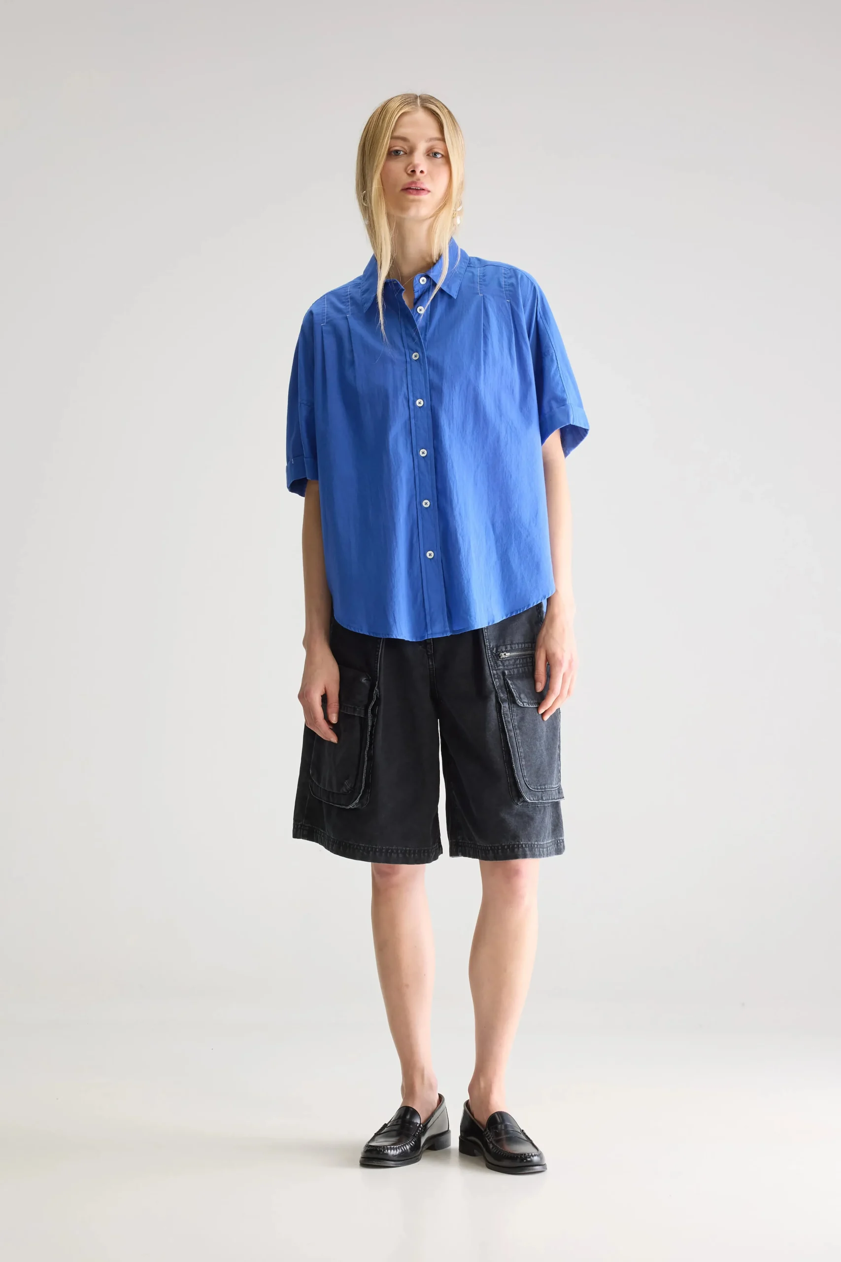 Oversized, irisblauw hemd met korte mouwen en klassieke kraag met minimale witte stikdetails op de schouders.Oversized pasvorm : Kies