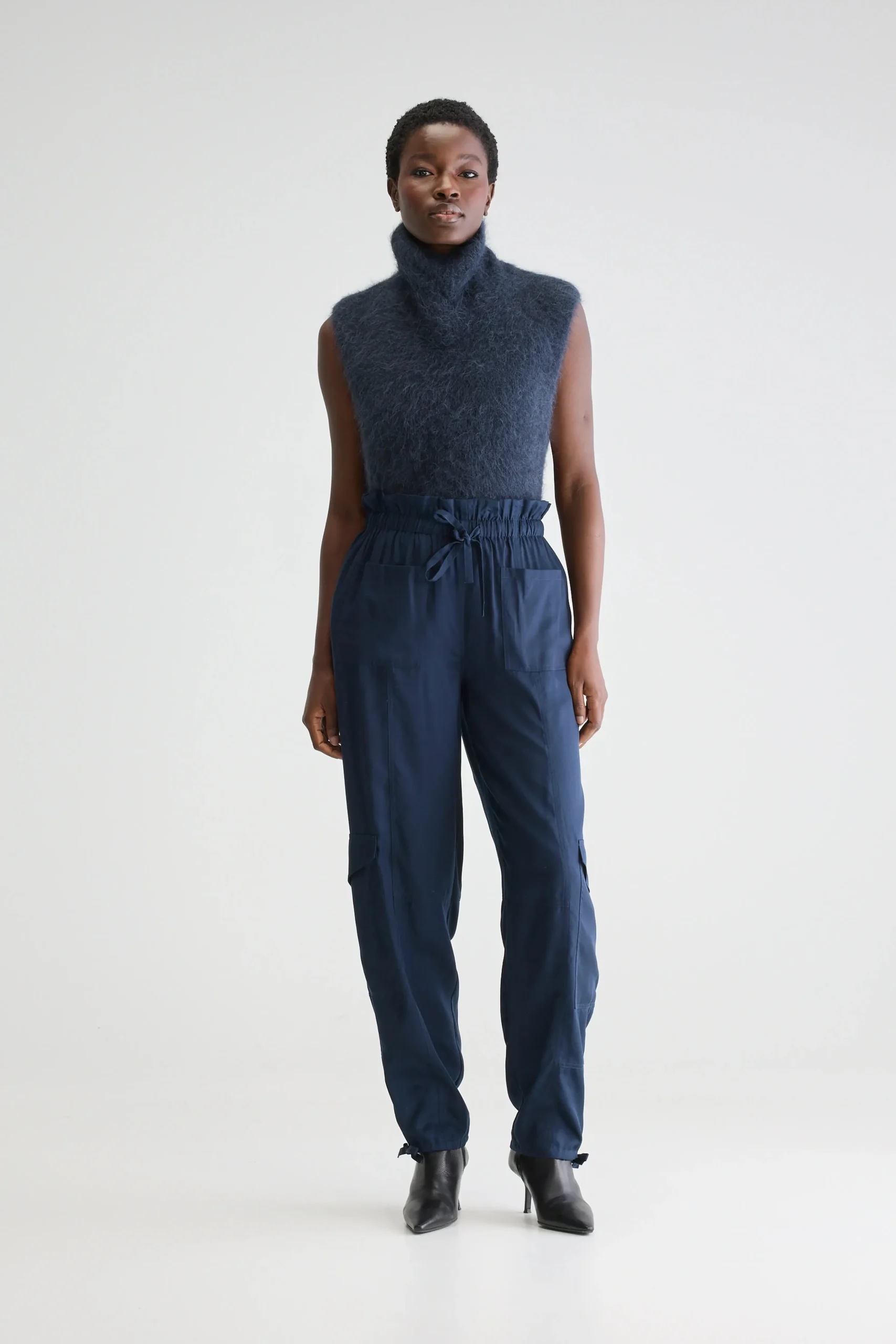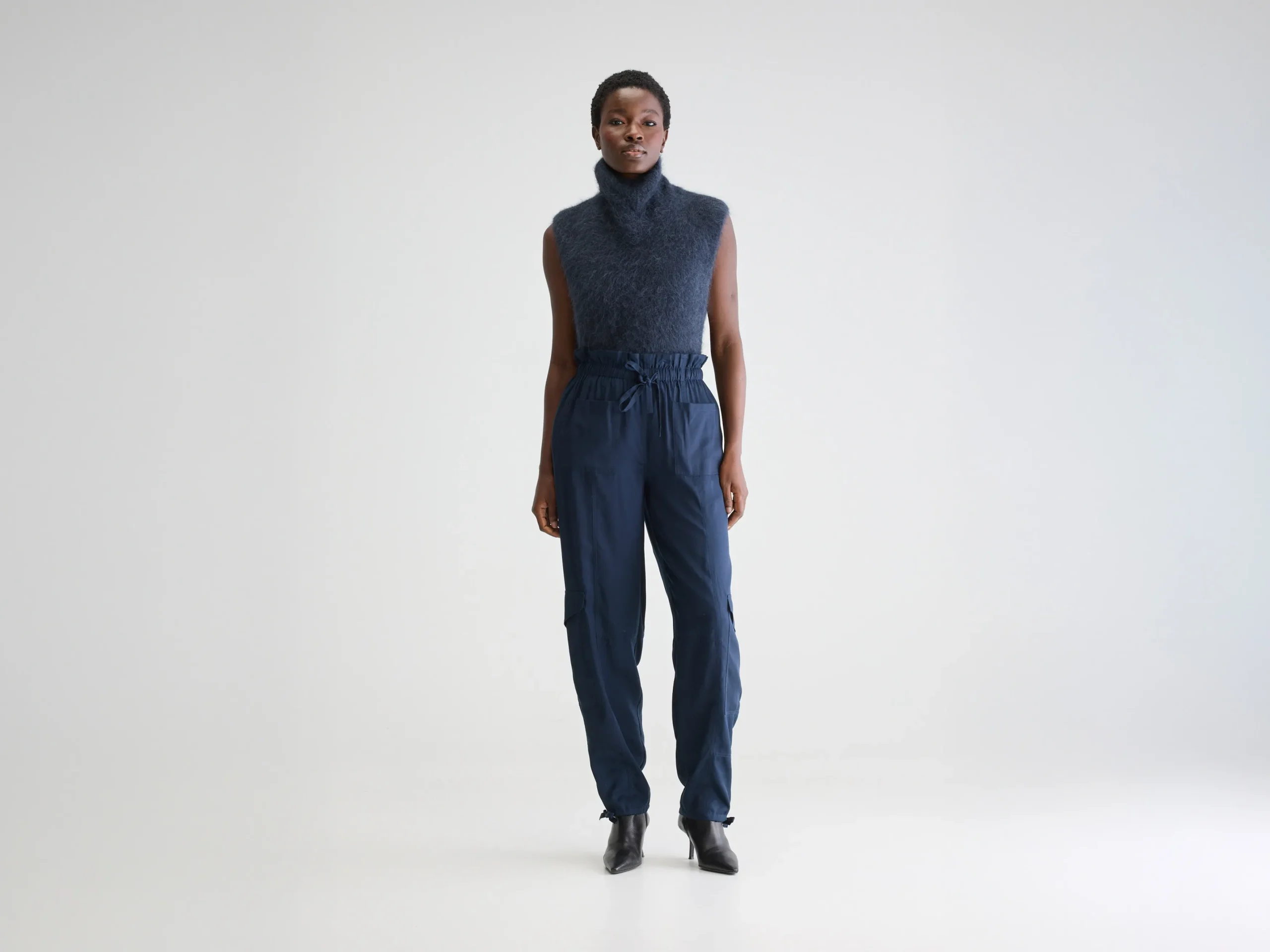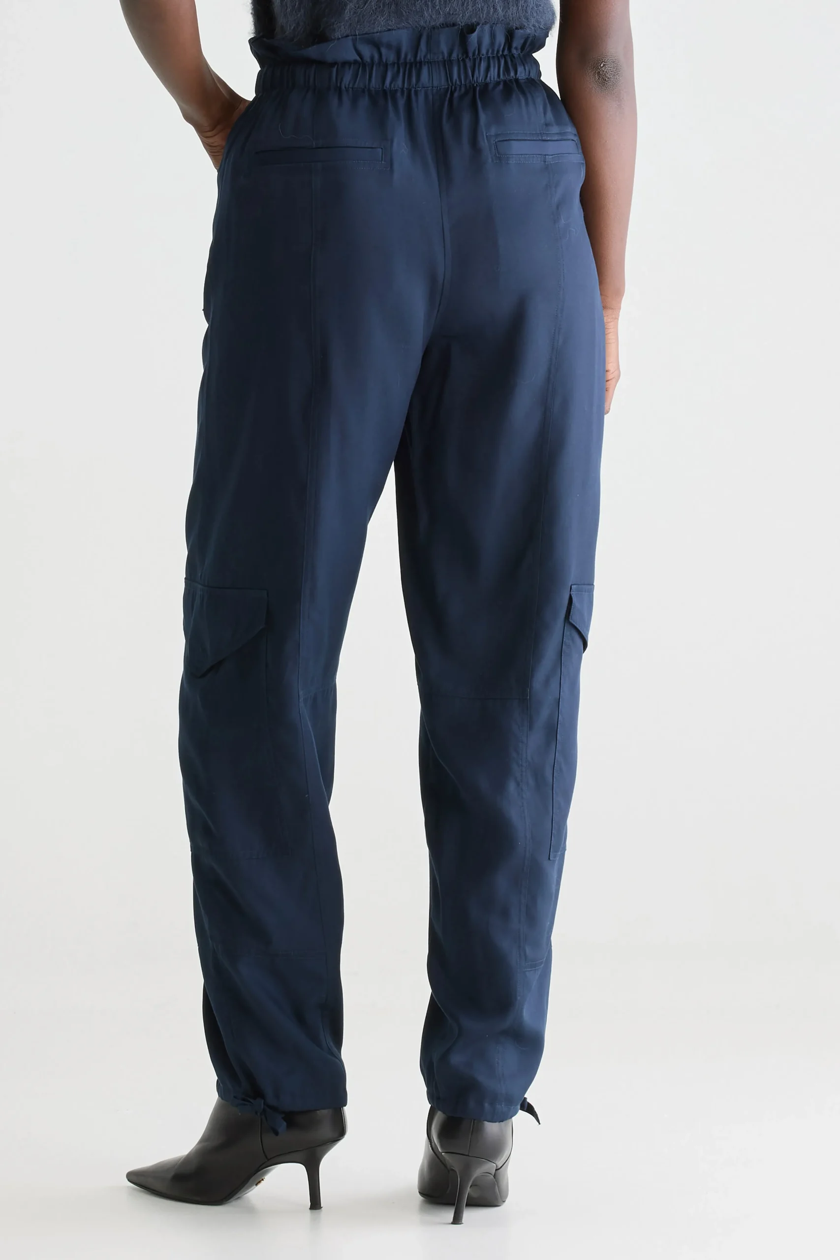 Cargobroek met rechte pijpen, hoge taille met rijgkoord, en extra zakken op de pijpen, gemaakt van soepele donkerblauwe Lyocell stof.Regular pasvorm, cargo-stijlHoge taille met rijgkoord, rechte pijpenSoepele Lyocell-stof, geen stretchOpgezette zak en extra zakken op de benenVerstelbare zomen met bijpassende trekkoordenBinnenbeenlengte: 29″(gebaseerd op maat 36)De binnenbeenlengte past zich lichtjes aan afhankelijk van de gekozen maat, zodat de pasvorm proportioneel blijft.