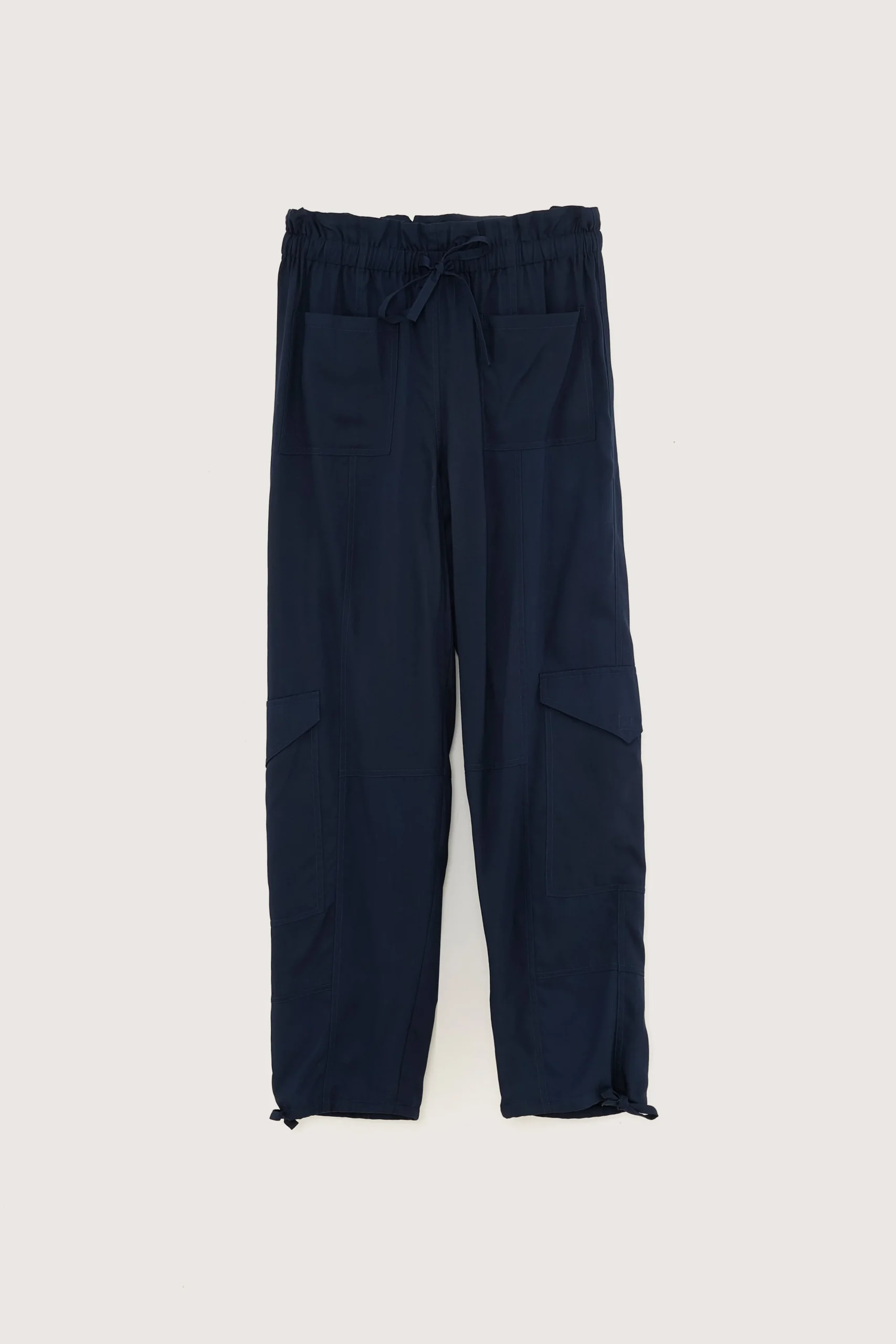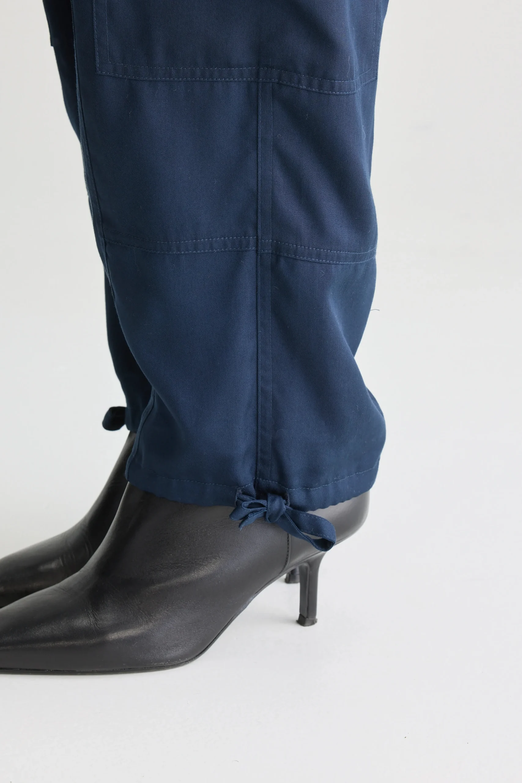Cargobroek met rechte pijpen, hoge taille met rijgkoord, en extra zakken op de pijpen, gemaakt van soepele donkerblauwe …