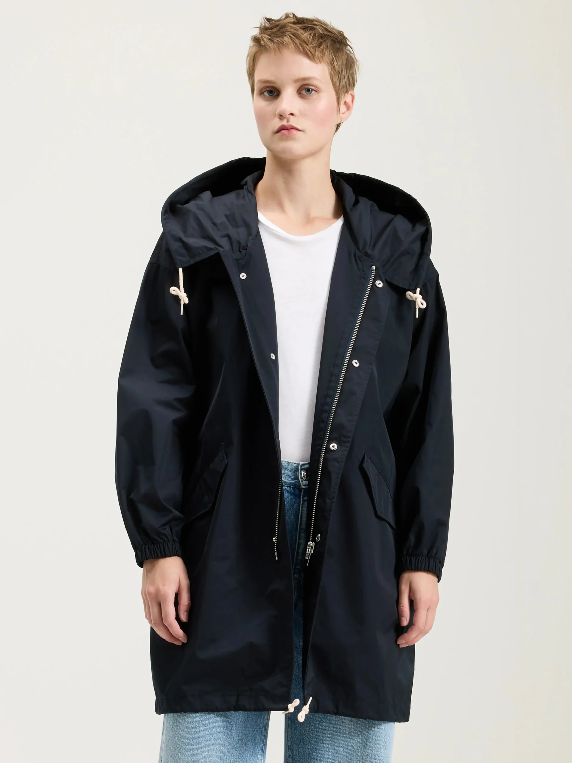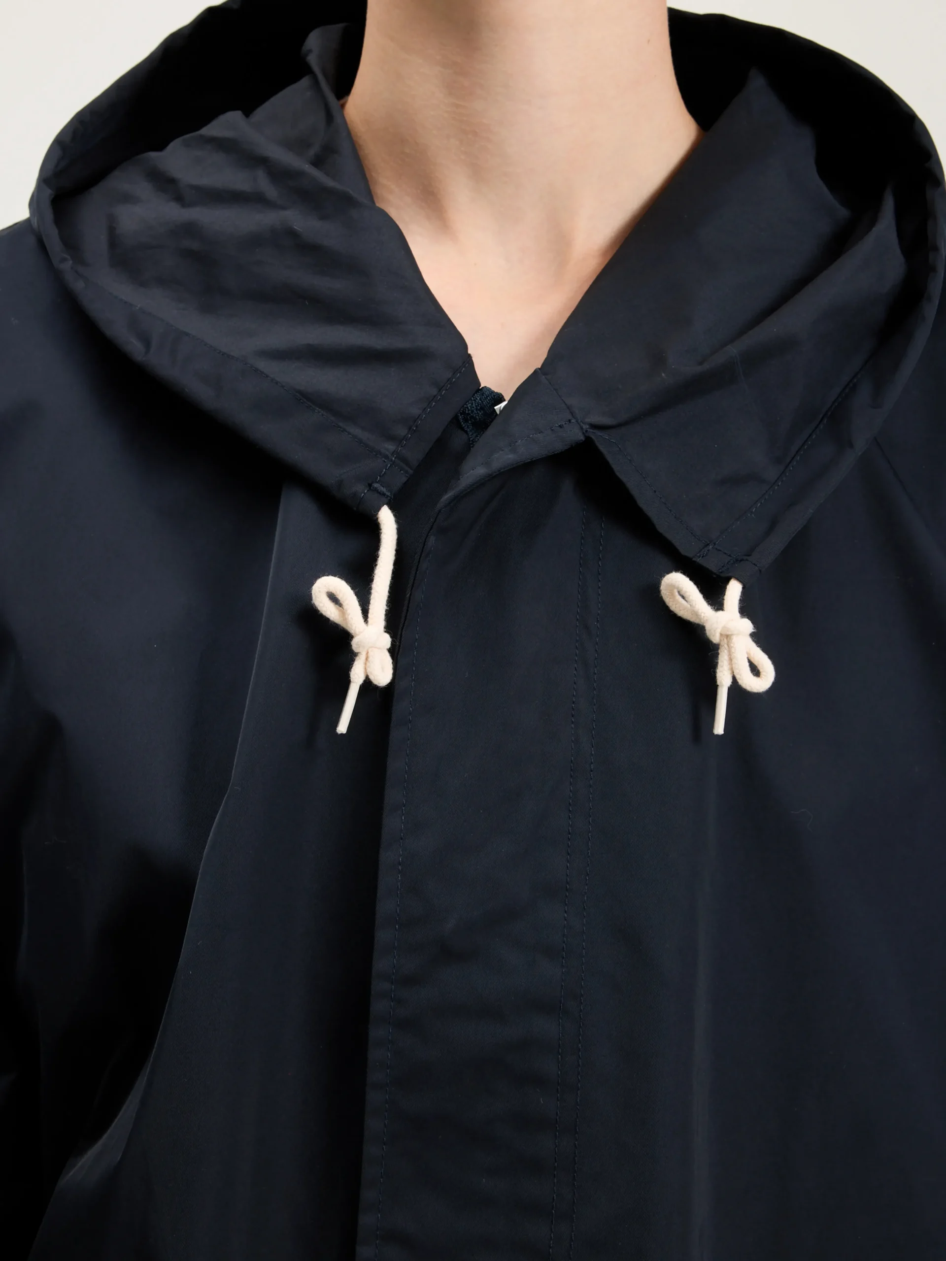 Contrasterende trekkoorden aan de zoom en capuchonr