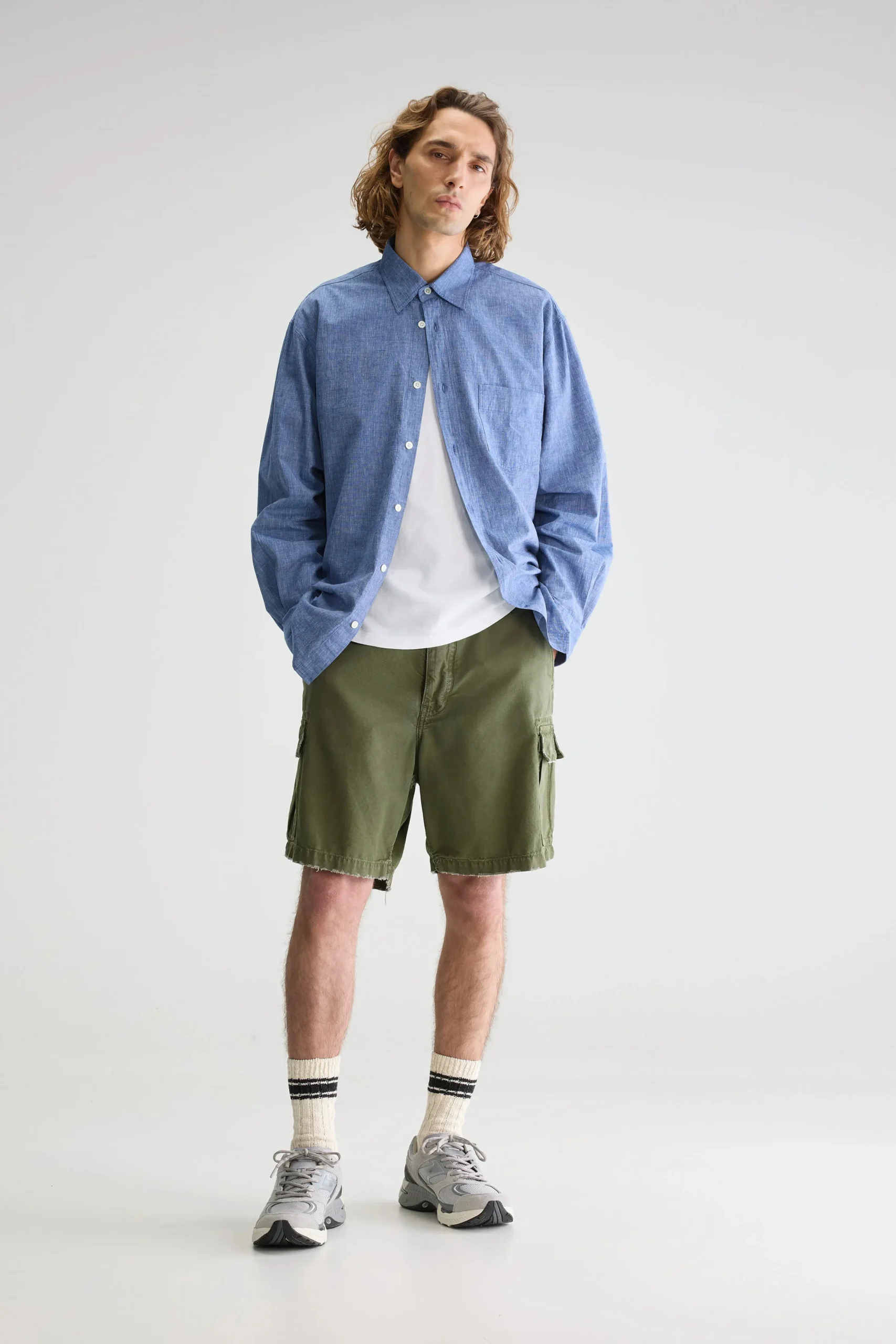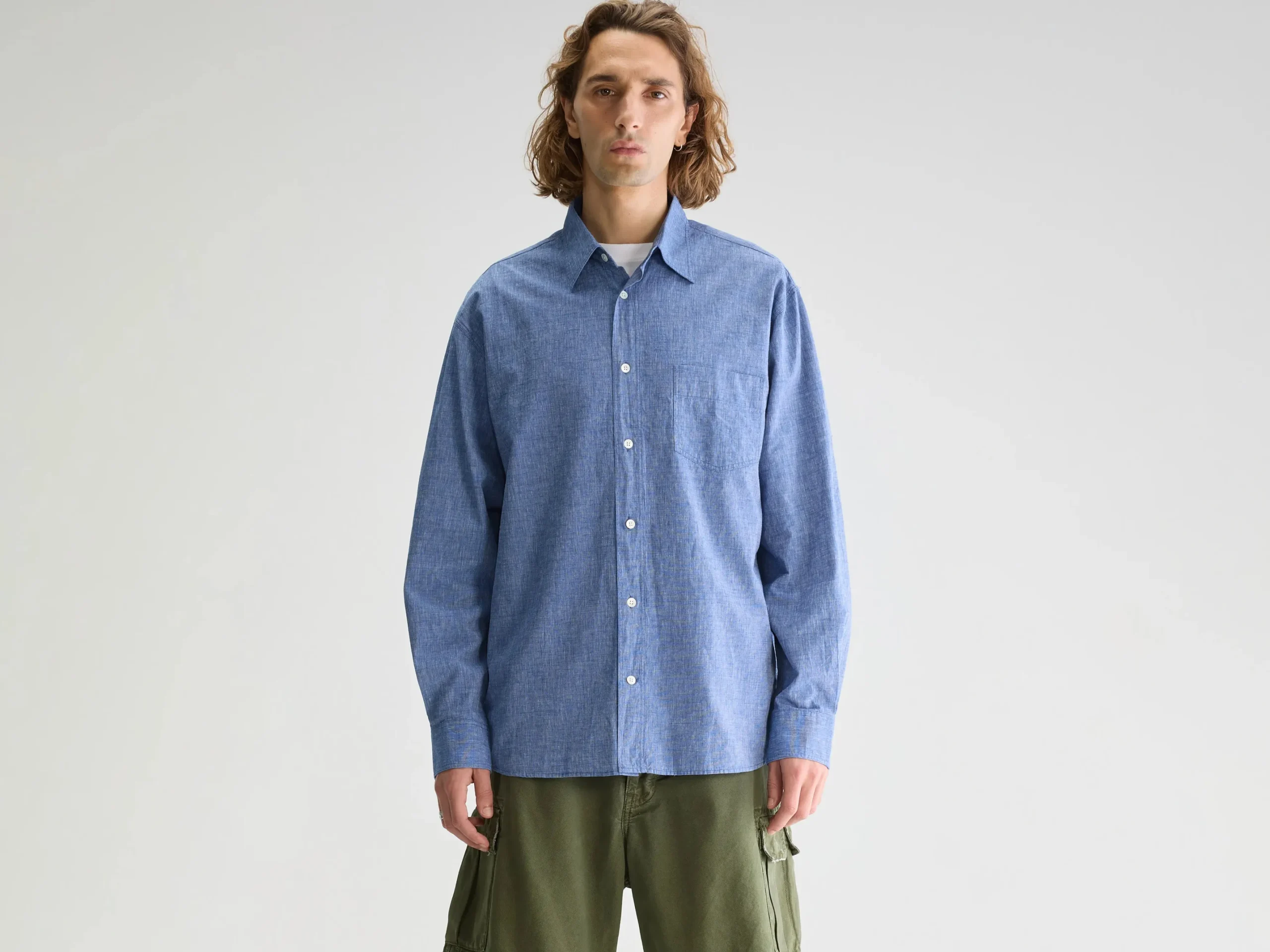 Los hemd met klassieke kraag, lange mouwen en dubbelgestikte sluiting, gemaakt van een denimblauwe, fil à fil katoen en…