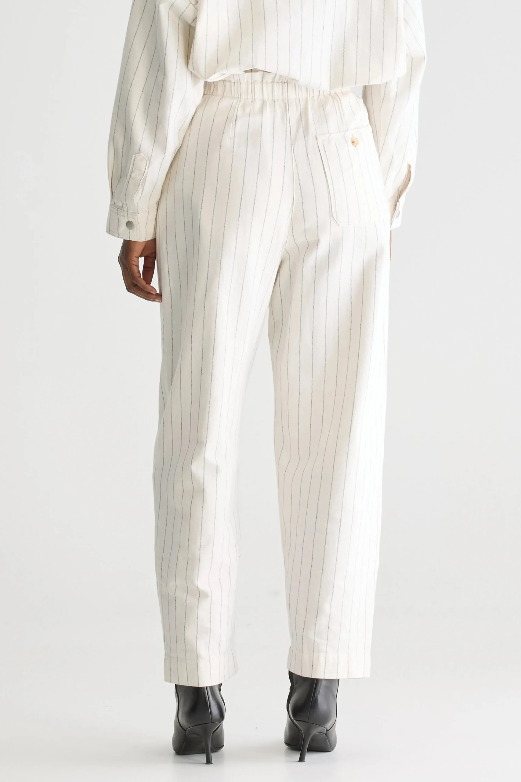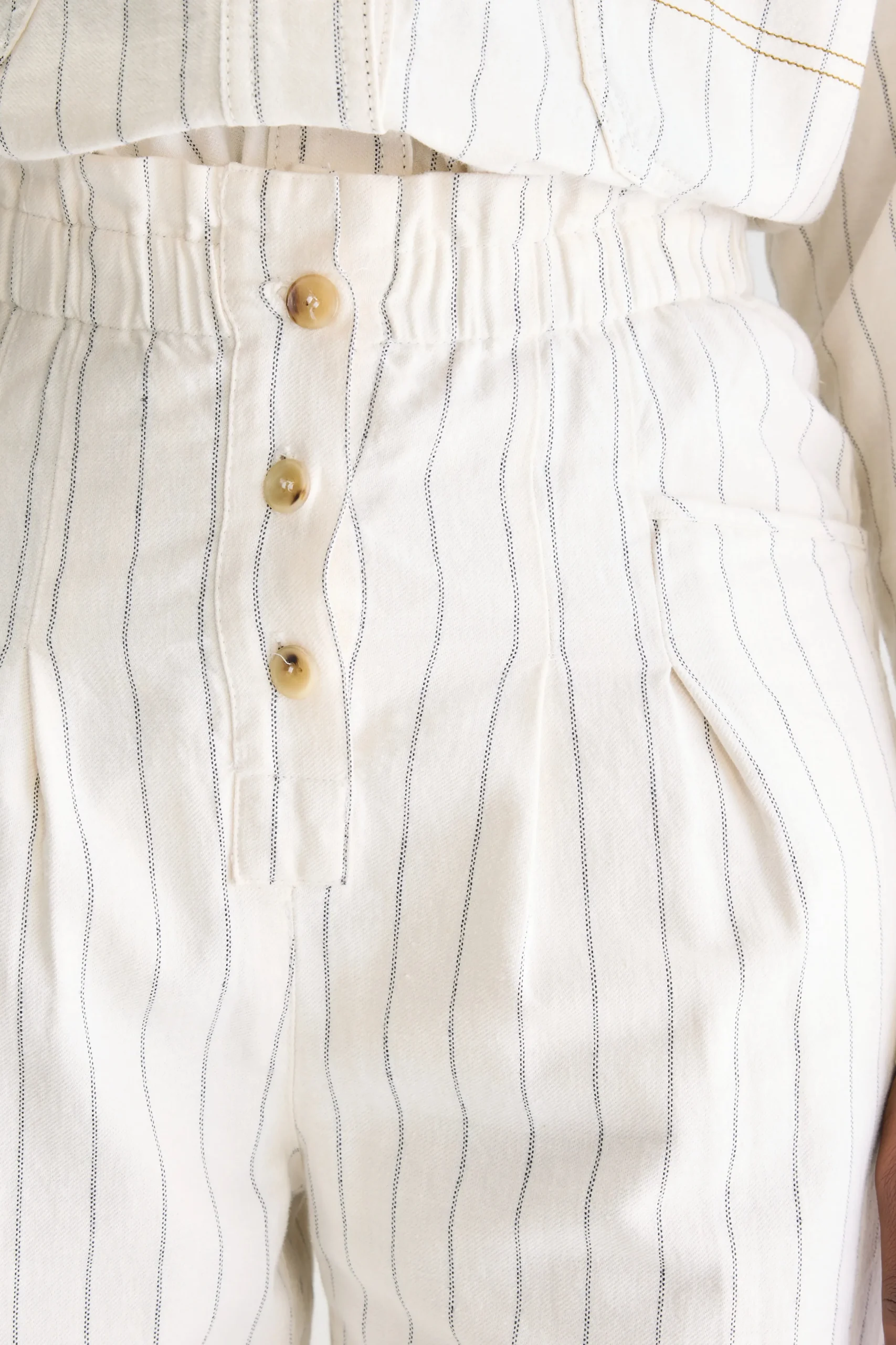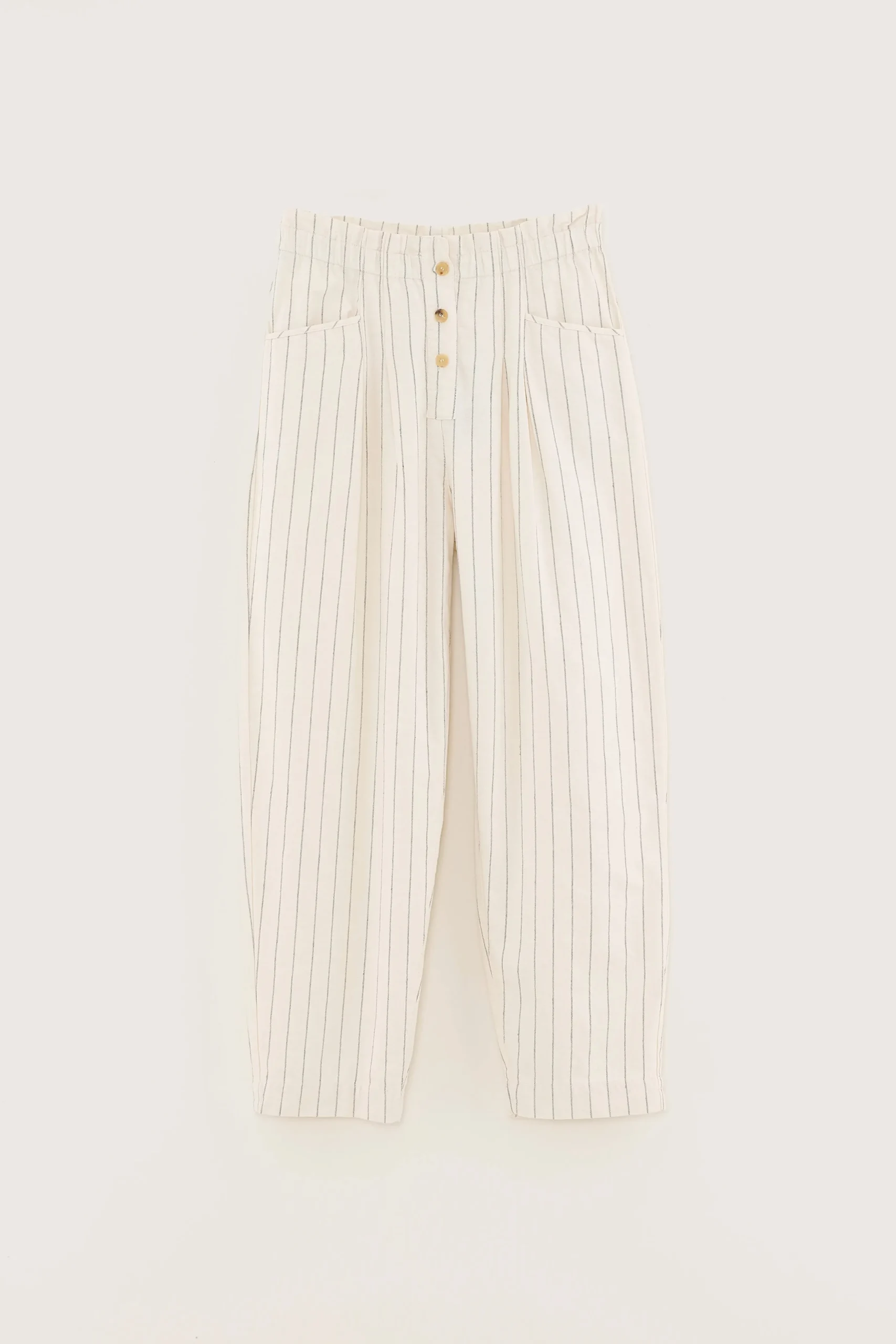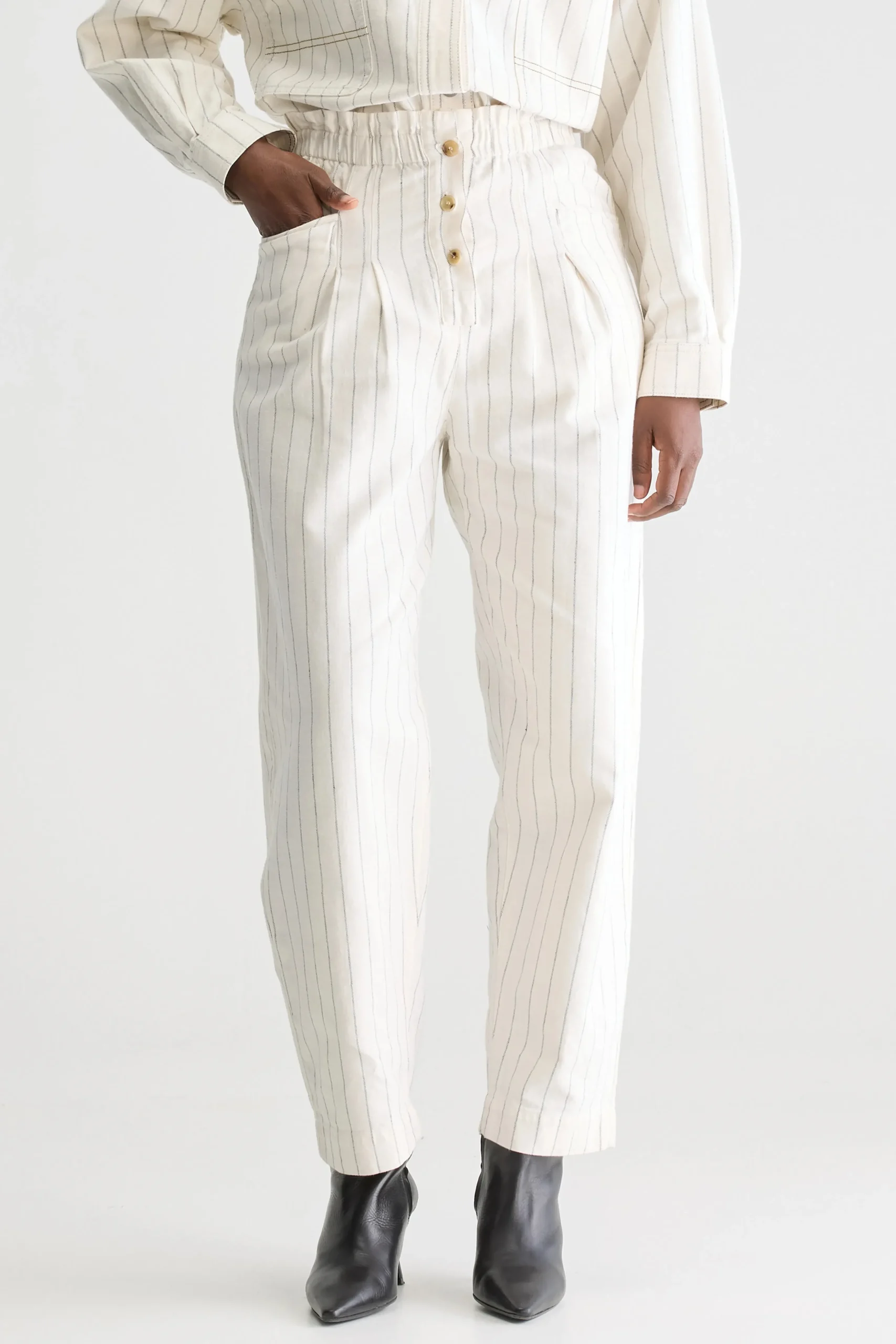 Relaxte broek met hoge paperbag-taille, tapered pijpen en knopen aan de voorkant, gemaakt van marineblauwe stof met ecru pinstripes. Relaxte pasvorm Hoge elastische taille in paperbag-stijl Taps toelopende cropped pijpen Geen stretchHoornknopen aan de voorkant Opgevulde achterzakBinnenbeenlengte: 26″(gebaseerd op maat 36)De binnenbeenlengte past zich lichtjes aan afhankelijk van de gekozen maat, zodat de pasvorm proportioneel blijft.