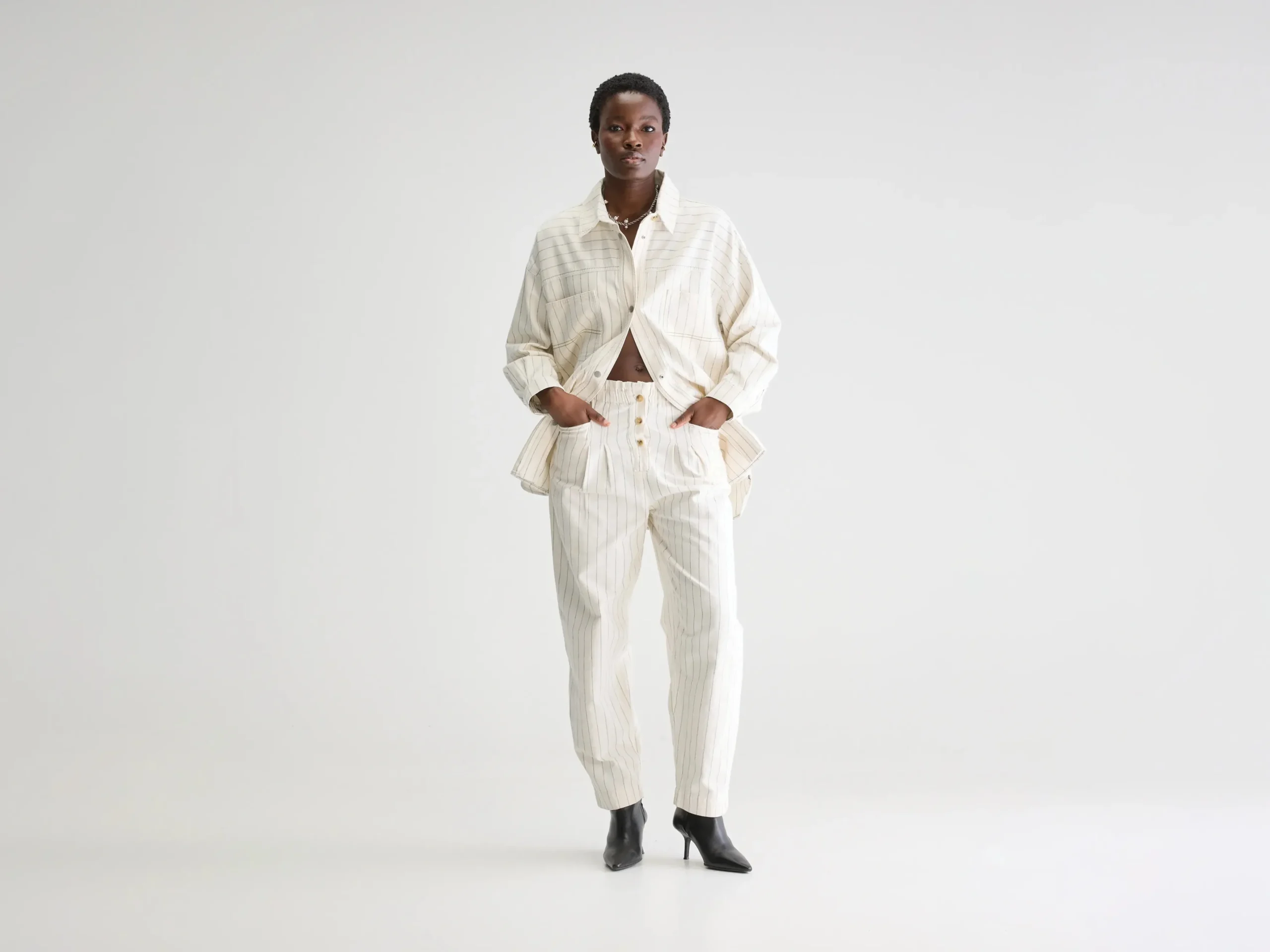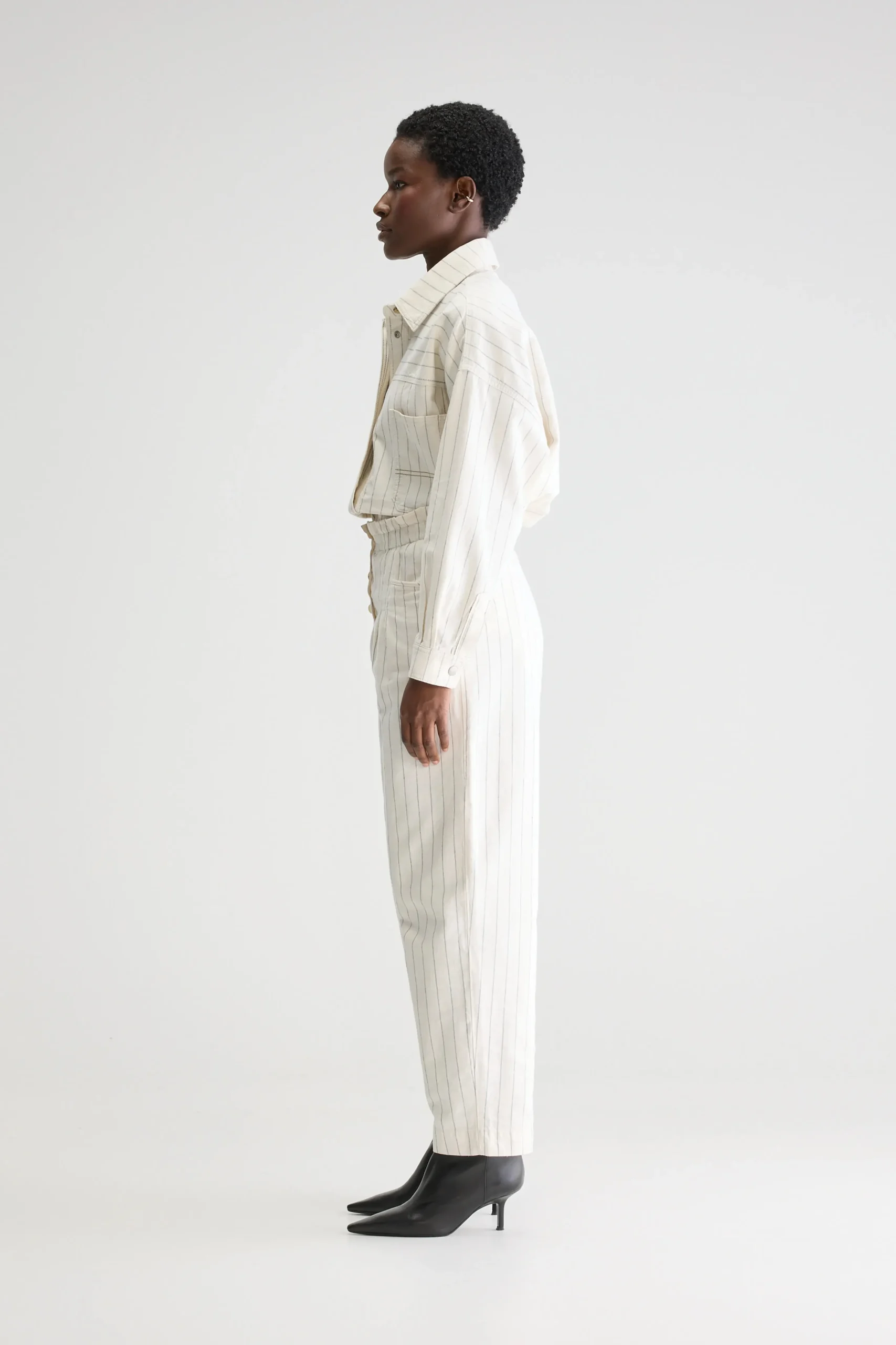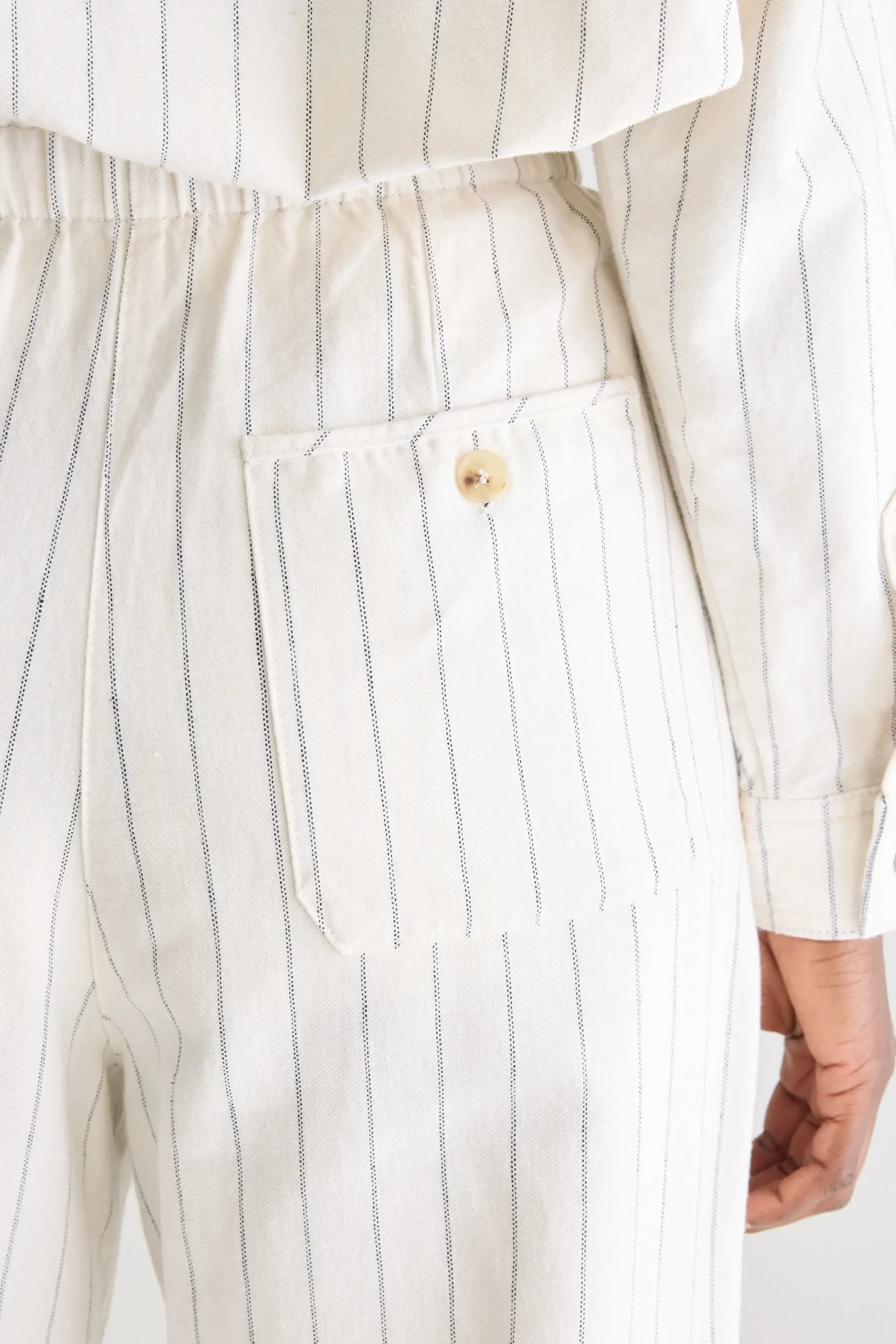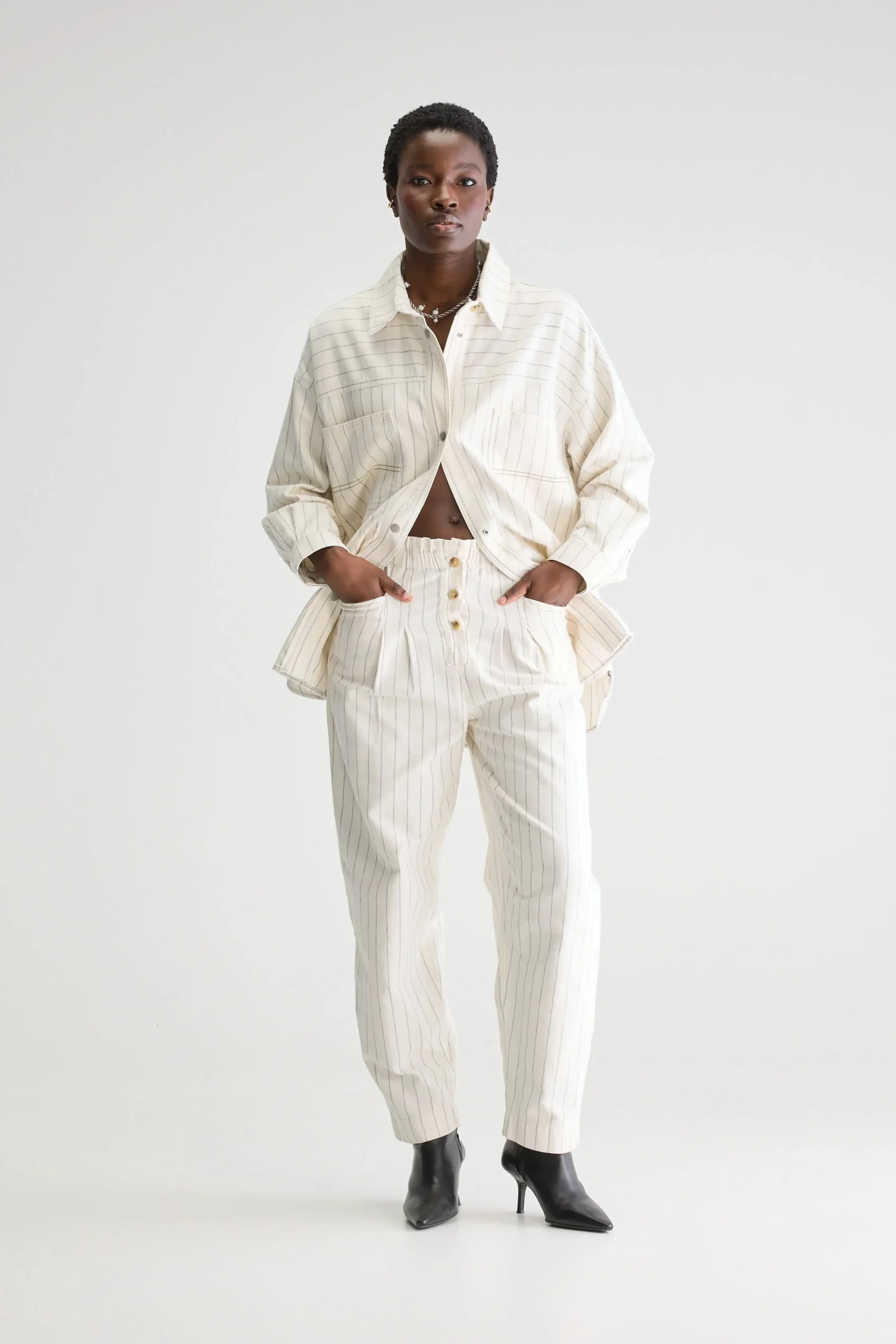 Relaxte broek met hoge paperbag-taille, tapered pijpen en knopen aan de voorkant, gemaakt van marineblauwe stof met ecru pinstripes. Relaxte pasvorm Hoge elastische taille in paperbag-stijl Taps toelopende cropped pijpen Geen stretchHoornknopen aan de voorkant Opgevulde achterzakBinnenbeenlengte: 26″(gebaseerd op maat 36)De binnenbeenlengte past zich lichtjes aan afhankelijk van de gekozen maat, zodat de pasvorm proportioneel blijft.