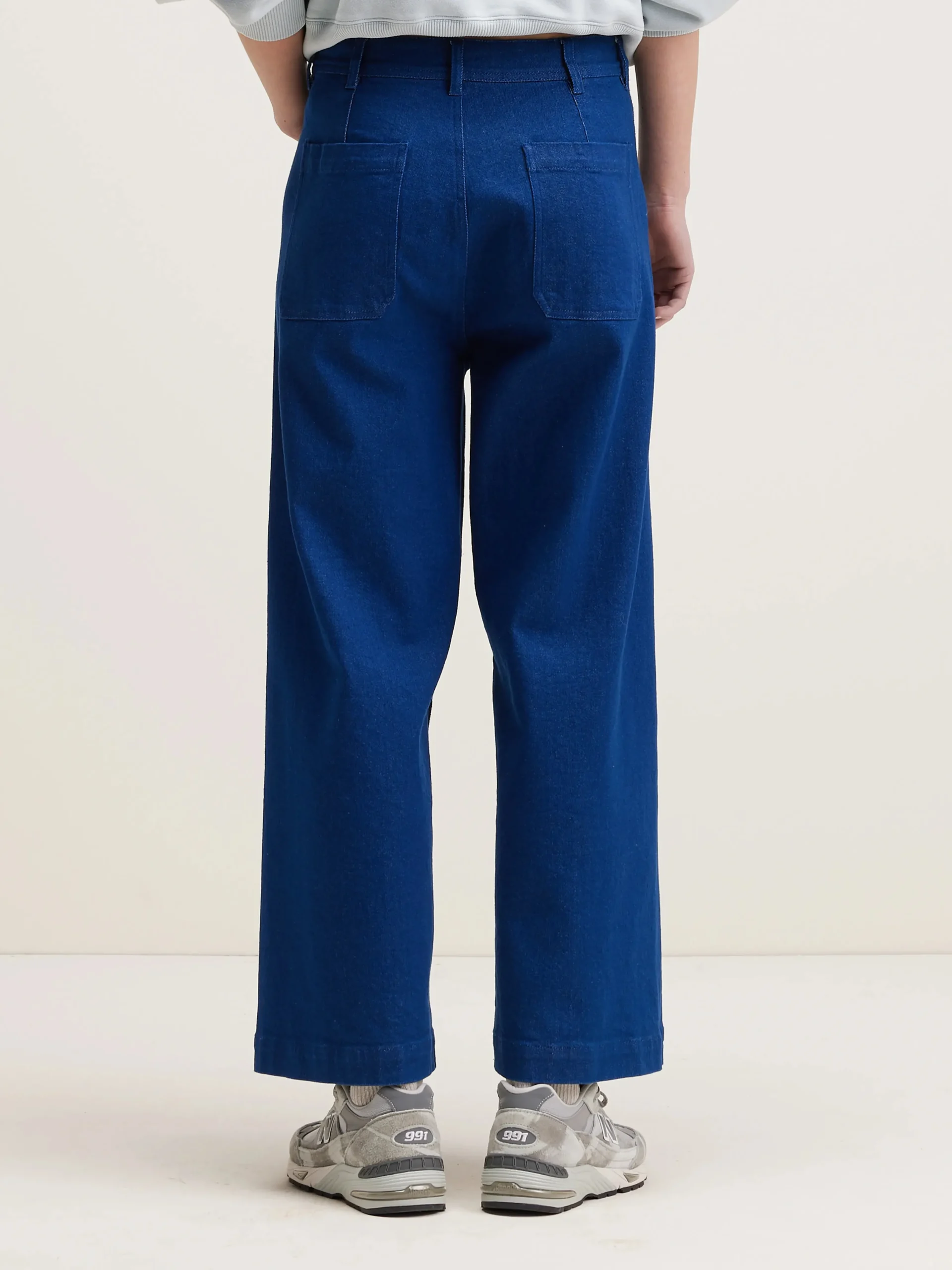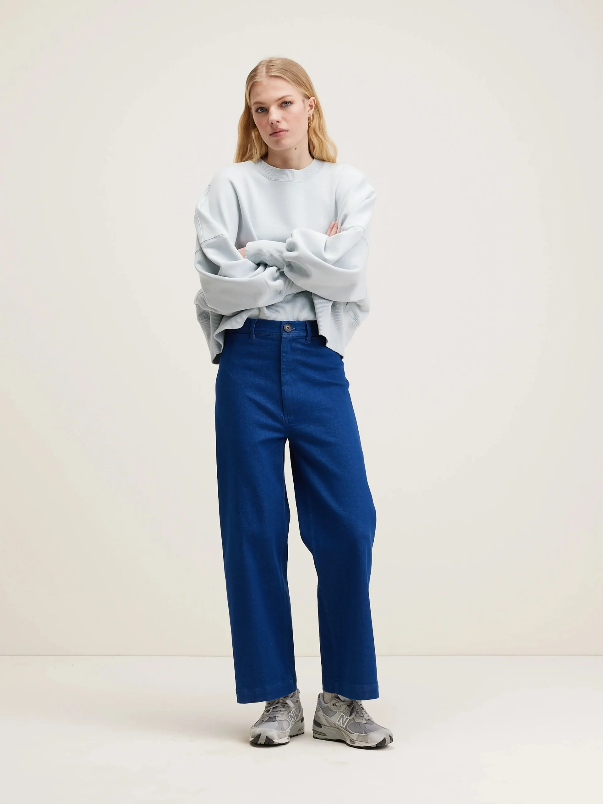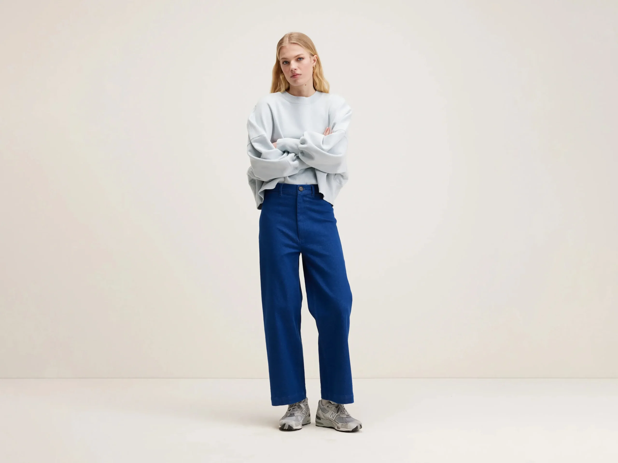 Hoog getailleerde broek met wijde pijpen en discrete zakken aan de voorkant in blauw canvaskatoen.r