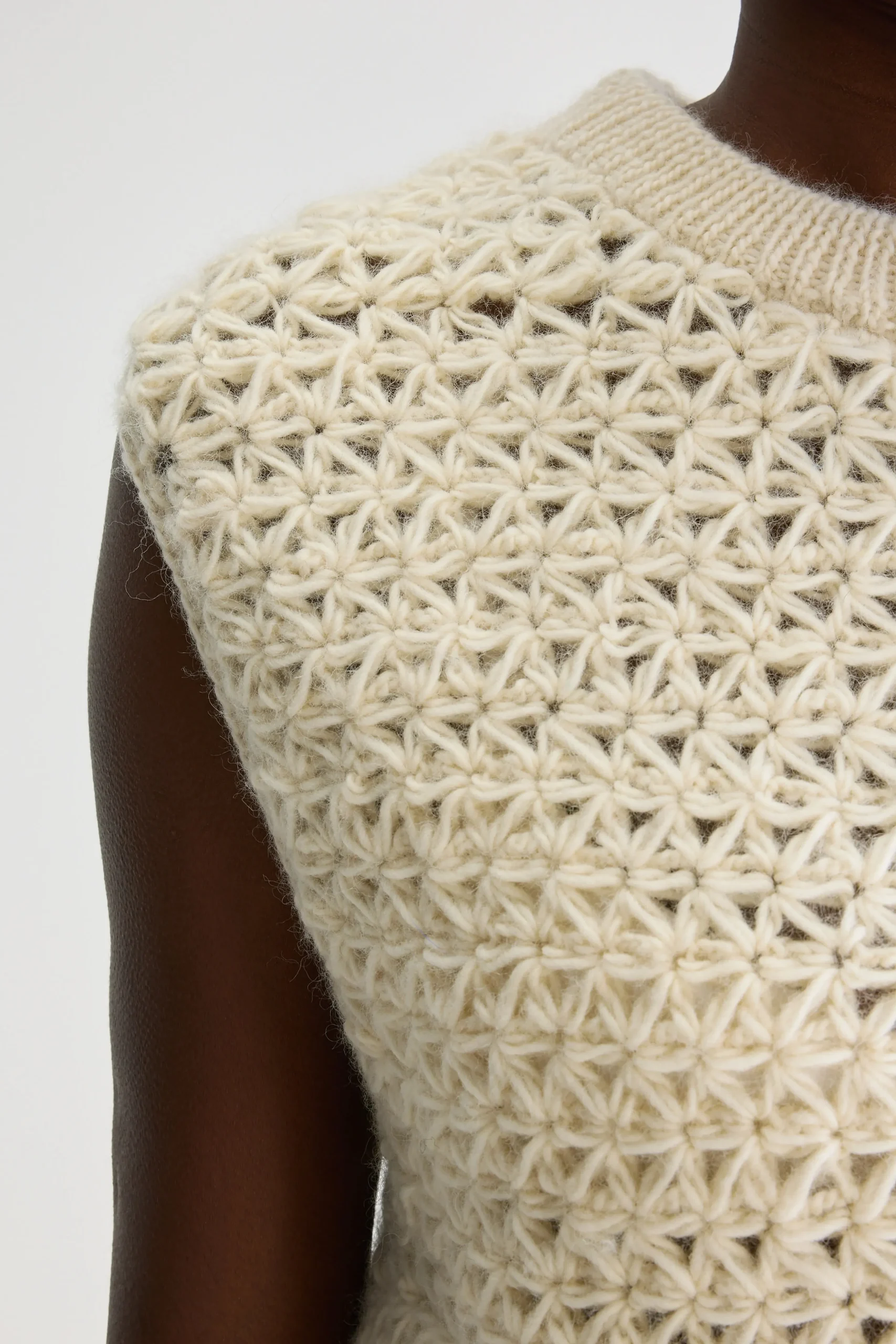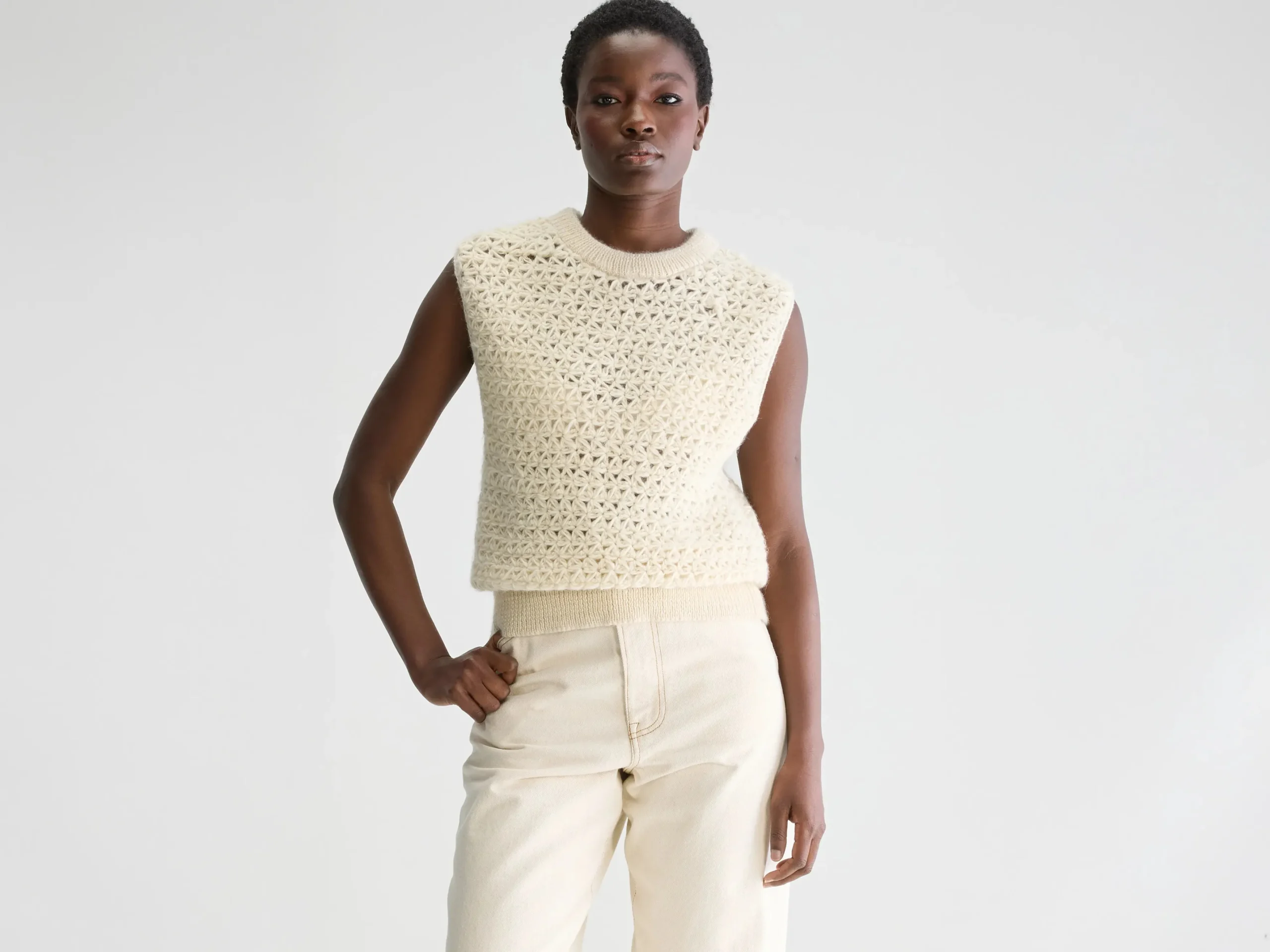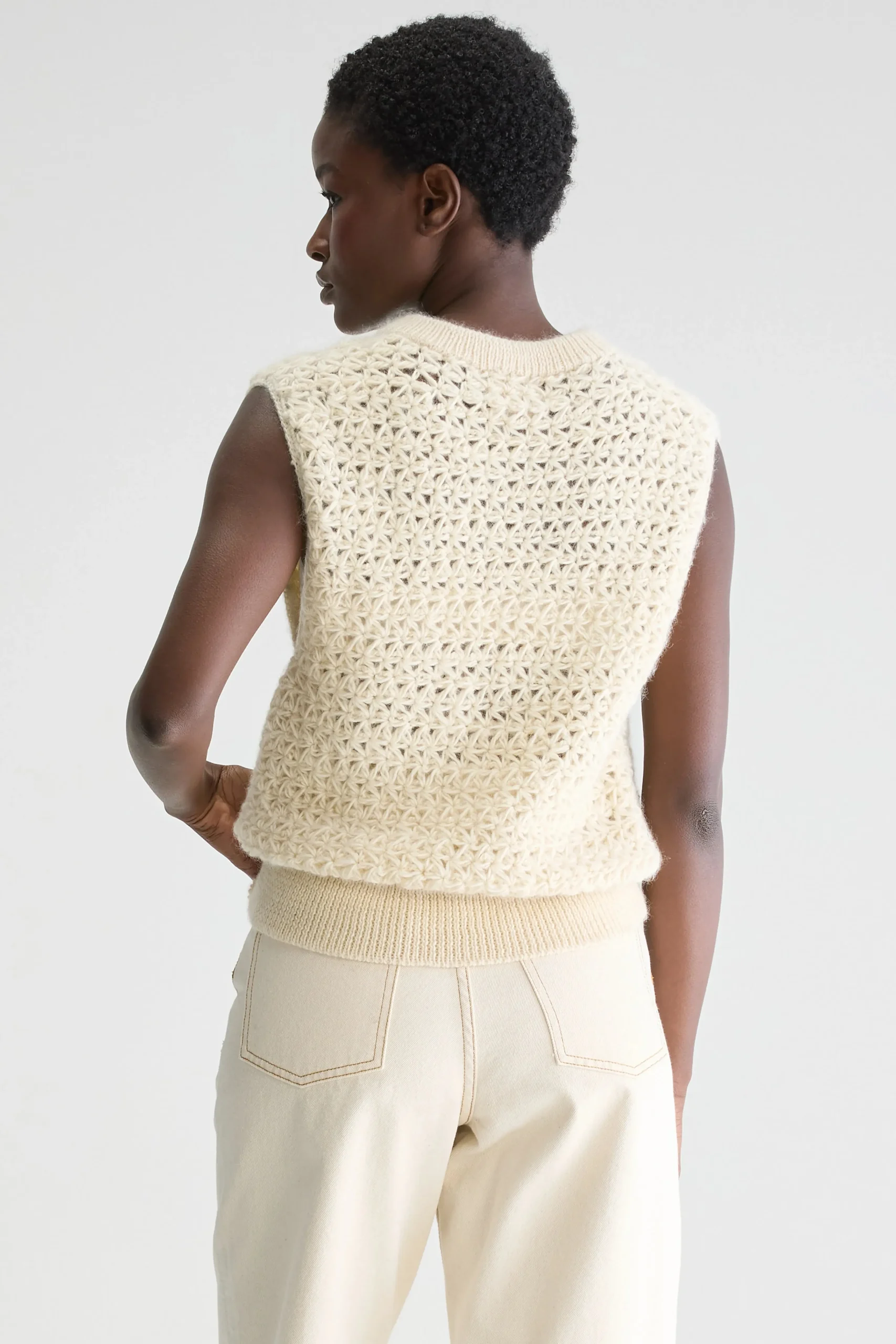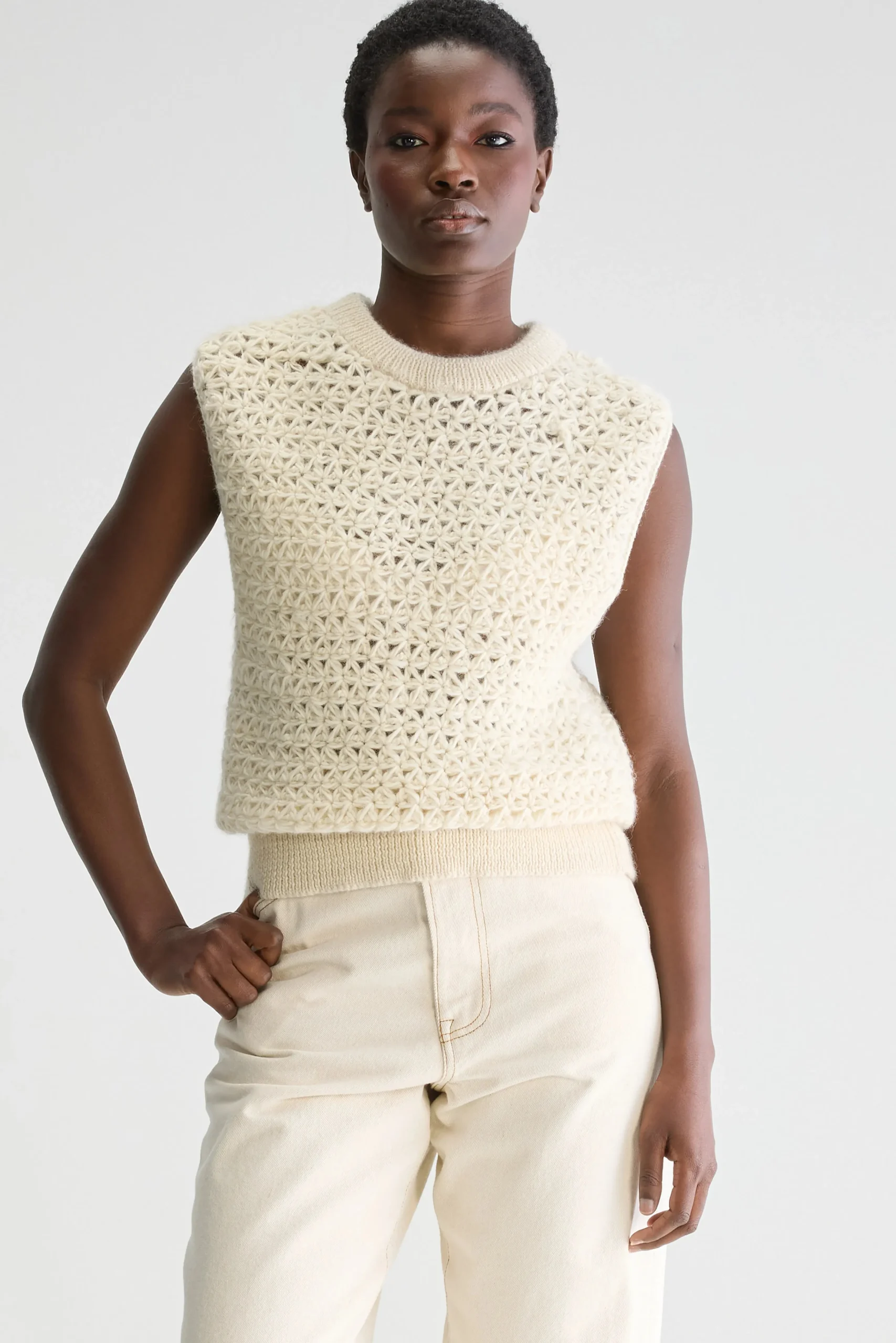voor een meer aansluitende stijl.Ronde halsMouwloosSter-achtig gebreid patroonMet de hand gemaakt