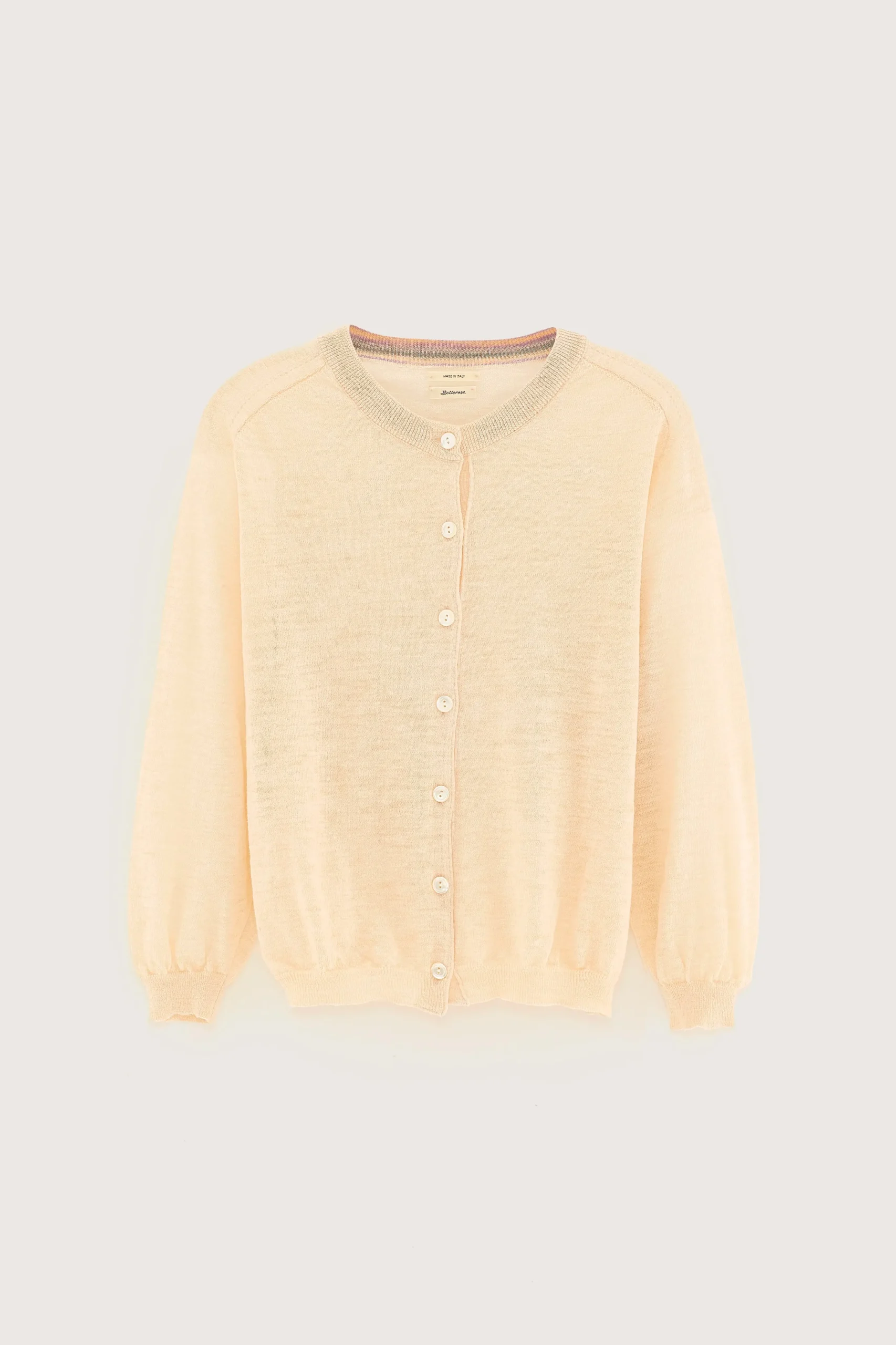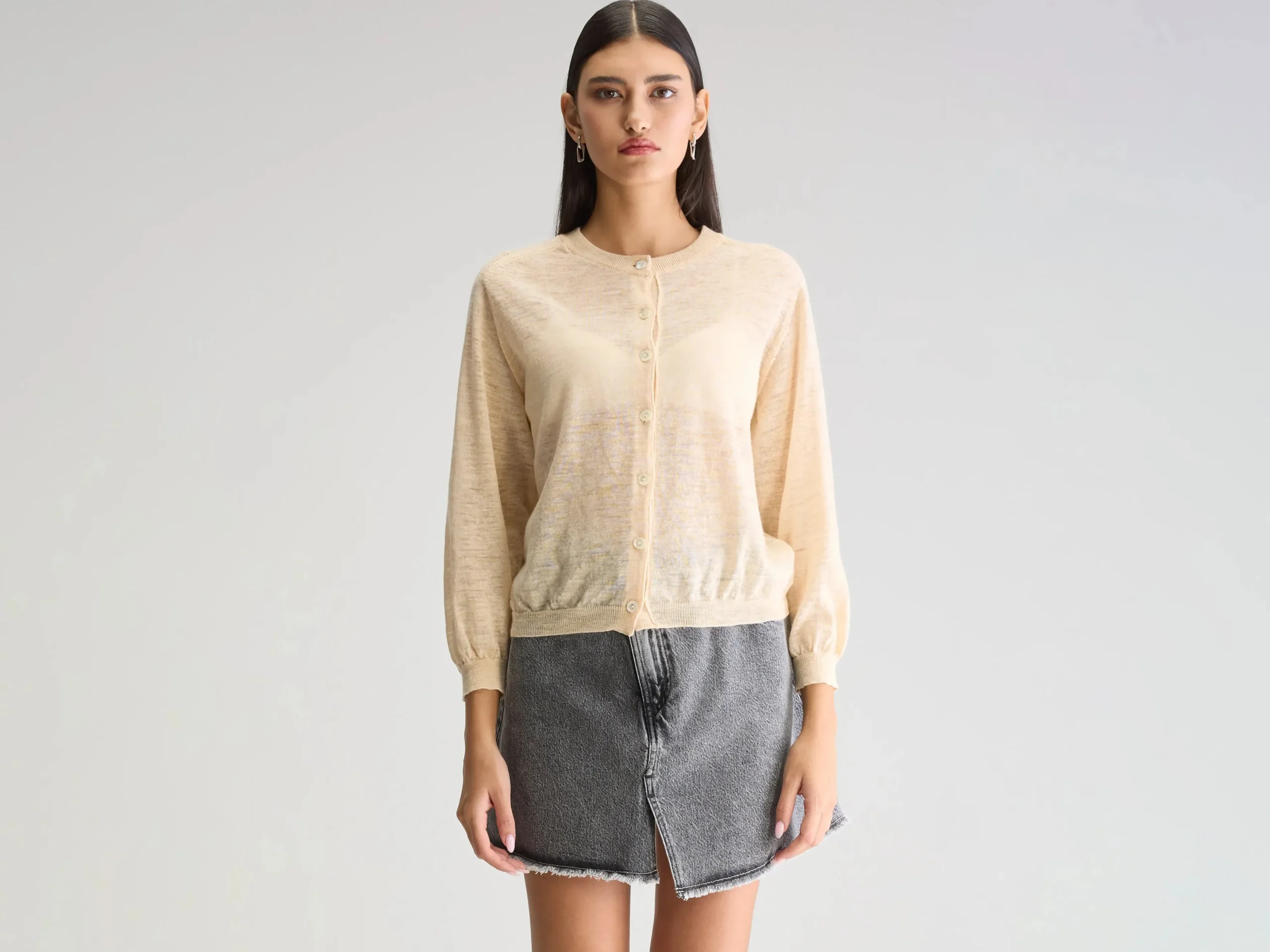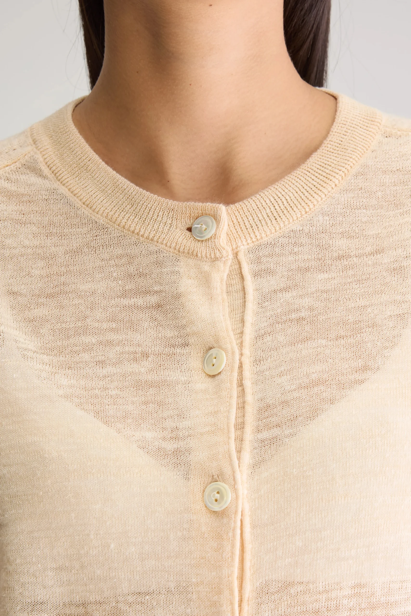 Klassiek, ivoorwit vest met raglanmouwen, parelmoeren knopen en delicaat open borduurwerk langs de schoudernaden.Klassiek vestLinnen RaglanmouwenGeribde randenRonde halsParelmoeren knopenGemaakt in Italië