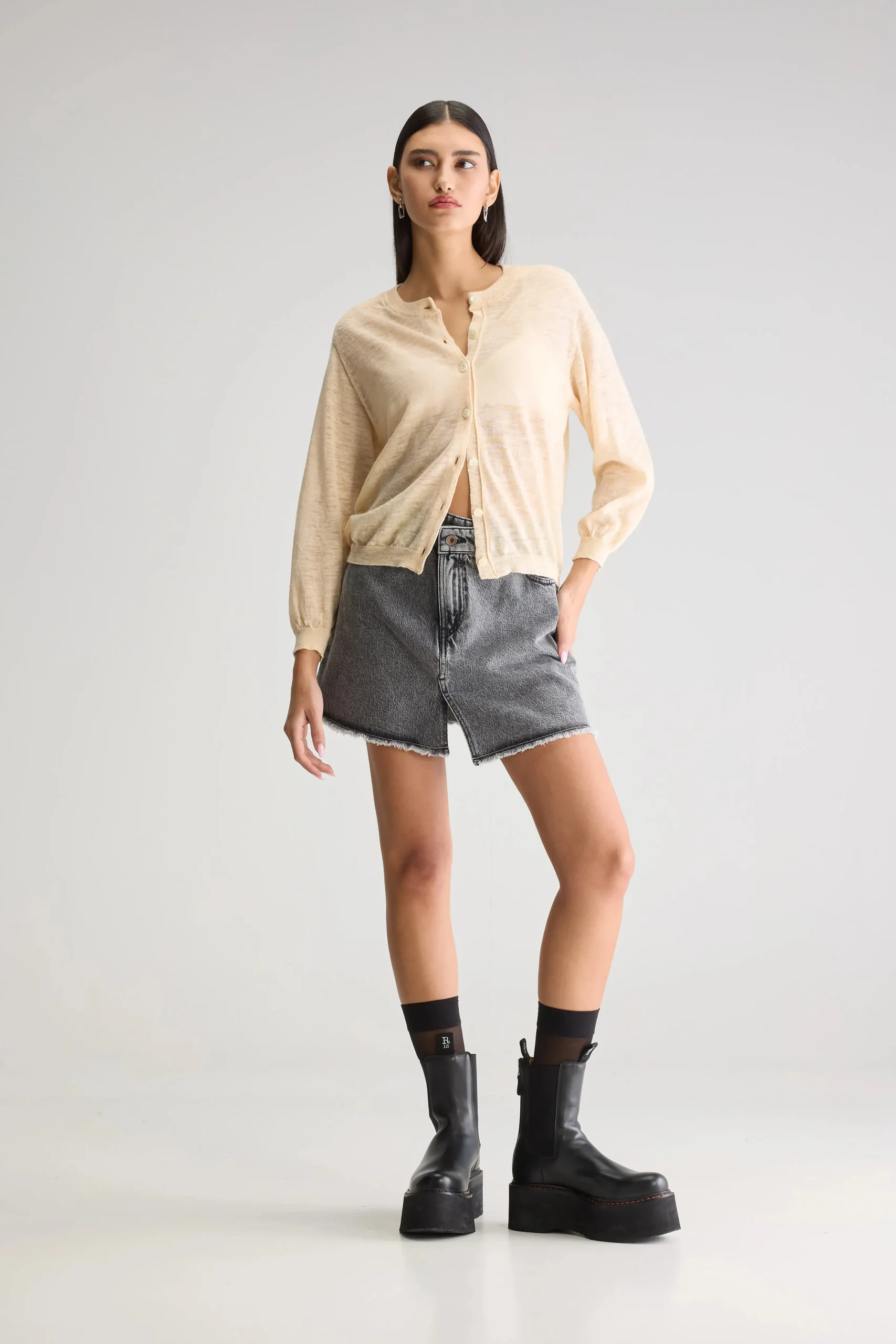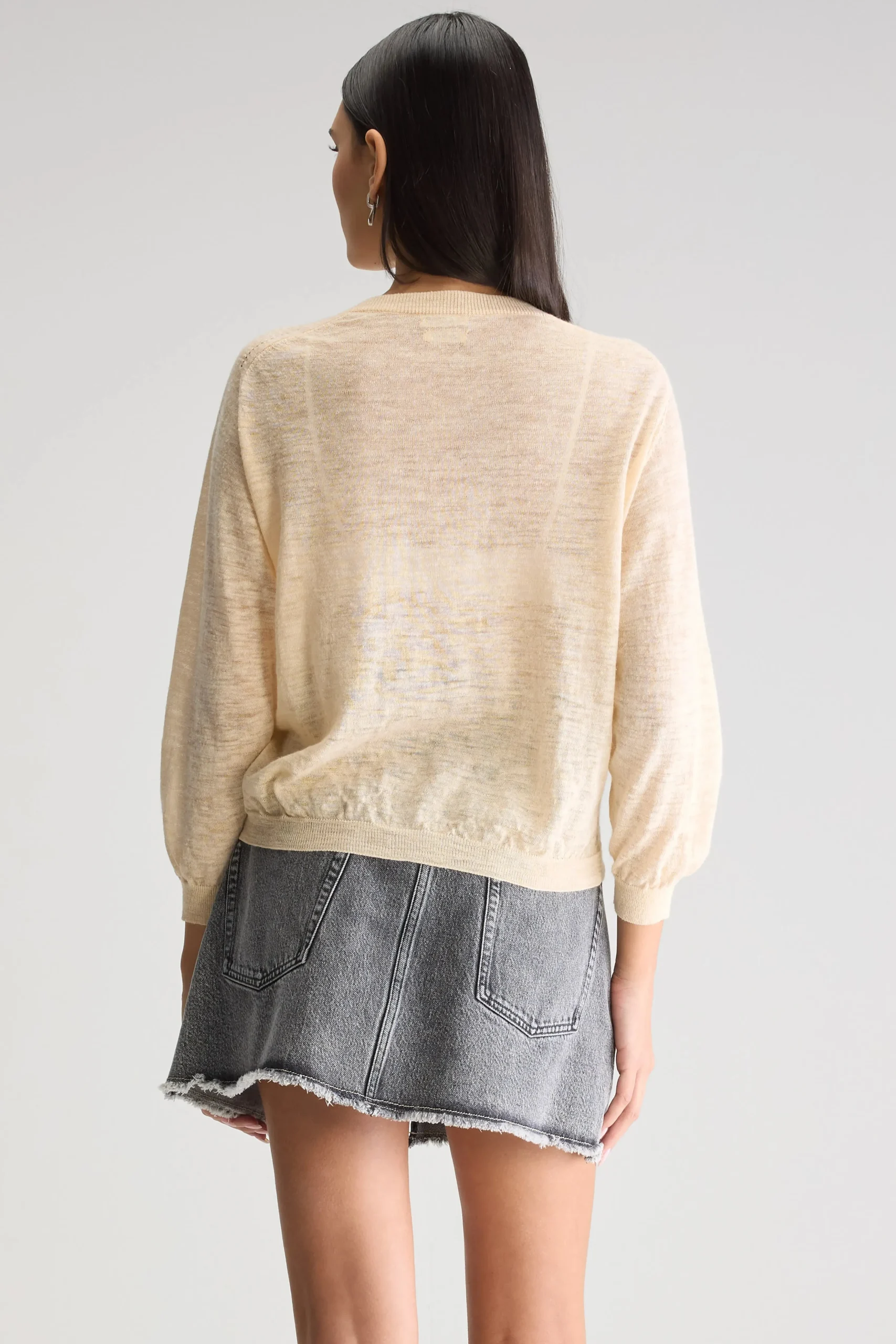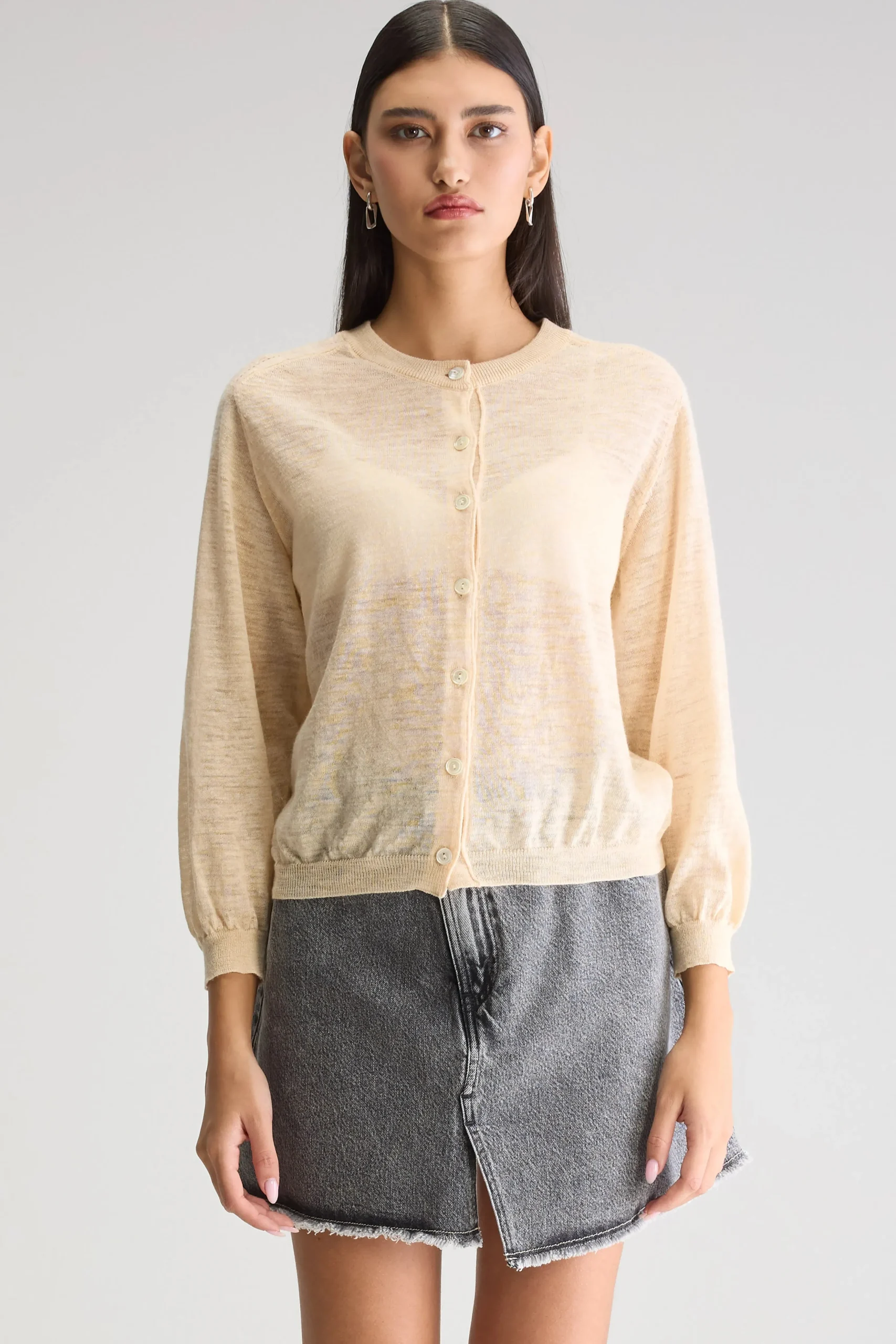 Klassiek, ivoorwit vest met raglanmouwen, parelmoeren knopen en delicaat open borduurwerk langs de schoudernaden.Klassiek vestLinnen RaglanmouwenGeribde randenRonde halsParelmoeren knopenGemaakt in Italië