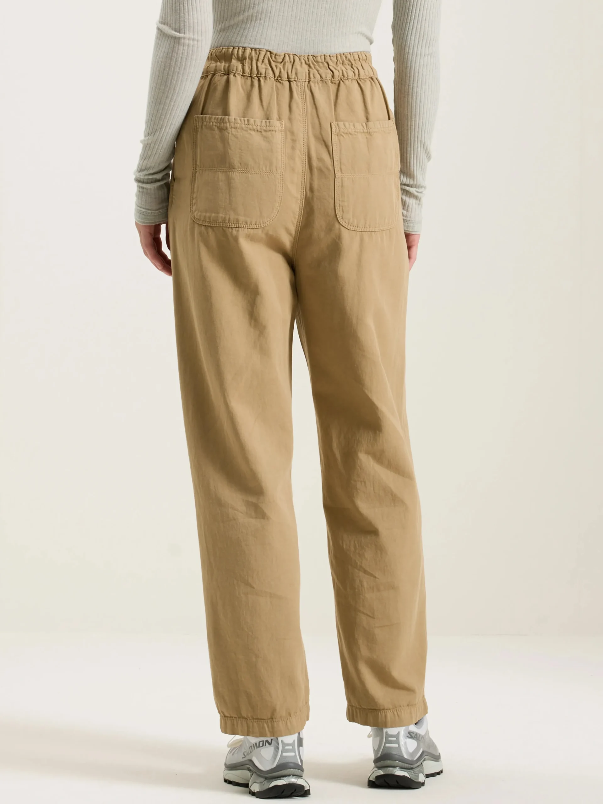 Relaxede broek met elastiek in de taille van lichtbeige katoen en linnen.rrRelaxede pasvormrNormale taille, relaxede …