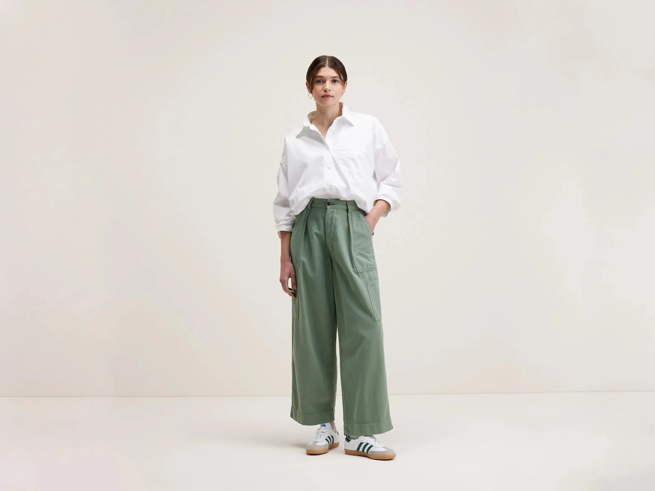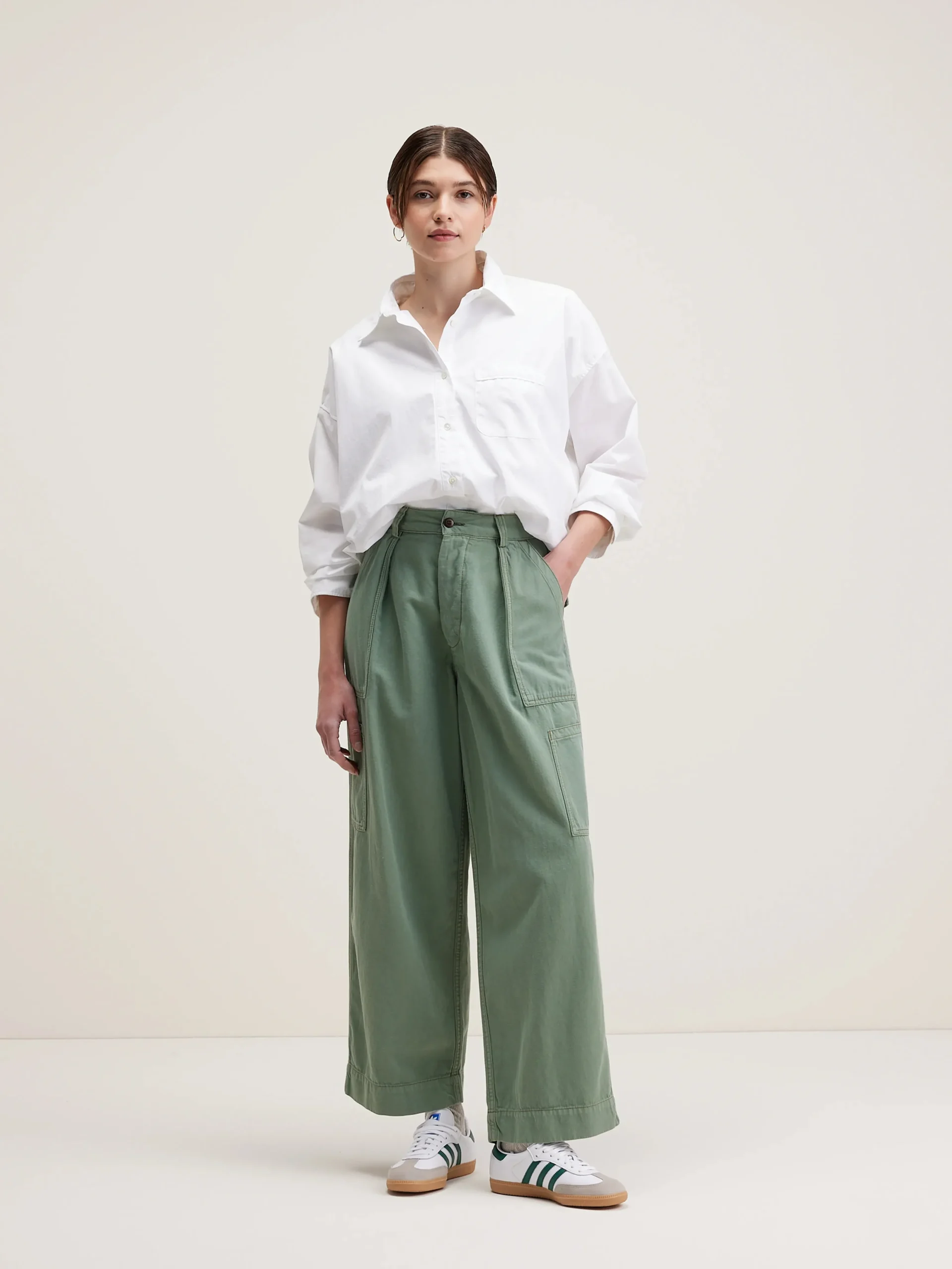 Klassieke cargo broek met wijde pijpen en fatigue-zakken in een eucalyptusgroene katoen en linnenmix.Klassieke cargo broekNormale taille, rechte pijpenExtra zakken op de benenBandjes in de taille om de pasvorm aan te passenBinnenbeenlengte: 28″ (gebaseerd op maat 1)De binnenbeenlengte past zich lichtjes aan afhankelijk van de gekozen maat, zodat de pasvorm proportioneel blijft.