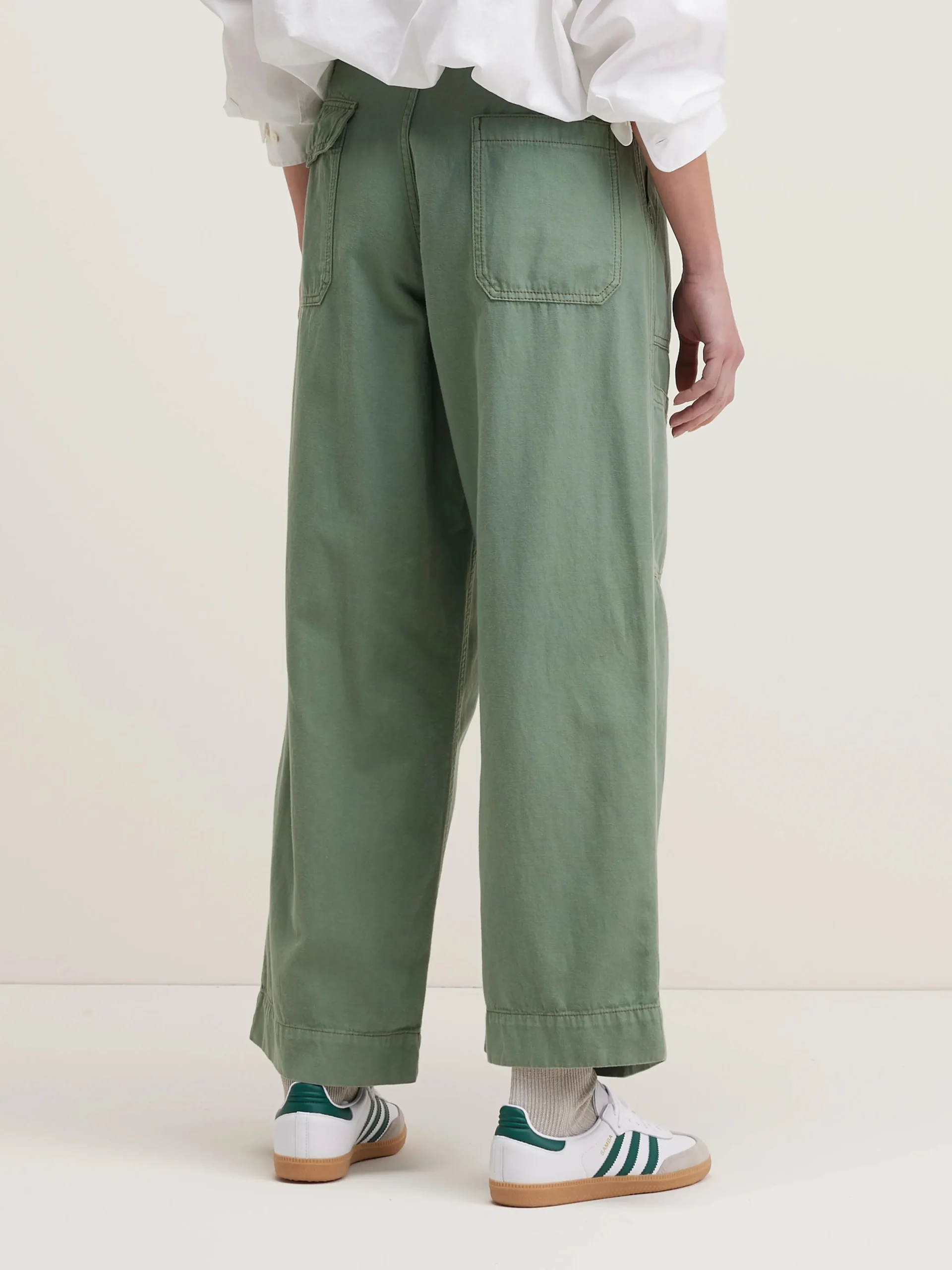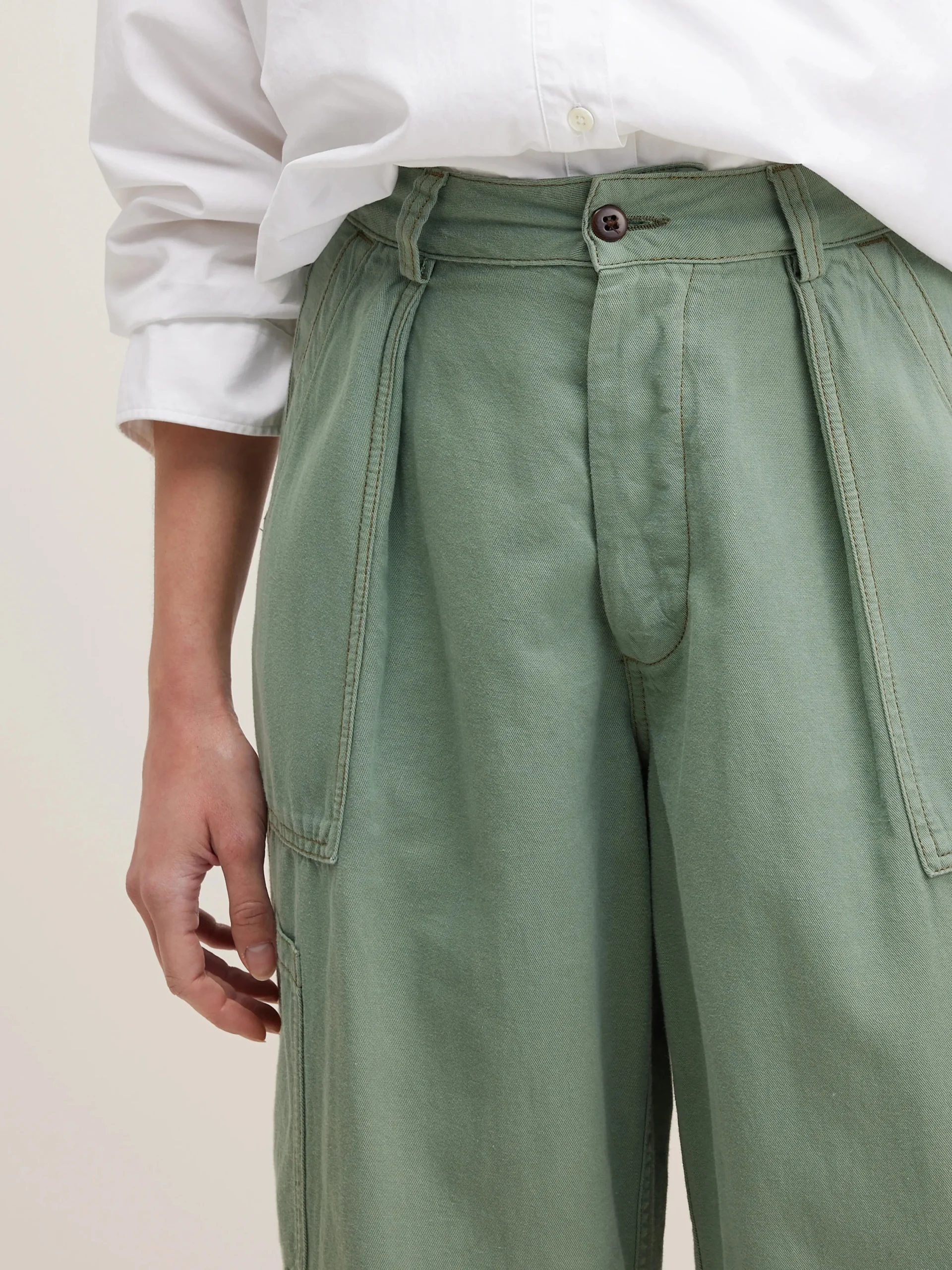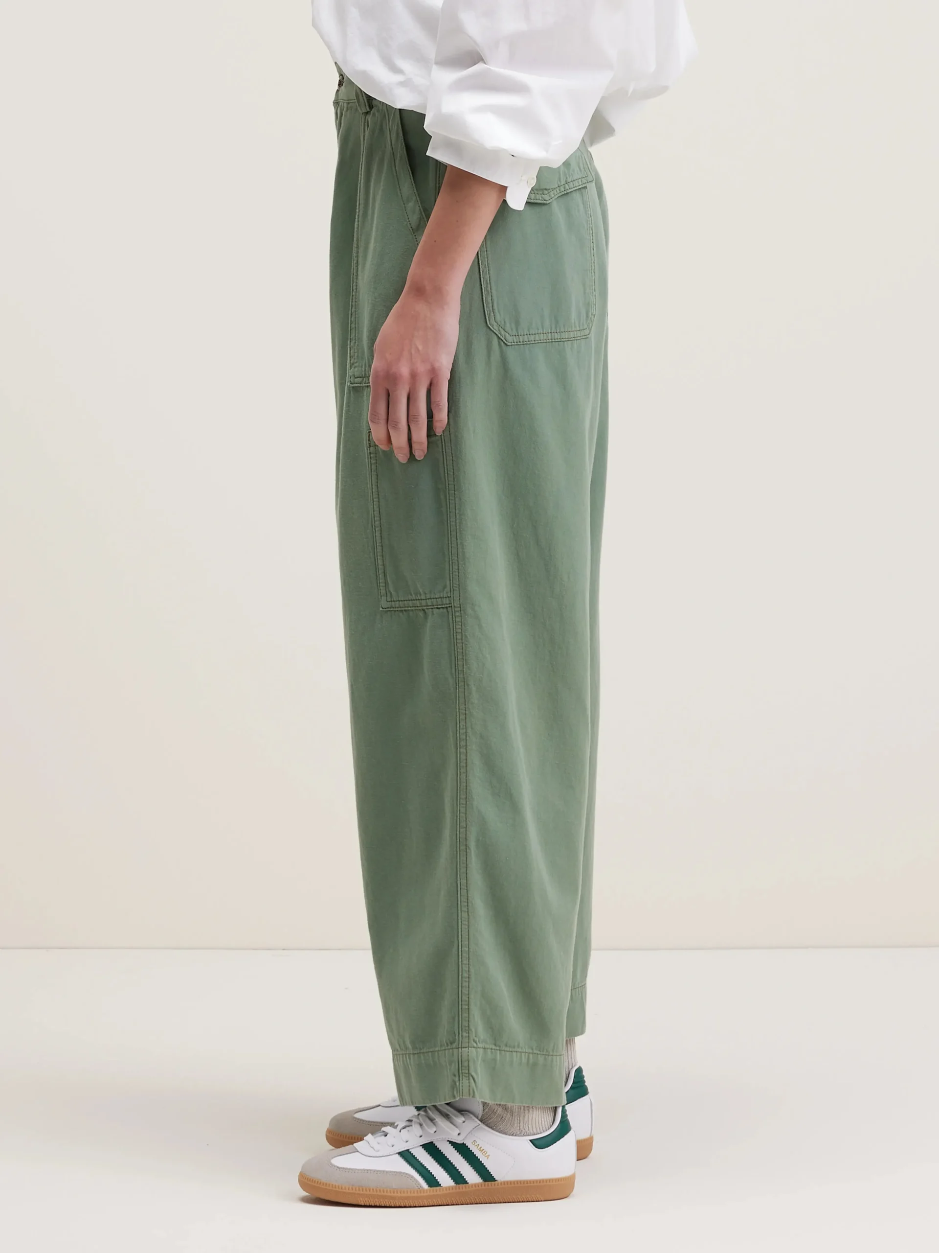 Klassieke cargo broek met wijde pijpen en fatigue-zakken in een eucalyptusgroene katoen en linnenmix.Klassieke cargo bro…