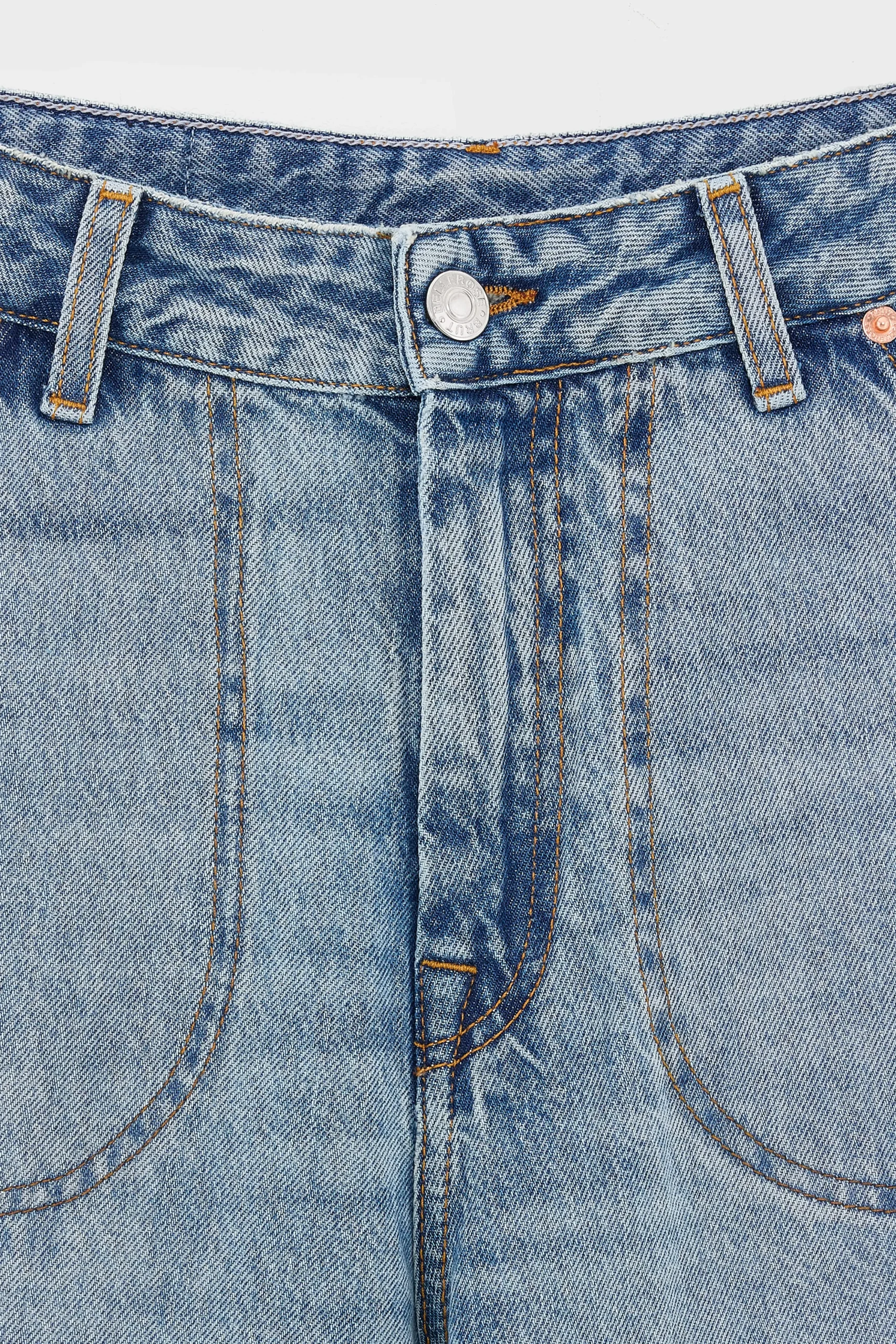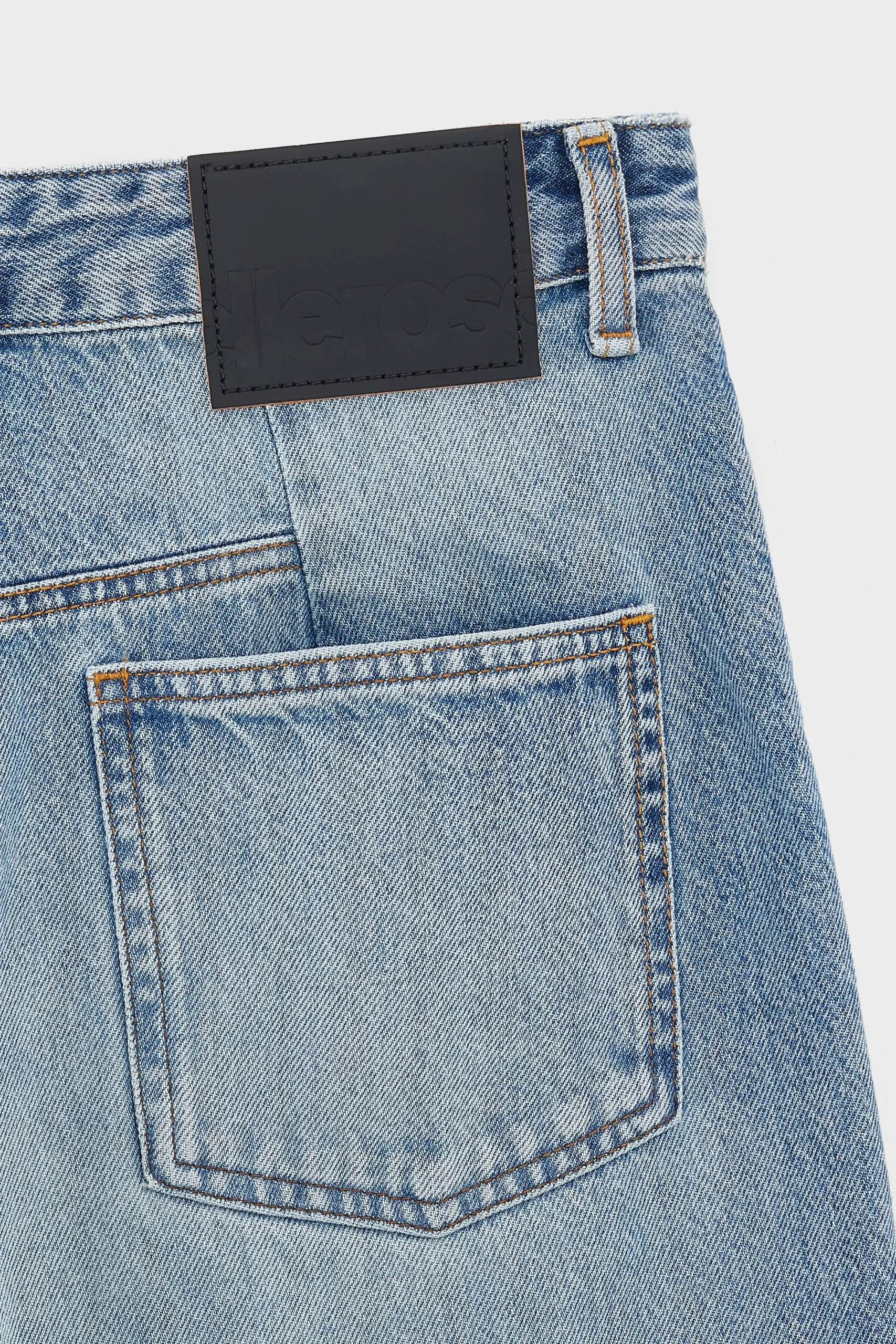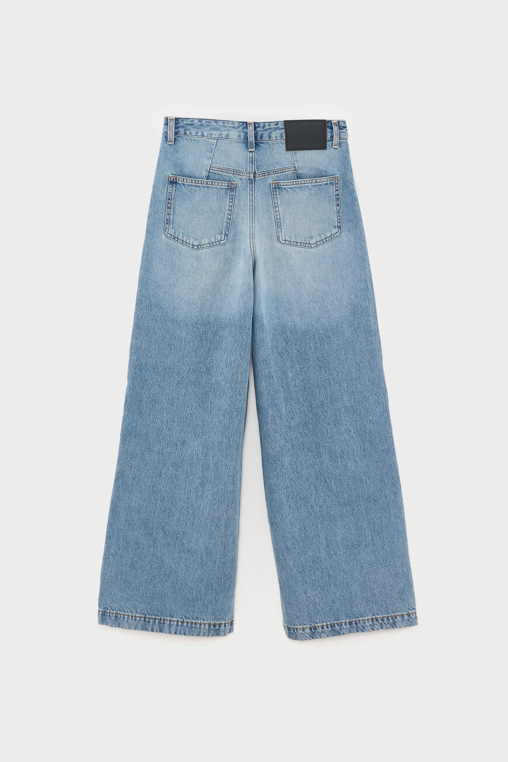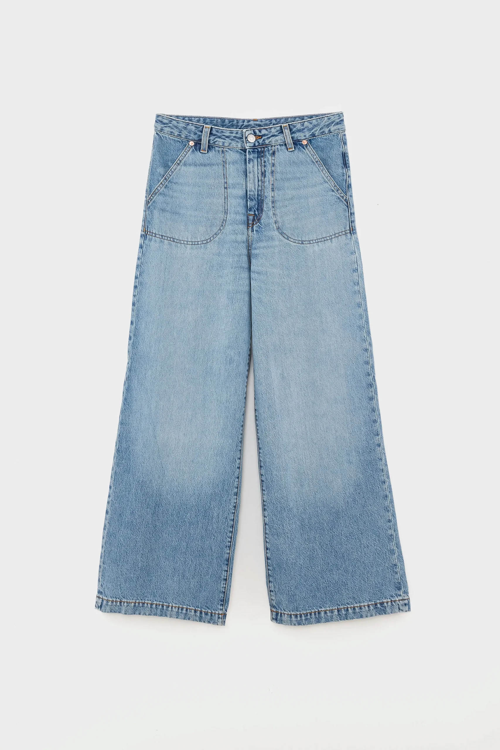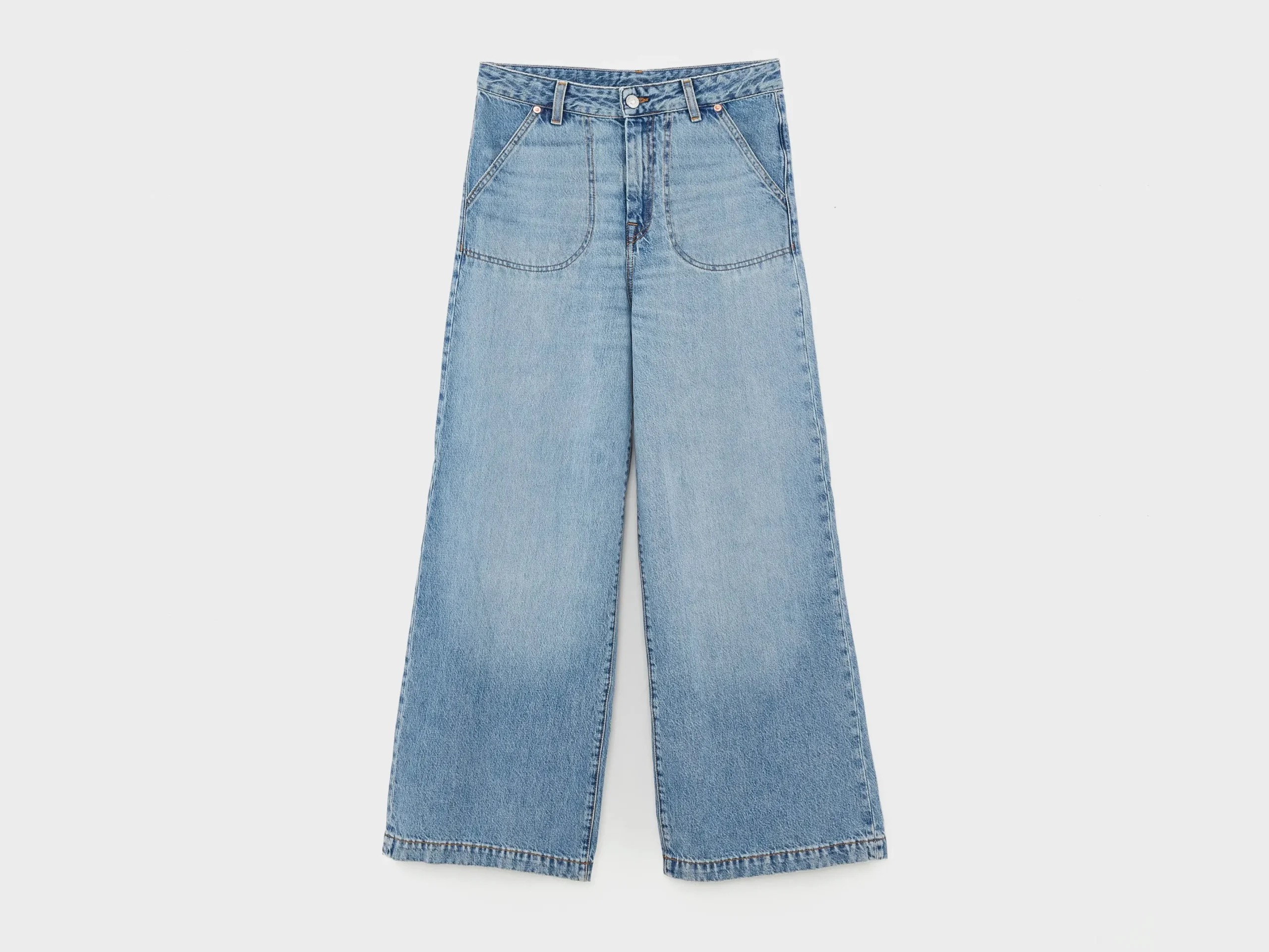 High-waist jeans met wijde pijpen, van vintage blauw katoenen denim.Medium weight denimNo-stretchDelicaat wassenFiguurnaden achteraanZakken met sierstikselRitssluitingBinnenbeenlengte: 30″ (gebaseerd op maat 26)De binnenbeenlengte past zich lichtjes aan afhankelijk van de gekozen maat, zodat de pasvorm proportioneel blijft.
