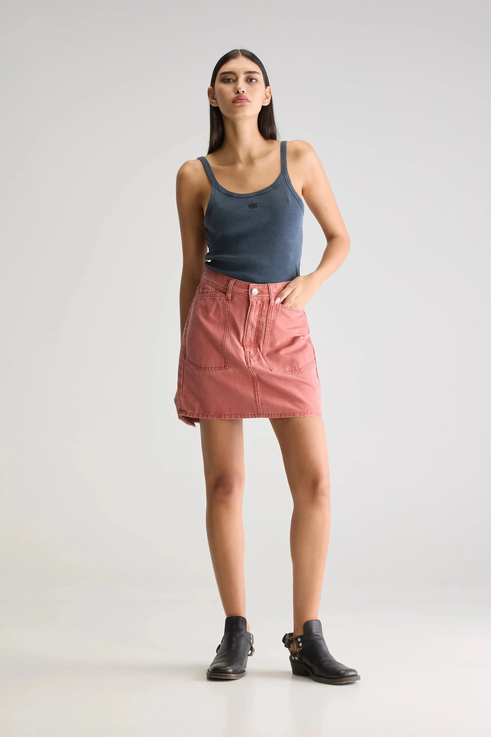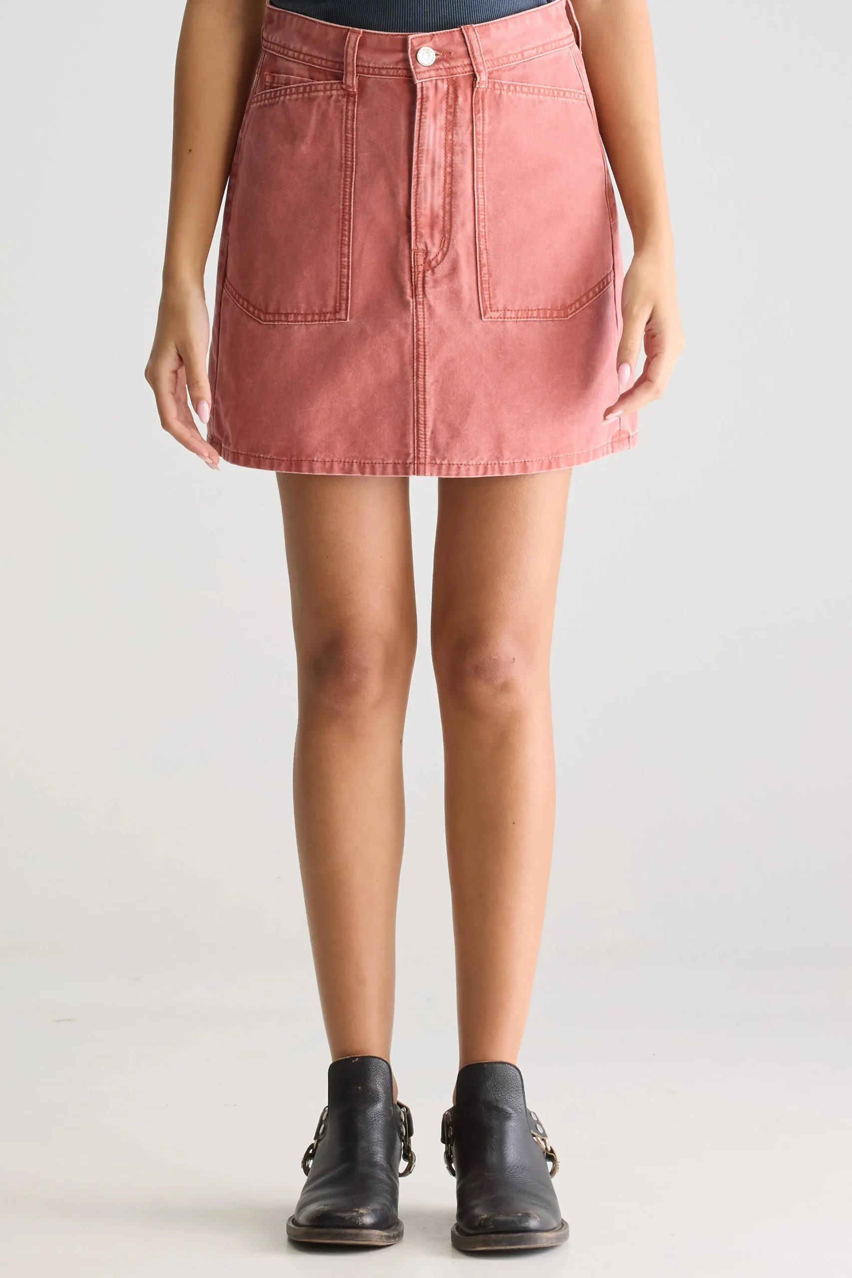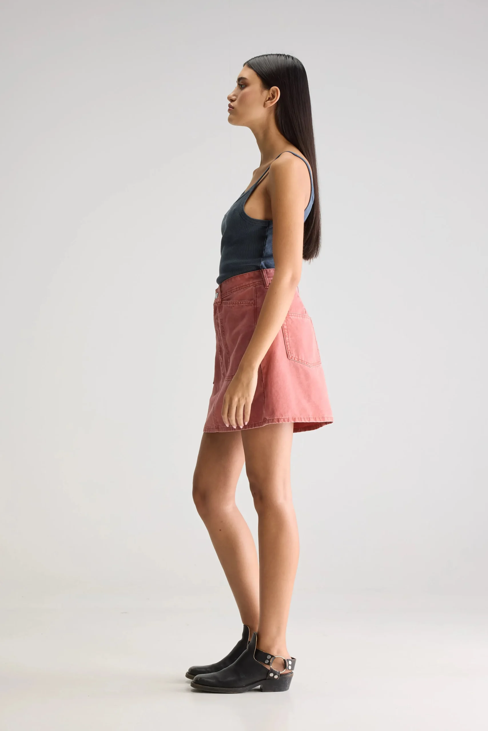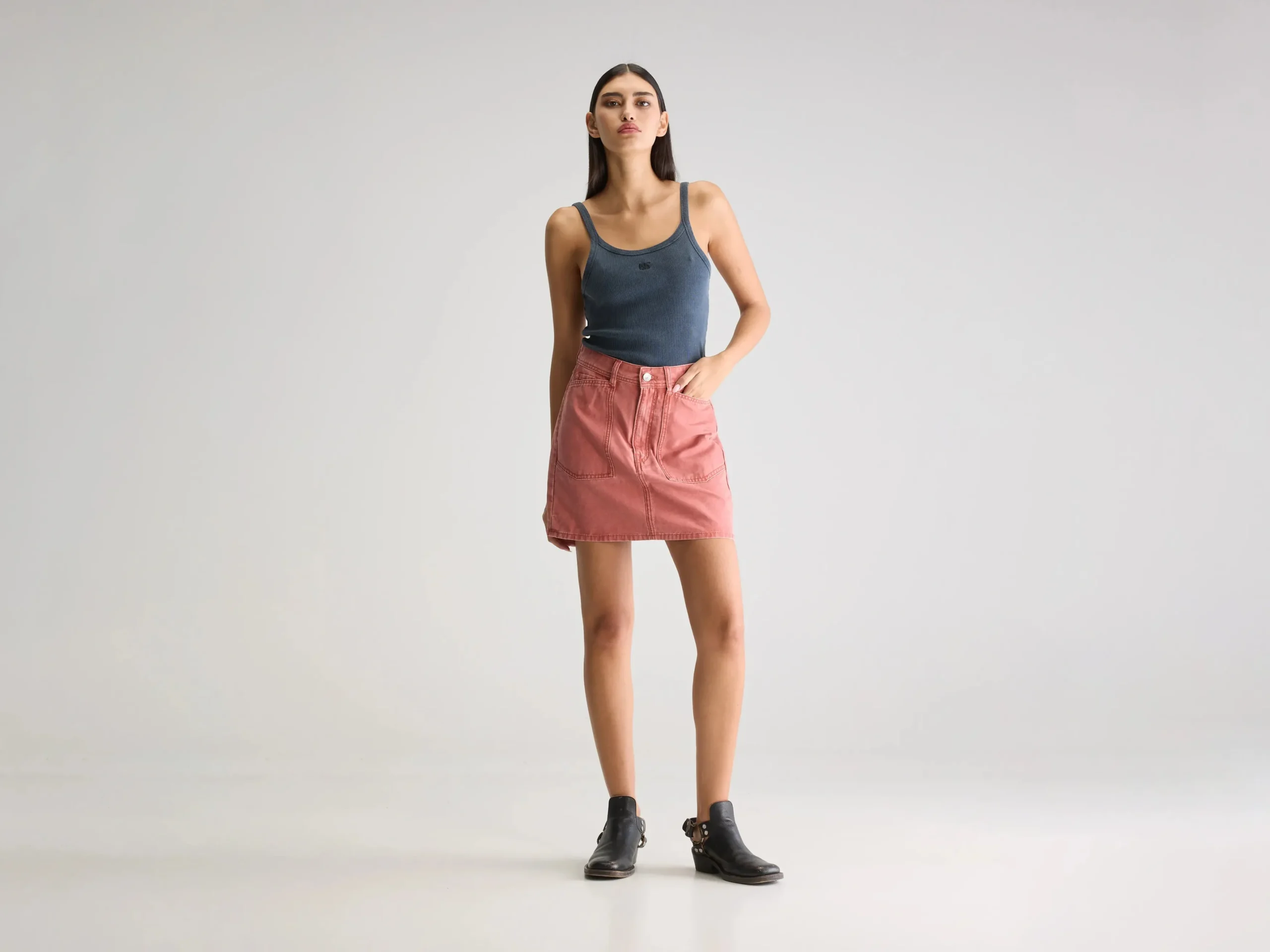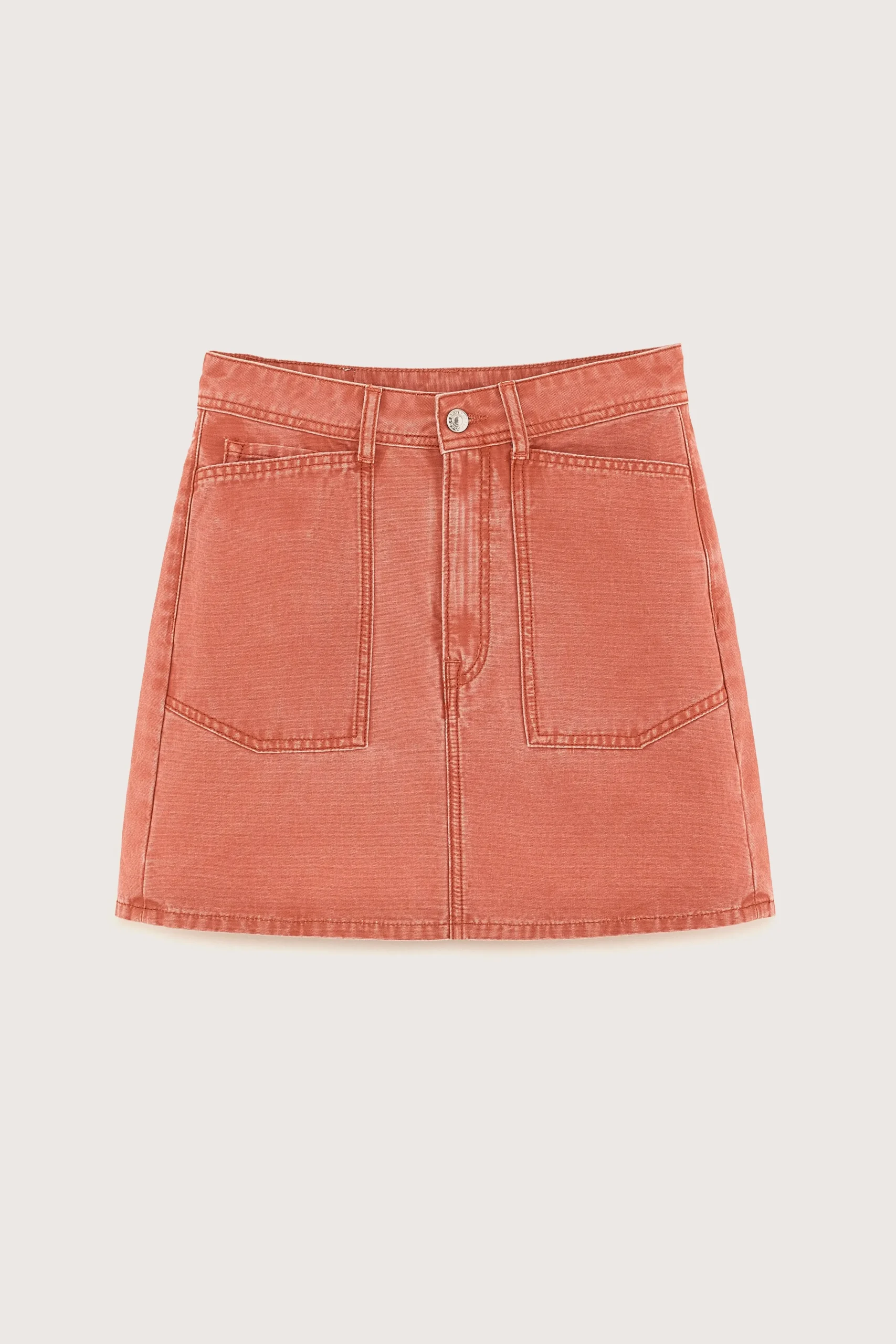 Rozenhoutroze minirok met gepatchte voor- en achterzakken en gestructureerde naden.MinirokRechte pasvormHoge tailleGepat…