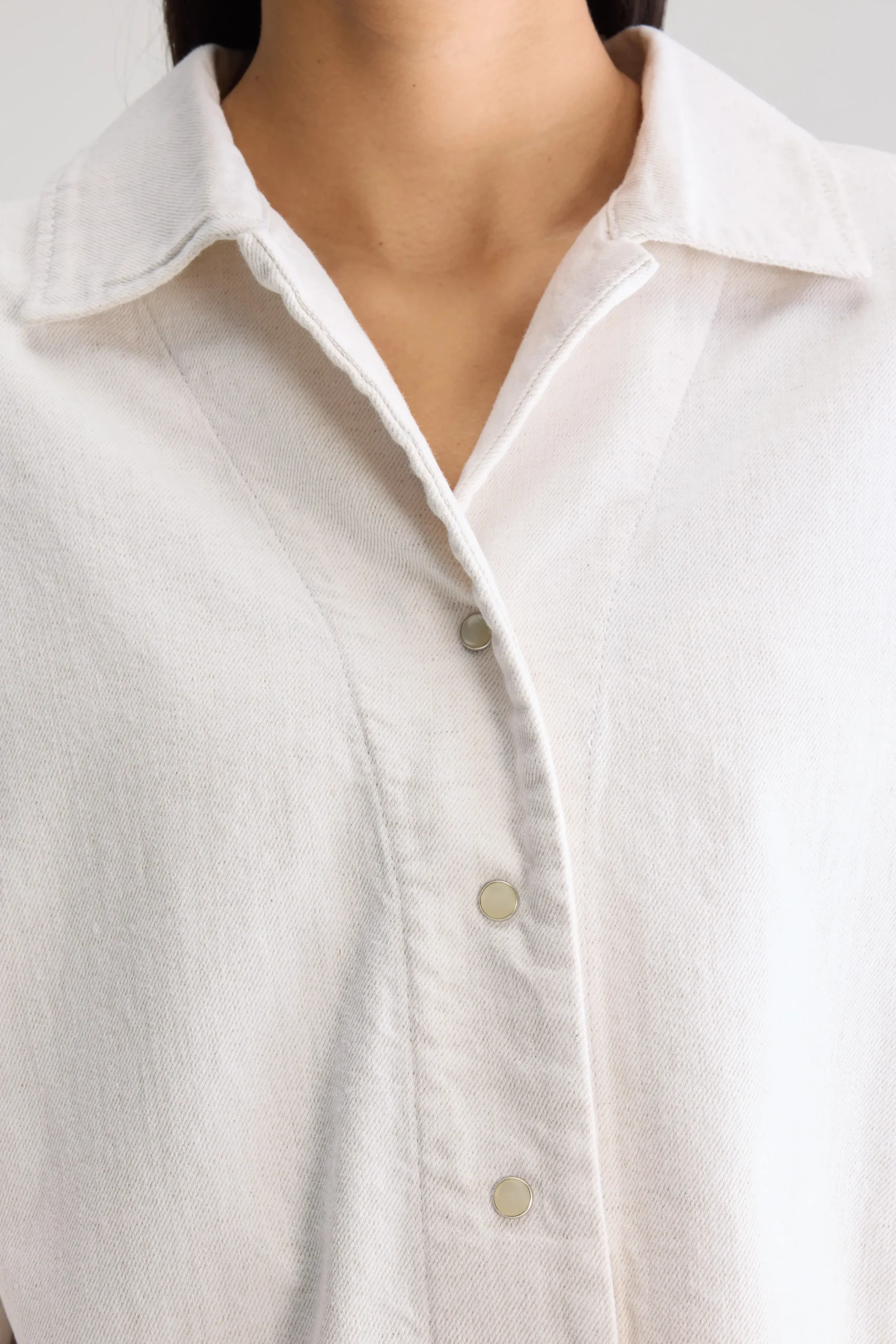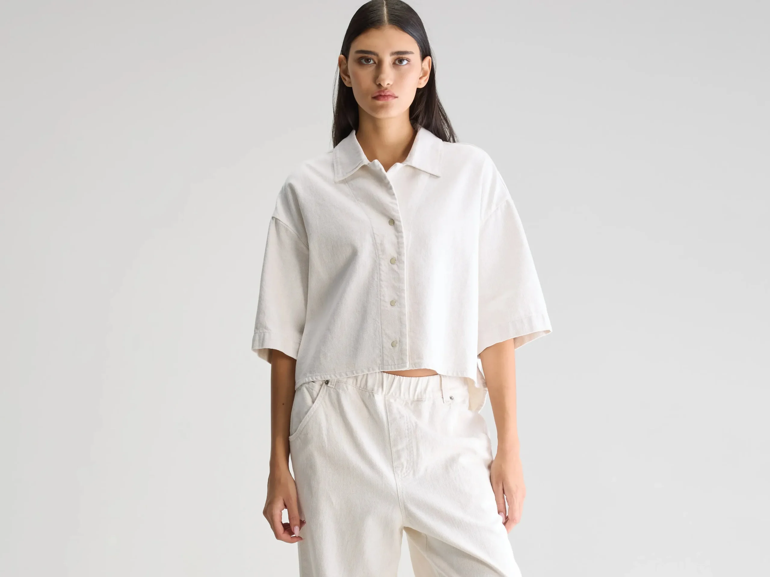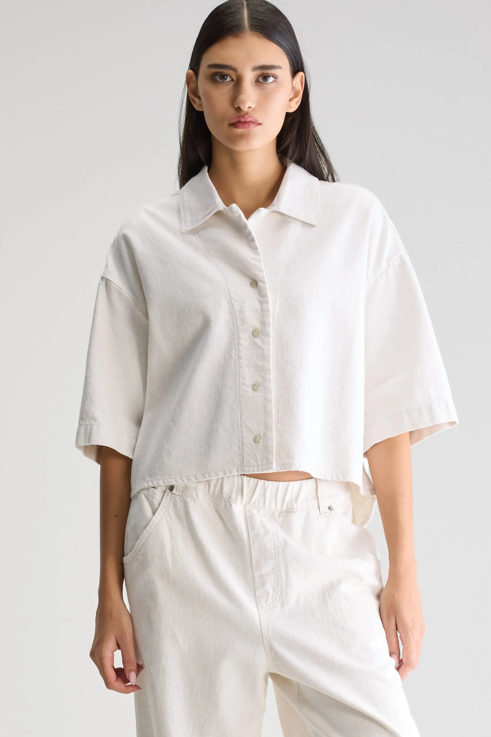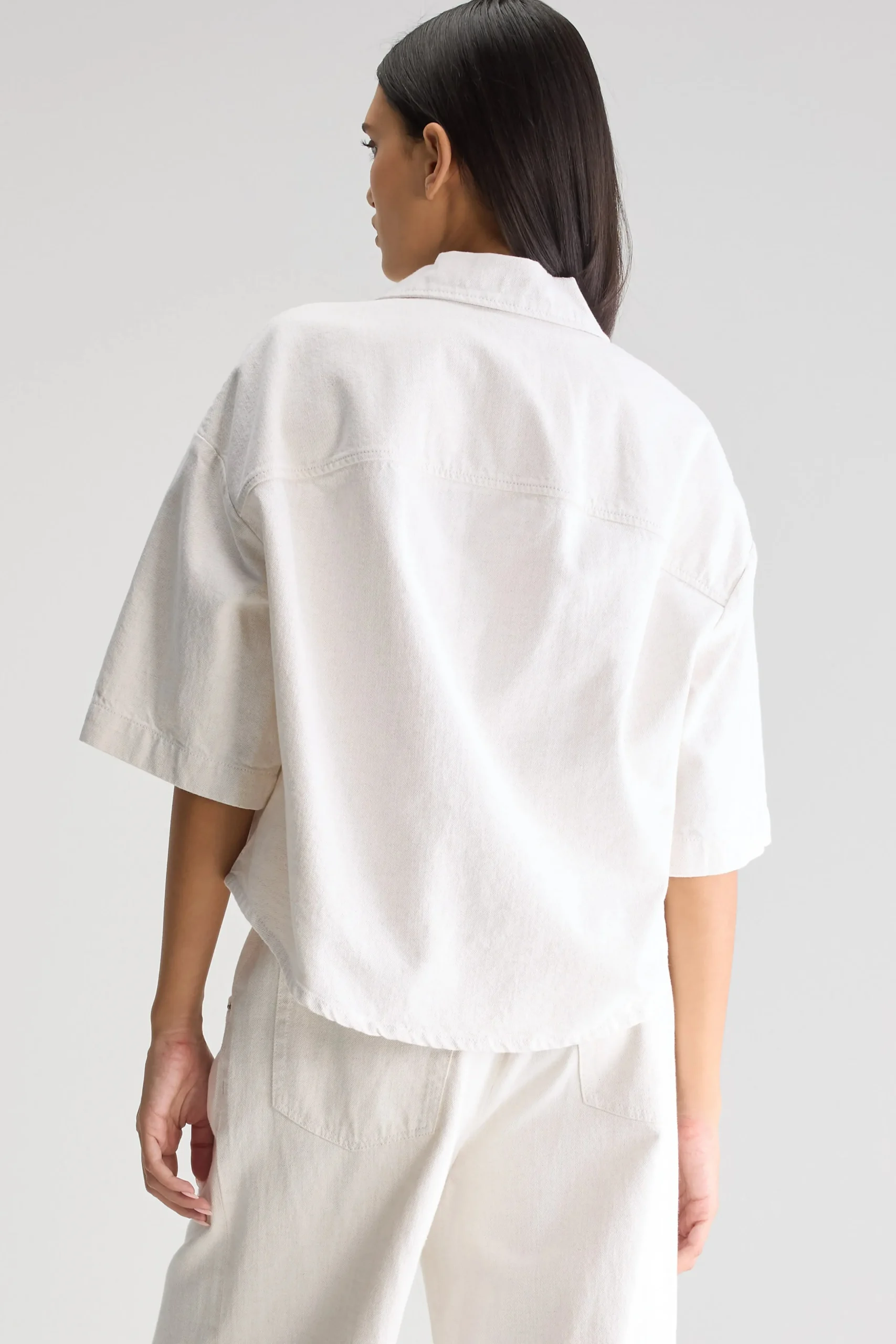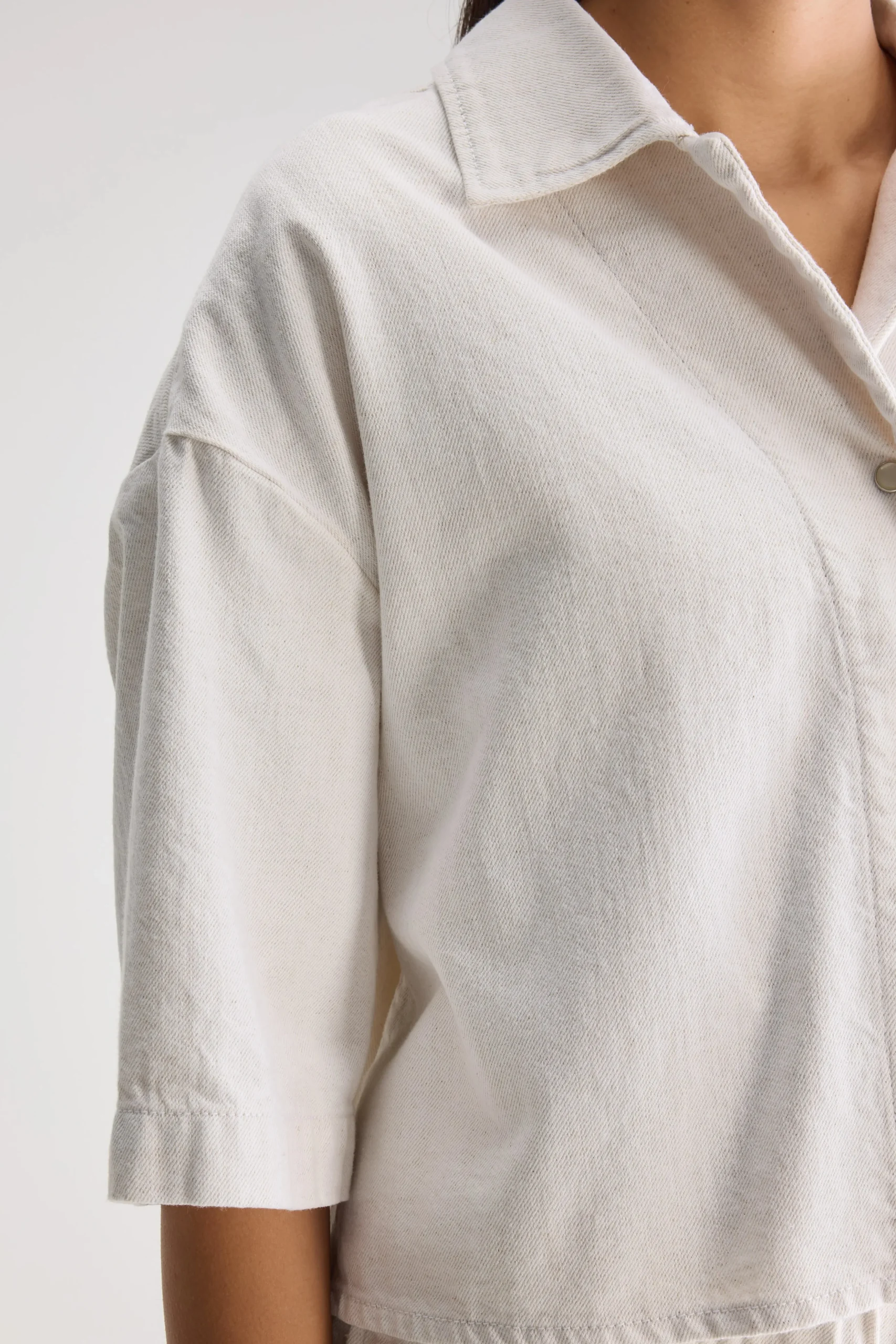 Oversized cropped denim hemd in ecru met korte mouwen en een afgeronde high-low zoom, gemaakt van katoen met een vleugje linnen.Oversized hemdCropped pasvormKorte mouwenAfgeronde high-low zoomDrukknopen