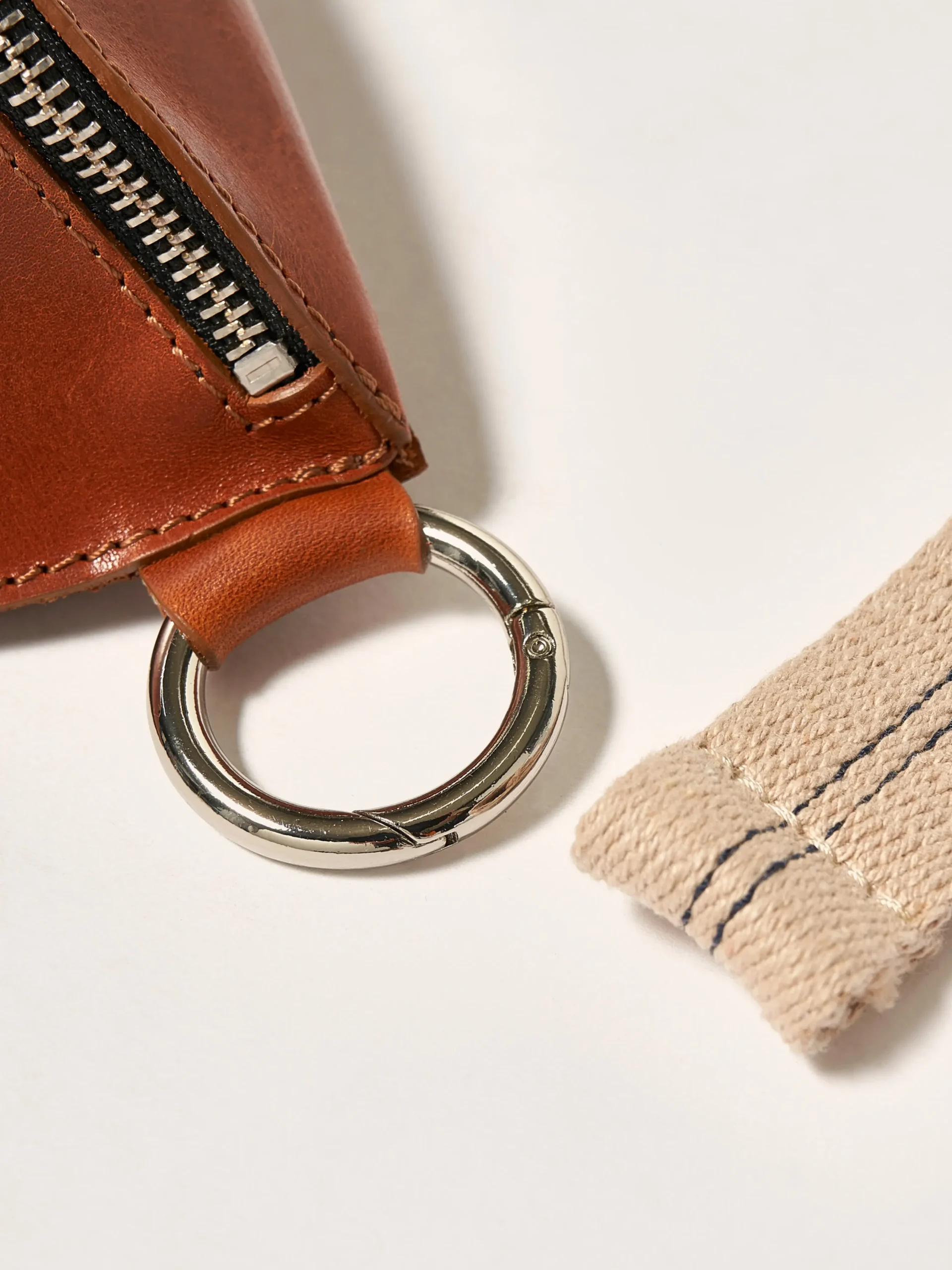 Halve maanvormige tas van glad cognac-kleurig leer.rrRitssluiting aan de voorkantrVerstelbare katoenen riemrBinnenza…