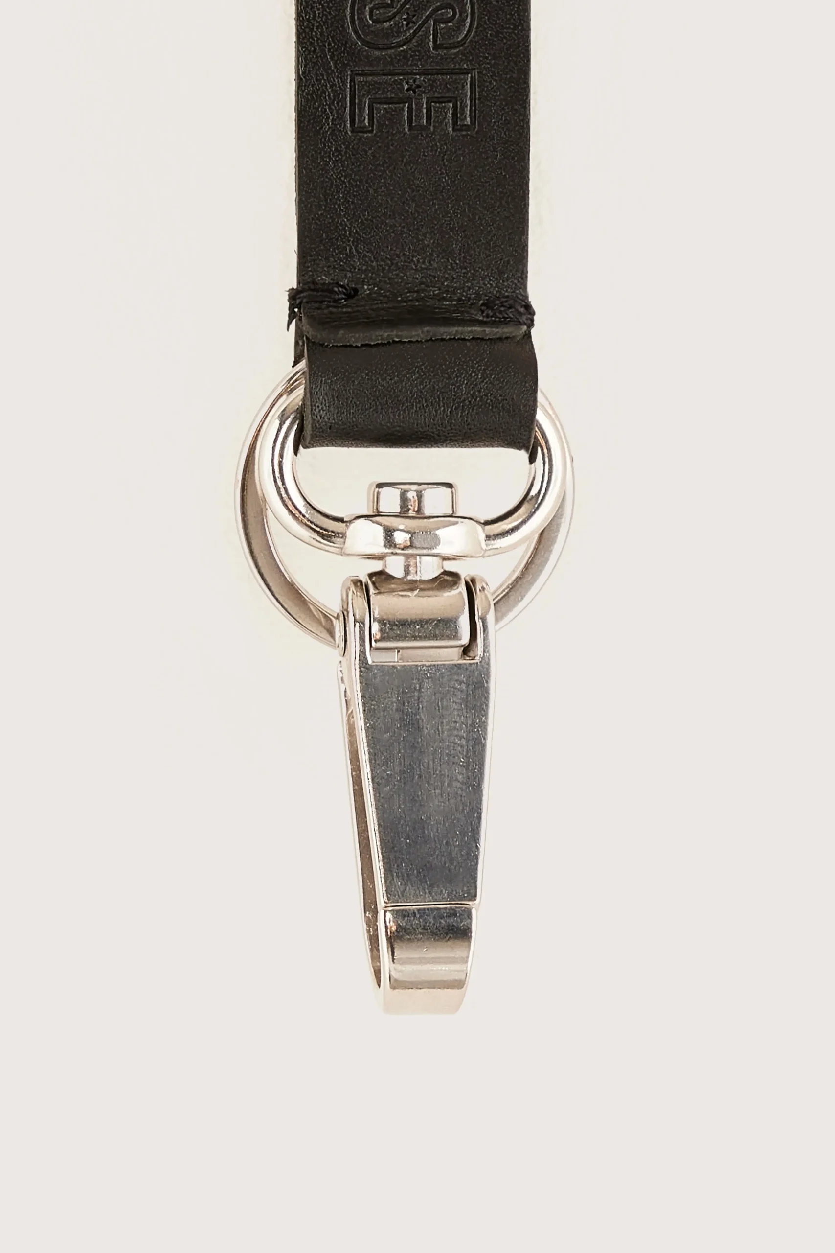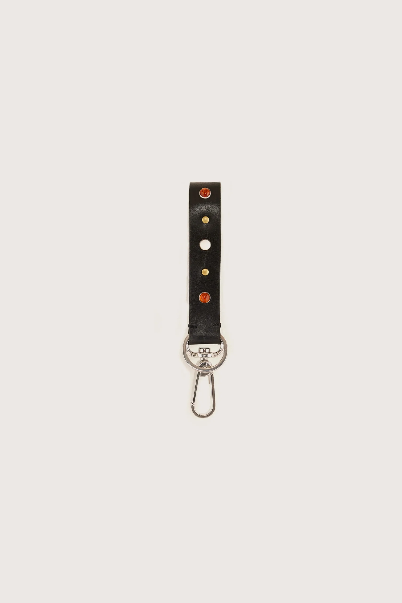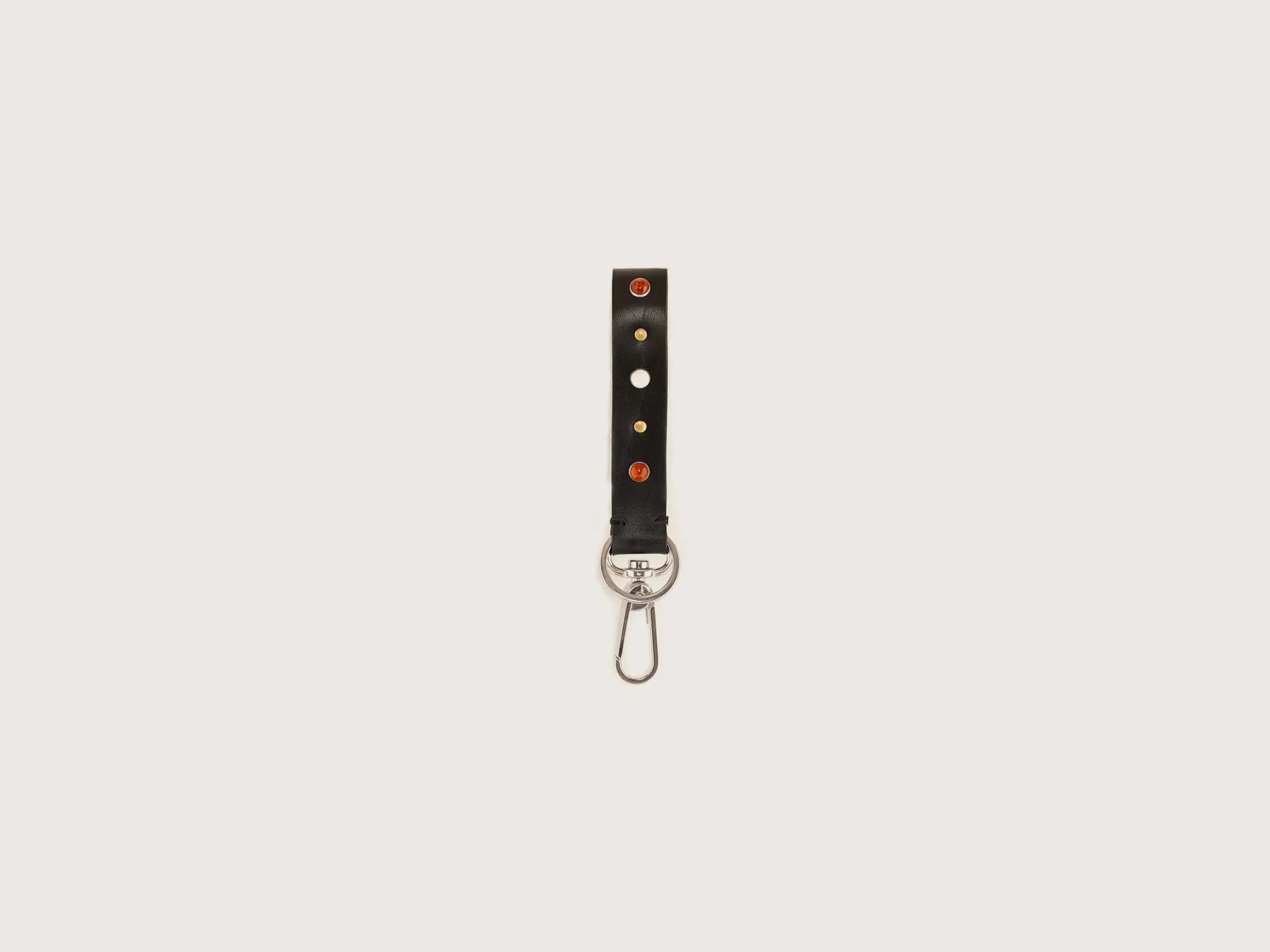 Sleutelhanger met zwart leren riempje met Bellerose-reliëf, met stenen ingelegde studs en zilverkleurig metalen beslag….